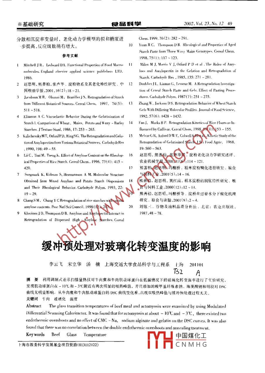 2002,Vo.23,No.l2※基礎(chǔ)研究淀粉糊老化動(dòng)力學(xué)研究趙思明熊相華中農(nóng)業(yè)大學(xué)食科系武漢40072月俞蘭苓國(guó)家糧食儲(chǔ)備局武漢科學(xué)儷究設(shè)計(jì)院武漢430079摘要以稻米為埌料,采用旋轉(zhuǎn)粘度儀斫究較稀濃度淀粉糊的老化動(dòng)力學(xué)。結(jié)果表明:不同類(lèi)型稻米淀粉糊均呈假塑型流體的特征隨存放時(shí)間的延長(zhǎng),其流變指數(shù)上升,淀粉糊的剛性增人淀粉糊的老化接近一級(jí)化學(xué)反應(yīng)動(dòng)力學(xué)模型,其反應(yīng)級(jí)數(shù)稍大于1。用流變指數(shù)能較好的描述淀粉糊的老化功力學(xué)特征、淀粉糊的老化與其分散相的凝驟、沉淀和連續(xù)相的特性有關(guān)。當(dāng)引入連續(xù)相流變指數(shù)和分散相沉淀率變量時(shí),老化動(dòng)力學(xué)模型的擬和精度進(jìn)一步提高、直銷(xiāo)淀粉和支鏈淀粉的相互作用會(huì)加劇老化進(jìn)程。關(guān)鍵詞稻米淀粉糊老化動(dòng)力Abstract The retrogradation kinetics properties of rice starch pastes from three rice types, i.e. indica rice,japonica rice and glutinous rice were sludied separately by using a rotary rheometer. Results indicated that theretrogradation of starch pastes approached to the first order chemical reation model with the reaction order higherthan isilightly. The retrogradation kinetics properties of starch paste could be described well by rheological in-dex. The retrogradation was related to the properties of both continuous phase and disperse phase. The precision ofequation was the highest when the parameters of rheological index of continuous phase and the sedimentation ratioof dlosperse phase were introduced to the modlel, The interaction of any lose and amylopectin led to the increase ofRice Starch paste Retrogradation Kinetics新鮮淀粉糊為由直鏈淀粉膠體溶液和攴鏈淀粉團(tuán)化動(dòng)力學(xué)特性通過(guò)老化過(guò)程的模型研究,掌握由老化塊為主要結(jié)構(gòu)的均勻的兩相體系,在存放過(guò)程中淀粉引起的淀粉質(zhì)食品的時(shí)變規(guī)律,為淀粉流質(zhì)食品貯存糊發(fā)生凝聚和產(chǎn)生膠體網(wǎng)絡(luò)結(jié)構(gòu)等老化現(xiàn)象1-3c淀粉品質(zhì)的預(yù)測(cè)和控制提供理論依據(jù)來(lái)源、直鏈淀粉的含量“、支鏈淀粉的結(jié)構(gòu)以:材料與方法及直鏈淀粉和支鏈淀粉的相4作用2、淀粉濃度、貯存溫度等淀粉糊的流變學(xué)特性和老化動(dòng)力學(xué)111.1材料秈型、粳型、糯型稻米,均為市售。都有較大的影響稻米是我國(guó)的重要糧食作物,稻米的12淀粉的制備待性、稻米食品的品質(zhì)主要取決于其淀粉的特性c淀粉將稻米粉碎過(guò)80日篩,用無(wú)水乙醚和無(wú)水乙醇質(zhì)食品在貯藏過(guò)程中發(fā)生的粘碉度、門(mén)感透明度等特(4:1,體積比)在索氏抽提中回流72h,脫去脂肪后用性的變化與淀粉老化的過(guò)程有著密切關(guān)系,不同類(lèi)型索氏抽提法測(cè)得脂肪含量為0.08%(w/w)左右。再的食品通常具有特殊的質(zhì)構(gòu)要求粉絲方便米粉等食用0.5m0/L的NaoH溶液浸提h,脫去蛋白質(zhì),用蒸品通常要將淀粉適度老化從而獲得一定的韌性,米粥餾水漂洗數(shù)次,干燥,用凱氏定氮法2測(cè)得蛋白質(zhì)含等流質(zhì)食品則需要抑制老化的發(fā)生以保持其柔軟的口量為1%(w/w)左右。感根據(jù)食品特性對(duì)糊化淀粉的老化過(guò)程進(jìn)行合理挖13支鏈淀粉的分離純化制是食品加工領(lǐng)域的重要研究?jī)?nèi)容之一將脫去脂肪和蛋白質(zhì)的淀粉用正丁醇-異戊醇法目前,對(duì)稻米淀粉在過(guò)量水分下的糊化機(jī)理、淀反復(fù)結(jié)晶5次,所得上清液經(jīng)真空濃縮后用無(wú)水粉糊物系特性、淀粉糊的老化特性等進(jìn)行過(guò)較多研究醇沉淀4-5次,筆溫真空干燥,即得支鏈淀粉。測(cè)1,但對(duì)淀粉糊物系中兩相的特性和放過(guò)程得支鏈淀粉的碘結(jié)合力為0.mg/g容購(gòu)-0.09mg的時(shí)變規(guī)律及其對(duì)天然淀粉老化的影響還不很清楚,碳看C從而使我們對(duì)淀粉質(zhì)食品的貯存品質(zhì)難以進(jìn)行準(zhǔn)確的.4淀粉糊的制備預(yù)測(cè)和控制。本文采用旋轉(zhuǎn)粘度儀,研究較稀濃度日倍的,然淀粉和支鏈淀(2%,w/w)下稻米淀粉糊及其兩相的流變學(xué)特性和老粉)中國(guó)煤化工溶液約40m,于CNMHG※基礎(chǔ)研究鏝品學(xué)2002,Vol.23,No.24780℃:下水浴30mn,用0.1mol/LIC中和,蒸餾水容至100ml,制成淀粉糊.」4℃下保存,備川1.5沉淀率的測(cè)定取用14的方法制備的淀粉糊wg(約7Om),離分離(3rmin,20min)后稱得沉淀重wg,則沉淀率=×100%1.6流變學(xué)特性的研究用流變儀(HAAK型旋轉(zhuǎn)流變儀,德國(guó),轉(zhuǎn)子型號(hào)剪切速率,MⅤSP)在轉(zhuǎn)速n=4,8,16、32、64、128r/min時(shí),于4℃下分別測(cè)定大然淀粉糊(用1.4的方法制備)、離心后所得上清液(用1.5的方法得到,并以此作為淀粉糊的時(shí)間(d)連續(xù)相)和支鏈淀粉糊(用1.4的方法制備)的扭矩s圖2稻米淀粉糊在存放過(guò)程的切應(yīng)力響應(yīng)曲線(N),并計(jì)算出個(gè)自對(duì)應(yīng)的切應(yīng)力r(r=As,Pa,A為常線,在較高流動(dòng)速度下(n>64),曲線稍向下彎曲,其中數(shù))。采用冪率定律τ=ηdu/dr)計(jì)算流變指數(shù)a和以糯稻淀粉糊的切應(yīng)力最大。隨存放時(shí)間的延長(zhǎng),不同粘度系數(shù)m(Pa·S)式中du/dr為速度梯度或剪切
