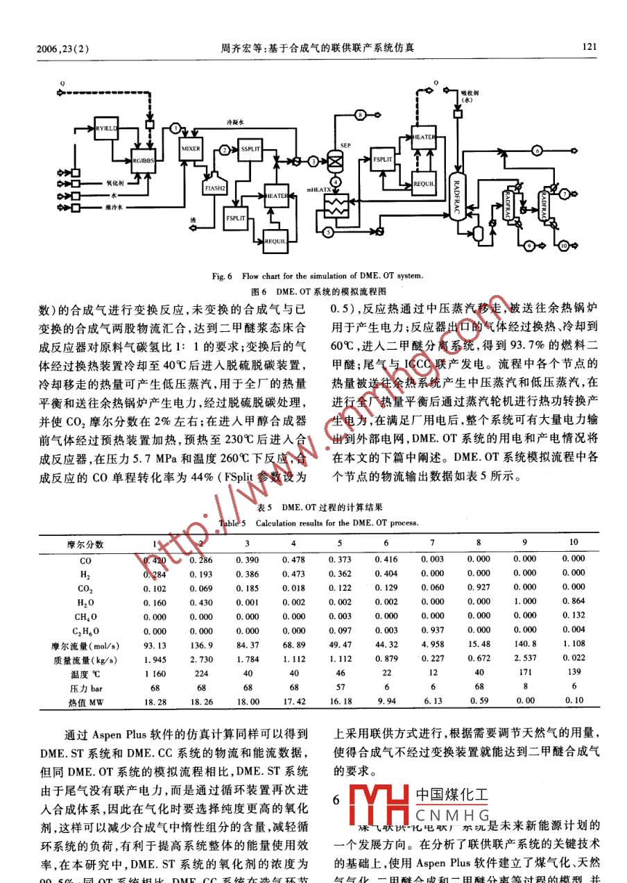 第23卷第2期計(jì)算機(jī)與友用化學(xué)Vol 23. No. 22006年2月28日Computers and Applied ChemistryFebruary, 2006基于合成氣的聯(lián)供聯(lián)產(chǎn)系統(tǒng)仿真周齊宏,胡山鷹,陳定江,李有潤,周麗(清華大學(xué)化學(xué)工程系,北京,100084)摘要:在分析構(gòu)成聯(lián)供聯(lián)產(chǎn)系統(tǒng)中關(guān)鍵技術(shù)的基礎(chǔ)上,利用 Aspen Plus軟件對系統(tǒng)的單元操作過程進(jìn)行了建模仿真工作。通過不同技術(shù)的組合,得到了二甲醚單產(chǎn)系統(tǒng)、二甲醚與電力的聯(lián)產(chǎn)系統(tǒng)、煤與天然氣聯(lián)供的二甲醚電力聯(lián)產(chǎn)系統(tǒng),并通過模型的仿真計(jì)算,計(jì)算出各自系統(tǒng)中關(guān)鍵節(jié)點(diǎn)的物流和能流數(shù)據(jù),為后續(xù)的3E研究提供了可靠的數(shù)據(jù)。關(guān)鍵詞:聯(lián)產(chǎn)聯(lián)供;模擬;煤;天燃?xì)?二甲醚中圖分類號(hào):TQ021.8文獻(xiàn)標(biāo)識(shí)碼:A文章編號(hào):10014160(2006)02-118-122System simulation of Co-feed and Co-generation system based on the syngasZHOU QiHong, HU Shan Ying, CHEN DingJiang, LI YouRun and ZHOU LiDepartment of Chemical Engineering, Tsinghua University, Beijing, 100084, China)Abstract: The advanced technologies of coal or NG gasification, the synthesis of DME in the liquid phase and IGCC are key to the in-egration involved in the standalone system for DME, co-generation system for DME and electricity, and the co-feed( from coal andNG)& co-production system for DME and electricity. Several unit process models have been built with the aid of the software Aspen-Plus on the basis of analyzing those key technologies. Through the designs, simulations and calculations of the standalone system, co-generation system and Co-Co system, simulation results concerning material flows and energy flows of the systems are obtained, whichare the base for the subsequent study on energy, economy and environment.Key words: co-feed and co-generation, simulation coal, natural gas, DMEZhou QH, Hu SY, Chen DJ, Li YR and Zhou L. System simulation of Co-feed and Co-generation system based onthe syngas. Computers and applied Chemistry, 2006, 23(2): 118-1221引言干可能的聯(lián)供聯(lián)產(chǎn)系統(tǒng)構(gòu)成,利用 Aspen plus仿真工具對上述可能的系統(tǒng)構(gòu)成進(jìn)行建模仿真。根據(jù)建我國是一個(gè)以煤炭為主要能源的國家,其在國模仿真的數(shù)據(jù)結(jié)果,在本文的下篇中將分析系統(tǒng)的民經(jīng)濟(jì)中具有重要的意義:煤炭的清潔利用不但是能量利用情況、經(jīng)濟(jì)性能和對環(huán)境的影響。國民經(jīng)濟(jì)持續(xù)高速發(fā)展的必要保證,同時(shí)也是改善自然生態(tài)環(huán)境的關(guān)鍵。在四川瀘州地區(qū)有大量尚未2氣化過程開發(fā)利用的煤炭資源和已開發(fā)使用的天然氣資聯(lián)供聯(lián)產(chǎn)系統(tǒng)的核心是合成氣(主要成分CO源口,在未來20年內(nèi)這些化石能源的利用不但會(huì)促和H1),不同原料通過不同的氣化技術(shù)路線變?yōu)楹线M(jìn)地方經(jīng)濟(jì)的發(fā)展同時(shí)也會(huì)帶動(dòng)周邊地區(qū)的發(fā)展,成氣,繼而進(jìn)行下游產(chǎn)品的生產(chǎn)。并為長江中下游城市提供可靠的能源供給。2.1煤氣化以煤、天然氣等化石燃料為原料,通過氣化技術(shù)在眾多煤氣化技術(shù)中2,噴流床技術(shù)是聯(lián)得到合成氣,并利用合成氣生產(chǎn)多種產(chǎn)品的復(fù)合系供——聯(lián)產(chǎn)系統(tǒng)的最佳選擇,這主要是因?yàn)?(1)該統(tǒng)稱為基于合成氣的聯(lián)供聯(lián)產(chǎn)系統(tǒng),這些產(chǎn)品包括:類技術(shù)設(shè)備的單位容積的生產(chǎn)能力高;(2)沒有焦電、液體燃料(FT液體燃料、二甲醚、甲醇等)、城市油和酚類物質(zhì),后處理過程較簡單;(3)產(chǎn)生惰性熔用的有女2之參先支在數(shù)析構(gòu)傲產(chǎn)系碳轉(zhuǎn)化率高(可達(dá)99%)。張斌中國煤化工對噴流床氣化爐進(jìn)行統(tǒng)的關(guān)鍵技術(shù)基礎(chǔ)上,將這些技術(shù)進(jìn)行組合,得到若了模CNMH建立了煤氣化模塊收稿日期:200508-16;修回日期:2005-10-24基金資助:國家自然科學(xué)基金重點(diǎn)資助項(xiàng)目(20436040)作者簡介:周齊宏(1979—),男,北京人,碩士研究生,系統(tǒng)工程專業(yè).聯(lián)系人:胡山鷹2006,23(2)周齊宏等:基于合成氣的聯(lián)供聯(lián)產(chǎn)系統(tǒng)仿真119(圖1):將煤定義為非常規(guī)物質(zhì)COAL,同時(shí)還定義在模型的燃燒室中進(jìn)行甲烷燃燒反應(yīng), Chris了ASH(灰)和UBC(未燃燼碳)兩種非常規(guī)(NC)物 tensen(6推薦采用亞化學(xué)計(jì)量燃燒反應(yīng)式(式1)來質(zhì),在 Yield模塊中將COAL分解為指定產(chǎn)量的物簡化,這可用 Aspen Plus中的反應(yīng)器模塊 SToic實(shí)流Comp,其包括H2、N2、S、O2、C單質(zhì)、ASH和UBC,現(xiàn);氧化完全轉(zhuǎn)化后,過量的甲烷和生成物一起進(jìn)入由煤的元素分析和指定的碳轉(zhuǎn)化率確定物流Comp催化劑床層進(jìn)行絕熱重整反應(yīng);重整反應(yīng)的主要反的組成,然后再將物流Comp與分解放出的熱量和應(yīng)有強(qiáng)吸熱的蒸汽重整(式2)和弱放熱的水煤氣變氧氣、水等物流一起通入到 RGibbs模塊中,由煤氣換反應(yīng)(式3),通過 Aspen Plus中的反應(yīng)器模塊化過程化學(xué)反應(yīng)特性的分析來確定產(chǎn)物(包括CO、 requir實(shí)現(xiàn)。H2、CO2、H2O、CH4、H2S、COS、Ar和N2),并考慮CH,+1.50,→C0+2