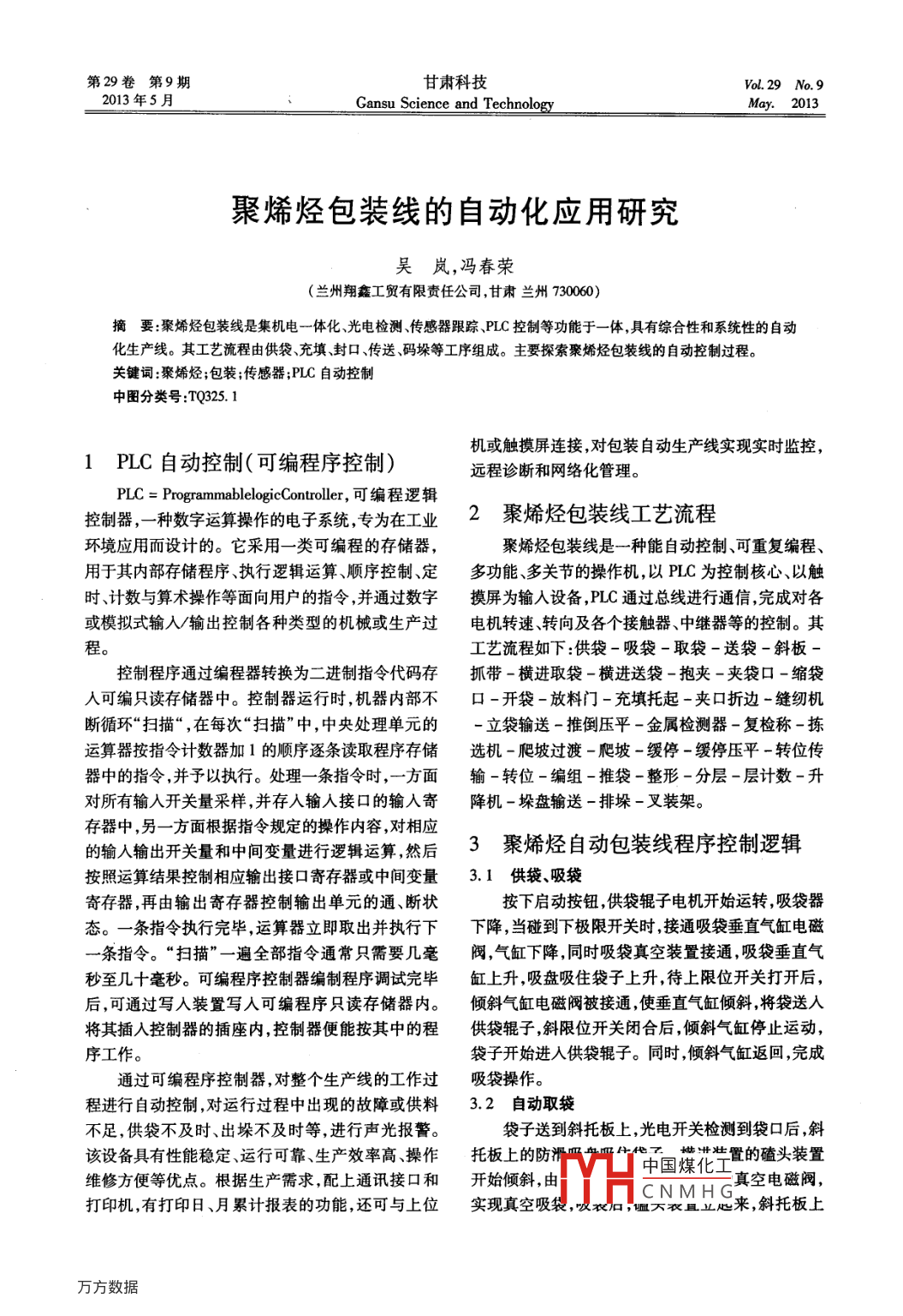第29卷第9期甘肅科技Vol.29 No. 92013年5月Gansu Science and TechnologyMay. 2013聚烯烴包裝線的自動(dòng)化應(yīng)用研究吳嵐,馮春榮(蘭州翔鑫工貿(mào)有限責(zé)任公司,甘肅蘭州730060)摘要:聚烯烴包裝線是集機(jī)電 一體化、光電檢測(cè)、傳感器跟蹤、PLC控制等功能于- -體,具有綜合性和系統(tǒng)性的自動(dòng)化生產(chǎn)線。其工藝流程由供袋、充填封口、傳送碼垛等工序組成。主要探索聚烯烴包裝線的自動(dòng)控制過(guò)程。關(guān)鍵詞:聚烯烴;包裝;傳感器;PLC自動(dòng)控制中圖分類號(hào):TQ325.1機(jī)或觸摸屏連接,對(duì)包裝自動(dòng)生產(chǎn)線實(shí)現(xiàn)實(shí)時(shí)監(jiān)控,1 PLC自動(dòng)控制(可編程序控制)遠(yuǎn)程診斷和網(wǎng)絡(luò)化管理。PLC = ProgrammablelogicController,可編程邏輯控制器,-種數(shù)字運(yùn)算操作的電子系統(tǒng),專為在工業(yè)2聚烯烴包裝線工藝流程環(huán)境應(yīng)用而設(shè)計(jì)的。它采用- - 類可編程的存儲(chǔ)器,聚烯烴包裝線是一種能自動(dòng)控制、可重復(fù)編程、用于其內(nèi)部存儲(chǔ)程序、執(zhí)行邏輯運(yùn)算、順序控制、定多功能、多關(guān)節(jié)的操作機(jī),以PLC為控制核心、以觸時(shí)、計(jì)數(shù)與算術(shù)操作等面向用戶的指令,并通過(guò)數(shù)字摸屏為輸人設(shè)備,PLC通過(guò)總線進(jìn)行通信,完成對(duì)各或模擬式輸人/輸出控制各種類型的機(jī)械或生產(chǎn)過(guò)電機(jī)轉(zhuǎn)速、轉(zhuǎn)向及各個(gè)接觸器、中繼器等的控制。其程。工藝流程如下:供袋-吸袋-取袋-送袋-斜板-控制程序通過(guò)編程器轉(zhuǎn)換為二進(jìn)制指令代碼存抓帶-橫進(jìn)取袋-橫進(jìn)送袋-抱夾-夾袋口-縮袋人可編只讀存儲(chǔ)器中??刂破鬟\(yùn)行時(shí),機(jī)器內(nèi)部不口-開(kāi)袋-放料門-充填托起-夾口折邊-縫紉機(jī)斷循環(huán)“掃描“,在每次“掃描”中,中央處理單元的-立袋輸送-推倒壓平-金屬檢測(cè)器-復(fù)檢稱-揀運(yùn)算器按指令計(jì)數(shù)器加1的順序逐條讀取程序存儲(chǔ)選機(jī)-爬坡過(guò)渡-爬坡-緩?fù)?緩?fù)浩?轉(zhuǎn)位傳器中的指令,并予以執(zhí)行。處理一條指令時(shí),一 方面輸-轉(zhuǎn)位-編組-推袋-整形-分層-層計(jì)數(shù)-升對(duì)所有輸人開(kāi)關(guān)量采樣,并存人輸人接口的輸人寄降機(jī)-垛盤輸送-排垛-叉裝架。存器中,另-方面根據(jù)指令規(guī)定的操作內(nèi)容,對(duì)相應(yīng)的輸人輸出開(kāi)關(guān)量和中間變量進(jìn)行邏輯運(yùn)算,然后3聚烯烴 自動(dòng)包裝線程序控制邏輯按照運(yùn)算結(jié)果控制相應(yīng)輸出接口寄存器或中間變量3.1供袋、吸袋寄存器,再由輸出寄存器控制輸出單元的通、斷狀按下啟動(dòng)按鈕,供袋輥?zhàn)与姍C(jī)開(kāi)始運(yùn)轉(zhuǎn),吸袋器態(tài)。- -條指令執(zhí)行完畢,運(yùn)算器立即取出并執(zhí)行下下降,當(dāng)碰到下極限開(kāi)關(guān)時(shí)接通吸袋垂直氣缸電磁-條指令?!皰呙琛?-遍全部指令通常只需要幾毫閥,氣缸下降,同時(shí)吸袋真空裝置接通,吸袋垂直氣秒至幾十毫秒。可編程序控制器編制程序調(diào)試完畢缸上升,吸盤吸住袋子上升,待上限位開(kāi)關(guān)打開(kāi)后,后,可通過(guò)寫人裝置寫人可編程序只讀存儲(chǔ)器內(nèi)。傾斜氣缸電磁閥被接通,使垂直氣缸傾斜,將袋送人將其插人控制器的插座內(nèi),控制器便能按其中的程供袋輥?zhàn)?斜限位開(kāi)關(guān)閉合后,傾斜氣缸停止運(yùn)動(dòng),序工作。袋子開(kāi)始進(jìn)人供袋輥?zhàn)印M瑫r(shí),傾斜氣缸返回,完成通過(guò)可編程序控制器,對(duì)整個(gè)生產(chǎn)線的工作過(guò)吸袋操作。程進(jìn)行自動(dòng)控制,對(duì)運(yùn)行過(guò)程中出現(xiàn)的故障或供料3.2自動(dòng)取袋不足,供袋不及時(shí)、出垛不及時(shí)等,進(jìn)行聲光報(bào)警。袋子送到斜托板上,光電開(kāi)關(guān)檢測(cè)到袋口后,斜該設(shè)備具有性能穩(wěn)定、運(yùn)行可靠、生產(chǎn)效率高、操作托板上的防滑四產(chǎn)照牛代工惜北壯置的磕頭裝置維修方便等優(yōu)點(diǎn)。根據(jù)生產(chǎn)需求,配上通訊接口和開(kāi)始傾斜,由中國(guó)煤化工真空電磁閥,JH. CNMH G打印機(jī),有打印日、月累計(jì)報(bào)表的功能,還可與上位實(shí)現(xiàn)真空吸袋,吸衣口,血大農(nóng)且業(yè)心來(lái),斜托板上第9期吳嵐等:聚烯烴包裝線的 自動(dòng)化應(yīng)用研究55升,回到原來(lái)的位置,完成了取袋操作。緩?fù)C(jī)將暫停傳輸。3.3送袋、開(kāi)袋、裝料3.8推袋、分層開(kāi)袋、抱板和大夾子應(yīng)該處于張開(kāi)位置,橫進(jìn)裝編組機(jī)滿信號(hào)則激發(fā)一次推袋動(dòng)作 ,推袋前進(jìn)置向包裝線取袋方向移動(dòng),到位后,限位開(kāi)關(guān)閉合,之前,將推袋擋板關(guān)閉。滿半層時(shí),推袋到滑臺(tái)位抱板和大夾子閉合。夾抱限位開(kāi)關(guān)閉合后,料斗下置,推袋擋板打開(kāi),然后推袋機(jī)返回;若滿- -層而且縮口夾子張開(kāi),同時(shí)取袋裝置真空打開(kāi),橫進(jìn)裝置分層機(jī)空時(shí),推袋機(jī)推到前端位置,推袋擋板打開(kāi),向包裝線裝袋位置方向移動(dòng),由限位開(kāi)關(guān)控制到位,然后推袋機(jī)返回。當(dāng)料袋進(jìn)人分層機(jī)后,則側(cè)面