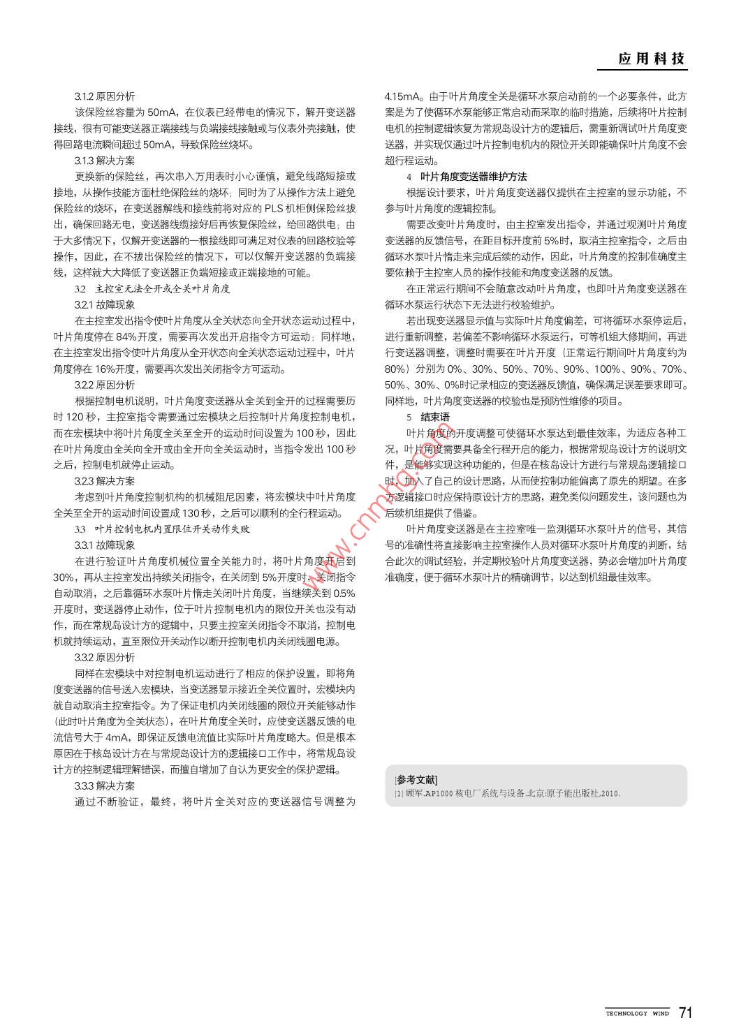 爛料技瓜循環(huán)水泵葉片角度變送器在三門核電的應(yīng)用袁鳳學(xué)(浙江三門核電有限公司,浙江臺(tái)州317112)嘀摘要三門核電循環(huán)水泵葉片角度可調(diào),可使循環(huán)水泵在各種運(yùn)行工況下均能獲得最大的效率,而葉片角度變送器在調(diào)莖循環(huán)水泵葉片過(guò)程中起到至關(guān)重要的作用,本文介紹了循環(huán)水泵葉片角度調(diào)節(jié)的原理,并結(jié)合葉片角度變送器在調(diào)試過(guò)程中遇到的問(wèn)題和解決方案,為同行提供借鑒。[關(guān)鍵詞三門核電;循環(huán)水泵;葉片角度;變送器三門核電循環(huán)水泵葉片角度可調(diào),在季節(jié)變化引起海水溫度變動(dòng)或者機(jī)組功率改變時(shí),可以通過(guò)調(diào)整循環(huán)水泵的葉片角度,以提高機(jī)組的冷卻效率,降低耗能。同時(shí)葉片角度可調(diào)使循環(huán)水泵在各種運(yùn)行工況下均能獲得最大的效率,而葉片角度變送器在循環(huán)水泵葉片調(diào)節(jié)過(guò)程中起到了至關(guān)重要的作用。1葉片角度調(diào)節(jié)原理葉片角度的調(diào)節(jié)主要通過(guò)葉片控制電機(jī)的旋轉(zhuǎn)帶動(dòng)先導(dǎo)閥上下移動(dòng),進(jìn)而改變控制液壓油流向,液壓油驅(qū)動(dòng)伺服汽缸中的活塞動(dòng)作,活塞帶動(dòng)整個(gè)控制杄和操作架上移,操作架通過(guò)球窩接頭與葉片連接,促使葉片沿葉片軸線旋轉(zhuǎn),即改變?nèi)~片角度。下面簡(jiǎn)要介紹葉片角度增大的調(diào)節(jié)過(guò)程。1)葉片控制電機(jī)向開(kāi)啟方向轉(zhuǎn)動(dòng),如圖1中1所示。2)先導(dǎo)閥通過(guò)連桿裝置向上開(kāi)啟,如圖1中2所示。3)控制油依次通過(guò)導(dǎo)閥和油管路進(jìn)入伺服汽缸活塞的下部腔室,同時(shí)伺服汽缸活塞的上部腔室控制油依次通過(guò)油管路和先導(dǎo)閥排出,如圖1中3所示。4)控制油推動(dòng)活塞和控制杄向上移動(dòng),如圖2中4所示。5)控制杄帶動(dòng)操作桿移動(dòng),使葉片向開(kāi)啟方向運(yùn)動(dòng),如圖2中5所示。6控制桿的上移通過(guò)連桿裝置帶動(dòng)先導(dǎo)閥下移,最終使先導(dǎo)閥關(guān)閉,阻止控制油流動(dòng),葉片角度保持,如圖3中6所示。2葉片角度變送器的原理控制桿的上下位移通過(guò)連桿裝置轉(zhuǎn)換成軸向桿的角位移,進(jìn)而帶動(dòng)葉片角度變送器內(nèi)電阻值的變化,內(nèi)部電阻值的改變通過(guò)電路轉(zhuǎn)換成標(biāo)準(zhǔn)電流信號(hào),送到主控室用于顯示QQQ①①⑤⑥1基唑、2外殼、3調(diào)節(jié)螺釘、4定位指針、5軸向桿、6屏蔽殼7刻度盤、8轉(zhuǎn)換元件、9PCB板、10連接軸、11申撞接頭理3葉片角度變送器調(diào)試過(guò)程中出現(xiàn)的問(wèn)題和解決方案葉片角度變送器在調(diào)試過(guò)程中出現(xiàn)了很多問(wèn)題,但是,最后通過(guò)調(diào)整或采取臨時(shí)措施都使問(wèn)題得到了很好的解決,保證了循環(huán)水泵的按時(shí)啟動(dòng)下面介紹主要的問(wèn)題和處理措施1變送器輸入AI卡件前保險(xiǎn)死燒壞311故障現(xiàn)象PLS機(jī)柜已經(jīng)帶電,就地測(cè)量變送器電壓為24VDC,解開(kāi)變送器接線,將萬(wàn)用表打到電流檔,并串入電流反饋回路,顯示電流為0mA,再次測(cè)量變送器兩端接線電壓為0DC。經(jīng)在PLS機(jī)柜側(cè)檢查發(fā)現(xiàn)A卡件前變送器輸入通道保險(xiǎn)絲燒壞應(yīng)用科技312原因分析415mA。由于葉片角度全關(guān)是循環(huán)水泵啟動(dòng)前的一個(gè)必要條件,此方該保險(xiǎn)絲容量為5omA,在儀表已經(jīng)帶電的情況下,解開(kāi)變送器案是為了使循環(huán)水泵能夠正常啟動(dòng)而采取的臨時(shí)措施,后續(xù)將葉片控制接線,很有可能變送器正端接線與負(fù)端接線接觸或與儀表外殼接蝕,使電機(jī)的控制邏輯恢復(fù)為常規(guī)島設(shè)計(jì)方的邏輯后,需重新調(diào)試葉片角度變得回路電流瞬間超過(guò)50mA,導(dǎo)致保險(xiǎn)絲燒壞。送器,并實(shí)現(xiàn)僅通過(guò)葉片控制電機(jī)內(nèi)的限位開(kāi)關(guān)即能確保葉片角度不會(huì)313解決方案超行程運(yùn)動(dòng)。更換新的保險(xiǎn)絲,再次串入萬(wàn)用表時(shí)小心謹(jǐn)慎,避免線路短接或4葉片角度變送器維護(hù)方法接地,從操作技能方面杜絕保險(xiǎn)絲的燒壞;同時(shí)為了從操作方法上避免根據(jù)設(shè)計(jì)要求,葉片角度變送器僅提供在主控室的顯示功能保險(xiǎn)絲的燒壞,在變送器解線和接線前將對(duì)應(yīng)的PLS機(jī)柜側(cè)保險(xiǎn)絲拔參與葉片角度的邏輯控制。出,確?;芈窡o(wú)電,變送器線纜接好后再恢復(fù)保險(xiǎn)絲,給回路供電;由需要改變?nèi)~片角度時(shí),由主控室發(fā)出指令,并通過(guò)觀測(cè)葉片角度于大多情況下,僅解開(kāi)變送器的一根接線即可滿足對(duì)儀表的回路校驗(yàn)等變送器的反饋信號(hào),在距目標(biāo)開(kāi)度前5%時(shí),取消主控室指令,之后由操作,因此,在不拔出保險(xiǎn)絲的情況下,可以僅解開(kāi)變送器的負(fù)端接循環(huán)水泵葉片惰走來(lái)完成后續(xù)的動(dòng)作,因此,葉片角度的控制準(zhǔn)確度主線,這樣就大大降低了變送器正負(fù)端短接或正端接地的可能。要依賴于主控室人員的操作技能和角度變送器的反饋。32主控室無(wú)法全開(kāi)