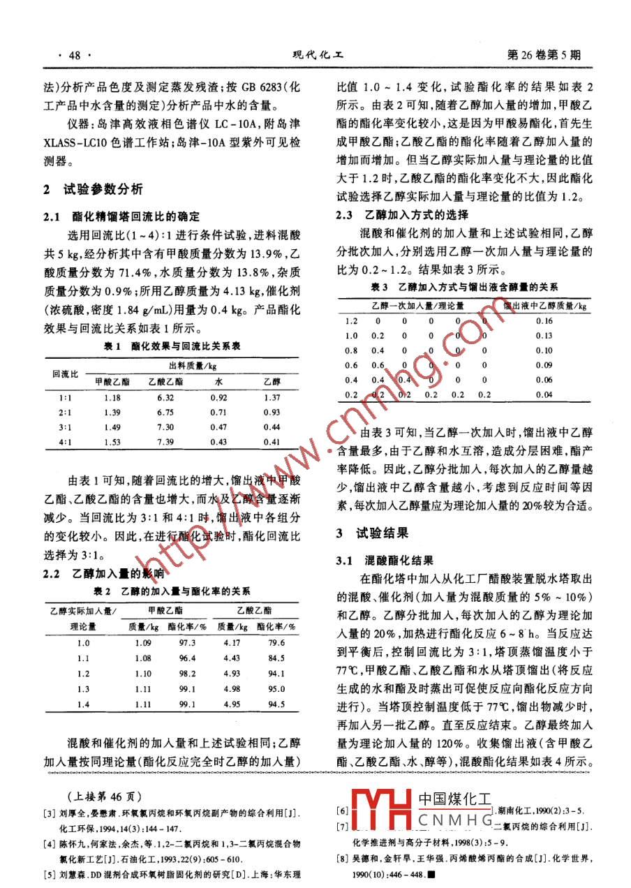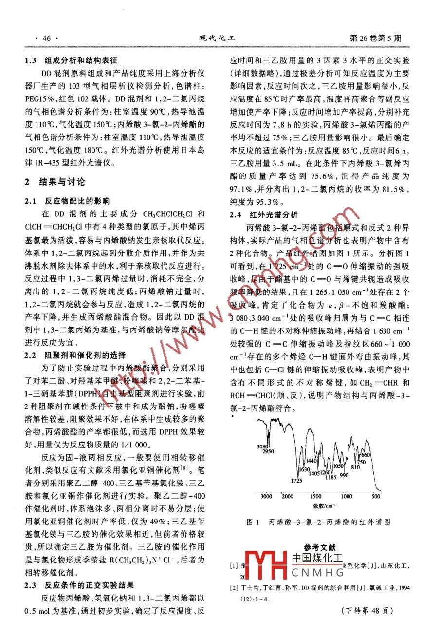 第26卷第5期現(xiàn)代化工May 20062006年5月Modern Chemical Industry45利用DD混劑合成丙烯酸-3-氯-2-丙烯酯封祿田1,孫劍飛,赫秀娟2,石爽(1.沈陽化工學院應用化學學院,遼寧沈陽1101422.沈陽化工學院材料科學與工程學院,遼寧沈陽110142)摘要:為了綜合利用DD混劑(1,3-二氯丙烯和1,2-二氯丙烷的混合物),以工業(yè)副產品DD混劑為主要原料,使1,3-二氯丙烯與丙烯酸、氫氧化鈉反應,合成了丙烯酸-3-氯-2-丙烯酯并分離出1,2-二氯丙烷,并確定了適宜的工藝條件。關鍵詞:DD混劑;分離;相轉移催化中圖分類號:TQ09文獻標識碼:A文章編號:0253-4320(2006)05-0045-02Using DD mixture to synthesize 3-chloro-2-propenyl acrylateFENG Lu-tian', SUN Jian-fei, HE Xiu-juan", SHI Shuang(1. School of Applied Chemistry, Shenyang Institute of Chemical Technology, Shenyang 110142,China2. School of Material Science and Engineering, Shenyang Institute of Chemical Technology, Shenyang 110142, China)Abstract: To make full use of the DD mixture(a mixture mainly consisting of 1, 3-dichloropropene and 1,2-dichloropropane), the DD mixture was used as raw material to synthesize 3-chloro-2-propenyl acrylate and 1, 2-dichloropropeas separated, via the reaction of 1, 3-dichloropropene in the DD mixture with acrylic acid and sodium hydroxide. The optimumreaction conditions were also obtainedKey words: DD mixture: separation; phase transfer catalysisDD混劑的主要成分為1,3-二氯丙烯(含順、反二氯丙烷,通過蒸餾可以將二者輕易分離。式異構體)和1,2-二氯丙烷,是丙烯氯化生產3-氯丙烯并進一步通過氯醇法生產環(huán)氧氯丙烷過程中產1實驗部分生的主要副產品,目前我國每年生成近萬噸。DD混1.1主要原料及處理劑對環(huán)境污染嚴重,制約了我國環(huán)氧氯丙烷等行業(yè)所用DD混劑為沈陽永新化工股份有限公司的的發(fā)展。國內外都曾經將DD混劑用作農藥殺蟲業(yè)副產品,簡單蒸餾除去碳化雜質,測得其中成分劑、油漆稀釋劑或設備清洗劑,甚至焚燒處理口2-3為:(1,3-二氯丙烯)=38.1%、(1,2-二氯丙烷)但這從環(huán)保角度看都是“三廢”的轉移。也有文獻報614%。丙烯酸,工業(yè)品,減壓蒸餾以除去聚合物及道DD混劑可以通過氯化、胺化分別合成多氯代烷雜質,最后純度為99.5%。氫氧化鈉、各種阻聚劑和多胺環(huán)氧固化劑4-。DD混劑中的1,2-二氯丙和催化劑等,均為分析純。烷是重要的有機合成中間體和溶劑,可以通過水解、1.2合成反應步驟氨化及消除等化學反應轉化成為其他產品6-7),但丙烯酸中加入適量的阻聚劑,攪拌水浴冷卻,加由于DD混劑中各組分沸點相近(1,2-二氯丙烷等摩爾的氫氧化鈉中和,脫水,按n(1,3-二氯丙烯)97℃、順1,3-二氯丙烯104℃、反1,3-二氯丙烯n(丙烯酸鈉)=1:1加入DD混劑,在催化劑存在l10),難以通過精餾完全分離,DD混劑長時間受下,攪拌加熱,在75~95℃進行酯化反應,反應完成熱后又能夠分解出HC,對精餾塔的效率和設備的后降溫出料。耐腐蝕性提出了很高的要求。所以DD混劑綜合將物料抽濾分離除去反應生成的NaCl沉淀,濾利用的問題從20世紀60年代就已提出,但至今仍液常壓蒸餾,收集9-98℃餾分,為1,2-二氯丙烷未完全解決。筆者利用DD混劑中1,3-二氯丙烯的剩余物于1.33kPa下減壓蒸餾,收集57~65℃餾活性與丙烯酸鈉反應,生成的丙烯酸-3-氯-2-丙烯TH中國煤化工。酯是一種新型的丙烯酸酯單體,其沸點遠高于1,2CNMHG收稿日期:2006-01-基金項目:沈陽化工學院中青年基金資助項目(20008作者簡介:封祿田(1%61-),男,博士生,副教授,現(xiàn)從事精細化工材料等領域的研究,024-89383299,lutian,feng@163.com現(xiàn)代化工第26卷第5期13組成分析和結構表征應時間和三乙胺用量的3因素3水平的正交實驗DD混劑原料組成和產品純度采用上海分析儀(詳細數(shù)據(jù)略),通過極差分析可知反應溫度為主要器廠生產的103型氣相層析儀檢測分析,色譜柱影響因素,反應時間次之,三乙胺用量影響很小,反PEGl5%,紅色102載體。DD混劑和1,2-二氯丙烷應溫度在85℃時產率最高,溫度再高聚合等副反應的氣相色譜分析條件為:柱室溫度90℃,熱導池溫增加使產率下降;反應時間增加產率提高,分別補充度110℃,氣化溫度150℃;丙烯酸3-氯-2-丙烯酯的反應時間為78h的實驗,丙烯酸3-氯烯丙酯的產氣相色譜分析條件為:柱室溫度110℃,熱導池溫度率均不超過75%;三乙胺用量影響很小。最后確定150℃,氣化溫度180℃。紅外光譜分析使用日本島本反應的適宜條件為:反應溫度85℃,反應時間6h津IR-435型紅外光譜儀。三乙胺用量3.5mL。在此條件下丙烯酸3-氯烯丙2結果與討論酯的質量產率達到75.6%,測得產品純度為97.1%,并分離出1,2-二氯丙烷的收率為815%,2.1反應物配比的影響純度為95.3%在DD混劑的主要成分CH3 CHCICH2Cl和24紅外光譜分析CCH=CHCH2C中有4種類型的氯原子,其中烯丙丙烯酸3-氯-2-丙烯酯包括順式和反式2種異基氯最為活潑,容易與丙烯酸鈉發(fā)生親核取代反應。構體,實際產品的氣相色譜分析也表明產物中含有體系中1,2-二氯丙烷起到分散介質作用,并作為共2種化合物。產品紅外譜圖如圖1所示。分析圖1沸脫水劑除去體系中的水,利于親核取代反應進行??煽吹?在1725cm-處的C=0伸縮振動的強吸反應過程中1,3-二氯丙烯過量時,消耗不完全,分收峰,是由于酯基中的C=0與烯鍵共軛造成吸收離出的1,2-二氯丙烷純度低;丙烯酸鈉過量時,頻率降低的結果,且在1265、1050cm處存在2個1,2-二氯丙烷就會參與反應,造成1,2-二氯丙烷的吸收峰,肯定了化合物為a,B-不飽和羧酸酯產率下降,并生