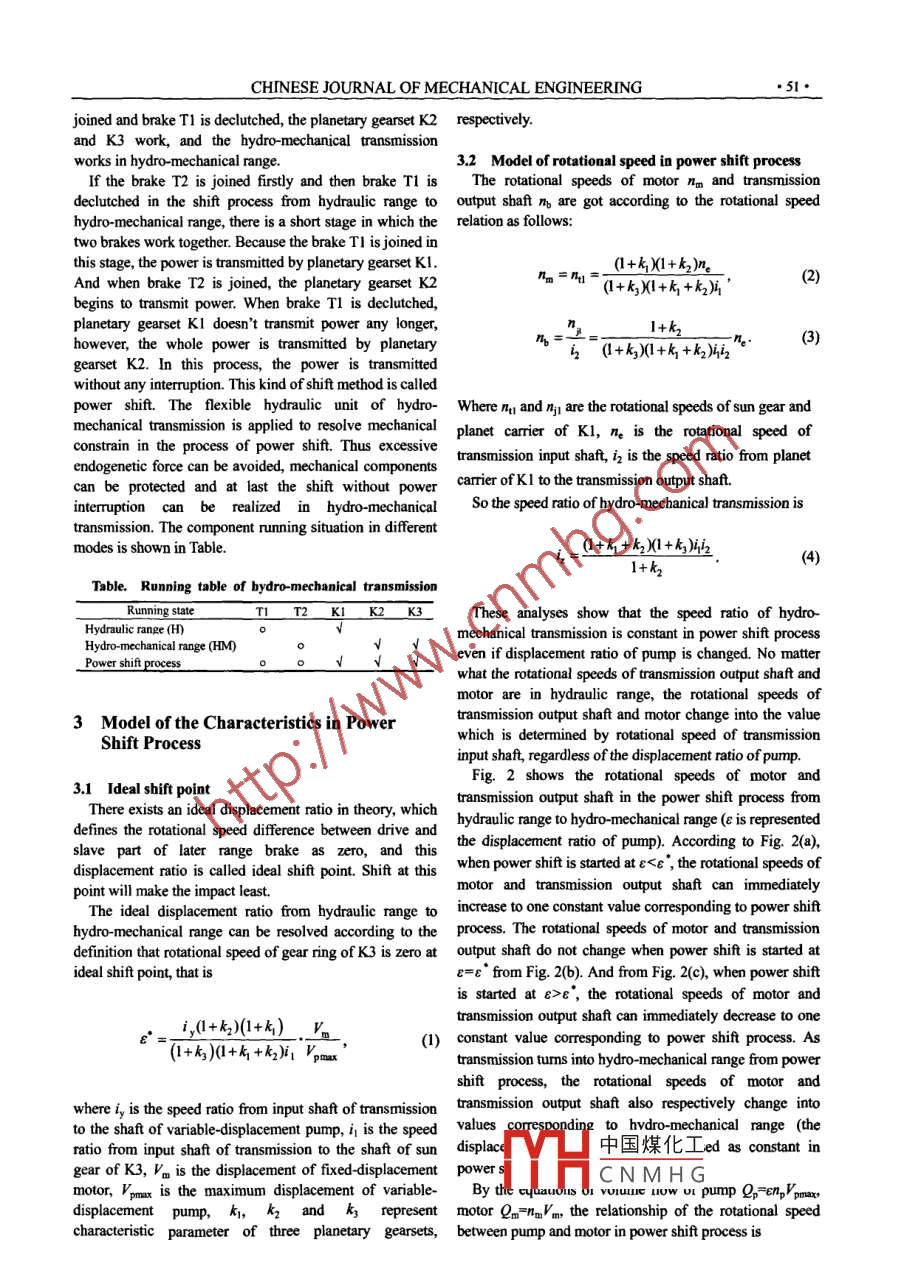 CHINESE JOURNAL OF MECHANICAL ENGINEERING●50●Vol. 22, No. 1, 2009DOI: 10.3901/CME.2009.01.050, available online at ww.jmenet.com www.cjmcnet.com.cnCharacteristics on Hydro-mechanical Transmission in Power Shift ProcessHU Jjibin*, WEI Chao, YUAN Shihua, and JING ChongboNational Key Laboratory of Vehicular Transmission, Beijing Institute of Technology, Bejing 100081, ChinaReceived September 16, 2008; revised January 4, 2009; accepted January 5, 2009; published lectronically January 5, 2009Abstract: To improve the vehicular power and acceleration performance and reduce the shift impact, the study of the characteristics onpower shift is necessary. Based on the flexible hydraulic unit of hydro-mechanical transmission, this paper explores the feasibility ofshift without power interuption. With the four models concerning displacement ratio, rotational speed, rotational torque and power atideal shift point, the characteristics on power shift in dfferent running conditions are analyzed, and the rules of power shift are revealed.The theoretical analysis and test results show that the hydro- mechanical transmission can shift without power interuption in differentnunning conditions. Furthermore, there exists an ideal shift point in theory, at which point the cycle power in hydro- mechanicaltransmission can't be generated, and the impact on the system can be reduced to the minimum. However, if before or afier this idealshift point, a cycle power can be generated.mechanical transmission. Based on the flexible hydraulicIntroductionunit of hydro-mechanical transmission, this paper exploresthe feasibility of running in the stage of dual range and thesystem characteristics on shift without power interruption.stepless transmission which is suitable for transmittingThe research results are supposed to theoretically supportlarge power. It consists of some ranges in which the speedthe study on control strategy served to improve the shiftratio can be changed continuously. And speed ratios ofquality.different ranges can be linked up by the correct shift control.In this way, the transmission can get a expanded range of2 Description of Power Shiftcontinuous speed ratiol-. At present, many scholars focusresearches on the scheme design, control method of speedFig. 1 is the drive diagram of one two range hydro-ratio, the shifing control strategy of clutches, and the mechanical transmission, which consists of two brakes,consolidated control strategy of power train system, etcl+ . three planetary gearsets, one variable- displacement pump,Their analysis results show thaarithmetic type and one fixed displacement motor.hydro-mechanical transmission applies to the variablesteering in the tracklayers for the sake of its constant.T2moment output and geometric one to the straight-linepropulsion! t0. The speed ratio follow-up control methodcan achieve the regulation of engine speed, and PID controlh[10-13] Aalgorthm is good at the speed ratio control。 Andshiting with the short overlapping time of clutches canKI K2K3Outputreduce the impact and decrease the time of powerinterruption"4. Up to now, there is no published theoretical影article about the feasibility of shift without powerinterruption of hydro-mechanical transmission.So far, the shifting control strategy of bhydro-mechanical. Puimtransmission is similar to the strategy of step automatic中國煤化工ngetransmission. So the step automatic transmission can't shiftwithout power interruption. Neither do the hydro-YHCNMHGsionWhen brake T1 is joined and brake T2 is declutched, theplanetary gearset Kl works, the hydro-mechanicalThis project is supported by National Key LaboratorTasission Foundaion of China (Grant No. 9140C3402050702)Chicular transmission works in hydraulic range. When brake T2 isCHINESE JOURNAL OF MECHANICAL ENGINEERING●51●joined and brake T1 is declutched, the planetary gearset K2 respectively.and K3 work, and the hydro-mechanical transmissionworks in hydro-mechanical range.3.2 Model of rotational speed in power shift processIf the brake T2 is joined firstly and then brake T1 isThe rotational speeds of motor nm and transmissiondeclutched in the shift process from hydraulic range to output shaft m are got according to the rotational speedhydro-mechanical range, there is a short stage in which the relation as follows:two brakes work together. Because the brake TI is joined inthis stage, the power is transmitted by planetary gearset KI."_=nmy=(1+k)(1+k)n。(2)And when brake T2 is joined, the planetary gearset K2(1+kj)(1+k +左)片'begins to transmit power. When brake T1 is declutched,planetary gearset KI doesn't transmit power any longer,1+khowever, the whole power is transmitted by planetary"q° (+k)1+h+k)后”。(3)gearset K2. In this process, the power is transmittedwithout any interruption. This kind of shift method is calledpower shift. The flexible hydraulic unit of hydro-Where nu and 1:1 are the rotational speeds of sun gear andmechanical transmission is applied to resolve mechanicalplanet carrier of K1, ne is the rotational speed ofconstrain in the process of power shift. Thus excessivetransmission input shaft, in is the speed ratio from planetendogenetic force can be avoided, mechanical componentscan be protected and at last the shift without powercarrier of K1 to the transmission output shaft.interruption can be realized in hydro-mechanicalSo the speed ratio of hydro-mechanical transmission istransmission. The component running situation in differentmodes is shown in Table.,= (1+h+k)X1+4)位(4)1+k2Table. Running table of hydro .mechanical transmissionRunning stateK2_ K3These analyses show that the speed ratio of hydro-Hydraulic range (H)mechanical transmission is constant in power shift processHydro-mechanical range (HM)even if displacement ratio of pump is changed. No matterPower shift processwhat the rotational speeds of transmission output shaft andmotor are in hydraulic range, the rotational speeds of3 Model of the Characteristics in