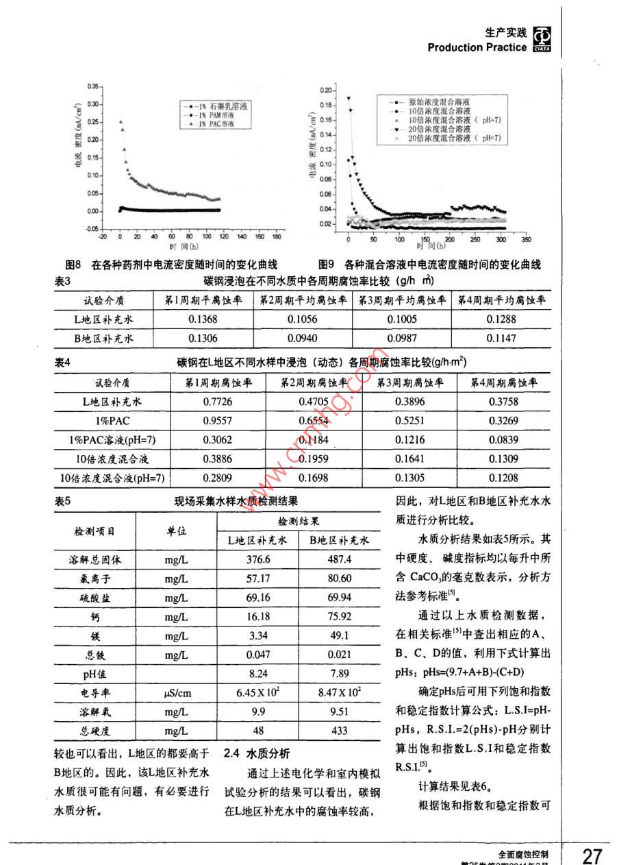 生產實踐Production Practice循環(huán)水管道腐蝕原因分析:楊培燕'張繼恒’顧寶珊’李黎’董小冬2劉汝平?楊國賢(1.中國鋼研科技集團有限公司先進金屬材料涂鍍國家工程實驗室,北京100081;2.廊坊天海高壓容器有限公司,河北廊坊065000)摘要:用室內模擬實驗、電化學實驗、水質分析、腐蝕產物的成分分析和XRD分析等方法,對某壓力容器廠碳鋼循環(huán)水管道腐蝕穿孔原因進行了分析。結果表明:碳鋼在冷卻水中的腐蝕主要是由溶解氧引起的電化學腐蝕,腐蝕的主要原因是,該廠補充水源為嚴重腐蝕性水。關鍵詞:循環(huán)水系統(tǒng)腐蝕原因水質分析 腐蝕性水中圖分類號: TG172.5文獻標識碼: A文章編號: 1008-7818(2011)02-0023-07Causes of Corrosion in the Circulating Water SystemYANG Peiyan', ZHANG J-heng, GU Bao-shan',uu', DONG Xiao dong', LIU Ru-ping, YANG Guo-xian?(1. National Engineering Laboratory for Advanced Coatings Technology of Metal Material, China lron &Steel Research Institute Group, Bejjing 100081, China;2. LangFang TianHai High Pressure Container Co., Ltd, Langfang 065000 China)Abstract: The causes of corrosion in the circulating water system at Langfang plant have been studiedby means of rotary coupon corrosion tests, linear polarization, water quality research, X -ray diffraction(XRD) and scanning electron microscope(SEM). The results demonstrated that the corrosion of steelcarbon in the circulating water system was caused mainly by the electrochemical corrosion of dissolvedoxygen in the water. The main reason of corrosion was that the added water in recycling circulating watersystems was the corrosive water.Key words: circulating water system; corrosion cause; water quality research; corrosive water0引言量也越來越高,循環(huán)水管道腐蝕年以上, 沒有明顯腐蝕現(xiàn)象發(fā)生。問題逐漸突出"。由于B地區(qū)的補充水源為該隨著我國水資源的日益貧某壓力容器有限公司是一家地區(qū)深井水, 而地區(qū)的補充水源乏,工廠對節(jié)約用水的意識也在生產高壓容器的廠家,該公司在B為該地區(qū)自來水, 因此,本文通逐漸增強,因此,循環(huán)冷卻水成為;地區(qū)和L地區(qū)有兩個生產基地,兩過對L地區(qū) 的腐蝕管道進行失效分大部分工廠用水量的主要組成部個生產基地的循環(huán)水管道材質基本析, 對B和L兩地區(qū)的水質進行分分,工業(yè)冷卻水循環(huán)后,雖然大相同,L地區(qū)的設備2008年初投入析, 以及腐蝕試驗對比,對管道幅度地節(jié)約了用水量,但從技術使用,管道使用7個月,進行維護腐蝕的原因和機理進行 了研究和和管理上對設備運營提出更高的檢修時發(fā)現(xiàn)循環(huán)水管路發(fā)生了較嚴探討, 在此基礎上對今后如何減要求。特別是近年來隨著補充水重的腐蝕,而B地區(qū)的設備使用5少或防 止此類腐蝕的發(fā)生提出了質的逐年惡化,循環(huán)水中的雜質含作者簡介:楊培燕(1978-) ,女,碩士,工程師,主要從事腐蝕與防護方面的研究工作。全面腐蝕控制23同生產實踐品Production Practice公司提供的自來水或試驗室去離旋轉 速度大約40轉/min,懸掛時子水配制。三電極系統(tǒng)浸泡在試間分 為四個周期,每個周期間隔1試驗方法驗介質中,電極與金屬腐蝕測試18天。1.1腐蝕產物分析儀的對應接頭連接,并使用定時1.4 水質分析首先通過現(xiàn)場觀察以及現(xiàn)巡回數(shù)據(jù)記錄儀打印記錄研究電循環(huán)水系統(tǒng)中,最可能出現(xiàn)場拆卸下來的腐蝕試樣的宏觀觀極的極化電流,通過測定極化電的問題 就是結垢和腐蝕問題,因.察,對管道的腐蝕程度以及形貌流的變化,確定極化阻率和腐蝕此, 必須先對循環(huán)冷卻水水質進進行初步了解。由于管內壁油污速率。行分析,主要考慮pH值、鈣硬較嚴重,為便于進一步清晰觀1.3室內模擬試驗度、總堿度、水溫、總溶解固體察,對某些管壁進行了清洗。最用靜態(tài)掛片失重試驗和動態(tài)旋五個重 要因素,判斷水質的基本后選取較為典型的腐蝕部位,利轉掛片試驗測定水樣的侵蝕性",依 據(jù)采用飽和指數(shù)L.S.I和穩(wěn)定指用掃描電子顯微鏡(SEM)對表試片為Q235-B的標準腐蝕試片數(shù)R.S.1I, 本研究主要研究了該公面腐蝕產物進行微觀形貌觀察與(40mm x 20mm x3.5mm)。試司補充水的水質。能譜分析,取有代表性的腐蝕產驗溫度為40C+1C,試驗介質為其中硬度、堿度指標均以每物部位,采用X-Ray衍射儀(XRD)在L地區(qū)和B地區(qū)現(xiàn)場采集水樣及升中 所含CaCO,的毫克數(shù)表示,進行定性分析。模擬現(xiàn)場情況,根據(jù)研究需要實分析方法參 考標準"。1.2電化學試驗驗室所配制的溶液。2試驗結果與討論采用同種材料三電極體系進靜態(tài)模擬試驗:試驗時每個行線性極化,用自凝牙托粉封裝容器內掛三個試片,計算平均腐2.1腐蝕產物分析碳鋼試片,暴露面積為1.00cm2,蝕率,常壓開口條件;懸桂時間;選取較為典型的腐蝕部位,使用同材、同形、同大的材料分為四個周期, 第-周期為5天,利用掃描電子顯微鏡(SEM)對制成研究電極、輔助電極和參比第二周期為10天,第三周期為15表面腐蝕產物進行微觀形貌觀察電極,三支電極呈等邊三角形排天,第四周期為20天,每周期更與能譜分析,分析結果如圖1圖列,組成同種材料三電極系統(tǒng)”,換一次溶液。5所示。試驗介質為廊坊現(xiàn)場采集水樣,動態(tài)模擬試驗:試驗儀器為通過對低壓管段的成分分及模擬現(xiàn)場情況,根據(jù)研究需要RCC-I型旋轉掛片腐蝕實驗