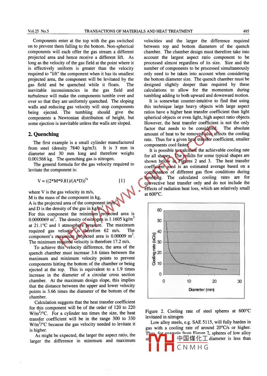 TRANSACTIONS OF MATERIALS AND HEAT TREATMENTPROCEEDINGS OF THE 14IFHTSE CONGRESSOctober 2004Gas Quenching Small ComponentsPaul StrattonBOC, Sheffield, UKAbstract: Gas quenching is an environmentally friendly and effective way of quenching components. However it has noteen possible to apply it to small components because of the difficulties of jigging. A method of gas quenching such smallcomponents is described in which they are levitated in a confined gas stream. The method is suitable for quenching lowKey words: gas quenching, levitation, small componentsIT HAS BEEN SHOWN thathing is aenvironmentally friendly quenching method that can be 1. The Quench Chamberapplied to bulk loads in vacuum [1] or conventionalFor "light"components a quench chamber can befurnaces [2] and to individual components[31. It gives conceived that requires only the lower nozzle field.Amore uniform results and hence less distortion than nozzle field (or equivalents such as a high wire to holeconventional liquid quenchants [4]. Until now, therehas been no way to apply this technology toratio wire mesh above a plenum chamber or acomponents that are too small to be effectively Jgged perforated plate like that used in fluidised bed furnaces[6 )produces an almost uniform high velocity gasto keep them separate during the quenching processstream in an enclosed chamber. The"nozzle"field is atxperiments have shown that quite large and heavy(O 75kg) components can be floated in a nozzle field the bottom, the sides are solid and the top open(Figure1). The sides of the chamber are angled slightly[5]. In this technology an upper nozzle field exerts a outwards to produce a constantly falling gas velocity inforce equal to that from the lower field minus thecomponent weight and keeps it in place. This is order to give more control over the components beingobviously not practical for small, light components and quenched. It has been shown in other applications thatanother method of constraining them is requiredthe maximum divergence angle is 7o if a uniformvelocity field is to be maThe volume of gas usedThe slope of the wallsst be less than thatessentially uniform flowThe volume of gas usedrequired velocity herePerforated plawire mesh. The areaof the holes must beless than the area ofThe parallel portion of thethe inlet pipe to thevessel must be long enoughplenum chambeto achieve essentially uniformFigure 1. A schematic of the quenching chamber(not to scale)中國煤化工CNMHGTRANSACTIONS OF MATERIALS AND HEAT TREATMENTComponents enter at the top with the gas switched velocities and the larger the difference requiredon to prevent them falling to the bottom Non-spherical between top and bottom diameters of the quenchcomponents will each offer the gas stream a different chamber. The chamber design must therefore take intoprojected area and hence receive a different lift. As account the largest aspect ratio component to belong as the velocity of the gas field at the point where it processed almost regardless of its size. Size and theis effectively uniform is greater than the velocity number of components to be processed simultaneouslyrequired to"lift"the component when it has its smallest only need to be taken into account when consideringprojected area, the component will be levitated by the the bottom diameter size. The quench chamber must begas field and be quenched while it floats. Thedesigned slightly deeper than required byinevitable inconsistencies in the gas field and calculations to allow for the momentum duringturbulence will make the components tumble over and tumbling adding to both upward and downward motion.over so that they are uniformly quenched. The slopingIt is somewhat counter-intuitive to find that usingwalls and reducing gas velocity will stop components this technique large heavy objects with large aspectbeing ejected. The tumbling should give the ratios have a higher heat transfer coefficient than lightcomponents a Newtonian distribution of height, but spherical objects or even light, high aspect ratio objectssome ejection is inevitable unless the walls are slopedHowever, the heat transfer coefficient is not the onlyfactor that needs to be considered. The absolute2. Quencheramount of heat to be removed also affects the coolingThe first example is a small cylinder manufactured rate. Thus for a given heat transfer coefficient, smallerfrom steel(density 7840 kg/m3). It is 3 mm inomponents cool fasterdiameter and 30 mm long and therefore weighs for all shapes. The results for some typical shapes are0.001568 kg. The quenching gas is nitrogenThe general formula for the gas velocity required toshown below in Figures 2 and 3. The heat transfercoefficient used is an estimated average based on alevitate the component is:combination of different gas flow conditions duringV=(2*M*9.81)(A*D)tumbling. The calculated cooling rates are forconvective heat transfer only and do not include theffects of radiation heat loss, which are relatively smallwhere V is the gas velocity in m/s,at600°C.M is the mass of the component in kg,a is the projected area of the component in mand d is the density of the gas in kg/mFor this component the minimum projected area is0. m. The density of nitrogen is 1. 1605 kg/m50at 21. 1C and 1 atmosphere pressure. The maximumrequired gas velocity is therefore 62 m/s. Thecomponent's maximum projected area is 0.00009 mThe minimum required velocity is therefore 17. 2 m/sTo achieve this velocity difference, the area of thequench chamber must increase 3.6 times between theg20maximum and minimum velocity points to preventcomponents hitting the bottom of the chamber or beingejected at the top. This is equivalent to a 1.9 timesincrease in the diameter of a circular cross section0chamber. At the maximum design slope, this implies10that the distance between the upper and lower velocitypoints is 3.66 times the diameter of the bottom of theDiameter(mmchamberCalculation suggests that the heat transfer coefficientfor 