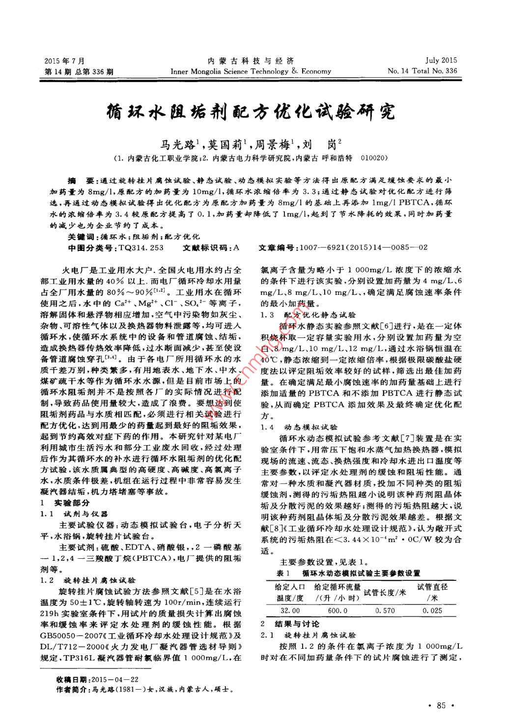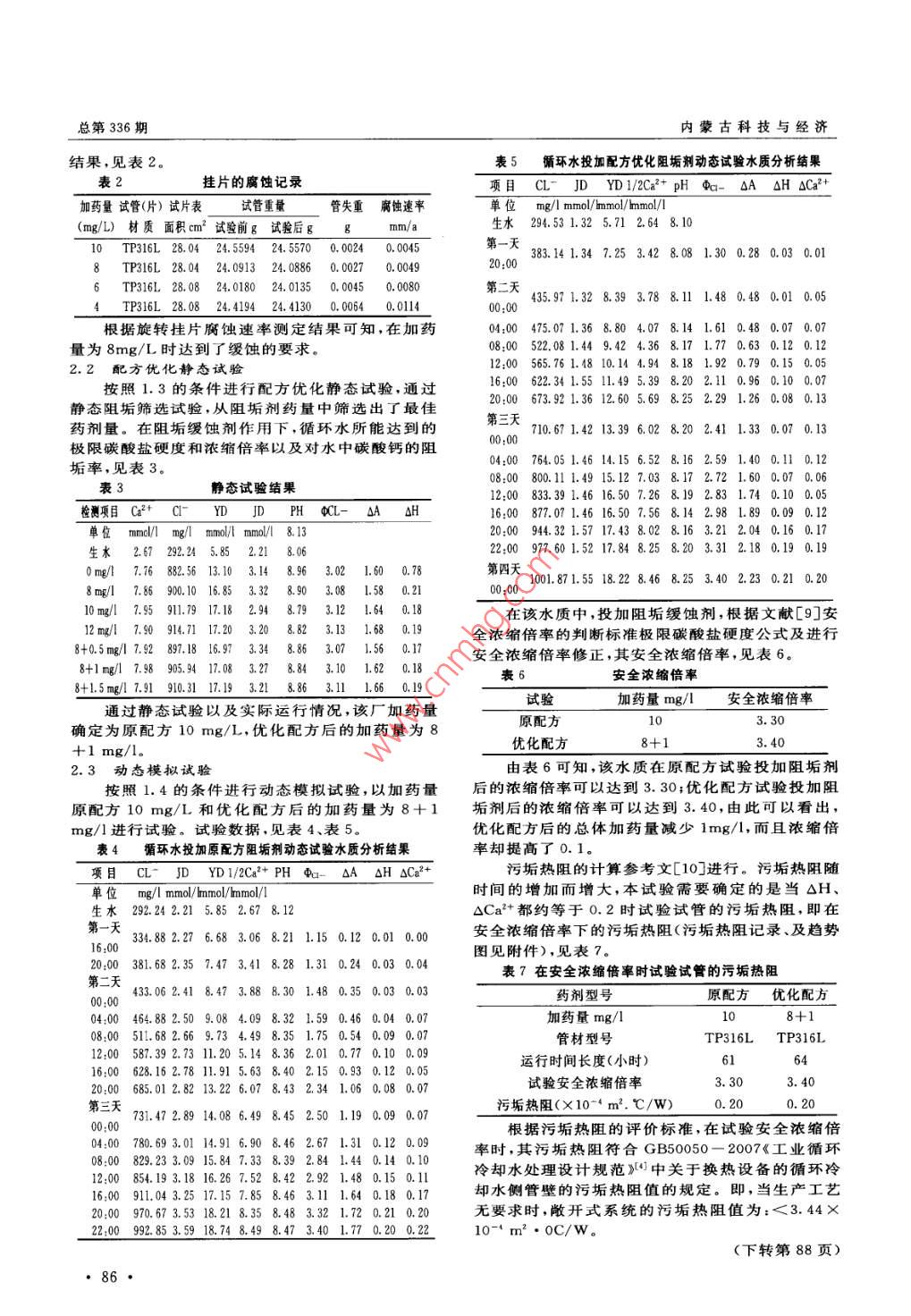 2015年7月內(nèi)蒙古科技與經(jīng)濟July 2015第14期總第336期.Inner Mongolia Science Technology & FconomyNo. 14 Total No. 336循環(huán)水阻垢劑配方優(yōu)化試驗研究,馬光路' ,莫國莉',周景梅',劉崗2(1.內(nèi)蒙古化工職業(yè)學院;2.內(nèi)蒙古電力科學研究院,內(nèi)蒙古呼和浩特010020)摘要:通過旋轉(zhuǎn)桂片 腐蝕試驗、靜態(tài)試驗、動態(tài)模擬實驗等方法得出原配方滿足緩蝕要求的最小加藥量為8mg/l,原配方的加藥量為10mg/l,循環(huán)水濃縮倍率為3. 3;通過靜態(tài)試驗對優(yōu)化配方進行篩選,再通過動態(tài)模擬試驗得出優(yōu)化配方為原配方加藥量為8mg/l的基礎(chǔ)上再添加1mg/1 PBTCA,循環(huán)水的濃縮倍率為3.4較原配方提高了0. 1,加藥量卻降低了1mg/l,起到了節(jié)水降耗的效果,同時加藥量的減少也為企業(yè)節(jié)約了成本。關(guān)鍵詞:循環(huán)水;阻垢劑;配方優(yōu)化中圖分類號:TQ314.253文獻標識碼:A文章編號:1007- -6921(2015)14- -0085- -02火電廠是工業(yè)用水大戶.全國火電用水約占全氯離子含量為略小于1000mg/L濃度下的濃縮水部工業(yè)用水量的40%以上.而電廠循環(huán)冷卻水用量的條件下進行該實驗,分別設(shè)置加藥量為4mg/L、6占全廠用水量的80%~90%1.2]。工業(yè)用水在循環(huán)mg/L.8 mg/L、10 mg/L.,確定滿足腐蝕速率條件使用之后,水中的Ca2+ 、Mg*+、C1-、SO,-等離子,的最小加藥量。溶解固體和懸浮物相應(yīng)增加,空氣中污染物如灰塵、1.3配方優(yōu)化靜態(tài)試驗雜物、可溶性氣體以及換熱器物料泄露等,均可進入循環(huán)水靜態(tài)實驗參照文獻[6]進行,是在一定體循環(huán)水,使循環(huán)水系統(tǒng)中的設(shè)備和管道腐蝕、結(jié)垢,積燒杯取一定容量實驗用水,分別設(shè)置加藥量為空造成換熱器傳熱效率降低,過水斷面堿少,甚至使設(shè)白.8 mg/L、10 mg/L、12 mg/L,通過水浴鍋恒溫在備管道腐蝕穿孔3.0。由于各電廠所用循環(huán)水的水40°C,靜態(tài)濃縮到一定濃縮倍率,根據(jù)極限碳酸鹽硬質(zhì)千差萬別,種類繁多,有用地表水、地下水、中水、度法以評定阻垢效率較好的試樣,篩選出最佳加藥煤礦疏干水等作為循環(huán)水水源,但是目前市場上的量。在確定滿足最小腐蝕速率的加藥量基礎(chǔ)上進行循環(huán)水阻垢劑并不是按照各廠的實際情況進行配添加適量的PBTCA和不添加PBTCA進行靜態(tài)試制,導致藥品使用量較大,造成了浪費。要想達到使驗,從而確定PBTCA添加效果及最終確定優(yōu)化配阻垢劑藥品與水質(zhì)相匹配,必須進行相關(guān)試驗進行方。配方優(yōu)化,達到用最少的藥量起到最好的阻垢效果,.4 動態(tài)模擬試驗起到節(jié)約高效對癥下藥的作用。本研究針對某電廠循環(huán)水動態(tài)模擬試驗參考文獻[7]裝置是在實利用城市生活污水和部分工業(yè)廢水回收,經(jīng)過處理驗室條件下,用常壓下飽和水蒸氣加熱換熱器,模擬后作為其循環(huán)水的補水進行循環(huán)水阻垢劑的優(yōu)化配現(xiàn)場的流速、流態(tài)、換熱強度和冷卻水進出口溫度等方試驗,該水質(zhì)屬典型的高硬度、高堿度、高氯離子主要參數(shù),以評定水處理劑的緩蝕和阻垢性能。通水,水質(zhì)條件極差,機組在運行過程中非常容易發(fā)生常對一種水質(zhì)和凝汽器材質(zhì),投加不同種類的阻垢凝汽器結(jié)垢,機力塔堵塞等事故。緩蝕劑,測得的污垢熱阻越小說明該種藥劑阻晶體1實驗部分垢及分散污泥的效果越好;測得的污垢熱阻越大,說1.1試劑與儀器明該種藥劑阻晶體垢及分散污泥效果越差。根據(jù)文主要試驗儀器:動態(tài)模擬試驗臺,電子分析天獻[8]<工業(yè)循環(huán)冷卻水處理設(shè)計規(guī)范》,認為敞開式平,水浴鍋,旋轉(zhuǎn)掛片試驗臺。系統(tǒng)的污垢熱阻在<3.44X10-'m2●0C/W較為合主要試劑:硫酸、EDTA、硝酸銀,,2一磷酸基適。一1,2,4 - -三羧酸丁烷(PBTCA),電廠提供的阻垢主要參數(shù)設(shè)置,見表1。劑等。表1循環(huán)水動態(tài)模擬試驗主要參數(shù)設(shè)置1.2旋轉(zhuǎn)掛片腐蝕試驗旋轉(zhuǎn)掛片腐蝕試驗方法參照文獻[5]是在水浴給定入口給定 循環(huán)流量試管長度/米試管直徑溫度為50士1C,旋轉(zhuǎn)軸轉(zhuǎn)速為100r/min,連續(xù)運行溫度/度/(升 /小時)/米32. 00600. 00. 5700. 025219h實驗室條件下,用試片的質(zhì)量損失計算出腐蝕率和緩蝕率來評定水處理劑的緩蝕性能。根據(jù)2結(jié)果與討論GB50050- 2007《工 業(yè)循環(huán)冷卻水處理設(shè)計規(guī)范》及2.1旋轉(zhuǎn)掛片 腐蝕試驗DL/T712-2000《火力發(fā)電廠凝汽器管選材導則》按照1.2的條件在氯離子濃度為1 000mg/L規(guī)定. TP316L凝汽器管耐氯臨界值1 000mg/L.在時對在不同加藥量條件下的試片腐蝕進行了測定,收稿日期:2015-04-22作者簡介:馬光路(1981-)女,漢族,內(nèi)蒙古人,碩士?!?5●總第336期內(nèi)蒙古科技與經(jīng)濟結(jié)果,見表2。表5循環(huán)水投加 配方優(yōu)化阻垢劑動態(tài)試驗水質(zhì)分析結(jié)果表2掛片的腐蝕記錄項目CL JD YD1/2C2+ pH a_ OA AH SCa+加藥量試管(片)試片表試管重量管失重腐蝕速率單位mg/1 mmo/mmol/ lmmol/1生水294.531.32 5.71 2.64 8.10(mg/L)材質(zhì)面積cm2 試驗前g試驗后g gmm/aTP316L 28.04 24.5594 24. 55700. 00240.0045.第一天383.141.34 7.25 3.42 8.08 1.30 0.28 0.03 0.01TP316L 28.04 24.0913 24.0886 0.0027 0.004920:00TP316L 28.08 24.0180 24.0135 0. 0045 0. 0080第二