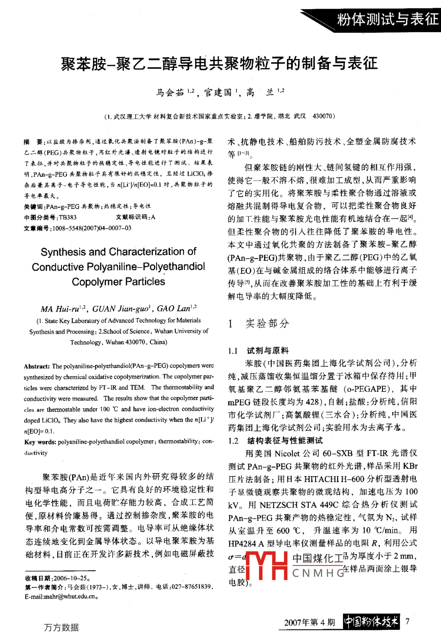 粉體測(cè)試與表征聚苯胺-聚乙二醇導(dǎo)電共聚物粒子的制備與表征馬會(huì)茹1.2,官建國',高、蘭12(1.武漢理工大學(xué)材料復(fù)合新技術(shù)國家重點(diǎn)交驗(yàn)室;2理學(xué)院,湖北武漢430070)摘要:以鹽峻為摻雜荊,通過氧化共聚法制備 了聚苯胺(PAn)-g-聚術(shù)、抗靜電技術(shù)船舶防污技術(shù)、全塑金屬防腐技術(shù)乙二醇(PEG)共聚物粒子,用紅外光譜、遺射電鏡對(duì)粒子的結(jié)構(gòu)進(jìn)行等0~31。了表征,并對(duì)共聚物粒子的熱穗定性、導(dǎo)電性能進(jìn)行了測(cè)試、結(jié)果表.但案苯胺鏈的剛性大、鏈間氫鍵的相互作用強(qiáng),明,PAn-g- PEG共聚物粒子具有很好的熱穩(wěn)定性。且經(jīng)過LiCIO摻使得它一般不溶不熔,很難加工成型,從而嚴(yán)重影響雜后兼其離子-電子導(dǎo)電性能,當(dāng)rLi}]n[E0)=0.1時(shí),共聚物粒子的.了它的實(shí)用化。將聚苯胺與柔性聚合物通過溶液或?qū)щ娐首畲蟆jP(guān)鍵詞:PAn-g- -PEG共聚物;熱穩(wěn)定性;導(dǎo)電性熔融共混制得導(dǎo)電復(fù)合物,可以把柔性聚合物良好中團(tuán)分類號(hào):TB383文獻(xiàn)標(biāo)識(shí)碼:A的加工性能與聚苯胺光電性能有機(jī)地結(jié)合在一起門。文章編號(hào): 108-5548200)04-0007-03但柔性聚合物的引人往往降低了聚舉胺的導(dǎo)電性。本文中通過氧化共聚的方法制備了聚苯胺-聚乙醇Synthesis and Characterization of(PAn-g- -PEG)共聚物,由于聚乙二醇(PEG)中的乙氧Conductive Polyaniline- Polyethandiol基(EO)在與堿金屬組成的絡(luò)合體系中能夠進(jìn)行離子Copolymer Particles傳導(dǎo)圖,從而在改善聚苯胺加工性的基礎(chǔ)上有利于緩解電導(dǎo)率的大幅度降低。MA Hui-rul-2, CUAN Jian-guo' , GAO Lanl.2(1. State Key Laboratory of Advanced Technology for Materials1實(shí)驗(yàn)部分Synthesis and Processing; 2.School of Science , Wuhan University ofTechnology, Wuhan 430070, China)1.1 試劑與原料Abstract: The polyaniline-polyethandiol(PAn-g PEG) copolymers werc苯胺(中國醫(yī)藥集團(tuán)上?;瘜W(xué)試劑公司),分析sythesized by chemical oxdative coplymerztion. The copolymer par-純 ,減壓蒸餾收集恒溫餾分置于冰箱中保存待用;甲ticles were charaterized by FT-IR and TEM. The thermostability and氧基聚乙二醇鄰氨基苯基醚(o-PEGAPE), 其中conductivity were measured. The results show that the copolymer parti-mPEG鏈段長(zhǎng)度均為428),自制;鹽酸:分析純,信陽cles are thermnostable under 100 C and have ion-electron conductivity市化學(xué)試劑廠;高氯酸鋰(三水合):分析純,中國醫(yī)doped LiClO。They also have the highest conductivity when the r[Li+]藥集團(tuán)上?;瘜W(xué)試劑公司;實(shí)驗(yàn)用水為去離子水。n[EO]= 0.1.Key words: polyaniline-polyethandiol copolymer; thrmostability; con-1.2 結(jié)構(gòu)表征與性能測(cè)試duetivity用美國Nicolet公司60- -SXB型FT-IR光譜儀測(cè)試PAn-g- PEG共聚物的紅外光譜,樣品采用KBr聚苯胺(PAn)是近年來國內(nèi)外研究得較多的結(jié)壓片法制備;用日本HITACHIH-600分析型透射電構(gòu)型導(dǎo)電高分子之一。它具有良好的環(huán)境穩(wěn)定性和子顯微鏡觀察共聚物的微觀結(jié)構(gòu),加速電壓為100電化學(xué)性能,而且電荷貯存能力較高,合成工藝簡(jiǎn)kV。用NETZSCHSTA449C綜合熱分析儀測(cè)試便,原材料價(jià)廉易得。通過控制摻雜度聚苯胺的電PAn-g- PEG共聚產(chǎn)物的熱穩(wěn)定性,氣氛為N2,試樣導(dǎo)率和介電常數(shù)可按需調(diào)整。電導(dǎo)率可從絕緣體狀從室溫升至600 C,升溫速率為10 C/min。用態(tài)連續(xù)地變化到金屬導(dǎo)體狀態(tài)。以導(dǎo)電聚苯胺為基HP4284A型導(dǎo)電率儀測(cè)量樣品的電阻R,利用公式礎(chǔ)材料,目前正在開發(fā)許多新技術(shù),例如電磁屏蔽技σ=中國煤化工活為厚度小于2mm,直徑Y(jié)HCNMHG連樣品兩面涂上銀導(dǎo)收稿日期:2006-10-25。第一作者簡(jiǎn)介:馬會(huì)茹(1973-),女,博士,講師。電話:027-87651839,電膠)。E-mail:mahr@wbut.edu.cn。2007年第4期中國粉體技術(shù)7粉體測(cè)試與表征24n224 q1.3 共聚物的制備在500mL三口燒瓶中,加人100mL溶有甲氧基聚乙二醇鄰氨基苯基醚的1 molL HCI溶液,將其置于冰水浴中,保持溶液溫度低于5 C,加入100 mL溶有過硫酸銨的1mol/LHCI溶液。將反應(yīng)瓶抽真空充氮,強(qiáng)烈攪拌下20min后,緩慢滴加溶有苯胺的1mol/L HCl溶液。然后在冰水浴中反應(yīng)24h,將反應(yīng)圖2 PAn-g- -PEG共聚物的TEM照片產(chǎn)物用布氏漏斗抽濾,用去離子水多次洗滌,得到鹽Fig.2 TEM image of PAn-g PEG copolymer particles酸摻雜的PAn- g -PEG共聚物。在一定量的PAn-g- -PEG共聚物水溶液中加入2.3熱穩(wěn)定性圖3為PAn-g-PEG共聚物的TG及DSC曲適量的LiCIO,攪拌24h進(jìn)行Lit摻雜后過濾.真空線。由DG曲線可見,在180、285和571 C出現(xiàn)3個(gè)干燥24 h,得到LiClO,與鹽酸共摻雜的PAn-g-PEG吸熱峰。對(duì)應(yīng)于TG曲線,可以看出共聚物在100 C共聚物(表示為PAn-g- PEG/HCI+ LiClO4)。以前幾乎沒有失重,表現(xiàn)出較好的熱穩(wěn)定性,在100~200 C之間的質(zhì)量損失主要米自于樣品中少量2結(jié)果與討論水分和HCl的散失。200~300 C之間質(zhì)量損失主要來自于樣品中PEG鏈段的斷裂,300C以后由于樣2.1 紅外光譜品中PAn鏈段也開始斷裂,所以樣品失重逐漸加劇。由圖1可以看出,1 591.1 497cm'分別為醌環(huán)和苯環(huán)的C=C伸縮振動(dòng)峰;800、1 030 cm'處分別100|*0.3540.30為1,2-二取代和1,2,4-三取代苯環