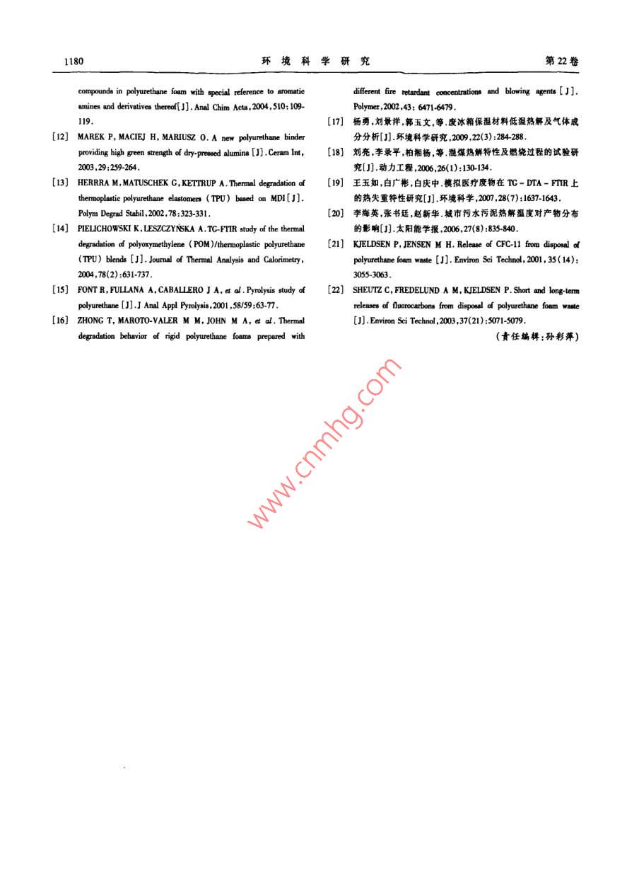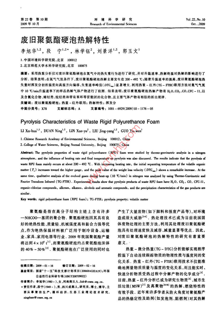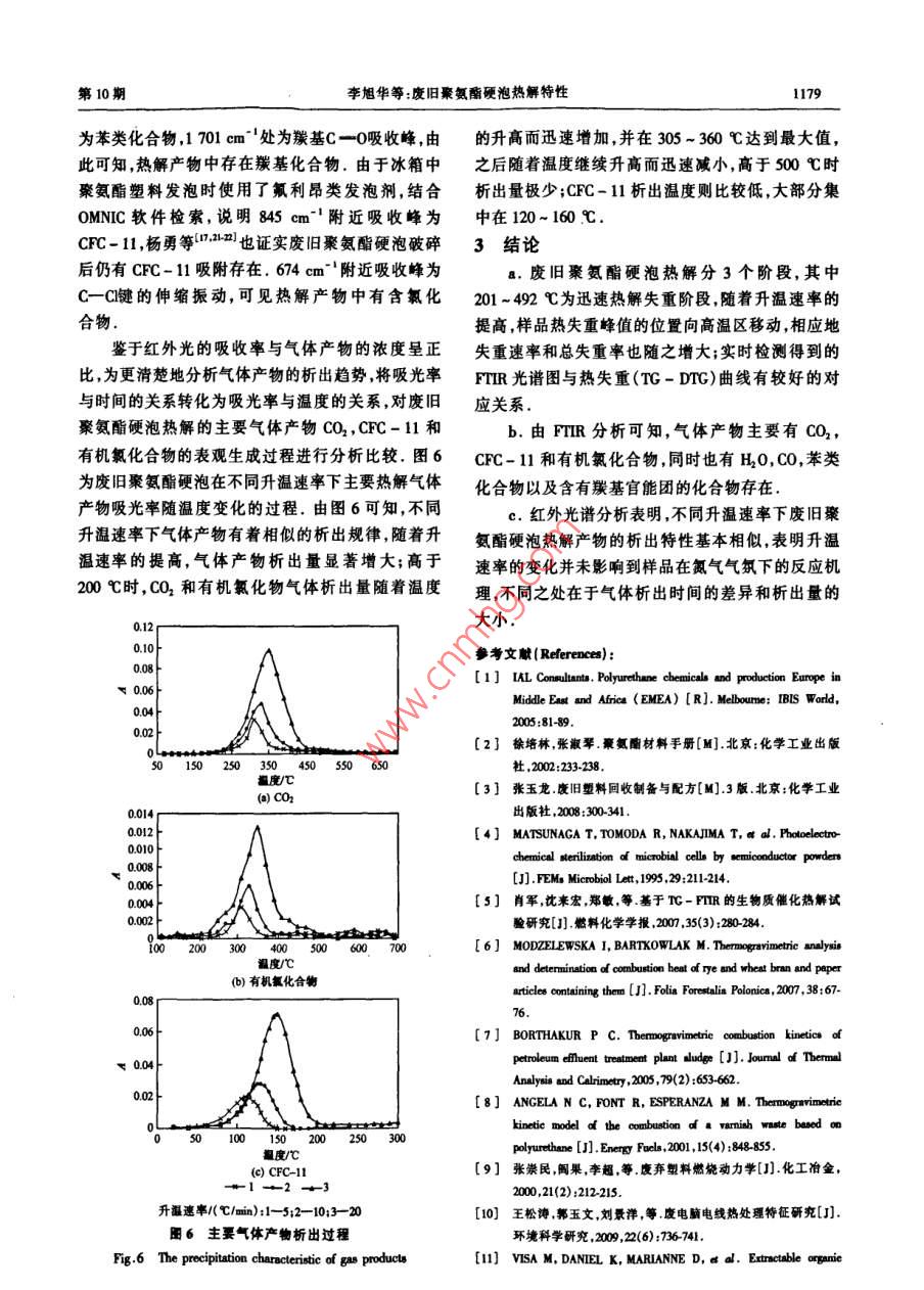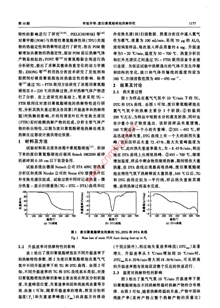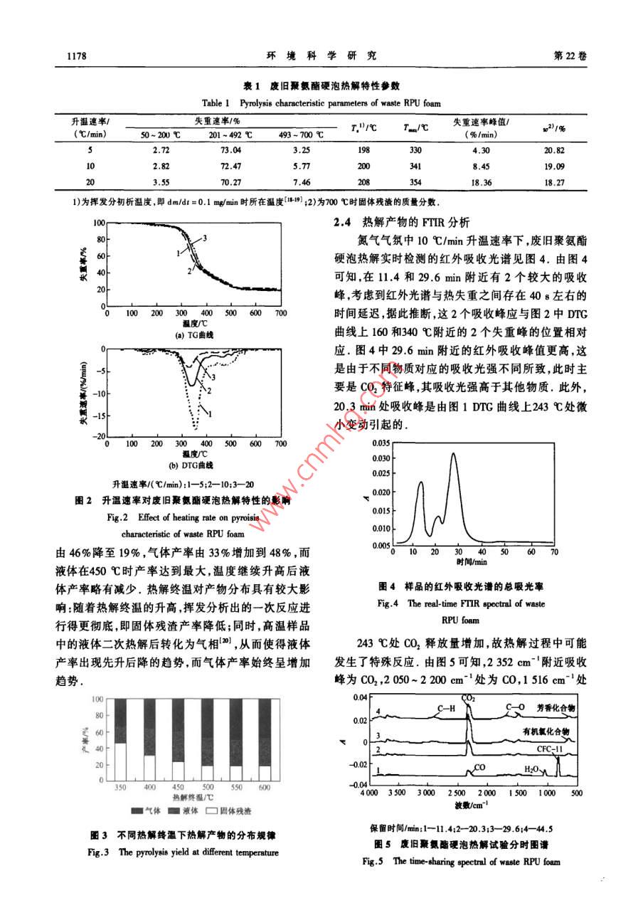 第22卷第10期環(huán)境科學(xué)研究Vol.22,No.102009年10月Research of Environmental SciencesOet. ,2009廢舊聚氨酯硬泡熱解特性李旭華,段寧12*, 林學(xué)鈺”,劉景洋"2,郭玉文'1.中國環(huán)境科學(xué)研究院,北京1000122.北京師范大學(xué)水科學(xué)研究院,北京100875摘要:采用熱重分析儀對廢舊聚氨酯硬泡在氮?dú)庵械臒崾е匦袨檫M(jìn)行了研究,并對升溫速率、熱解終溫對熱解的影響進(jìn)行了分析.結(jié)果表明:在氮?dú)鈿夥諚l件下,廢舊聚氨酯硬泡熱解主要發(fā)生在200-492C;隨著升溫速常的提高。廢舊聚氨酯硬泡熱失重時(shí)揮發(fā)分初析溫度向高溫方向偏移,失重速率峰值( DTC_. )顯著增大.利用熱重-紅外(IG - FTIR)聯(lián)用方法對氮?dú)鈿夥罩?0C/min升溫速事下的樣品熱解氣體產(chǎn)物進(jìn)行了檢測.結(jié)果表明:廢舊聚氨酯硬泡熱解產(chǎn)物有H0,CO,,CO,CFC-11,以及含氯化合物、烯烴類、烷烴類和帶有苯環(huán)等官能團(tuán)的化合物,且主要?dú)怏w產(chǎn)物有相似的析出規(guī)律.關(guān)鍵詞:廢舊聚氨酯硬泡;熱重-紅外聯(lián)用;熱解特性;揮發(fā)分中圈分類號: X78文獻(xiàn)標(biāo)志碼: A文章編號: 1001 - 6929(2009)10- 1176- 05Pyrolysis Characteristics of Waste Rigid Polyurethance FoamLI Xu-hua'", DUAN Ning" , LIN Xue-yu',LIU Jing-yang", GUO Yu-wen'1 .Chinese Research Academy of Envirnmental Sciences, Bejjing 10002, Chine2.Collge of Water Sciences, Beijing Normal University, Bejing 100875, ChinaAbstract: The pyrolysis properties of waste rigid polyurethance (RPU) foam were studied by thermo-gravimetrie analysis in a nitrogenatmosphere, and the influence of heating rate and final temperature on pyrolysis was also discused. The results indicate that the pyrolysis ofwaste RPU foeam mainly occurns at about 200 ~ 492 C. With inereasing heating rate, the initial separating temperature of the volatile organicmatter( T,) increases toward the higher pange, and the peak value of the weight loes velocity ( DTCG ) shows a remarkable incree. At thesame time, qualitative analysis of the evolved gases during heat-up (10 C/min) in nitrogen was analyred by using Thermo-Gravimetric andFourier Transform Infrared (TC-FTTR). Experimental results show that pyrolysis products of waste RPU foam have HO, CO2, co, CFC-11,organic-chlorine compounds, alkenes, alkanes, alcohols and aromatic compounds,and the precipitation characteristics of the gas products aresimilar.Key words: rigid polyurethane foam (RPU foam); TG- FTIR; pyrolysis property; volaile matter聚氨酯是指在高分子結(jié)構(gòu)主鏈上含有許多產(chǎn)生 了大量廢物(如下腳料和報(bào)廢產(chǎn)品等),對環(huán)境- -NHC0O-基團(tuán)的聚合物.聚氨酯硬泡因其具有良.造成很大威脅(4].熱處理技術(shù)已成為目前我國固好的絕熱性能、質(zhì)量輕、機(jī)械強(qiáng)度高和黏合力強(qiáng)等優(yōu)體廢物處理的主要方法,利用其處理廢舊聚氨酯硬點(diǎn),作為絕熱保溫材料被廣泛用于制冷設(shè)備、運(yùn)輸泡具有處理速度快及減容、減量顯著等優(yōu)點(diǎn).因此,業(yè)、家具、家用電器等行業(yè).2009年我國聚氨酯產(chǎn)量對廢舊聚氨酯硬泡的熱解特性的研究有著重要將達(dá)到4x10°凹",而聚氨酯硬泡約占聚氨酯泡沫體意義.的40%~50%2.聚氨酯硬泡在廣泛使用的同時(shí)也熱重-微分熱重(TG-DTG)分析能夠?qū)崿F(xiàn)程序控溫下自動連續(xù)跟蹤物質(zhì)的物理性質(zhì)與溫度間的變化關(guān)系.熱重-紅外(TC - FTR)聯(lián)用技術(shù)不僅能準(zhǔn)收稿日期: 2009-01-16修訂日期: 2009-02-16基金項(xiàng)目:國家“十一五”科技支撐計(jì)劃項(xiàng)目(2006BAC02A19);環(huán)保確地測量物質(zhì)質(zhì)量與溫度的變化關(guān)系,而且能實(shí)時(shí)、快速分析物質(zhì)受熱過程中分解產(chǎn)物的化學(xué)成分51.公益性行業(yè)科研專項(xiàng)(BGY200709022)目前,熱重-紅外分析已成為研究生物質(zhì)(61、城市生作者簡介:李旭華(1980- ),女,河南商丘人,ixh@ enes. org.cn.#責(zé)任作者,段寧(1949- ),男,四川成都人,研究員,博士,博導(dǎo),主;活垃圾(MSw)°]及高聚物(4)的熱解、燃燒特性的要從事清潔生產(chǎn)、循環(huán)經(jīng)濟(jì)、生態(tài)工業(yè)理論技術(shù)研究,有效手段. 近年來許多學(xué)者從防火角度對聚氨酯產(chǎn)ningduan@ craes.org.cn品的熱穩(wěn)定性及助劑(如發(fā)泡劑、阻燃劑)對其熱解第10期李旭華等:廢舊橐氨酯硬泡熱解特性1177特性的影響進(jìn)行了研究13.. PIELICHOWSKI 等(4)外變換光譜(IR)掃描數(shù)據(jù).熱重分析儀中通人氮?dú)鈱奂兹?POM)與熱塑性聚氨酯彈性體(TPU)共混作為載氣,流量為100 mLU/min,采用70 ug的Al20, .物的熱穩(wěn)定性和熱解特征進(jìn)行了研究,指出POM能質(zhì)坩堝裝樣品每次裝入樣品質(zhì)量約6 mg.升溫速夠增加共聚物的熱穩(wěn)定性,舔加POM前后熱解氣體率為5~ 20 C/min,溫度為50~700 C.熱重分析儀產(chǎn)物是相似的;FONT等[s)對聚氨酯黏合劑進(jìn)行熱和紅外光譜儀之間通過TG- FTIR聯(lián)用設(shè)備專業(yè)接分析研究,提出了求解其整體熱重變化的動力學(xué)??谶B接.為保證試驗(yàn)中熱解逸出的氣體不發(fā)生冷凝型; ZHONG等[)利用熱分析技術(shù)研究了發(fā)泡劑和和結(jié)構(gòu)的變化,接口和氣體傳輸線的溫度均設(shè)為阻燃劑對硬質(zhì)聚氨酯泡沫熱穩(wěn)定性的影響.楊勇180 C ,掃描波數(shù)范圍為400~450 cm~' .等["]通過TC-FTIR聯(lián)用方法研究了冰箱用聚氨酯2結(jié)果及討論硬泡在0~ 220 C的熱解過程,