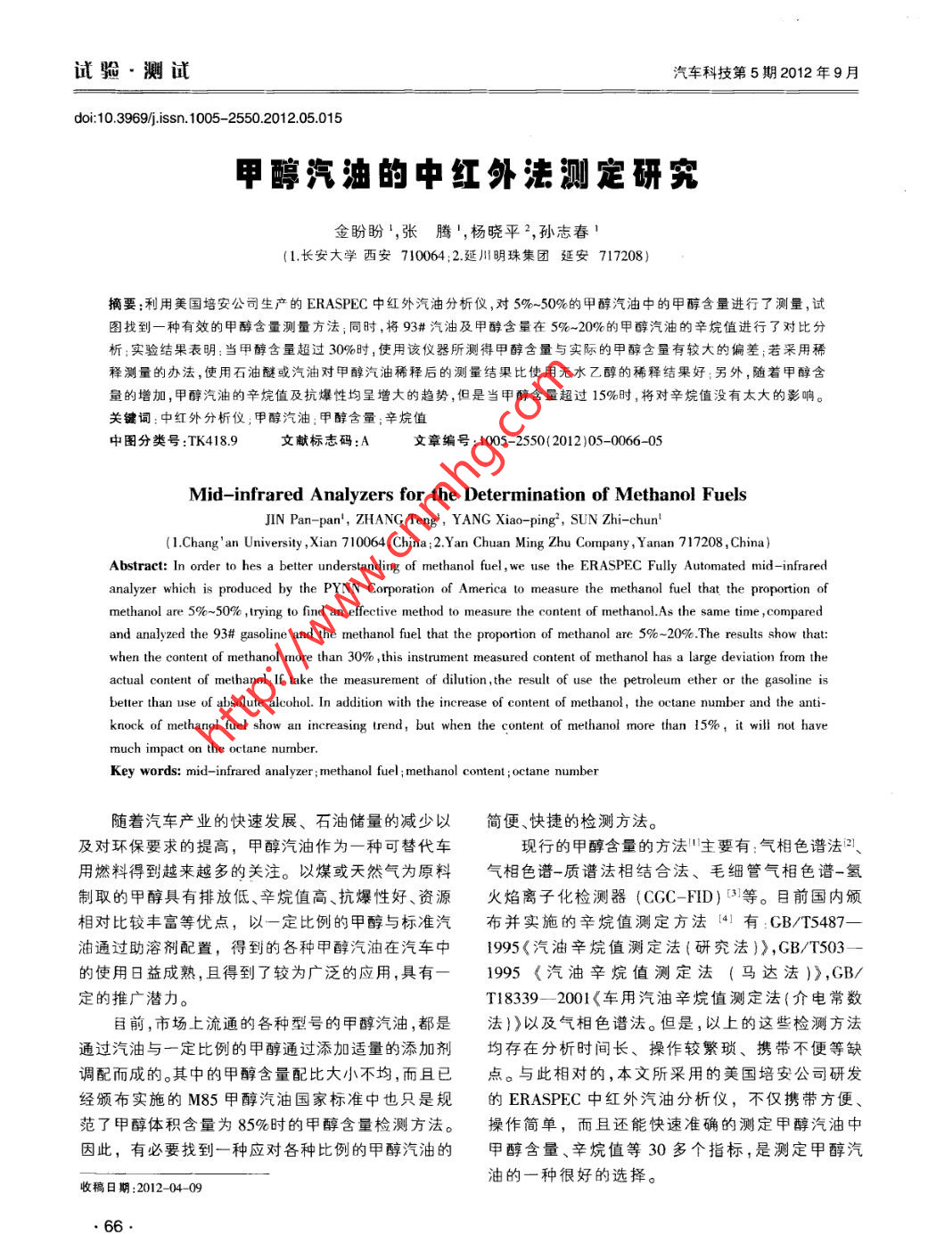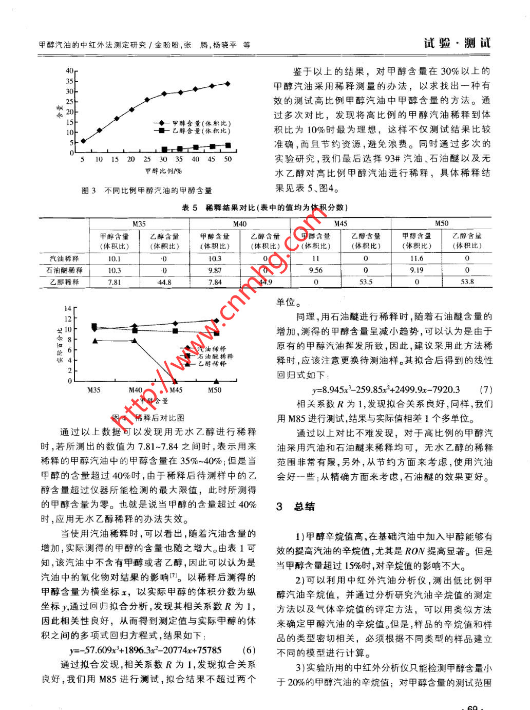 試驗.測試汽車科技第5期2012年9月doi:10.3969/.issn. 1005- -2550.2012.05.015甲醇汽油的中紅外法測定研究金盼盼',張騰', 楊曉平2,孫志春'(1.長安大學(xué)西安710064;2.延川明珠集團 延安717208)摘要:利用美國培安公司生產(chǎn)的ERASPEC中紅外汽油分析儀,對5%-50%的甲醇汽油中的甲醇含量進行了測量,試圖找到一種有效的甲醇含量測量方法;同時,將93#汽油及甲醇含量在5%-20%的甲醇汽油的辛烷值進行了對比分析;實驗結(jié)果表明:當(dāng)甲醇含量超過30%時;使用該儀器所測得甲醇含量與實際的甲醇含量有較大的偏差;若采用稀.釋測量的辦法,使用石油醚或汽油對甲醇汽油稀釋后的測量結(jié)果比使用無水乙醇的稀釋結(jié)果好;另外,隨著甲醇含量的增加,甲醇汽油的辛烷值及抗爆性均呈增大的趨勢,但是當(dāng)甲醇含量超過15%時,將對辛烷值沒有太大的影響。關(guān)鍵詞:中紅外分析儀;甲醇汽油:甲醇含量;辛烷值中圖分類號:TK418.9文獻標(biāo)志碼:A文章編號: 1005- -2550( 2012 )05-0066- 05Mid- infrared Analyzers for the Determination of Methanol FuelsJIN Pan-pan' , ZHANG Teng',YANG Xiao -ping2,SUN Zhi-chun'(1.Chang' an University ,Xian 710064 ,China :2.Yan Chuan Ming Zhu Comupany , Yanan 717208 ,China)Abstract: In order to hes a better understanding of methanol fuel, we use the ERASPEC Fully Automated mid-infraredanalyzer which is produced by the PYNN Corporation of America to measure the methanol fuel that the proportion ofmethanol are 5%~50% ,trying to find an efctive method to measure the content of methanol.As the same time ,comparedand analyzed the 93# gasoline and the methanol fuel that the proportion of methanol are 5% ~20% .The results show that:when the content of methanol more than 30% ,this instrument measured content of methanol has a large deviation from theactual content of methanol;If take the measurement of dilution,the result of use the petroleum ether or the gasoline isbetter than use of absolute alcohol. In addition with the increase of content of methanol ,the octane number and the anti-knock of methanol fuel show an increasing lrend, but when the content of methanol more than 15%, it will not havemuch impact on the octane number.Key words: mid-infrared analyzer ; methanol fuel ; methanol content ; octane number隨著汽車產(chǎn)業(yè)的快速發(fā)展、石油儲量的減少以簡便、快捷的檢測方法。及對環(huán)保要求的提高,甲醇汽油作為一種可替代車現(xiàn)行的甲醇含量的方法"主要有:氣相色譜法問、用燃料得到越來越多的關(guān)注。以煤或天然氣為原料氣相色譜-質(zhì)譜法相結(jié)合法、毛細(xì)管氣相色譜-氫制取的甲醇具有排放低、辛烷值高、抗爆性好、資源火焰離子化檢測器(CGC- -FID)[3)等。目前國內(nèi)頒相對比較豐富等優(yōu)點,以一定比例的甲醇與標(biāo)準(zhǔn)汽布并實施的辛烷值測定方法[4] 有:CB/T5487-油通過助溶劑配置,得到的各種甲醇汽油在汽車中1995<汽油辛烷值測定法(研究法)》,GB/T503-的使用日益成熟,且得到了較為廣泛的應(yīng)用,具有-1995《汽油辛烷值測定法(馬達法)》,GB/定的推廣潛力。T18339- 2001《車 用汽油辛烷值測定法(介電常數(shù)目前,市場上流通的各種型號的甲醇汽油,都是.法))以及氣相色譜法。但是,以上的這些檢測方法通過汽油與一定比例的甲醇通過添加適量的添加劑均存在分析時間長、操作較繁瑣、攜帶不便等缺調(diào)配而成的。其中的甲醇含量配比大小不均,而且已點。與此相對的,本文所采用的美國培安公司研發(fā)經(jīng)頒布實施的M85甲醇汽油國家標(biāo)準(zhǔn)中也只是規(guī)的ERASPEC中紅外汽油分析儀,不僅攜帶方便、范了甲醇體積含量為85%時的甲醇含量檢測方法。操作簡單,而且還能快速準(zhǔn)確的測定甲醇汽油中因此,有必要找到一種應(yīng)對各種比例的甲醇汽油的甲醇含量、辛烷值等30多個指標(biāo),是測定甲醇汽油的一種很好的選擇。收稿日期:2012-04 09,66.甲醇汽油的中紅外法測定研究/金盼盼,張騰,楊曉平等試驗.測試紅外汽油分析儀對汽油和甲醇汽油進行了分析。1實驗部分ERASPEC汽油分析儀的主要測試指標(biāo)有辛烷值、抗爆指數(shù)、芳烴、烯烴、飽和烴、餾程、密度、MTBE、1.1 儀器氧含量、錳含量等30多個指標(biāo)。儀器的主要參數(shù)本文采用美國培安公司研發(fā)的ERASPEC中見表1。表1 ERASPEC 主要參數(shù)項目參數(shù)及說明參數(shù)及說明.樣品量15 ml苯,甲苯測試方法符合ASTM D6277測量時間.1~2 min總氧含量測試方法符合ASTM D5845測量單位體積百分比,質(zhì)量百分比測量方式全自動樣品導(dǎo)入.自動氣液清洗密度測量+0.0001g/cm',安東帕密度計電源85~263VAC ,47~63Hz, 70W吸收譜線范圍4 000~400 cm-'1.2 試劑及樣品準(zhǔn)備表2基于ERASPEC汽油分析儀的測試結(jié)果本文用到的甲醇汽油均是在實驗室環(huán)境下配置93#M5M10M15M20得到的,其中,基礎(chǔ)汽油采用93#成品汽油;甲醇采.甲醇含量/% C5.310.916.41.1用分析純度大于99.5%的實驗用無水甲醇;乙醇采抗爆指數(shù)889.30.290.992.2用分析純度大于95%的實驗用無水乙醇;石油醚采RON辛烷值| 93.495.696.797.598.1用的純度為60~90。分別配制體積分?jǐn)?shù)為5%~50%MON辛烷值82.583.183.784.385.3的甲醇汽油100ml。由于是低比例配制含水量極根據(jù)以上數(shù)據(jù)通過EXCEL中的作圖工具,得少,且在室溫條件下,甲醇與汽油未出現(xiàn)明顯分層現(xiàn).到RON辛烷值、MON辛烷值,以及抗爆性指數(shù)隨甲象,因此沒有加任何添加劑。醇添加量的增多而呈遞增