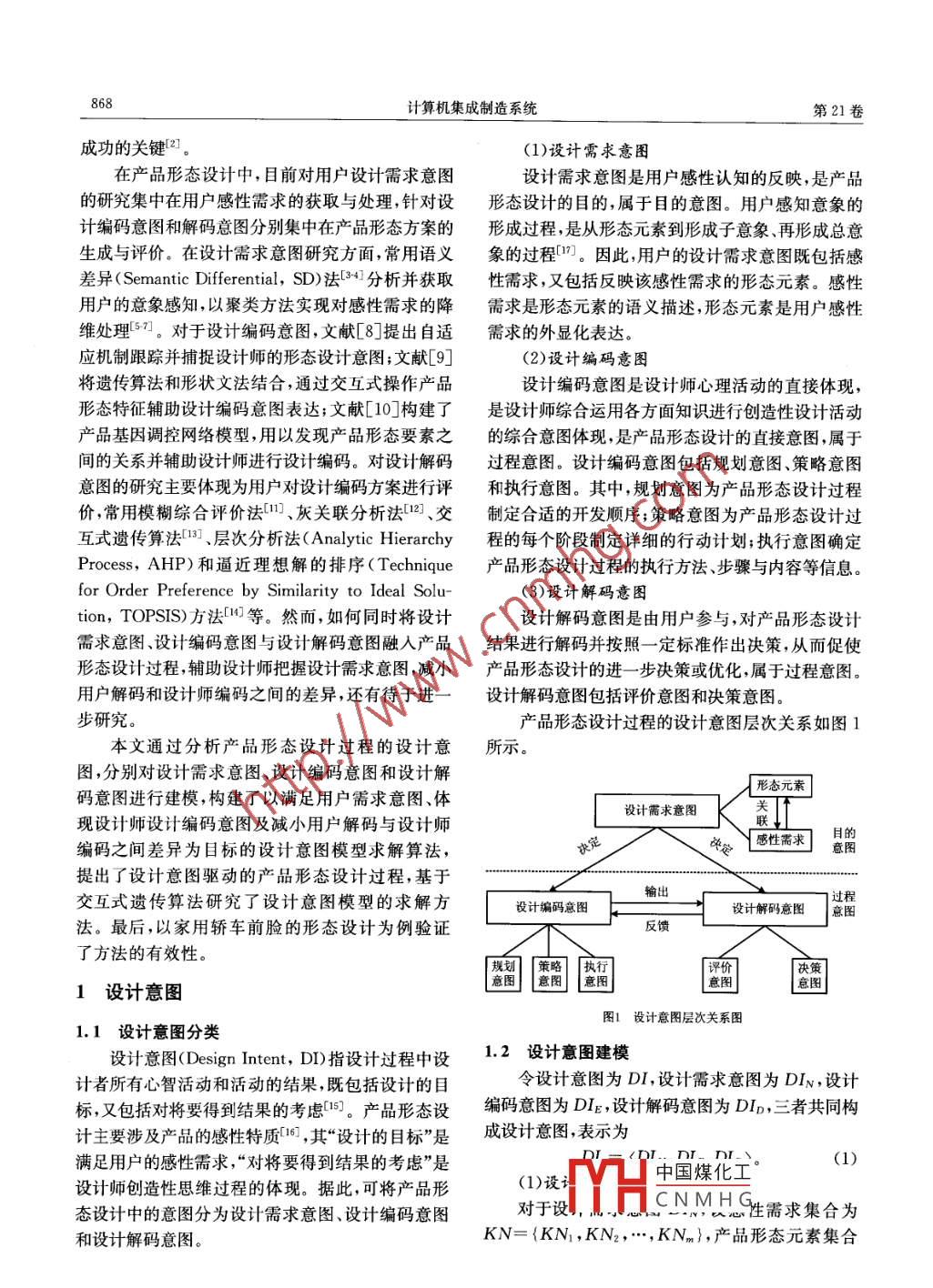 第21卷第4期計算機集成制造系統(tǒng)Vol. 21 No.42015年4月.Computer Integrated Manufacturing SystemsApr. 2015DOI: 10.13196/j. cims. 2015. 04. 001設(shè)計意圖驅(qū)動的產(chǎn)品形態(tài)設(shè)計方法楊延璞,劉瓊(長安大學(xué)工程機械學(xué)院,陜西西安710064)摘要:為減小用戶和設(shè)計師對產(chǎn)品形態(tài)方案的認知差異,將產(chǎn)品形態(tài)設(shè)計中的設(shè)計意圖分為設(shè)計需求意圖、設(shè)計編碼意圖和設(shè)計解碼意圖,建立了設(shè)計意圖模型,構(gòu)建了以滿足用戶需求意圖、體現(xiàn)設(shè)計師設(shè)計編碼意圖及減小用戶解碼與設(shè)計師編碼之間差異為目標(biāo)的設(shè)計意圖模型求解算法,探討了設(shè)計意圖驅(qū)動的產(chǎn)品形態(tài)設(shè)計過程,研究了基于交互式遺傳算法的設(shè)計意圖求解方法。以家用轎車前臉形態(tài)設(shè)計為例,分別進行了設(shè)計需求意圖獲取與映射、設(shè)計編碼意圖表達以及交互遺傳解碼研究,驗證了所提方法的有效性。關(guān)鍵詞:設(shè)計意圖;產(chǎn)品形態(tài)設(shè)計;設(shè)計需求;設(shè)計編碼;設(shè)計解碼;交互式遺傳算法中圖分類號:TB472文獻標(biāo)識碼:AProduct form design method driven by design intentYANG Yar pu, LIUQiong(School of Construction Machinery, Chang 'an University, Xi'an 710064, China)Abstract: To reduce the cognition difference of product form between users and designers, the design intent in prod-uct form design process was divided into design need intent, design encoding intent and design decoding intent, ancthe design intent model was constructed. A solution algorithm was proposed aiming to meet users' need intent anddemonstrate designers' design encoding intent, and reduce decoding and encoding divergence between users and de-signers. The process of product form design driven by design intent was discussed. Interactive Genetic Algorithms(IGA) was applied to seek an itelligent solution of design intent. The family car face design was taken as an exam-ple to verify the effectiveness of the proposed method by researching design need intent acquisition and mapping, de-sign encoding intent expression and design evolution and decoding based on IGA were researched respectively.Key words: design intent; product form design; design need; design encoding; design decoding; interactivegenetic algorithm程,也是產(chǎn)品信息的進化過程,不僅包括設(shè)計師對產(chǎn)0引言品形態(tài)信息的編碼,還包括用戶通過認知過程進行產(chǎn)品形態(tài)是產(chǎn)品的物質(zhì)載體,傳達著產(chǎn)品的物的解碼。用戶需求信息、設(shè)計師編碼過程與用戶解質(zhì)功能與精神功能,是用戶與設(shè)計師溝通的重要媒碼過程共同構(gòu)成產(chǎn)品形態(tài)設(shè)計意圖。隨著感性消費介。產(chǎn)品形態(tài)設(shè)計活動始于設(shè)計師的表意傳達,終與用戶體驗的發(fā)展,如何準(zhǔn)確獲取用戶設(shè)計需求意于用戶的感受與理解,其核心在于表達與溝通口。圖、捕捉設(shè)計師的設(shè)計編碼意圖、減小用戶解碼意圖該過程是面向用戶需求滿足的創(chuàng)意思考的發(fā)展過與設(shè)計師編碼意圖之間的差異,成為產(chǎn)品形態(tài)設(shè)計收稿日期:2014-07-04;修訂日期:2014-09-30. Received 04 July 2014;accepted 30 Sep. 201中國煤化工基金項目:陜西省自然科學(xué)基金資助項目(2011Q8013);中央高校基本科研業(yè)務(wù)費資助項MYHCNMH。 items: Project supported by the Natural Science Foundation of Shannxi Province, China(Na. 2011Research Funds forthe Central Universities ,China(No.2014G1251032).868計算機集成制造系統(tǒng)第21卷成功的關(guān)鍵[2]。(1)設(shè)計需求意圖在產(chǎn)品形態(tài)設(shè)計中,目前對用戶設(shè)計需求意圖設(shè)計需求意圖是用戶感性認知的反映,是產(chǎn)品的研究集中在用戶感性需求的獲取與處理,針對設(shè)形態(tài)設(shè)計的目的,屬于目的意圖。用戶感知意象的計編碼意圖和解碼意圖分別集中在產(chǎn)品形態(tài)方案的形成過程,是從形態(tài)元素到形成子意象、再形成總意生成與評價。在設(shè)計需求意圖研究方面,常用語義象的過程07。因此,用戶的設(shè)計需求意圖既包括感差異(Semantic Differential, SD)法[341] 分析并獲取性需求,又包括反映該感性需求的形態(tài)元素。感性用戶的意象感知,以聚類方法實現(xiàn)對感性需求的降需求是形態(tài)元素的語義描述,形態(tài)元素是用戶感性維處理[57]。對于設(shè)計編碼意圖,文獻[8]提出自適需求的外,顯化表達。應(yīng)機制跟蹤并捕捉設(shè)計師的形態(tài)設(shè)計意圖;文獻[9](2)設(shè)計編碼意圖將遺傳算法和形狀文法結(jié)合,通過交互式操作產(chǎn)品.設(shè)計編碼意圖是設(shè)計師心理活動的直接體現(xiàn),形態(tài)特征輔助設(shè)計編碼意圖表達;文獻[10]構(gòu)建了是設(shè)計師綜合運用各方面知識進行創(chuàng)造性設(shè)計活動產(chǎn)品基因調(diào)控網(wǎng)絡(luò)模型,用以發(fā)現(xiàn)產(chǎn)品形態(tài)要素之的綜合意圖體現(xiàn),是產(chǎn)品形態(tài)設(shè)計的直接意圖,屬于間的關(guān)系并輔助設(shè)計師進行設(shè)計編碼。對設(shè)計解碼過程意圖。設(shè)計編碼意圖包括規(guī)劃意圖、策略意圖意圖的研究主要體現(xiàn)為用戶對設(shè)計編碼方案進行評和執(zhí)行意圖。其中,規(guī)劃意圖為產(chǎn)品形態(tài)設(shè)計過程.價,常用模糊綜合評價法[、灰關(