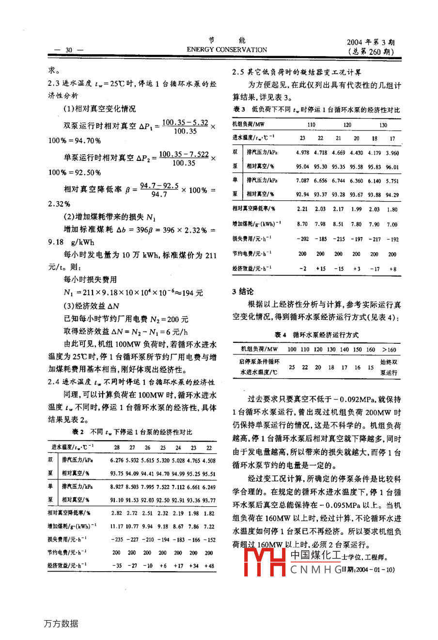 2004年第3期ENERGY CONSERVATION(總第260期)循環(huán)水泵經(jīng)濟(jì)運(yùn)行方式探討劉紅衛(wèi),劉正強(qiáng),程昆明(新鄉(xiāng)火電廠,河南斬鄉(xiāng)453011)要:實(shí)戚證明,冬季低負(fù)荷時(shí)停運(yùn)1臺(tái)循痳水泵以節(jié)廠用電、提高運(yùn)行經(jīng)濟(jì)性是切實(shí)可杅的。但何時(shí)可以鋒止或增開1臺(tái)循環(huán)水泵才能保證運(yùn)行經(jīng)濟(jì)性,由于峽乏可靠的理論計(jì)算和數(shù)據(jù)說明,沒有做出具休明確的規(guī)定。本文就此問題展開祥鮞計(jì)算與論證,為我廠4#、5拌機(jī)環(huán)水泵的經(jīng)濟(jì)運(yùn)行方式堤供可靠的理論依據(jù)關(guān)鍵詞:攤環(huán)水泵;經(jīng)濟(jì)運(yùn)行;低負(fù)荷中圖分類號(hào):TK264.12文獻(xiàn)標(biāo)識(shí)碼:A文章綿號(hào):1004-7948(2004)03-0028-03新鄉(xiāng)火電廠4#、5#機(jī)分別配3臺(tái)48SH-22喪1機(jī)組負(fù)荷與排汽量型定轉(zhuǎn)速循環(huán)水泵(功率1000kW,流量11000/h),負(fù)荷/Mw100110120130140150200正常運(yùn)行方式為2臺(tái)運(yùn)行,1臺(tái)備用。隨著調(diào)峰任209.3228.7247.8268.0292.5314.4424務(wù)的增加,4#、5#機(jī)經(jīng)常各帶100MW負(fù)荷(額定(2)真空與排汽壓力的關(guān)系負(fù)荷均為20MW)運(yùn)行,特別在冬季循環(huán)水進(jìn)水溫本文采用實(shí)際排汽壓力P然后根據(jù)當(dāng)?shù)卮蠖鹊湍Y(jié)器端差過大(達(dá)13-14℃),凝結(jié)器真空壓P換算成相對(duì)真空進(jìn)行計(jì)算。我廠當(dāng)?shù)卮髿鈮阂殉^最有利真空低負(fù)荷時(shí)2臺(tái)循環(huán)水泵運(yùn)行的P=100.35kPa(環(huán)境溫度25℃時(shí)方式已不再經(jīng)濟(jì)。但何時(shí)可以停止或增開1臺(tái)循環(huán)相對(duì)真空△P=P-PP×100%水泵才能保證運(yùn)行經(jīng)濟(jì)性,由于缺乏可靠的理論計(jì)△P2-△P1算和數(shù)據(jù)說明,沒有做出具體明確的規(guī)定。本文就相對(duì)真空陣低率×100%此問題展開詳細(xì)的計(jì)算與論證,為我廠4#、5#機(jī)式中P1一雙泵運(yùn)行時(shí)的相對(duì)真空;循環(huán)水泵的經(jīng)濟(jì)運(yùn)行方式提供可靠的理論依據(jù)?!鱌2單泵運(yùn)行時(shí)的相對(duì)真空。1實(shí)際計(jì)算中有關(guān)問題的說明(3)循環(huán)水進(jìn)水溫度t的變化(1)排汽量Da的確定參考實(shí)際運(yùn)行日志和運(yùn)行經(jīng)驗(yàn),對(duì)tv進(jìn)行適當(dāng)修正定負(fù)荷下的排汽量D是確定的。為了得到較準(zhǔn)(4)凝結(jié)器總換熱面積A=11220m2,流程z=確的排汽量Dn根據(jù)現(xiàn)場(chǎng)實(shí)際運(yùn)行中一定負(fù)荷下的循2管內(nèi)徑d=25mm,管數(shù)n=17001環(huán)水溫升、真空及循環(huán)水流量,利用下列公式計(jì)算:循環(huán)水流量G1=2200h(雙泵時(shí));式中C。一水的比熱,Cp=4186k/(kg·℃)G2=1100/h(單泵時(shí))G一循環(huán)水流量,t/h;循環(huán)水流速△t循環(huán)水溫升,℃;V1=147m/s(雙泵時(shí));r一汽化潛熱,kJ/kgV2=0.735m/s(單泵時(shí))同時(shí)也參考了有關(guān)資料表示的汽輪機(jī)負(fù)荷與排2凝結(jié)器變工況計(jì)算汽量之間的關(guān)系,根據(jù)額定負(fù)荷200MW時(shí)排汽量凝結(jié)器變工況計(jì)算的目的是:在一定負(fù)荷下計(jì)為420t/h來推算。通過兩方面結(jié)合,得到一定負(fù)荷算中國(guó)煤化工循環(huán)水入口溫度下的排汽量更為準(zhǔn)確。如表1所示:HCNMH過分析排汽壓力的2004年第3期(總第260期)ENERGY CONSERVATION變化來判斷其經(jīng)濟(jì)性。以機(jī)組100MW負(fù)荷為例進(jìn)=3.5℃行計(jì)算。傳熱對(duì)數(shù)平均溫差2.1進(jìn)水溫度t=25℃且雙泵運(yùn)行(G1=22000y△th)時(shí)△tm=ln(△t+8)/0)=582℃(1)利用經(jīng)驗(yàn)公式求凝結(jié)器管子的換熱系數(shù)K利用傳熱方程計(jì)算出100MW負(fù)荷下的排汽量K=146521中中,kJ/(hm2℃式中中1一循環(huán)冷卻水的清潔系數(shù)取中1=0.8;Dn=KA△tm/r=7770.85×11220×5.82∮一循環(huán)水速度修正系數(shù),取∮=Bx,其中2420.2×10-3=209.6t/hB=1.1v1d025=1,1×1.47×0.0250235則D-D.Dn×100%=0.14%=0.64298;X=0.12中1(1+0,15t)=因?yàn)?.14%<0.2%,所以所設(shè)排汽壓力符合0456所以:=0.6429843≈0.8176要求。φ循環(huán)水溫度修正系數(shù),=1-0.42中52.2進(jìn)水溫度t=25℃,若草泵運(yùn)行時(shí)(35-t-)2/1000≈0,9624當(dāng)汽水換熱重新達(dá)到平衠后,根據(jù)實(shí)際運(yùn)行情中流程修正系數(shù),況對(duì)循環(huán)水進(jìn)水溫度進(jìn)行修正t=257℃;循環(huán)冷中,=1+卻水流量G2=1000/h10×(1-35/t)(1)求凝結(jié)器管子的換熱系數(shù)K1(7=2由K=14652中1、k/(hm2,t℃)∮。蒸汽負(fù)荷修正系數(shù),可得:K=14652×08×0.5892×09675×1當(dāng)d