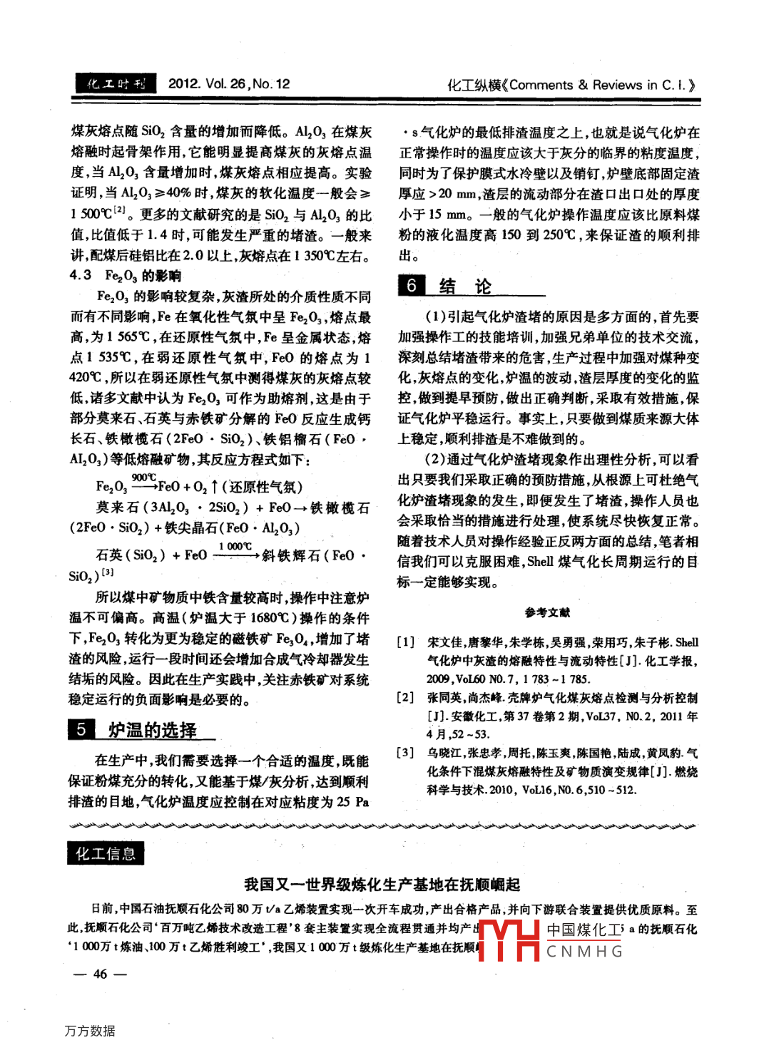 第26卷第12期化工時(shí)刊Vol. 26 ,No. 122012 年12月Chemical Industry TimesDec.12.2012doi:10. 3969/j. issn. 1002 -154X.2012. 12.012SHELL煤氣化堵渣事故的應(yīng)對(duì)處理郭云飛高原(神華鄂爾多斯煤制油分公司,內(nèi)蒙古鄂爾多斯017200)摘要主要簡(jiǎn)述了 shell煤氣化堵渣的現(xiàn)象分析了幾種主要的氧化物對(duì)灰熔點(diǎn)的影響,基于對(duì)煤灰的分析確定操作溫度,適度添加助熔劑改變灰組分,達(dá)到穩(wěn)定運(yùn)行的目的。關(guān)鍵詞堵渣現(xiàn)象 配煤灰熔點(diǎn)Analysis and Treatment for Sluicing Problemsand Slag Blockages in Shell Pulverized Coal Gasification PlantGuo YunfeiGao Yuan( Shenhua Erdos Coalliquefaction Corporation LTD. Neimengu Erdos 017200)Abstract Author has Introduced The phenomenon of Slag blockages in Shell Pulverized Coal Gasification Plant ,The Affction on several main oxides to ash meling point,depending on Coal Ash analysis to determine the proper Casi-fier temperature, Determine fux addition by modifying the ash composition, to achieve the purpose of stable operation.Keywords the phenomenon of slag blockages blended - coal ash melting point氣流床加壓氣化因其煤種適應(yīng)性寬,碳轉(zhuǎn)化率Shell氣化爐排渣流程高、有效氣組分(C0 + H2)含量高而備受人們關(guān)注,已成為煤氣化的首選技術(shù)之一,而Shell氣化爐是其在殼牌煤氣化中,除渣單元-般命名為1400單中的典型爐型。Shell 氣化爐的操作溫度要求高于煤元。煤粉進(jìn)入氣化爐后與氧氣發(fā)生不完全氧化反應(yīng),灰的熔融溫度,采用液態(tài)排渣法。爐子內(nèi)件為膜式水合成氣向上經(jīng)輸氣導(dǎo)管,合成氣冷卻器去下游工序,冷壁,僅在向火面有少量耐火材料涂層,采取以渣抗反應(yīng)形成熔融態(tài)的渣向下通過(guò)氣化爐內(nèi)的渣口流入渣保護(hù)內(nèi)件。為使Shell氣化爐能順利排渣,其灰渣渣池V1401 ,被來(lái)自P1401的50C的灰水激冷為玻璃在氣化爐中的粘度應(yīng)在2 ~25Pa●s之間,通常將粘態(tài)固體顆粒狀細(xì)渣,流人V1402進(jìn)行渣的收集,此時(shí)度為25 Pa●s所對(duì)應(yīng)的溫度稱為氣化爐的最低排渣V-1402與渣鎖斗V- 1403相連通。其中,V - 1402溫度。為適應(yīng)液態(tài)排渣的操作要求,對(duì)于一些熔點(diǎn)較的渣水會(huì)經(jīng)P-1401進(jìn)人水力旋流器S- 1403分離高的煤種通常需要加入適量的助熔劑(通常為CaO)出-部分濃度較高的渣漿水排入水處理單元。收集或者配煤以降低煤灰的熔融溫度。在實(shí)際的運(yùn)行過(guò)20分鐘后,V-1403與V- 1402隔離泄壓。當(dāng)泄到程中,由于灰分的變化,爐溫控制不當(dāng),安慶,洞氮,神常壓后V- 1403內(nèi)的渣排入渣脫水槽T- 1401 ,由撈華煤制油Shell氣化爐先后出現(xiàn)了氣化爐渣口嚴(yán)重堵渣機(jī)送上渣皮帶。而后渣鎖斗V - 1403通過(guò)低壓水渣而被迫停車,造成了較大的經(jīng)濟(jì)損失,促使技術(shù)人進(jìn)行注水,再由高壓氮?dú)鈱?duì)其充壓,當(dāng)V-1402與V員對(duì)爐子形成大渣塊的機(jī)理做出進(jìn)-步的研究和探-1403壓差很小時(shí)開(kāi)始連通收渣,如此反復(fù)形成--討,在實(shí)踐中積累了豐富的經(jīng)驗(yàn),現(xiàn)闡述如下:個(gè)完整的除渣循環(huán)。收稿日期:2012-11-30.中國(guó)煤化工作者簡(jiǎn)介:郭云飛(1982 -),男,本科,工程師,從事煤氣化技術(shù)攻關(guān)和經(jīng)濟(jì)核算工作,E - mail:.YHCNMH G-44-.郭云飛等SHELL 煤氣化堵渣事故的應(yīng)對(duì)處理2012. Vol. 26,No. 12化 工時(shí)刊P1402出現(xiàn)抽空等現(xiàn)象,都可以說(shuō)明出現(xiàn)了堵渣的跡象。2灰渣成分分析當(dāng)然渣池V1401渣水的密度、渣的外觀及合成來(lái)自補(bǔ)連塔礦的煤氣化后生成的爐渣,對(duì)灰分利氣組分CO2 ,CH,的變化趨勢(shì)等等,我們可以綜合上用1800型X射線熒光光譜儀分析其化學(xué)組分,其成述信息判斷堵渣的部位和嚴(yán)重程度。分如表1所示。4堵渣的機(jī)理淺析Shell氣化爐中灰的成分分析Table1 coal ash composion analysis of The Shell gasifier由于Shell煤氣化采用了液態(tài)排渣,這就要求液成分SiO2ALO,Fe20,CaOK,ONa,OSQ,MgO態(tài)渣必須有較好的流動(dòng)性,但其爐內(nèi)無(wú)耐火磚,采用比例(質(zhì)44.64 22.23 9.99 14.46 0.85 1.52 4.27 0.45了以渣抗渣的理念來(lái)保護(hù)水冷壁,要求灰渣具有適度量分?jǐn)?shù))的結(jié)渣性能,這就要求在實(shí)際生產(chǎn)中,在灰熔點(diǎn)和渣更多的生產(chǎn)數(shù)據(jù)表明,實(shí)際生產(chǎn)中,通過(guò)配煤后,的流動(dòng)性之間找到一個(gè)最佳的切合點(diǎn)。為了提高原灰渣的成分主要是由SiO2、Al203、CaO、Fe2O,這4種料煤的碳轉(zhuǎn)化率,這就要求對(duì)低灰熔點(diǎn)煤,需要配高氧化物構(gòu)成的,其中酸性氧化物(SiO2 + A1203)的含灰熔點(diǎn)的煤來(lái)提高灰熔點(diǎn),從而提高爐溫達(dá)到較高的量超過(guò)66% ,它們的含量越高,煤灰的熔融溫度越碳轉(zhuǎn)化率,而對(duì)于一些高灰熔點(diǎn)的煤種(TFT >高,渣的粘度是增加的;而堿性氧化物(CaO + K20 +1400C)為了滿足上述液態(tài)排渣的需要,通常需要加Na2O + MgO + Fe203)的含量小于30% ,它們的含量人適量的助熔劑(通常為CaO)以降低煤灰的熔融溫越高,煤灰的熔融溫度越低,渣的粘度是減小的,堿性度與黏度。因此研究煤灰的幾種氧化物對(duì)灰熔點(diǎn)的組分在40%時(shí),煤灰的粘度是最小的?;以械奈⒂绊憣?duì)氣化爐的正常運(yùn)行就顯