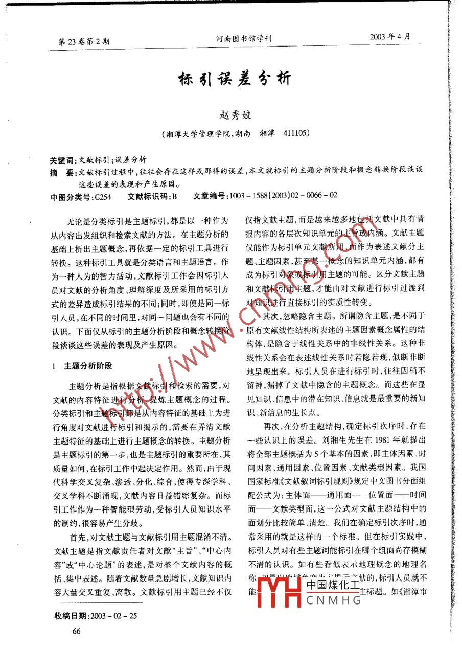 第23卷第2期河南圖書(shū)館學(xué)刊2003年4月標(biāo)引誤差分析趙秀姣(湘潭大學(xué)管理學(xué)院,湖南湘潭411105)關(guān)鍵詞:文獻(xiàn)標(biāo)引;誤差分析摘要:文獻(xiàn)標(biāo)引過(guò)程中,往往會(huì)存在這樣或那祥的誤差,本文就標(biāo)引的主題分析階段和概念轉(zhuǎn)換階段談?wù)勥@些誤差的表現(xiàn)和產(chǎn)生原因。中圖分類號(hào):G254文獻(xiàn)標(biāo)識(shí)碼:B .文章編號(hào):1003 - 1588(2003)02 - 0066 - 02無(wú)論是分類標(biāo)引是主題標(biāo)引,都是以- -種作為僅指文獻(xiàn)主題,而是越來(lái)越多地包括文獻(xiàn)中具有情從內(nèi)容出發(fā)組織和檢索文獻(xiàn)的方法。在主題分析的報(bào)內(nèi)容的各層次知識(shí)單元的主旨或內(nèi)涵。文獻(xiàn)主題基礎(chǔ)_上析出主題概念,再依據(jù)一定的標(biāo)引工具進(jìn)行僅能作為標(biāo)引單元文獻(xiàn)所用,而作為表述文獻(xiàn)分土轉(zhuǎn)換。這種標(biāo)引工具就是分類語(yǔ)言和主題語(yǔ)言。作題、主題因素,甚至某一概念的知識(shí)單元內(nèi)涵,都有為一種人為的智力活動(dòng),文獻(xiàn)標(biāo)引工作會(huì)因標(biāo)引人成為標(biāo)引對(duì)象或標(biāo)引用主題的可能。區(qū)分文獻(xiàn)主題員對(duì)文獻(xiàn)的分析角度、理解深度及所采用的標(biāo)引方和文獻(xiàn)標(biāo)引用主題,才能由對(duì)文獻(xiàn)進(jìn)行標(biāo)引過(guò)渡到式的差異造成標(biāo)引結(jié)果的不同;同時(shí),即使是同一標(biāo)對(duì)知識(shí)進(jìn)行直接標(biāo)引的實(shí)質(zhì)性轉(zhuǎn)變。引人員,在不同的時(shí)間里,對(duì)同-問(wèn)題也會(huì)有不同的其次,忽略隱含主題。所謂隱含主題,是不同于認(rèn)識(shí)。下面僅從標(biāo)引的主題分析階段和概念轉(zhuǎn)換階原有文獻(xiàn)線性結(jié)構(gòu)所表述的主題因素概念屬性的結(jié)段談?wù)勥@些誤差的表現(xiàn)及產(chǎn)生原因。構(gòu)體,是隱含于線性關(guān)系中的非線性關(guān)系。這種非線性關(guān)系會(huì)在表述線性關(guān)系時(shí)若隱若現(xiàn),似斷非斷1 主題分析階段地呈現(xiàn)出來(lái)。標(biāo)引人員在進(jìn)行標(biāo)引時(shí),往往因稍不主題分析是指根據(jù)文獻(xiàn)標(biāo)引和檢索的需要,對(duì)留神,漏掉了文獻(xiàn)中隱含的主題概念。而這些在顯文獻(xiàn)的內(nèi)容特征進(jìn)行分析,提煉主題概念的過(guò)程。見(jiàn)知識(shí)信息中的潛在知識(shí)、信息就是最重要的新知.分類標(biāo)引和主題標(biāo)引都是從內(nèi)容特征的基礎(chǔ)上為進(jìn)識(shí).新信息的生長(zhǎng)點(diǎn)。行角度對(duì)文獻(xiàn)進(jìn)行標(biāo)引和揭示的,需要在弄清文獻(xiàn)再次,在分析主題結(jié)構(gòu),確定標(biāo)引次序時(shí),存在主題特征的基礎(chǔ)上進(jìn)行主題概念的轉(zhuǎn)換。主題分析一些認(rèn)識(shí)上的誤差。劉湘生先生在1981 年就提出是主題標(biāo)引的第一-步 ,也是主題標(biāo)引的重要所在,其將全部主題概括為5個(gè)基本的因素,即主體因素時(shí)質(zhì)量如何,在標(biāo)引工作中起決定作用。然而,由于現(xiàn)間因素、通用因素、位置因素、文獻(xiàn)類型因素。我因代科學(xué)交叉復(fù)雜、滲透、分化、綜合,使得專深學(xué)科、國(guó)家標(biāo)準(zhǔn)《文獻(xiàn)敘詞標(biāo)引規(guī)則》規(guī)定中文圖書(shū)分面組交叉學(xué)科不斷涌現(xiàn),文獻(xiàn)內(nèi)容日益錯(cuò)綜復(fù)雜。而標(biāo)配公式為:主體面一通用面--- 位置面一一時(shí)間引工作作為一種智能型勞動(dòng),受標(biāo)引人員知識(shí)水平面一-文獻(xiàn)類型面,這一公式對(duì)文獻(xiàn)主題結(jié)構(gòu)中的的制約,很容易產(chǎn)生分歧。.面劃分比較簡(jiǎn)單,清楚。我們?cè)诖_定標(biāo)引次序時(shí),通.首先,對(duì)文獻(xiàn)主題與文獻(xiàn)標(biāo)引用主題混淆不清。常采用的就是這樣的一個(gè)標(biāo)準(zhǔn)。但在標(biāo)引實(shí)踐中,文獻(xiàn)主題是指文獻(xiàn)責(zé)任者對(duì)文獻(xiàn)“主旨”、“中心內(nèi)標(biāo)引人員對(duì)有些主題詞能標(biāo)引在哪個(gè)組面尚存模糊容”或“中心論題”的表述,是對(duì)整個(gè)文獻(xiàn)內(nèi)容的概不清的認(rèn)識(shí)。如有些看似表示地理慨念的地理名.括、集中表述。隨著文獻(xiàn)數(shù)量急劇增長(zhǎng),文獻(xiàn)知識(shí)內(nèi)中國(guó)煤化工獄的,標(biāo)引人員就不容大量交叉重復(fù)、離散。文獻(xiàn)標(biāo)引用主題已經(jīng)不僅主標(biāo)題。如《湘潭市CNMHG收稿日期:2003 -02 - 2566趙秀姣:標(biāo)引誤差分析空氣質(zhì)量情況調(diào)查》- - 書(shū),這里的“湘潭市”是作為研何類,也變得模糊不清了,對(duì)標(biāo)引出來(lái)的結(jié)果也就存究對(duì)象出現(xiàn)文獻(xiàn)中的,不能作為- -個(gè)位置因素標(biāo)引,在多樣性了。應(yīng)作為主題來(lái)標(biāo)引。同時(shí),文獻(xiàn)中還會(huì)有一-些如"城主題標(biāo)引中,以敘詞表為工具選詞,進(jìn)行概念轉(zhuǎn)市”.“江”“河”、“平原"等地理名稱的概念,因其通換時(shí),對(duì)復(fù)雜主題概念-般要求使用兩個(gè)或多個(gè)主常表示的是一些泛指的地理概念,不宜作為位置因題詞進(jìn)行組配標(biāo)引,在選詞和組配過(gu