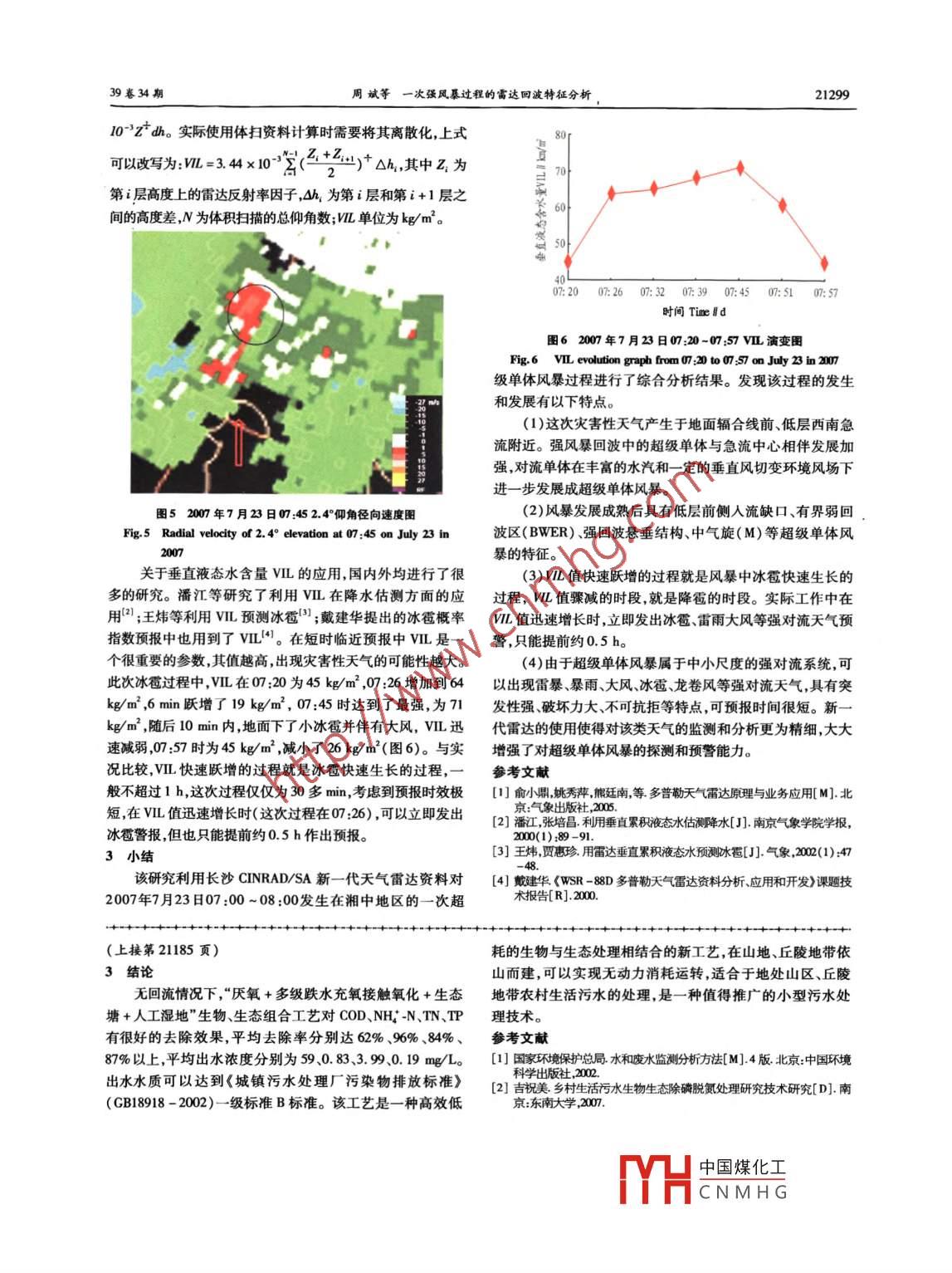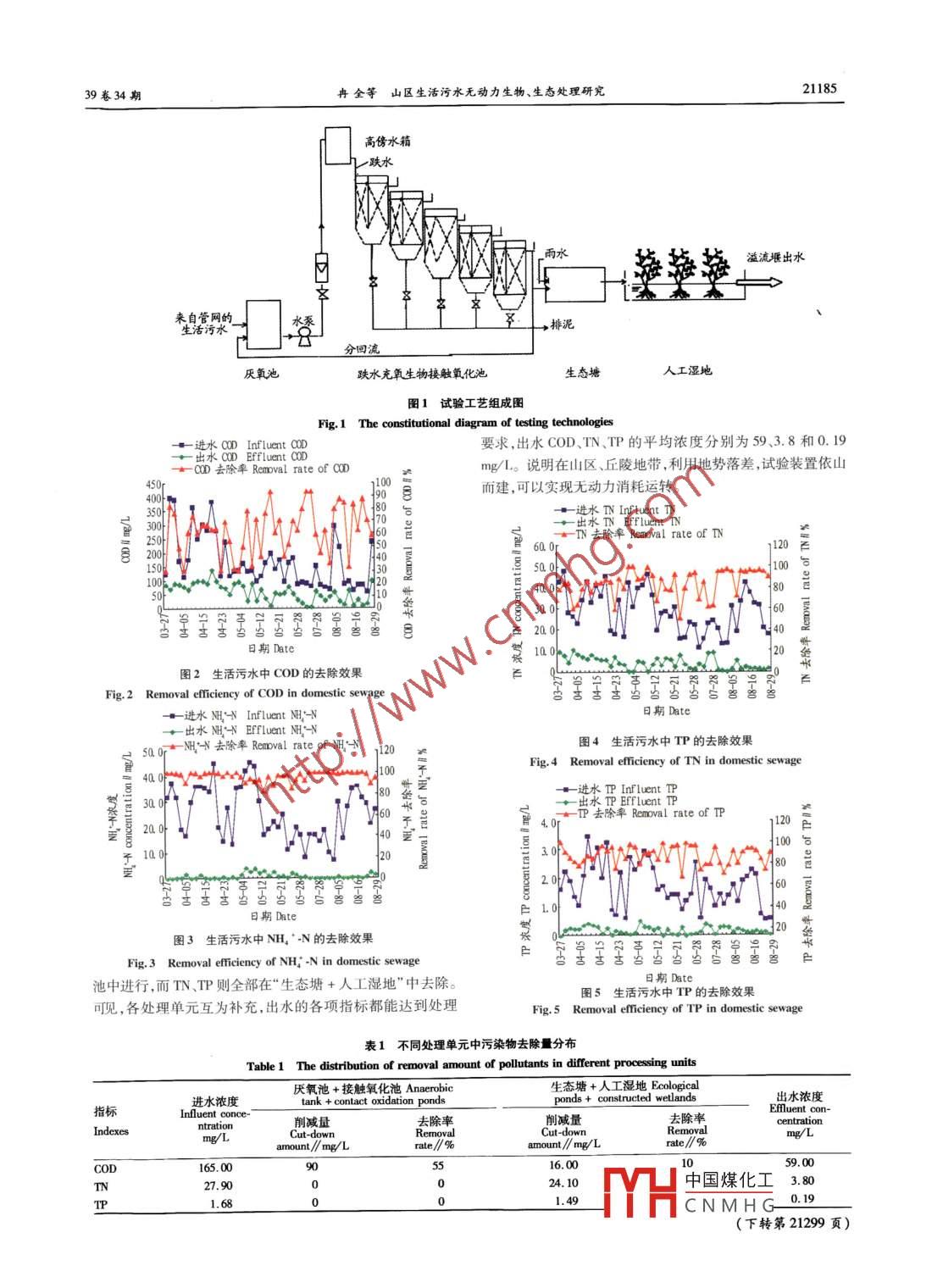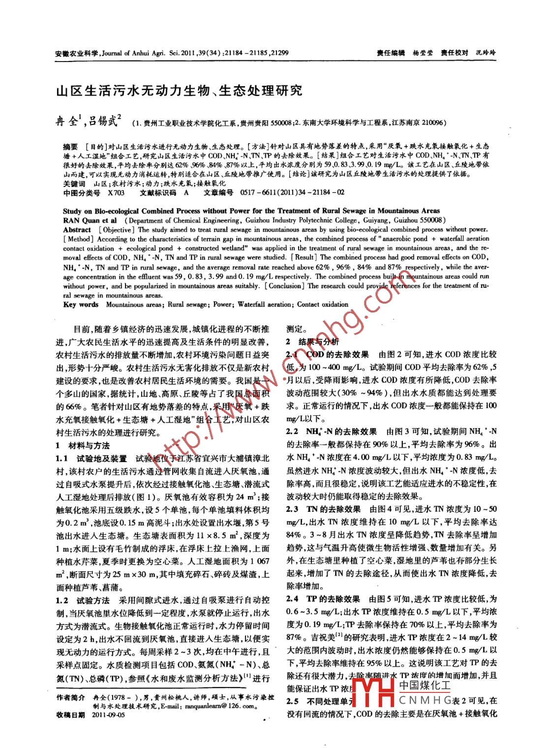 安徽農(nóng)業(yè)科學(xué),Jourmal of Anhui Agri. Sci. 2011 ,39(34) :21184 -21185 ,21299責(zé)任編輯楊瑩瑩 責(zé)任校對 觀玲玲山區(qū)生活污水無動力生物、生態(tài)處理研究冉全' ,呂錫武2 (1. 貴州工業(yè)職業(yè)技術(shù)學(xué)院化工系,貴州貴陽508.東南大學(xué)環(huán)境科學(xué)與工程系,江蘇南京200906)摘要[目的]對山區(qū) 生活污水進(jìn)行無動力生物、生態(tài)處理。[方法]針對山區(qū)具有地勢落差 的特點(diǎn),采用“厭氧+跌水充氧接觸氧化+生態(tài)塘+人工濕地”組合工藝,研究山區(qū)生活污水中COD. NH; -N、TN TP的去除效果。[ 結(jié)果]組合工藝對生活污水中COD、NH," -N.TN、TP有很好的去除效果,平均去除率分別達(dá)62% .96% .84%、87%以上,平均出水濃度分別為59.0.83.3.99、0. 19 mg/L。該工藝在山區(qū)、丘陵地帶依山而建,可以實(shí)現(xiàn)無動力消耗運(yùn)轉(zhuǎn),特別適合在山區(qū)、丘陵地帶推廣使用。[結(jié)論]該研究為山區(qū)丘陵地帶生活污水的處理提供了依據(jù)。關(guān)鍵詞山 區(qū);農(nóng)村污水;動力;跌水充氧;接觸氧化中圖分類號X703 文獻(xiàn)標(biāo)識碼 A文章編號 0517 -6611(2011)34 -21184 -02Study on Bio-ecological Combined Process without Power for the Treatment of Rural Sewage in Mountainous AreasRAN Quan et al ( Department of Chemical Engineering, Guizhou Industry Poltechnic College , Guiyang, Cuizhou 50008)Abstract[ Objective] The study aimed to treat rural sewage in mountainous areas by using bio-ecological combined process without power.[ Method ] According to the characteristics of terrain gap in mountainous areas, the combined process of " anaerobic pond + waterfall aerationconlact oxidation + ecological pond + constructed wetland" was applied in he treatment of rural sewage in mountainous areas, and the re-moval eects of COD, NH, * -N, TN and TP in rural sewage were studied. [ Result] The combined process had good removal elects on COD,NH, *-N, TN and TP in rural sewage, and the average removal rate reached above 62% , 96% , 84% and 87% respectively, while the aver-age concentration in the effluent was 59, 0.83, 3.99 and 0.19 mg/L respectively. The combined process built in mountainous areas could runwithout power, and be popularized in mountainous areas suitably. [ Conclusion] The research could provide references for the treatment of ru-Key wordsMountainounous areas:reas; Rural sewage; Power; W aerfall aeration; Contact oxidation目前,隨著鄉(xiāng)鎮(zhèn)經(jīng)濟(jì)的迅速發(fā)展,城鎮(zhèn)化進(jìn)程的不斷推測定。進(jìn),廣大農(nóng)民生活水平的迅速提高及生活條件的明顯改善,2結(jié)果與分析農(nóng)村生活污水的排放量不斷增加.農(nóng)村環(huán)境污染問題8益突2.1 COD 的去除效果由圖2 可知,進(jìn)水COD濃度比較出,形勢十分嚴(yán)峻。農(nóng)村生活污水無害化排放不僅是新農(nóng)村低,為100 ~ 400 mg/L。試驗(yàn)期間COD平均去除率為62% ,5建設(shè)的要求,也是改善農(nóng)村居民生活環(huán)境的需要。我國是- -月以后,受降雨影響,進(jìn)水COD濃度有所降低,COD去除率個多山的國家,據(jù)統(tǒng)計,山地高原、丘陵等占了我國總面積波 動范圍較大(30% ~ 94% ),但出水水質(zhì)都能達(dá)到處理要的66%。筆者針對山區(qū)有地勢落差的特點(diǎn),采用“厭氧+跌求。正常運(yùn)行的情況下,出水COD濃度一般都能保持在100水充氧接觸氧化+生態(tài)塘+人工濕地”組合工藝,對山區(qū)農(nóng)mg/L以下。村生活污水的處理進(jìn)行研究。2.2 NH; -N的去除效果由圖 3可知,試驗(yàn)期間NH,'-N1材料與方法的去除率- -般都保持在90%以上,平均去除率為96%。出1.1試驗(yàn)地及裝置試驗(yàn)地位 于江蘇省宜興市大浦鎮(zhèn)漳北水NH&*-N濃度在4.00 mg/L以下,平均濃度為0.83 mg/L。村,該村農(nóng)戶的生活污水通過管網(wǎng)收集自流進(jìn)入?yún)捬醭?通雖然進(jìn)水NH;-N濃度波動較大,但出水NH,*-N濃度低,去過自吸式水泵提升后,依次經(jīng)過接觸氧化池生態(tài)塘、潛流式除率高,而且很穩(wěn)定,說明該工藝能適應(yīng)進(jìn)水的不穩(wěn)定性,在人工濕地處理后排放(圖1)。厭氧池有效容積為24 m';接波動較大時仍能取得穩(wěn)定的去除效果。觸氧化池采用五級跌水,設(shè)5個單池,每個單池填料體積均2.3 Tn的去除效果由圖4可見,進(jìn)水TN濃度為10-50為0.2 m' ,池底設(shè)0.15 m高泥斗;出水處設(shè)置出水堰,第5號mng/L, 出水TN濃度維持在10 mg/L以下,平均去除率達(dá)池出水進(jìn)人生態(tài)塘。生態(tài)塘表面積為11 x8.5 m2 ,深度為84%。3~8月出水TN濃度呈降低趨勢,TN去除率呈增加1 m;水面上設(shè)有毛竹制成的浮床,在浮床上拉上漁網(wǎng),上面趨勢,這與氣溫升高使微生物活性增強(qiáng)數(shù)量增加有關(guān)。另種植水芹菜,夏季時更換為空心菜。人工濕地面積為1 067外,在生態(tài)塘里種植了空心菜,濕地里的蘆葦也有部分生長m2 ,斷面尺寸為25 m x30 m,其中填充碎石、碎磚及煤渣,上起來,增加了TN的去除途徑,從而使出水TN濃度降低,去面種植蘆葦、菖蒲。除率增加。1.2試驗(yàn)方法采用間隙式進(jìn)水 ,通過自吸泵進(jìn)行自動控2.4 TP的去除效果 由圖5可知,進(jìn)水TP濃度比較低,為制,當(dāng)厭氧池里水位降低到- -定程度,水泵就停止運(yùn)行,出水0.6~3.5 mg/L;出水TP濃度維持在0.5 mg/L以下,平均濃式為潛流式。生物接觸氧化池正常運(yùn)行時,水力停留時間度為0. 19 m/L;TP去除率保持在70%以上,平均去除率為設(shè)定為2 h,出