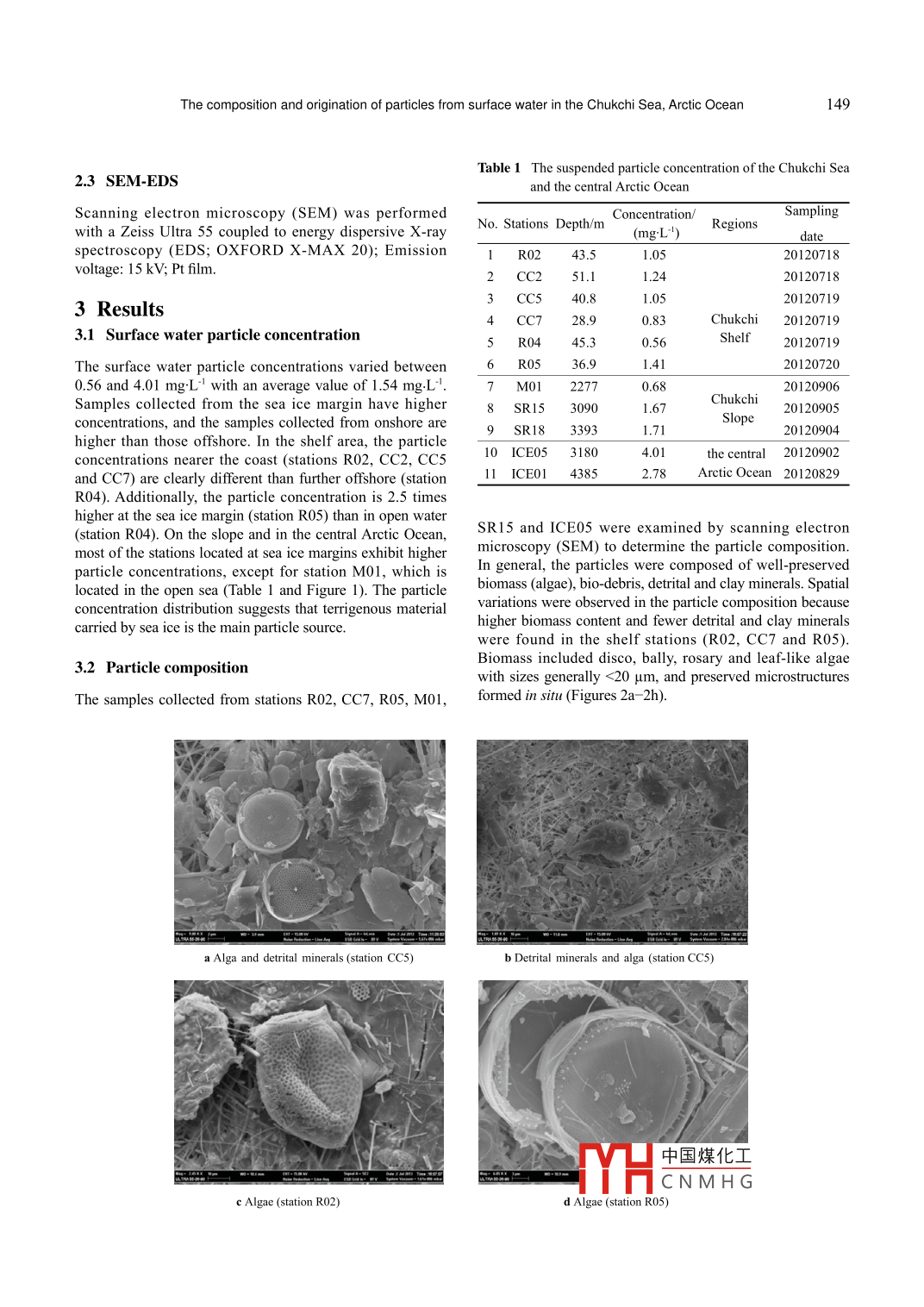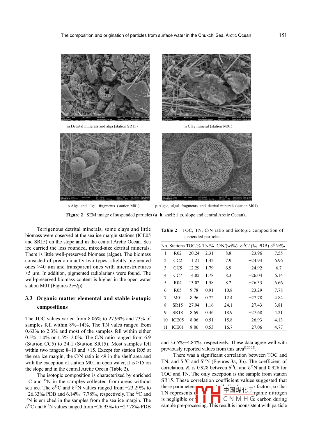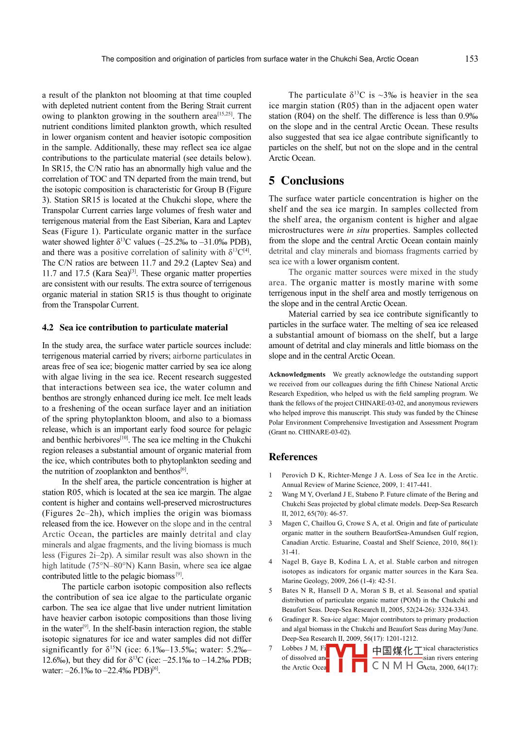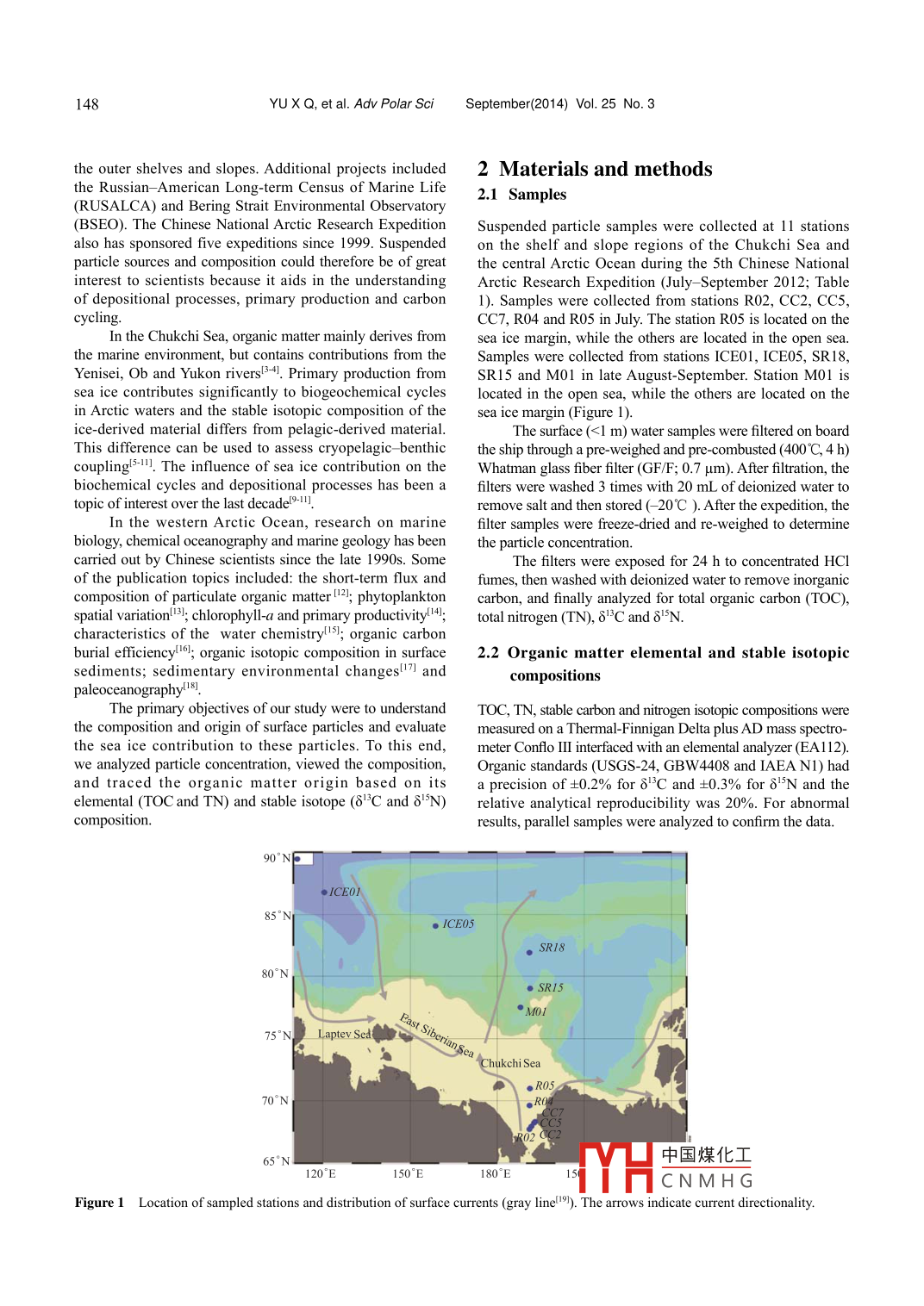 ●Article●Advances in Polar Sciencedoi: 10.13679/j. advps.2014.3.00147September 2014 Vol. 25 No. 3: 147-154The composition and origination of particles from surfacewater in the Chukchi Sea, Arctic OceanYU Xiaoguo*, LEI Jjiang, YAO Xuying, ZHU Jihao & JIN XiaobingKey Laboratory of Submarine Geosciences, Second Institute of Oceanography, SOA, Hangzhou 310012, ChinaReceived 19 April 2014; accepted 26 May 2014Abstract Suspended particle samples were collected at 11 stations on the shelf and slope regions of the Chukchi Sea and thecentral Aretic Ocean during the fifth Chinese National Arctic Research Expedition (summer 2012). The particle concentration,total organic carbon (TOC), total nitrogen (TN) and the isotopic composition of the samples were analyzed. The suspended particleconcentration varied between 0.56 and 4.01 mgL); the samples collected from the sea ice margin have higher concentrations.The organic matter content is higher in the shelf area (TOC: 9.78% 20.24%; TN: 0.91%- 2.31%), and exhibits heavier isotopiccompositions (8"C:- -23.29%o to- -26.33%o PDB; δ'N: 6.14%0-7.78%o), indicating that the organic matter is mostly marine inorigin with some terrigenous input. In the slope and the central Arctic Ocean, the organic matter content is lower (TOC: 8.06%-8.96%; TN: 0.46%-0.72%), except for one sample (SR15), and has lighter isotopic compositions (8"C: -26.93%o to -27.78%oPDB; δ'N: 4.13%o- 4.84%o). This indicates that the organic matter is mostly trrstrially derived in these regions. The extremelyhigh amount of terrigenous organic matter (TOC: 27.94%; TN: 1.16%; 8δIC: -27.43%0 PDB; 8'SN: 3.81%o) implies that it wascarried by transpolar curents from the East Siberian Sea. Material, including sea ice algae, carried by sea ice are the primarysource for particles in the sea ice margins. Sea ice melting released a substantial amount of biomass into the shelf, but a largeamount of detrital and clay minerals in the slope and the central Arctic Ocean.Keywords Chukchi Sea, particles, organic matter, stable isotopesCitation: YuX G, LeiJJ, Yao X Y, et al. The composition and origination of particles from surface water in the Chukchi Sea, ArcticOcean. Adv Polar Sci, 2014, 25: 147-154, doi: 10.13679/j.advps.2014.3.001471 Introductionnarrow Bering Strait between Alaska and Siberia, and theTranspolar Current that inputs large volumes of fresh waterThe Arctic Ocean is almost completely surrounded by theand terrigenous material from the East Siberian, Laptev andEurasian and the North American continents. It is connected Kara Seas. The sea ice cover in the Arctic Ocean reaches itsto the Pacific Ocean via the Bering Strait and to the Atlanticmaximum in March, and minimum in September!". Sea iceOcean through the Fram Strait. Shallow continental shelfin the Chukchi Sea is seasonal with melting starting in July;regions account for ~50% of the total surface area of theit is covered completely in December2.Arctic Ocean, which makes it unique among the world'sGlobal warming in the Arctic is decreasing the extentoceans. The Chukchi Sea is a marginal sea of the Arcticand thickness of sea ice cover, increasing the ice free seasonOcean. It is bounded on the west by the East Siberian Sea,in the Arctic Ocean. The changing climate is also alteringto the east by Alaska and the Beaufort Sea, and to the norththe timing and magnitude of river discharge and coastalby the Chukchi Plateau and Canadian Abyssal Plain. The erosion, and the delivery of trigenous organic cartbon to theBering Strait is its southernmost limit and connects it to theArctic Ocean. Recently, many scientists (funded by differentBering Sea and the Pacific Ocean. Its surface currents includecountries) investigated global changes in the Arctic Ocean.the warm and relatively saline water originating from theFor example, the US National Science Foundation (NSF)-funded Shelf- B中國煤化工:$ project aimedto provide a tho二_current status of* Corresponding author (email: yuxiaoguo@sio.org.cn)the Chukchi/BefYHc N M H Ggional focus onjournal.polar.gov.cn148YU X Q, et al. Adv Polar SciSeptember(2014) Vol. 25 No. 3the outer shelves and slopes. Aditional projects included 2 Materials and methodsthe Russian- American Long-term Census of Marine Life2.1 Samples(RUSALCA) and Bering Strait Environmental Observatory(BSEO). The Chinese National Arctic Research ExpeditionSuspended particle samples were collected at 11 stationsalso has sponsored five expeditions since 1999. Suspendedon the shelf and slope regions of the Chukchi Sea andparticle sources and composition could therefore be of greatthe central Arctic Ocean during the 5th Chinese Nationalinterest to scientists because it aids in the understandingArctic Research Expedition (July- September 2012; Tableof depositional processes, primary production and carbon1). Samples were collected from stations R02, CC2, CC5,cycling.CC7, R04 and RO5 in July. The station RO5 is located on theIn the Chukchi Sea, organic matter mainly derives fromsea ice margin, while the others are located in the open sea.the marine environment, but contains contributions from theSamples were collected from stations ICE01, ICE05, SR18,Yenisei, Ob and Yukon riversI3+1. Primary production fromSR15 and M01 in late August September. Station M01 issea ice contributes significantly to biogeochemical cycles located in the open sea, while the others are located on thein Arctic waters and the stable isotopic composition of thesea ice margin (Figure 1).ice-derived material differs from pelagic-derived material.The surface (<1 m) water samples were filtered on boardThis difference can be used to assess cryopelagic- -benthic the ship through a pre-weighed and pre-combusted (400"C, 4 h)coupling5-1I. The influence of sea ice contribution on theWhatman glass fiber filter (GF/F; 0.7 um). After filtration, thebiochemical cycles and depositional processes has been afilters were washed 3 times with 20 mL of deionized water totopic of interest over the last