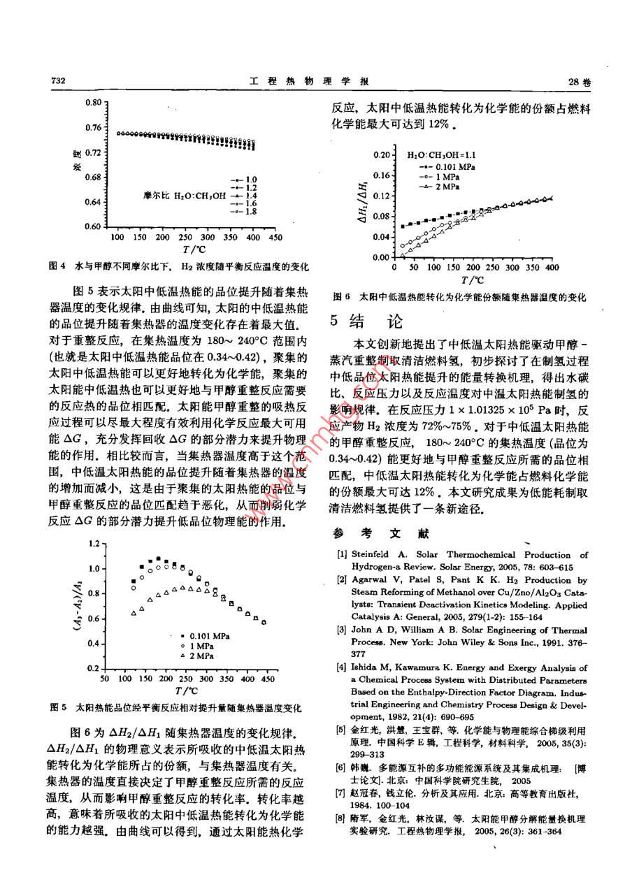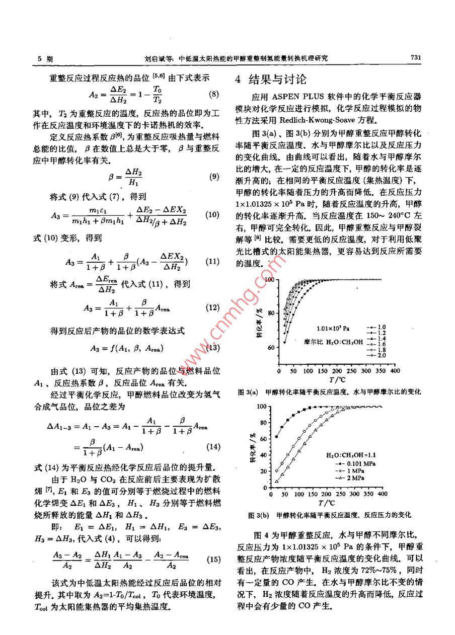 第28卷第5期工程熱物理學(xué)報(bào)Vol 28, No 52007年9月JOURNAL OF ENGINEERING THER.MOPHYSICSSep, 2007中低溫太陽(yáng)熱能的甲醇重整制氫能量轉(zhuǎn)專換機(jī)理研究劉啟斌12洪慧3金紅光1蔡睿賢1(1.中國(guó)科學(xué)院工程熱物理研究所,北京100080;2.中國(guó)科學(xué)院研究生院,北京100080;3.北京科技大學(xué)機(jī)械工程學(xué)院,北京100083)摘要通過(guò)甲醇-水蒸汽化學(xué)反應(yīng),本文提出中低溫太陽(yáng)熱能與甲重整反應(yīng)結(jié)合的制氫新方法,探討了中低溫太陽(yáng)熱能與甲醇重整制氫過(guò)程的能量轉(zhuǎn)換機(jī)理,分析了不同壓力條件下的水碳比、反應(yīng)溫度對(duì)中低溫太陽(yáng)熱能-甲醇重整制氫的影響規(guī)律.研究結(jié)果表明:集熱180~240°c的低品位太陽(yáng)熱能(品位為034~0.42)將能更好地與甲醇重整反應(yīng)所需的品位相匹配.在反應(yīng)壓力為1x×101325×105Pa,反應(yīng)產(chǎn)物中H2濃度可有望達(dá)到72%~75%,中低溫太陽(yáng)熱能轉(zhuǎn)化為化學(xué)能占燃料化學(xué)能的份額可達(dá)12%,該研究為低能耗制取清潔燃料氫提供了一條新途徑關(guān)鍵詞中低溫太陽(yáng)熱能;制氫;甲醇重整反應(yīng)中圖分類號(hào):TK123文獻(xiàn)標(biāo)識(shí)碼:A·文章編號(hào):0253-231x(207)05072904ENERGY CONVERSION MECHANISM OF HYDROGEN PRODUCTIONWITH METHANOL STEAM REFORMING BY MID-AND-LOWTEMPERATURE SOLAR THERMAL ENERGYLIU Qi-Bin,2 HONG Hui3 IN Hong-Guang CAI Rui-Xianl(1. Institute of Engineering Thermophysics, Chinese Academy of Sciences, Beijing 100080, China2. Graduate School, Chinese Academy of Sciences, Beijing 100080, Chinas3. Mechanical School, University of Sciences and Technology of Beijing, Beijing 100083, China)Abstract In thposed a novel approach for the solar hydrogen production which inte-grated methanol steam reforming and mid-and-low temperature solar thermal energy, and investigateds mechanism of energy conversion based on the second-Law thermodynamics. The influence of theoperation pressures and temperatures of methanol fuel, as well as the influence of molar ratios of waterto methanol, has been analyzed. Study indicates that low-grade solar thermal energy at temperaturesaround 180- 240 C (energy level is 0. 34-0.42)can further match the need of the energy level of themethanol steam reforming. Under the operation pressure of 1x1.01325 x 10 Pa, the concentration ofhydrogen of 72%-75% in the syngas was obtained. Also, the ratio that mid-and-low temperature solarthermal energy converted into chemical energy accounts for the fuel energy reached 12% maximallyThe promising results obtained in this study can provide a new approach for hydrogen production withlow energy consumptionKey words mid-and-low temperature solar thermal energy; hydrogen production; methanol steam引言在水分解、天然氣、煤以及石油的高溫氣化、重整方面國(guó)。這需要龐大昂貴的太陽(yáng)能集熱裝置來(lái)產(chǎn)生太陽(yáng)能作為清潔的新能源,與傳統(tǒng)能源結(jié)合的太陽(yáng)能高溫?zé)?其中諸多的科學(xué)與技術(shù)問(wèn)題也亟代熱化學(xué)制氫,引起很多學(xué)者的研究興趣,并開(kāi)展了解決。若采用太陽(yáng)中低溫?zé)崮苤茪鋭t存在一定的優(yōu)廣泛的研究,目前太陽(yáng)能熱化學(xué)制氫研究主要集中勢(shì)。甲醇重整制氫具有重整溫度低,能耗低,貯存收搞日期,200611-29;修訂日期:200707-13基金項(xiàng)目:國(guó)家自然科學(xué)基金重點(diǎn)項(xiàng)目資助(No90210032)作者簡(jiǎn)介劉啟斌(1079-),男,河南蘭考人,研究生,主要從事總能系統(tǒng)及太陽(yáng)能的研究工作工程熱物理學(xué)報(bào)和運(yùn)輸容易、方便、安全等優(yōu)點(diǎn),顯示出了廣泛的H,E分別代表反應(yīng)物或生成物的總能量及總,應(yīng)用前景,是近20年來(lái)新興的制氫技術(shù)岡.由于參數(shù)m,h,ε分別代表質(zhì)量,單位總能量(包括100~300°C的太陽(yáng)中低溫?zé)崮芘c甲醇重整反應(yīng)所需物理能和化學(xué)能),單位質(zhì)量的總(包括物理傭和要的熱品位高度吻合,因此若將中低溫太陽(yáng)熱能與化學(xué)傭).下標(biāo)1,2,3分別表示反應(yīng)物,反應(yīng)甲醇重整反應(yīng)相結(jié)合生產(chǎn)清潔燃料氫,將有著廣泛熱,生成物。的應(yīng)用前景,而目前尚未見(jiàn)這方面的文獻(xiàn)報(bào)道基于這個(gè)觀點(diǎn),本文探討了基于中低溫太陽(yáng)熱△H2△E2能甲醇重整制氫過(guò)程的能量轉(zhuǎn)換機(jī)理,并考察分析了甲醇重整反應(yīng)制氫過(guò)程的吸熱與反應(yīng)特性,為更CH,OH, H,O主要生成物CO2,H△EX深入地研究基于中低溫太陽(yáng)熱能甲醇重整制氫奠定HI, ELH3,e,基礎(chǔ)圖2甲醇重整反應(yīng)能量平衡示意圖2中低溫太陽(yáng)熱能甲醇重整制氫過(guò)程以吸熱化學(xué)反應(yīng)體系為研究對(duì)象,由熱力學(xué)第的能量釋放新機(jī)理一定律,在忽略動(dòng)能和位能變化的情況下,得到重圖1所示為所構(gòu)思的基于中低溫太陽(yáng)熱能甲醇整反應(yīng)的能量平衡關(guān)系式:重整制氫的示意圖,常溫下,甲醇與水以一定比例H1+△H2=H3混合后,進(jìn)入預(yù)熱器,加熱到一定溫度后進(jìn)入太陽(yáng)能熱化學(xué)反應(yīng)器,在催化劑的作用下,甲醇與水蒸汽h3=m1h1+△H2(1b)發(fā)生吸熱的化學(xué)反應(yīng),太陽(yáng)能提供化學(xué)反應(yīng)所需要其中,△H由太陽(yáng)熱能提供,與反應(yīng)的轉(zhuǎn)化率有的反應(yīng)熱,該反應(yīng)熱的大小與反應(yīng)的轉(z