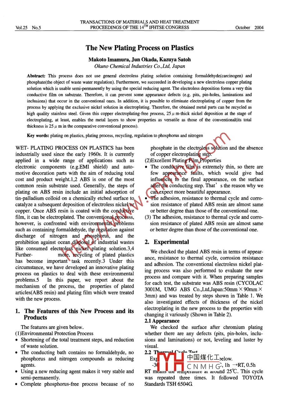 TRANSACTIONS OF MATERIALS AND HEAT TREATMENTVol.25 No.5PROCEEDINGS OF THE 14H IFHTSE CONGRESSOctober 2004The New Plating Process on PlasticsMakoto Imamura, Jun Okada, Kazuya SatohOkuno Chemical Industries Co,Ltd, JapanAbstract: This process does not use general electroless plating solution containing formaldehyde(carcinogen) andphosphate(the object of waste water regulation). Futhermore, we succeeded in developing a new electroless copper platingsolution which is usable semi-permanently by using the special reducing agent. The electroless deposition forms a very thinconductive film on substrate. Therefore, it can prevent some appearance defects (e.g. pits, pin-holes, laminations andinclusions) that occur in the conventional ones. In addition, it is possible to eliminate electroplating of copper from theprocess by applying the exclusive nickel solution in electroplating. Therefore, the obtained metal parts can be recycled ashigh quality stainless steel. Given this copper electroplating-free process, 25 11 m-thick nickel deposition at the stage ofelectroplating, at least, enables the metal layers to show properties as versatile as those of the conventional(its totalthickness is 25 u m in the comparative conventional process).Key words: plaing on plastis, plating process, rececling. regulation to phosphorus and nitrogenWET- PLATING PROCESS ON PLASTICS has beenphosphate in the electroless solution and the absenceindustrially used since the early 1960s. It is currentlyof copper electroplating step.applied in a wide range of applications such as(2)Excellent Plating Film Propertieselectronic components (e.g.EMI shield) and auto-) The conductive film is extremely thin, so there aremotive decoration parts with the aim of reducing totalfew appearance faults, which would give badcost and product weight.1,2 ABS is one of the mostinfluences to the final appearance, on the surfacecommon resin substrate used. Generally, the steps ofafter the conducting step. That’s the reason why weplating on ABS resin include an initial adsorption ofcan expect more beautiful appearance.tin-palladium colloid on a chemically etched surface to●The adhesion, resistance to thermal cycle and corro-catalyze a subsequent deposition of electroless nickel orsion resistance of plated ABS resin are almost samecopper. Once ABS resin is coated with the conductiveor better degree than those of the conventional one.film, it can be electroplated. The conventional processs,(3) The adhesion, resistance to thermal cycle and corro-however, is confronted with environmental problemssuch as containing formaldehyde, the regulation againstdischarge of nitrogen and phosphorus, and theprohibition against ocean disposal of industrial wastes2. Experimentallike consumed electroless nickel plating solution.3,4We checked the plated ABS resin in terms of appear-Further-more, recycling of plated plasticsance, resistance to thermal cycle, corrosion resistancehas become important task recently.3 Under thisand adhesion. The conventional electroless nickel plat-circumstance, we have developed an innovative platinging process was also performed to evaluate the newprocess on plastics to deal with these environmentalprocess and compare with it. When preparing samplesproblems.5 In this paper, we report about thefor each test, the substrate was ABS resin (CYCOLACmechanism of the process, the properties of plated3001M,UMG ABS Co.,Ltd,Japan:50mm X 90mm Xarticles(ABS resin) and plating film which were treated3mm) and was treated by steps shown in Table 1. Wewith the new process.also investigated effects of thickness of the nickel1. The Features of this New Process and itselectroplating in the new process to the properties withchanging it variously (Shown in Table 2).Products2.1 AppearanceThe features are given below.We checked the surface after chromium plating(1)Environmental Protection Processwhether there are any defects (pits, pin-holes, inclu-●Shortening of the total treatment steps, and reductionsions and laminations) or not, leveling and luster byof waste solution.visual.●The conducting bath contains no formaldehyde, nophosphorus and nitrogen compounds as reducingExE中國煤化工selow.agents.0HCNMH G, 1h→RT, 0.5h●Using a new reducing agent makes it very stable andRT meausueucuperaue al avund 25C. This cyclesemi-permanently.was repeated three times. It followed TOYOTA●Complete phosphorus-free process because of noStandards TSH 6504G1120PROCEEDINGS OF THE 14H IFHTSE CONGRESSOctober 2004Table 1. Treatment steps of each process.film which is only 0.01~0.02 u m. (Figure 1 shows(water rinse between each step are omitted)the cross section of ABS resin which is treated with thenew process by TEM) Ms.Ono and others succeeded inNEWCONVENTIONALTEM (Transmission Electron Microscope) observationCleaningon the cross section of this film, and found that thisEtchingdeposition was composed of grains sized about 2 nm.NeutralizationThis characteristic causes the deposition of electrolyticplating starts from the contact points with racks. FigurePre-dippingCatalyzing2 shows the products after chromium plating. We foundAcceleratingthat the total nickel thickness has to be only 25 μ mConductingElectroless nickel plating(Nickel plating 1 needed 15 u m ) to gain appearance isequal with the conventional one in luster and leveling,Nickel plating 1Activationthe new process doesn't apply copper electroplatingNickel plating 2.Strike platingwhich provides good leveling though.Dur-nickel platingChromium platingAcid copper platingSemi-bright nickel platingBright nickel platingTable 2.Con dactive flmChange of the thickness of the nickel electroplating.Metal layer| Nickel plating 1 I Nickel plating 25,10,15or20 u m10μm.Copper SB-nickelB-nickelCONVENTIONAL 15 u m6μ m4μ mABS2.3 Corrosion Resistance Test (CASS test)Test condition followed (JIS) H 8502. **Figure 1. Image of TEMThe test duration was 50 hours.(the cross section of plated ABS resin)Instrument : CASS TEST instrum