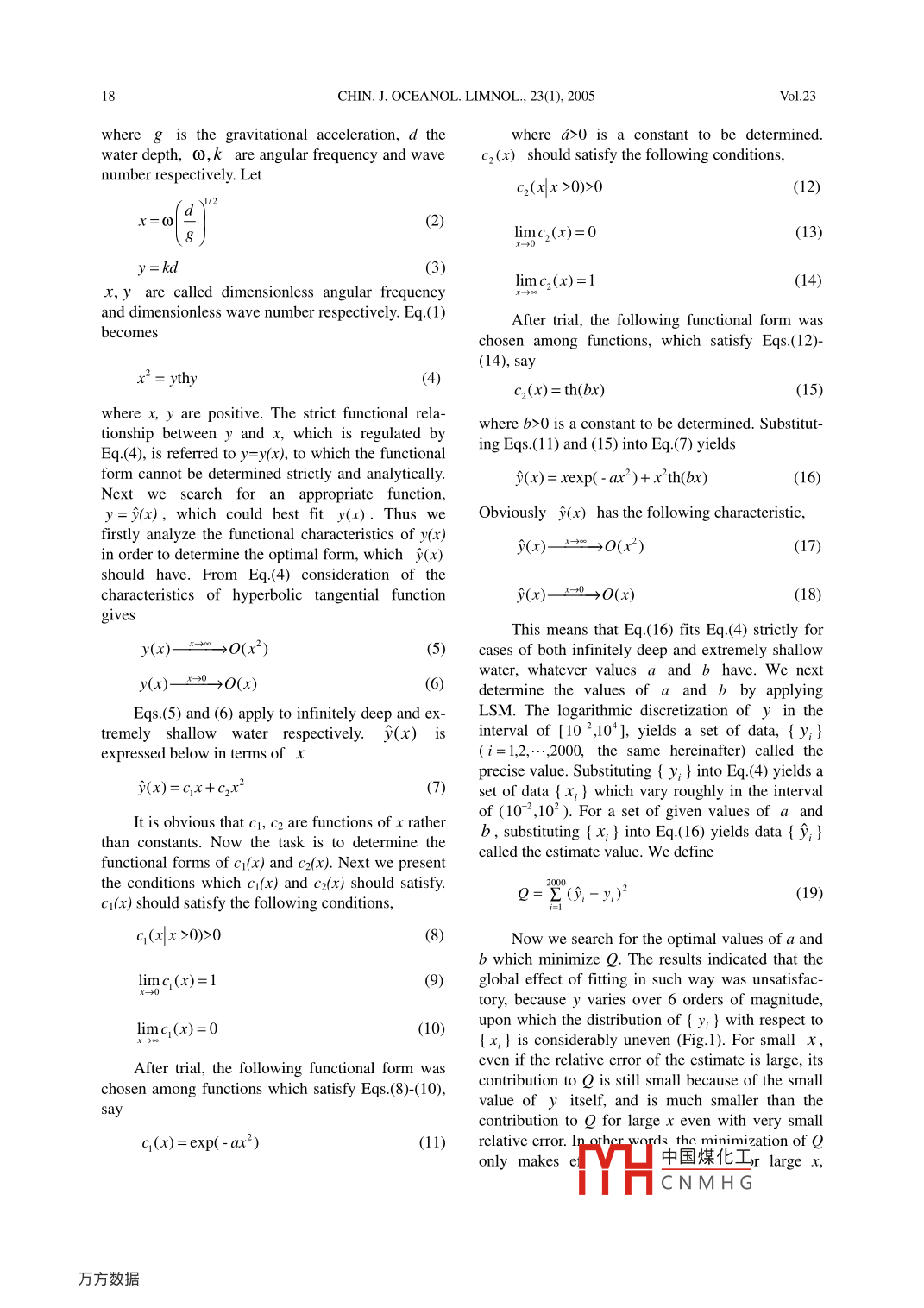 Chinese Journal of Oceanology and LimnologyVol. 23 No. 1,P. 17-22, 2005Empirical formula for wave length of ocean wave in finite depthwater*GUAN Changlong (管長(zhǎng)龍), JU Hongmei (鞠紅梅)(Physical Oceanography Laboratory & Institute of Plhysical Oceanography, Ocean University of China, Qingdao 266003, China)Received July 18, 2003; revision accepted July 10, 2004AbstractIn this paper, function characteristics of dispersion of ocean wave in finite depth water wereanalyzed systematically. The functional form of the fiting function is reasonably proposed, in which the parame-ters are optimally determined by the least square method (L SM). For infinitely deep and extremely shallow water,the fiting function fits strictly the dispersion to be fited. A new technique is presented in application of LSM.An empirical formula with maximum error of less than 0.5% for computing wavelength in finite depth water ispresented for practical applications.Key words: wavelength; ocean wave; finite depth water1 INTRODUCTIONlength is required to be recomputed at each timestep. The Newton method is not applicable to suchFor ocean wave computation in shallow and fi-models, especially for forecasting purpose. So anite depth water, it is usually required to computeconvenient empirical formula with acceptablewavelength (or wave number) on the premise thataccuracy is needed to replace the Newton method tothe wave period is known. It is well known thatcompute wavelength. Although Hunt (1979) pro-wavelength cannot be computed directly from theposed an analytical formula with high accuracy, itdispersion of ocean wave in finite depth water.has not been applied widely probably because of itsNumerical or graphic/tabular approximation meth-somewhat complex functional form.ods are needed to obtain the wavelength previous.In this paper, characteristics of dispersion ofUse of the tabular method adopted in the nationalspecifications of China for harbor hydrology (MOC,systematically. On the basis of the analyses the1999) usually leads to the error whose magnitude isfunctional form of the fitting function is reasonablydependent on the users. In most numerical oceanproposed, in which the parameters are optimallywave models (W AMDI, 1988; Wen et al, 1999), thedetermined by the least square method (LSM).Newton iterative method requiring much computa-Eventually a concise empirical formula with excel-tion time, is applied to compute wavelength itera-lent accuracy for computing wavelength in finitetively under to condition of arbitrary accuracy. Fordepth water is presented for practical applications.fixed computational region and stationary waterdepth, computing wavelength frequency in advance2 FITTING METHODand using the data repeatedly later on could avoidthe problem from using the Newton method.Wave-current interaction in coastal region is anThe dispersion of small amplitude surfaceimportant physical phenomenon. Common practicegravity wave in finite depth water is given asin the field is to compute hydrodynamic environ-∞2 = gkth(kd)(1)ment in coastal area with wave-current coupledmodels (Guan et al, 1999; Xie et al, 2001) where* This study was fwater depth is not stationary and therefore wave-Programme of Chin:中國(guó)煤化IlgiesR&DTYHCNMH G.18CHIN. J. OCEANOL. LIMNOL, 23(1), 2005VoL.23where g is the gravitational acceleration, d thewhere a>0 is a constant to be determined.water depth, 0,k are angular frequency and wavec2(x) should satisfy the following conditions,number respectively. Letc2(x|x >0)>0(12)x=∞“}(2glimc(x)=0(13)y= kd(3limc2(x)=1(14)x,y are called dimensionless angular frequencyand dimensionless wave number respectively. Eq.(1)After trial, the following functional form wasbecomeschosen among functions, which satisfy Eqs.(12)-(14), sayx2 = ythy(4)c2(x)= th(bx)(15)where x, y are positive. The strict functional rela-where b>0 is a constant to be determined. Substitut-tionship between y and x, which is regulated bying Eqs.(11) and (15) into Eq.(7) yieldsEq.(4), is referred to y=y(x), to which the functionalform cannot be determined strictly and analytically.y(x)= xexp( - ax2)+ x th(bx)(16)Next we search for an appropriate function, .y= y(x),which could best fit y(x). Thus weObviously j)(x) has the following characteristic,firstly analyze the functional characteristics of y(x)y(x)- .2 >0(x2)(17)in order to determine the optimal form, which y(x)should have. From Eq.(4) consideration of thecharacteristics of hyperbolic tangential functiony(x)- x→0_ >O(x)(18)givesThis means that Eq.(16) fits Eq.(4) strictly fory(x)-→0→O(x2)(5cases of both infinitely deep and extremely shallowwater, whatever values a and b have. We nexty(x)- -0→O(x)(6)determine the values of a and b by applyingEqs.(5) and (6) apply to infinitely deep and ex-LSM. The logarithmic discretization of y in thetremely shallow water respectively. y(x) isinterval of [10-2,10*], yields a set of data, { y;}expressed below in termsof X(i= 1,2,-,2000,the same hereinafter) called theprecise value. Substituting { y; } into Eq.(4) yields ay(x)=cx+C2x2set of data { x; } which vary roughly in the intervalIt is obvious that CI, C2 are functions of x ratherof (10~,102). For a set of given values of a andb, substituting { x;} into Eq.(16) yields data { y;}than constants. Now the task is to determine thecalled the estimate value. We definefunctional forms of c(x) and C2(x). Next we presentthe conditions which c(x) and C2(x) should satisfy.Q=' Z(9,-y1)2(19)C(x) should satisfy the following conditions,q(x|x >0)>0(8)Now we search for the optimal values of a andb which minimize Q. The results indicated that thelimc(x)=1(9)global effect of fitting in such way was unsatisfac-tory, because y varies over 6 orders of magnitude,upon which the distribution of { y; } with respect to(10). { x;} is considerably uneven (Fig.1). For small x,even if the relative error of the estimate is large, itschosen among functions which satisfy Eqs.(8)-(10),contribution to Q is still 
