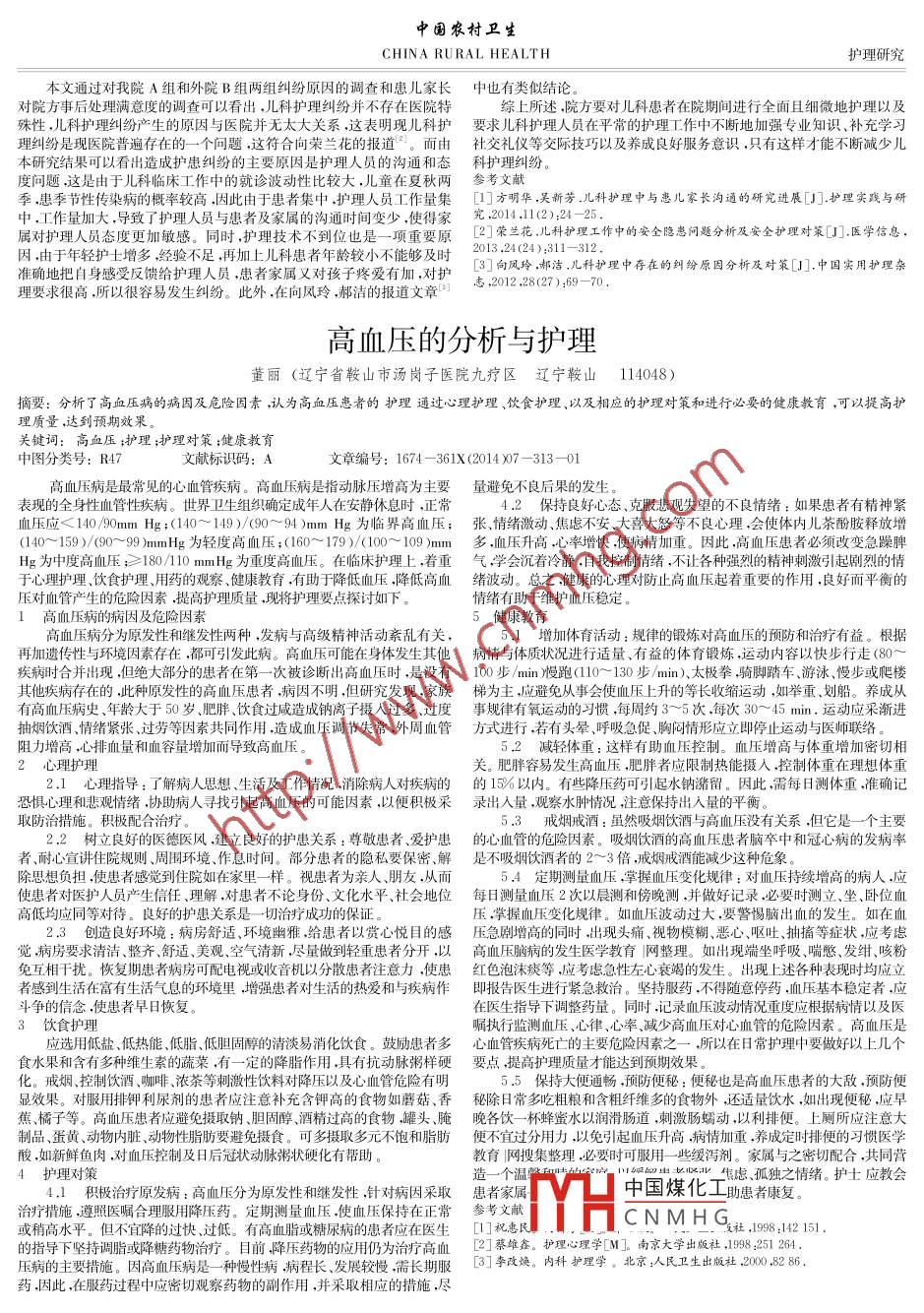 中國農(nóng)村衛(wèi)生CHINA RURAL HEALTH護(hù)理研究本文通過對我院A組和外院B組兩組糾紛原因的調(diào)查和患兒家長中也有類似結(jié)論。對院方事后處理滿意度的調(diào)查可以看出兒科護(hù)理糾紛并不存在醫(yī)院特綜上所述,院方要對兒科患者在院期間進(jìn)行全面且細(xì)微地護(hù)理以及殊性,兒科護(hù)理糾紛產(chǎn)生的原因與醫(yī)院并無太大關(guān)系,這表明現(xiàn)兒科護(hù)要求 兒科護(hù)理人員在平常的護(hù)理工作中不斷地加強(qiáng)專業(yè)知識(shí)、補(bǔ)充學(xué)習(xí)理糾紛是現(xiàn)醫(yī)院普遍存在的一-個(gè)問題 ,這符合向榮蘭花的報(bào)道”。而由社交禮儀等 交際技巧以及養(yǎng)成良好服務(wù)意識(shí),只有這樣才能不斷減少兒本研究結(jié)果可以看出造成護(hù)患糾紛的主要原因是護(hù)理人員的溝通和態(tài)科護(hù)理糾紛 。度問題,這是由于兒科臨床工作中的就診波動(dòng)性比較大,兒童在夏秋兩參考文獻(xiàn)季,患季節(jié)性傳染病的概率較高,因此由于患者集中,護(hù)理人員工作量集[0]方明華 ,吳新芳.兒科護(hù)理中與患幾家長溝通的研究進(jìn)展[J].護(hù)理實(shí)踐與研中.工作量加大.導(dǎo)致了護(hù)理人員與患者及家屬的溝通時(shí)間變少,使得家究 2014.11(2);24-25屬對護(hù)理人員態(tài)度更加敏感。同時(shí),護(hù)理技術(shù)不到位也是一-項(xiàng)重要原[2]榮蘭花.兒科護(hù)理工作中的安全隱患問題分析及安全護(hù)理對策[J].醫(yī)學(xué)信息,因,由于年輕護(hù)士增多,經(jīng)驗(yàn)不足再加上兒科患者年齡較小不能夠及時(shí)2013 ,24(24)311-312.準(zhǔn)確地把自身感受反饋給護(hù)理人員,患者家屬又對孩子疼愛有加,對護(hù)[3]向鳳玲,郝潔.兒科護(hù)理中存在的糾紛原因分析及對策[J].中國實(shí)用護(hù)理雜理要求很高,所以很容易發(fā)生糾紛。此外,在向鳳玲,郝潔的報(bào)道文章[志,2012 ,28(27):69- -70.高血壓的分析與護(hù)理董麗(遼寧省鞍山市湯崗子醫(yī)院九療區(qū)遼寧鞍山114048)摘要:分析了高血壓病的病因及危險(xiǎn)因素,認(rèn)為高血壓患者的護(hù)理通過心理護(hù)理、飲食護(hù)理.以及相應(yīng)的護(hù)理對策和進(jìn)行必要的健康教育,可以提高護(hù)理質(zhì)量,達(dá)到預(yù)期效果。關(guān)鍵詞:高血壓;護(hù)理;護(hù)理對策;健康教育中圖分類號(hào): R47文獻(xiàn)標(biāo)識(shí)碼: A .文章編號(hào): 1674- -361X(2014)07-313-01高f1壓病是最常見的心血管疾病。高血壓病是指動(dòng)脈壓增高為主要量避 免不良后果的發(fā)生。表現(xiàn)的全身性血管性疾病。世界衛(wèi)生組織確定成年人在安靜休息時(shí)正常4 .2保持良好心態(tài) 、克服悲觀失望的不良情緒:如果患者有精神緊血壓應(yīng)< 140/90mm Hg;(140~ 149>/<90~94 )mm Hg為臨界高血壓;張 情緒激動(dòng)、焦慮不安、大喜大怒等不良心理,會(huì)使體內(nèi)兒茶酚胺釋放增(140~ 159 )/ (90~99 )mmHg為輕度高血壓;(160~ 179)/(100~ 109 )mm多 .血壓升高心率增快,使病情加重。因此高血壓患者必須改變急躁脾Hg為中度高血壓;≥180/110 mmHg為重度高血壓。在臨床護(hù)理上,著重氣 學(xué)會(huì)沉著冷靜,自我控制情緒,不讓各種強(qiáng)烈的精神刺激引起劇烈的情于心理護(hù)理、飲食護(hù)理、用藥的觀察、健康教育有助于降低血壓,降低高血緒波動(dòng)。 總之,健康的心理對防止高血壓起著重要的作用,良好而平衡的壓對血管產(chǎn)生的危險(xiǎn)因素,提高護(hù)理質(zhì)量,現(xiàn)將護(hù)理要點(diǎn)探討如下。情緒有助于維護(hù)血壓穩(wěn)定。1高血壓病的病因 及危險(xiǎn)因素5健康教育高血壓病分為原發(fā)性和繼發(fā)性兩種,發(fā)病與高級(jí)精神活動(dòng)紊亂有關(guān),5.1 增加體育活動(dòng) :規(guī)律的鍛煉對高血壓的預(yù)防和治療有益。根據(jù)再加遺傳性與環(huán)境因素存在,都可引發(fā)此病。高血壓可能在身體發(fā)生其他病情 與體質(zhì)狀況進(jìn)行適量、有益的體育鍛煉,運(yùn)動(dòng)內(nèi)容以快步行走(80~疾病時(shí)合并出現(xiàn),但絕大部分的患者在第一- 次被診斷出高血壓時(shí),是沒有100 步/min )慢跑(110~ 130步/min)、太極拳,騎腳踏車、游泳、慢步或爬樓其他疾病存在的,此種原發(fā)性的高血壓患者,病因不明,但研究發(fā)現(xiàn),家族梯為主 ,應(yīng)避免從事會(huì)使血壓上升的等長收縮運(yùn)動(dòng),如舉重、劃船。養(yǎng)成從有高血壓病史、年齡大于50歲、肥胖、飲食過咸造成鈉離子攝入過多、過度事 規(guī)律有氧運(yùn)動(dòng)的習(xí)慣,每周約3~ ~5 次,每次30~ 45 min .運(yùn)動(dòng)應(yīng)采漸進(jìn)抽煙飲酒、情緒緊張、過勞等因素共同作用,造成血壓調(diào)節(jié)失常,外周血管方式進(jìn)行 ,若有頭暈、呼吸急促、胸悶情形應(yīng)立即停止運(yùn)動(dòng)與醫(yī)師聯(lián)絡(luò)。阻力增高心排血量和血容量增加而導(dǎo)致高血壓。5.2減輕體重:這樣有助血壓控制。血壓增高與體重增加密切相2心理護(hù)理關(guān)。肥胖容易發(fā)生高血壓,肥胖者應(yīng)限制熱能攝入,控制體重在理想體重2.1心理指導(dǎo): 了解病人思想、生活及工作情況,消除病人對疾病的的 15%以內(nèi)。有些降壓藥可引起水鈉潴留。因此,需每日測體重,準(zhǔn)確記恐懼心理和悲觀情緒,協(xié)助病人尋找