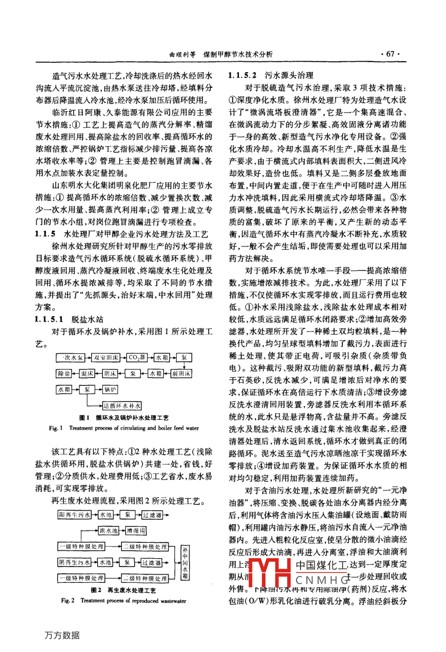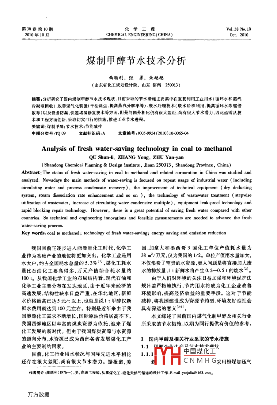 第38卷第10期化學(xué)工程Vol 38 No 102010年CHEMICAL ENGINEERING( CHINA)oct,2010煤制甲醇節(jié)水技術(shù)分析曲順利,張勇,朱艷艷(山東省化工規(guī)劃設(shè)計(jì)院,山東濟(jì)南250013)摘要:分析研究了國內(nèi)煤制甲醇節(jié)水技術(shù)現(xiàn)狀,目前采取的節(jié)水措施主要集中在重復(fù)利用工業(yè)用水(循環(huán)水和蒸汽冷凝液回收)、改善煤氣化裝置(干法除塵提高蒸汽分解率等)廢水處理技術(shù)(廢水階梯利用提高循環(huán)水濃縮倍數(shù)等)以及設(shè)備防漏、快速堵漏修復(fù)技術(shù)等方面但是與國外相比仍有很大差距尚有很大節(jié)水潛力因此亟需從技術(shù)和工程方面創(chuàng)新采取切實(shí)可行的措施,推進(jìn)工業(yè)節(jié)水進(jìn)程。關(guān)鍵詞:煤制甲醇;節(jié)水技術(shù);節(jié)能減排中圖分類號:TQ09文獻(xiàn)標(biāo)識(shí)碼:A文章編號:10059954(2010)10006504Analysis of fresh water-saving technology in coal to methanolQU Shun-li, ZHANG Yong, ZHU Yan-yanShandong Chemical Planning Design Institute, Jinan 250013, Shandong Province, China)Abstract: The status of fresh water-saving in coal to methanol and related corporation in China was studied andanalyzed. Nowadays the main methods of water-saving is focused on repeat usage of industrial water( includingcirculating water and process condensate recovery ) the improvement of technical equipment( dry dedustingsystem, steam dissociation rate enhancement and so on ) the technology of wastewater treatment stepwiseutilization of wastewater, increase of circulating water condensive multiple ), equipment leak-proof technology andrapid blocking repair technology. However, there is a great potential of saving fresh water compared withcountries. So technical and engineering innovations and feasible measurements areancewater-saving process.Key words: coal to methanol; technology of fresh water-saving; energy saving and emission reduction我國目前正逐步進(jìn)入能源重化工時(shí)代,化學(xué)工國加拿大和墨西哥3國化工單位產(chǎn)值耗水量為業(yè)作為基礎(chǔ)產(chǎn)業(yè)的地位將更加突出。化學(xué)工業(yè)是用38m3/萬元,僅為我國的1/2。單位產(chǎn)值用水量加大水大戶,約占全國耗水總量的53%,煤化工耗水不僅浪費(fèi)了寶貴的水資源更大問題是將直接加大廢量比石油化工要高得多,萬元產(chǎn)值綜合耗水量約水的排放量,1t新鮮水將產(chǎn)生020.5t的廢水2100t。從我國化學(xué)工業(yè)的布局結(jié)構(gòu)看,現(xiàn)代石油和由于人們對環(huán)境的關(guān)注日益加強(qiáng)和環(huán)境保護(hù)法化學(xué)工業(yè)主要分布在發(fā)達(dá)地區(qū),由于近年來經(jīng)濟(jì)的規(guī)日益嚴(yán)格地執(zhí)行,節(jié)約用水將成為化工企業(yè)改善髙速發(fā)展,結(jié)構(gòu)性缺水日益嚴(yán)重,在華北地區(qū),新鮮環(huán)境影響,提高經(jīng)濟(jì)效益的重要手段。這對于節(jié)能水價(jià)格最高已達(dá)5元t以上,也就是說1t甲醇僅新減排,將我國建設(shè)成為資源節(jié)約型、環(huán)境友好型社會(huì)鮮水費(fèi)用就達(dá)到100元左右。特別是近年來由于我具有深遠(yuǎn)的意義36。國能源化工需求不斷增長,國際原油價(jià)格居高不下,本文綜述了目前國內(nèi)煤氣化制甲醇及相關(guān)行業(yè)我國西部地區(qū)以豐富的煤炭資源為依托,迎來了煤所采取的節(jié)水措施,以期為同行提供有價(jià)值的參考?;ぐl(fā)展的新時(shí)代。但由于我國煤炭資源與水資源的逆向分布,水資源已成為西部各省發(fā)展煤化工產(chǎn)1國內(nèi)甲醇及相關(guān)行業(yè)采取的節(jié)水措施業(yè)的主要制約因素。1.1目前,化工行業(yè)用水狀況與國際先進(jìn)水平相比1.1.1中國煤化工還存在很大差距,尚有很大節(jié)水潛力。據(jù)報(bào)道,美CNMHG采用粉煤加壓氣作者簡介:曲順利(1976—),男高級工程師從事煤化工、液化天然氣儲(chǔ)運(yùn)的設(shè)計(jì)工作,E- mail: yanjulia@163.cm化學(xué)工程2010年第38卷第化技術(shù)合成氣精制采用低溫甲醇洗技術(shù),采用循環(huán)甲醇合成界區(qū)機(jī)泵冷卻水全部回收,并人循環(huán)水系水系統(tǒng)及蒸汽冷凝水回收再利用技術(shù)節(jié)水統(tǒng)做循環(huán)水補(bǔ)水。魯南化肥廠主體廢水處理工藝采1.1.2節(jié)水工藝裝置用缺氧/好氧生化處理法(M0)+反滲透法,主要1.12.1煤氣化裝置除塵針對魯化排放的工業(yè)廢水和生活污水進(jìn)行處理。污棗莊埃新斯新氣體有限公司氣化裝置釆用流化水處理流程大致如下:污水進(jìn)入污水處理廠后先經(jīng)床氣化工藝。該工藝采用干法除塵,煤氣進(jìn)入布袋除過格柵過濾除去固體物質(zhì),然后匯入調(diào)節(jié)池進(jìn)行水塵器除塵后,進(jìn)一步釆用循環(huán)水直流噴淋除塵降溫,質(zhì)調(diào)節(jié),調(diào)節(jié)池內(nèi)設(shè)水下攪拌機(jī),使各路進(jìn)水與三級雖然比傳統(tǒng)直流噴淋除塵產(chǎn)生的造氣污水減少很多,處理的濾池反沖洗水和脫水機(jī)的壓濾液混合均勻但增加了布袋除塵器等設(shè)備的投資,沒有從根本上杜再由提升泵輸送到初沉池,污水在初沉池內(nèi)經(jīng)過初絕造氣污水的產(chǎn)生,仍然需要造氣污水處理裝置進(jìn)行步沉淀,除去水中懸浮物使固體懸浮物降低。初沉污水處理。若能優(yōu)化工藝,完全取消循環(huán)水直流噴淋池出水匯合好氧池回流消化液和二沉池回流污泥進(jìn)裝