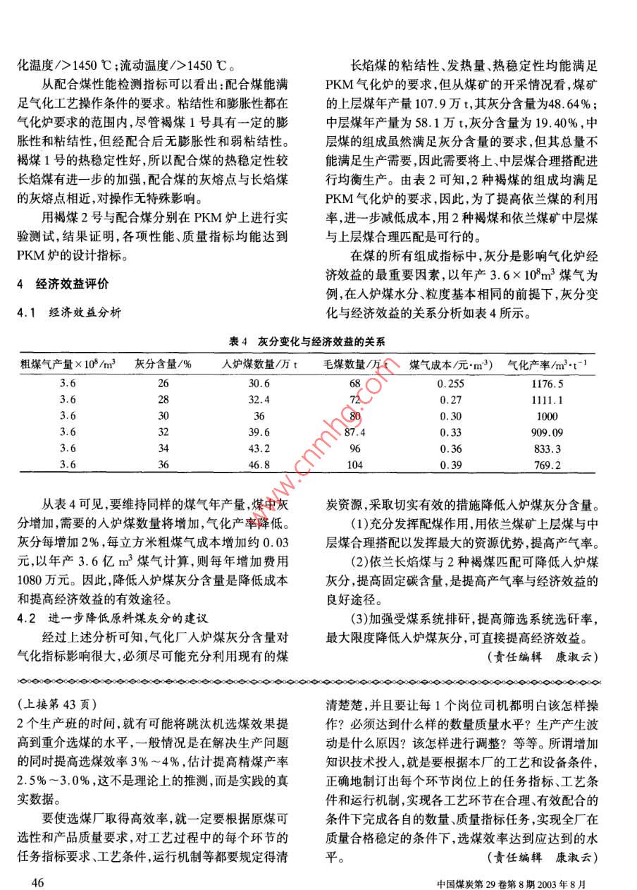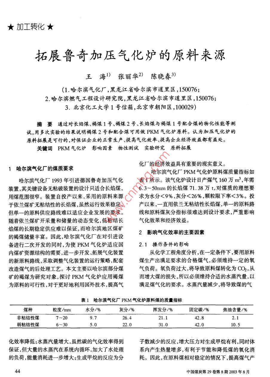 ★加工轉(zhuǎn)化★拓展魯奇加壓氣化爐的原料來源王海l)張麗華2)陳曉春3》(1.哈爾濱氣化廠,黑龍江省哈爾濱市道里區(qū),150076;2.哈爾濱燃?xì)夤こ淘O(shè)計(jì)研究院,黑龍江省哈爾濱市道里區(qū),150076;3.北京化工大學(xué)1號信箱,北京市朝陽區(qū),100029)摘要通過對長焰煤、褐煤1號、褐煤2號、長焰煤與褐煤1號配合煤的物化性能等測試,用多次實(shí)驗(yàn)的結(jié)果說明褐煤2號和配合煤可用做PKM氣化爐原料。認(rèn)為加壓氣化爐的原料拓展是可行的,對保證企業(yè)的正常生產(chǎn)、提高氣化效率、提高企業(yè)經(jīng)濟(jì)效益都有益處。關(guān)鍵詞PKM 氣化爐影響 因素物性測試實(shí)驗(yàn)研究原料拓展化廠的經(jīng)濟(jì)效益具有重要的現(xiàn)實(shí)意義。1哈爾濱氣化廠 的煤質(zhì)要求哈爾濱氣化廠PKM氣化爐原料煤質(zhì)量指標(biāo)如哈爾濱氣化廠1993 年引進(jìn)德國魯奇加壓氣化表1所示。該氣化爐設(shè)計(jì)日產(chǎn)煤氣160萬m3,年需裝置,其關(guān)鍵設(shè)備無粘破裝置的設(shè)計(jì)只適合長焰煤,6.3~ 50mm的長焰煤71.38萬t, 對煤質(zhì)的理想要用煤范圍很窄。裝置自投產(chǎn)以來,采用的原料來源求為水分<9% ,灰分<26% ,顆粒限下率<3%。投于依蘭煤礦無粘結(jié)性的長焰煤,雖然運(yùn)行效果穩(wěn)定,產(chǎn)以來,一直用依蘭無粘結(jié)性長焰煤,單- -的原料路但單-一的原料供應(yīng)路線難以適應(yīng)企業(yè)發(fā)展的要求。線和原料煤灰分指標(biāo)很難達(dá)到設(shè)計(jì)要求,嚴(yán)重影響隨著依蘭煤礦開采量和儲量的動態(tài)變化,低粘結(jié)長氣化效果和經(jīng)濟(jì)效益。焰煤的長期穩(wěn)定供應(yīng)難以保證,而哈爾濱地區(qū)煤礦2影響氣化效率的主要因素的褐煤儲量豐富。因此,哈爾濱氣化廠在對引進(jìn)設(shè)備進(jìn)行二次開發(fā)的同時,為使PKM氣化爐適應(yīng)國2.1操作 條件的影響內(nèi)煤礦資源結(jié)構(gòu)的需要,進(jìn)-步開發(fā)、拓展氣化裝置從化學(xué)工程角度分析,在- -定條件下,要用原料的新原料路線,采取調(diào)整氣化裝置的運(yùn)行策略,配套煤生產(chǎn)出滿足要求的合格煤氣,必須維持--定的氧改造煤氣的后處理工藝。本文主要以哈爾濱部分煤氣負(fù)荷。氧負(fù)荷過大,將導(dǎo)致原料煤轉(zhuǎn)化為CO2,從礦的褐煤為研究對象,探討PKM氣化爐應(yīng)用褐煤而增大煤的損失,所以必須維持合適的水蒸汽量,以為原料的可行性,對于更好地利用國外技術(shù),提高氣滿足煤氣化的要求。水蒸汽量減少,將導(dǎo)致煤的氣表1哈爾濱氣化廠 PKM氣化爐原料煤的質(zhì)指標(biāo)煤種粒度/mm水分/%灰分/%揮發(fā)分/%固定碳/%焦油含量/%非粘結(jié)性煤7~209.726.421.142.82.1弱粘結(jié)性煤6~305.022.031.042.0。10.5化效率降低;水蒸汽量增大,雖然碳的氣化效率得到子數(shù)減少的反應(yīng),增大壓力對生成甲烷有利,同時體保證,但大量的水蒸汽在系統(tǒng)內(nèi)循環(huán),加大了水處理系內(nèi)產(chǎn)生熱量增多,有利于節(jié)能和降低煤的氧化消的負(fù)荷,能量消耗進(jìn)-步增大;生成甲烷的反應(yīng)為分耗。因此,在原料煤相對穩(wěn)定的情況下,提高煤氣產(chǎn)44中國煤炭第29卷第8期2003年8月量的主要方法是對氣化爐的主要操作參數(shù)進(jìn)行全方含量、提高煤氣質(zhì)量會起到積極作用。通過多次實(shí)位優(yōu)化,使氣化爐的綜合效果提高。驗(yàn)發(fā)現(xiàn),煤中灰分由27%降低至21 % ,PKM爐的產(chǎn)2.2煤質(zhì) 的影響氣率提高4%~5% ,煤氣熱值提高0.5% ,生產(chǎn)每立(1)煤半工業(yè)分析指標(biāo)。煤中水分對PKM爐方米煤氣消耗的氧氣和水蒸汽均降低3%左右。在的耗氧量不會產(chǎn)生實(shí)質(zhì)性影響,但煤中水分過多會3種煤中,長焰煤的可燃基揮發(fā)分含量最高,按照一導(dǎo)致煤氣產(chǎn)率降低;煤中灰分是影響氣化爐運(yùn)行工般規(guī)律,揮發(fā)分含量越高,轉(zhuǎn)變?yōu)榻褂偷挠袡C(jī)物越?jīng)r和經(jīng)濟(jì)運(yùn)行的最重要指標(biāo),煤灰影響燃燒反應(yīng)和多,不利于氣化操作。2種褐煤的固定碳含量比長氣固相反應(yīng)的過程,降低化學(xué)反應(yīng)的總速度和燃燒焰煤有較大幅度提高,分別增加8.27%和2.83%,2區(qū)與氣化區(qū)的床層溫度。在相同負(fù)荷下,灰分增大,種褐煤作為PKM氣化爐的原料,與長焰煤相比單產(chǎn)氣率降低,排灰量的增加會造成熱損失加大;揮發(fā)位質(zhì)量的原料能提供更多的氣化產(chǎn)品。分的增加對氣化爐的運(yùn)行工況影響不大,但能造成3.2煤的 物性測試副產(chǎn)品焦油產(chǎn)率提高和煤氣產(chǎn)率降低,增大液體分為掌握2種褐煤的物性參數(shù),尤其是煤的粘結(jié)離裝置的負(fù)荷;固定碳是參與氣化反應(yīng)和燃燒反應(yīng)性、膨脹性、灰熔點(diǎn)和熱穩(wěn)定性數(shù)據(jù),我們對3種煤的最終物質(zhì),它含量多少對氣化爐的效率有直接影進(jìn)行了物性測試,結(jié)果如表3所示。響,煤中固定碳含量增大,煤氣產(chǎn)率增加,氣化爐運(yùn)行的經(jīng)濟(jì)性提高。表3 3種煤樣的物性分析數(shù)據(jù)(2)煤粘結(jié)性和膨脹性。煤的粘結(jié)性對氣化操煤樣粘結(jié)自由膨 變形溫軟化溫流動溫作與設(shè)備選擇有十分密切的關(guān)系,對粘結(jié)性煤,在氣指數(shù)G_脹序數(shù)度/C度/C 度/C化過