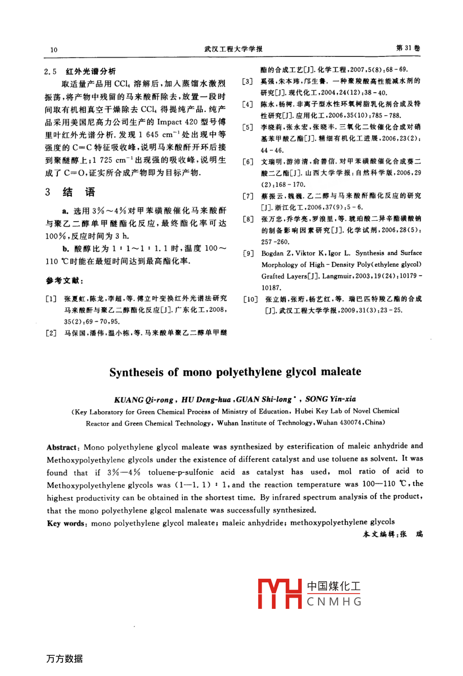 第31卷第12期武漢工程大學(xué)學(xué)報(bào)vo.31No.122009年12月J. Wuhan Inst. TechDec.2009文章編號(hào):1674-2869(2009)12-0008-03馬來(lái)酸聚乙二醇單甲醚單酯的合成匡啟榮,胡登華,官仕龍,宋銀霞(武漢工程大學(xué)綠色化工過(guò)程省部共建教育部重點(diǎn)實(shí)驗(yàn)室,湖北省新型反應(yīng)器與綠色化學(xué)工藝重點(diǎn)實(shí)驗(yàn)室,湖北武漢430074)摘要:用聚乙二醇單甲醚和馬來(lái)酸酐反應(yīng)合成了馬來(lái)酸聚乙二醇單甲醚單酯.研究了原料配比、催化劑種類(lèi)及用量、反應(yīng)時(shí)間、反應(yīng)溫度等對(duì)酯化率的影響結(jié)果表明:以3%~4%對(duì)甲苯磺酸為催化劑,馬來(lái)酸酐與聚乙二醇單甲醚的摩爾配比為1:1~1:1.1溫度為100~110℃時(shí)反應(yīng)能在短時(shí)間內(nèi)酯化完全,用紅外光譜對(duì)產(chǎn)物的結(jié)構(gòu)進(jìn)行了表征,證實(shí)合成產(chǎn)物即為目標(biāo)產(chǎn)物關(guān)鍵詞:聚乙二醇單甲醚;馬來(lái)酸單酯;馬來(lái)酸酐中圖分類(lèi)號(hào):TQ31文獻(xiàn)標(biāo)識(shí)碼:A前言產(chǎn)物的紅外光譜用美國(guó)尼高力公司生產(chǎn)的Impact420型號(hào)傅里葉紅外光譜儀測(cè)定馬來(lái)酸聚乙二醇單甲醚單酯是一種帶一個(gè)雙1.2合成步驟鍵和一個(gè)端羧基的兩親性聚合物,是合成許多化工在帶有回流冷凝管的三口瓶中,按一定配比產(chǎn)品的重要中間體和活性單體,廣泛應(yīng)用于涂料、粘加入馬來(lái)酸酐、聚乙二醇單甲醚、溶劑、催化劑,磁接劑造紙織物的浸漬劑、分散劑潤(rùn)滑劑、表面活力攪拌下升溫到110℃左右,反應(yīng)其間每隔0.5h性劑特別在聚羧酸混凝土減水劑方面,可作為聚羧取樣分析反應(yīng)體系的酸值,計(jì)算酯化率,當(dāng)酯化率酸混凝土減水劑合成的大單體2.作為涂料水性化達(dá)到要求時(shí),減壓蒸餾得到紅棕色的粘稠液體或重要中間體,也有廣泛的應(yīng)用前景,鑒于國(guó)內(nèi)對(duì)其者固體,即為所需產(chǎn)品研究不多,本實(shí)驗(yàn)對(duì)其合成工藝進(jìn)行了探討對(duì)醇酸1.3馬來(lái)酸酐酯化率的測(cè)定原料配比、催化劑種類(lèi)及用量、反應(yīng)溫度、反應(yīng)時(shí)間實(shí)驗(yàn)過(guò)程中每隔半小時(shí)準(zhǔn)確稱(chēng)取0.5~1g反應(yīng)等影響因素進(jìn)行了研究,合成路線如下混合物,用30mL無(wú)水乙醇溶解,用標(biāo)準(zhǔn)NaOH溶液滴定,測(cè)得其酸值.馬來(lái)酸酐酯化率由下式計(jì)算:CH4 toCH,Ch2+OH+O→2(N,N。)N。×100%其中:X—馬來(lái)酸酐酯化率;CHtoCH h, t oCCHCHCOOHN——初始時(shí)反應(yīng)混合物的酸值;N——t時(shí)刻反應(yīng)混合物酸值.1實(shí)驗(yàn)部分2結(jié)果與討論1.1原料與儀器聚乙二醇單甲醚(MPEG-400),工業(yè)級(jí),上海2.1不同種類(lèi)催化劑對(duì)酯化率的影響昊炅助劑有限公司生產(chǎn);馬來(lái)酸酐,分析純上海圖1是在100℃,醇酸比1:1,溶劑甲苯用量國(guó)藥集團(tuán)生產(chǎn);無(wú)水乙酸鈉,分析純,天津市凱通為醇酸總質(zhì)量25%時(shí),催化劑用量為反應(yīng)體系總化學(xué)試劑有限公司生產(chǎn);對(duì)甲苯磺酸,上海高新化質(zhì)量3%條件下,馬來(lái)酸酐酯化率變化曲線學(xué)試劑廠生產(chǎn);三乙胺,分析純,上海國(guó)藥集團(tuán)生無(wú)催化劑時(shí),反應(yīng)偏慢且最終酯化率不高產(chǎn);濃硫酸,分析純,上海國(guó)藥集團(tuán)生產(chǎn)5 h中國(guó)煤化工必要使用催化劑CNMHG收稿日期:2009-05-12作者簡(jiǎn)介:匡啟榮(1984-),男,江西吉安人,碩士研究生.研究方向:水性涂料指導(dǎo)老師:官仕龍,男,副教授碩土研究生導(dǎo)師研究方向:環(huán)保型精細(xì)化學(xué)品、助劑醫(yī)藥和農(nóng)藥中間體、功能高分子材料.“通信聯(lián)系人第12期匡啟榮,等:馬來(lái)酸聚乙二醇單甲醚單酯的合成用濃硫酸催化時(shí),隨著反應(yīng)進(jìn)行,酯化率先升高,磺酸用量較大,具有氧化性而發(fā)生了副反應(yīng)所以催化劑用量在3%~4%能達(dá)到最佳效果2.3酸醇比對(duì)酯化率的影響圖3是100℃下,對(duì)甲苯磺酸用量為4%時(shí)不同原料配比對(duì)馬來(lái)酸酐酯化率的曲線圖(馬來(lái)酸酐過(guò)量時(shí)為醇的轉(zhuǎn)化率),醇酸摩爾比小于1時(shí)會(huì)降低反應(yīng)體系中的反應(yīng)物聚乙二醇單甲醚和催化劑的濃度,使反應(yīng)偏慢,酯化率偏低;當(dāng)醇酸摩爾比過(guò)大時(shí),反應(yīng)生成一定量的雙酯,導(dǎo)致生成00.5單酯轉(zhuǎn)化率偏低,綜合考慮:醇酸摩爾比應(yīng)該在圖1催化劑對(duì)馬來(lái)酸酐酯化率的影響1:1~1:1.1之間比較適宜Fig 1 Effect of catalyst on esterification rate達(dá)到一定程度后下降,產(chǎn)品色澤不佳,最終酯化率不高,且設(shè)備腐蝕嚴(yán)重,有三廢排放,污染環(huán)境0無(wú)水乙酸鈉作催化劑時(shí),反應(yīng)時(shí)間長(zhǎng),且最終酯化率不高,放置一個(gè)月后有少量白色固體析出;三乙胺作催化劑時(shí),酯化率有波動(dòng),且最終酯化率不高;對(duì)甲苯磺酸是一種固體有機(jī)酸,具有高活性、對(duì)設(shè)備腐蝕小污染小等優(yōu)點(diǎn),同時(shí)沒(méi)有副反應(yīng)發(fā)生,在反應(yīng)3h酯化率達(dá)到100%.綜合比較,本實(shí)驗(yàn)選用對(duì)甲苯磺酸作催化劑圖3醇酸比對(duì)馬來(lái)酸酐酯化率的影響2.2催化劑用量對(duì)酯化率影響Fig 3 Effect o