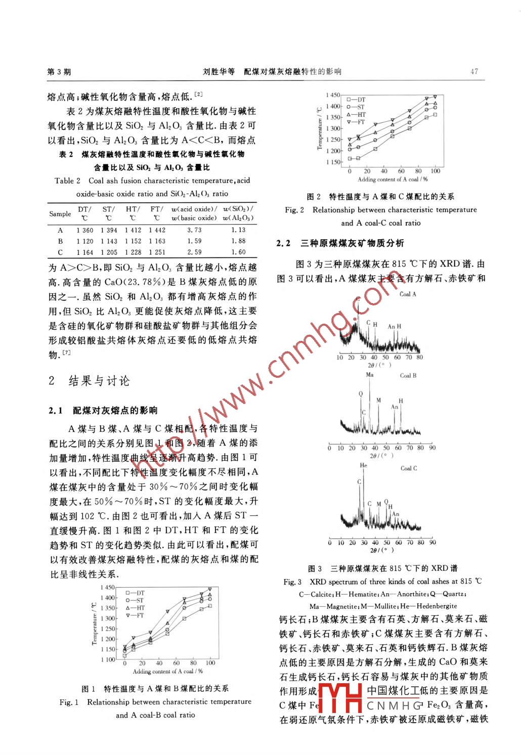 第37卷第3期某炭轉(zhuǎn)化Vol.37 No. 32014年7月.COAL CONVERSIONJul. 2014配煤對(duì)煤灰熔融特性的影響~劉勝華1)高娜)郭延紅3)楊倩l)摘要 以高灰熔點(diǎn)府谷煤(A)分別與低灰 熔點(diǎn)神木西溝煤(B)和神木河畔煤(C)按不同比例配比,用智能一體化馬弗爐制成灰,用JRHR-3型微機(jī)灰熔點(diǎn)測(cè)定儀測(cè)定其在弱還原性氣氛下的.熔融特征溫度,并利用XRD與CaO SiO2-Al2O3三元相圖分析配煤灰樣在不同溫度和不同配比下礦物組成的變化.結(jié)果表明,配煤可以有效改善煤灰熔融特性,配煤的灰熔點(diǎn)和煤的配比呈非線性關(guān)系;配煤的灰熔點(diǎn)變化主要是由于高溫下礦物質(zhì)的轉(zhuǎn)化.關(guān)鍵詞配煤,煤灰 ,熔融特性中圖分類號(hào)TQ533. 90.1 mm.用0.1 g/mL 糊精溶液,將研磨好的煤灰0引言調(diào)成可塑狀,再用小刀將其鏟人三角錐體的灰錐模中,制成灰錐,將灰錐模內(nèi)的灰錐推到玻璃板上,在神木煤是一種低灰、低硫、中高發(fā)熱量的優(yōu)質(zhì)動(dòng)空氣中干燥,然后用JRHR-3型微機(jī)灰熔點(diǎn)測(cè)定儀力煤,也是良好的氣化和液化用煤,其工業(yè)用途十分測(cè)定其灰熔點(diǎn).變形溫度(DT):灰錐頂端開(kāi)始變圓廣泛.但神木煤灰熔融溫度低,影響其廣泛利用,因或彎曲時(shí)的溫度.軟化溫度(ST):錐體彎曲,錐尖碰此,研究提高神木煤灰熔融溫度的方法具有重要現(xiàn)到托板,或變成球形時(shí)的溫度.半球溫度(HT):灰錐實(shí)意義.當(dāng)前,國(guó)內(nèi)外改善煤灰熔融特性常用兩種方變形至近似半球,即高度約等于底長(zhǎng)一半時(shí)的溫度.法:一.是配煤;二是使用添加劑.但使用添加劑改變流動(dòng)溫度(FT):灰錐熔化,展開(kāi),呈高度在1.5 mm以煤灰熔融特性在一定程度上會(huì)導(dǎo)致灰分含量增下薄層時(shí)的溫度.用XRD分析在不同溫度以及不加. [-5]據(jù)文獻(xiàn)[6]報(bào)道,在同樣反應(yīng)條件下,灰分增同配比下煤灰中礦物質(zhì)的變化..加1%,氧耗增加0. 7%~0.8%,煤耗增加1.3%~1.2煤樣1.5%,而通過(guò)配煤改善煤灰熔融特性在減少添加劑用量的同時(shí)提高了煤中碳含量,使燃燒爐或氣化爐本實(shí)驗(yàn)選用高灰熔點(diǎn)府谷煤(A)、低灰熔點(diǎn)神整體效率得到提高,促進(jìn)了煤炭資源的合理應(yīng)用.故木西溝煤(B)與神木河畔煤(C).用ICP-AES法定本實(shí)驗(yàn)采用配煤的方法研究其對(duì)煤灰熔融特性的量分析煤灰的成分,測(cè)得結(jié)果見(jiàn)表1.由表1可以看影響.出,煤灰成分有酸性氧化物和堿性氧化物,主要為表1三種煤灰的化學(xué)組成(%* )1實(shí)驗(yàn)部分Table 1 Chemical composition of three kindsof coal ashes(%")Sample SiOz Al2O3 Fe2O3 Ca0 MgO K:0 Naz2O SO31.1實(shí)驗(yàn)方法40.6735.995.105.57 2.51 5.01 0.24 0.51B 38.47 20.39 7.29 23.78 2.53 1.44 1.35 0.52將三種煤樣分別在JF-100顎式破碎機(jī)中粉碎,C 41.92 26.26 8.03 9.49 4.68 1.26 2.53 0.34再將其放于JF-100-1A密閉式制樣粉碎機(jī)中,使其* Mass fraction.成0.2 mm以下的微粒,將配比的煤粉放于JF-4-Fe2O3 ,CaO,MgO, K2O,Na2O, SiO2 ,Al2O3 ,還有少10AS高效節(jié)能一體智能馬弗爐中,在慢灰程序下量的SO3.A煤、B煤和C煤中分別含酸性氧化物灰化.把灰化好的煤灰在研缽中研磨至微粒小于76. 66%,58. 86%和68. 18%,酸性氧化物含量高,中國(guó)煤化工*陜西省教育廳重點(diǎn)實(shí)驗(yàn)室科研計(jì)劃項(xiàng)目(13JS123).1)碩士生;2)教授<通訊作者),延安大學(xué)化學(xué)化工學(xué)院,陜西省化學(xué)反應(yīng)工程重點(diǎn)實(shí)驗(yàn).MHCNM HG收稿日期:2013-09-09;修回日期:2013-12-10.第3期劉勝華等配煤對(duì)煤灰熔融特性的影響47熔點(diǎn)高;堿性氧化物含量高,熔點(diǎn)低. [2]14500-DT表2為煤灰熔融特性溫度和酸性氧化物與堿性1400 0-ST8口1350- A-HT氧化物含量比以及SiO2與Al2O3含量比.由表2可1 300-以看出,SiO2與Al2O3含量比為AC>B,即SiO2與Al2O,含量比越小,熔點(diǎn)越圖3為三種原煤煤灰在815 C下的XRD譜.由高.高含量的CaO(23. 78%)是B煤灰熔點(diǎn)低的原圖3可以看出,A煤煤灰主要含有方解石、赤鐵礦和因之一.雖然SiOr和Al2O3都有增高灰熔點(diǎn)的作Coal A用,但SiO2比Al2O3更能促使灰熔點(diǎn)降低,這主要是含硅的氧化礦物群和硅酸鹽礦物群與其他組分會(huì)CH AnH形成較鋁酸鹽共熔體灰熔點(diǎn)還要低的低熔點(diǎn)共熔Wwwwww物.[7]10203040506070802結(jié)果與討論Coal B2.1配煤對(duì) 灰熔點(diǎn)的影響A煤與B煤、A煤與C煤相配,各特性溫度與wwwww.配比之間的關(guān)系分別見(jiàn)圖1和圖2,隨著A煤的添δ102030405060708090加量增加,特性溫度曲線呈逐漸升高趨勢(shì).由圖1可01(° )以看出,不同配比下特性溫度變化幅度不盡相同,AHCoalC煤在煤灰中的含量處于30% ~ 70%之間時(shí)變化幅度最大,在50%~70%時(shí),ST的變化幅度最大,升幅達(dá)到102 C.由圖2也可看出,加入A煤后ST-直緩慢升高.圖1和圖2中DT,HT和FT的變化趨勢(shì)和ST的變化趨勢(shì)類似.由此可以看出,配煤可0102030405060708090以有效改善煤灰熔融特性,配煤的灰熔點(diǎn)和煤的配圖3三種原煤煤灰在815 C下的XRD譜比呈非線性關(guān)系.Fig.3 XRD spectrum of three kinds of coal ashes at 815 C1 450-C- Calcite;H- Hematite; An- Anorthite;Q- Quartz;0-5Ma- Magneite;M- Mllite;He- Hedenbergite鈣長(zhǎng)石;B煤煤灰主要含有石英、方解石、莫來(lái)石、磁E 1250-鐵礦、鈣長(zhǎng)石和赤鐵礦;C煤煤灰主要含有方解石、E 1200-1150-鈣長(zhǎng)石、赤鐵礦、莫來(l