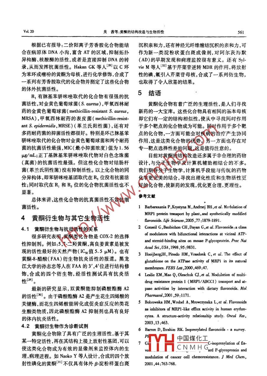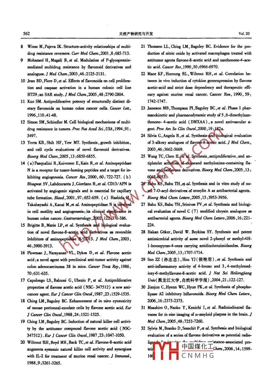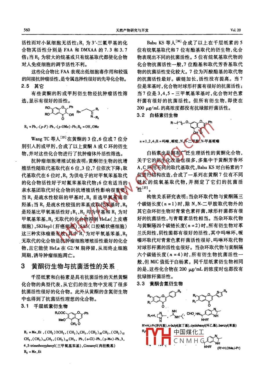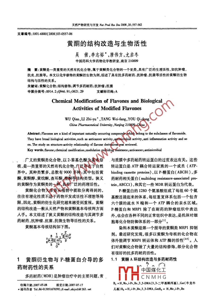 天然產(chǎn)物研究與開發(fā) Nat Prod Res Dev2008,20:557562文章編號:1001-6880(2008)03055706黃酮的結(jié)構(gòu)改造與生物活性吳茜,李志裕”,唐偉方,尤啟冬中國藥科大學藥物化學教研室南京21000摘要:黃酮是一類重要的天然有機化合物,屬于黃酮類化合物的一個亞類,具有廣泛的生理活性,如抗腫瘤,抗炎抗菌等。本文以化學修飾的黃酮衍生物為例綜述了具有抗多藥耐藥抗腫瘤抗菌等活性的黃酮衍生物結(jié)構(gòu)與活性的關(guān)系。關(guān)鍵詞:黃酮化合物;結(jié)構(gòu)修飾;調(diào)節(jié)多藥耐藥;抗腫瘤;抗菌圖分類號:B914.2;Q946.91:0621.29文獻標識碼:AChemical Modification of Flavones and biologicalActivities of modified flavonesWU Qian, LI Zhi-yu, TANG Wei-fang, YoU Qi-dongChina Pharmacetical University, Naniing 210009, ChinaAbstract: Flavones are a kind of important naturally occuring compounds, which belong to the subclasses of flavonoids.They have broad biological activities, such as anticancer activity, antimicrobial activity, anti inflammation activity and soon. The study on structure-activity relationship of Flavone derivatives was reviewedKey words: flavone; chemical modification modulation multidrug resistance; anticancer; antimicrobial廣義的黃酮類化合物,以2苯基色酮為基本母與質(zhì)膜中多藥耐藥轉(zhuǎn)運蛋白的過度表達有關(guān)。這些核,是一類重要的天然有機化合物,廣泛存在于自然轉(zhuǎn)運蛋白是ATP耦合轉(zhuǎn)運家族的一個成員(ATP界中。其種類繁多,總數(shù)有9000多種;其中包括黃 binding cassette proteins),以P糖蛋白(ABCB1),多酮,黃酮醇,黃烷酮,查耳酮橙酮等結(jié)構(gòu)類型。狹義藥耐藥相關(guān)蛋白( multidrug resistance- associated pro的黃酮作為黃酮類的一種,具有廣泛的藥理活性tein,ABCC1),和其它一些MDR轉(zhuǎn)運蛋白為代表黃酮化合物大多是從植物中提取分離得到的,P糖蛋白的1280個氨基酸組成了每組60個氨往往有理化性質(zhì)不適于藥物開發(fā)或活性不理想等局基酸連接起來的體系,每組重復(fù)體系包括一個包含限因此,黃酮的衍生化研究越來越受到重視。黃酮六個膜的疏水N端和一個ATP耦合的親水區(qū)域的結(jié)構(gòu)改造一般從天然產(chǎn)物和黃酮基本母核兩方面P糖蛋白和MRP1除了在耐藥的腫瘤組織中表達入手。本文綜述了狹義黃酮的結(jié)構(gòu)改造與其調(diào)節(jié)多外,也會在各種不同的正常組織中表達是機體對細藥耐藥,抗腫瘤、抗菌、抗微生物等活性的關(guān)系。胞毒化合物防御體系的一部分黃酮基本母核結(jié)構(gòu)如下圖染料木黃酮是第一個報導(dǎo)的黃酮類MRP抑制劑。最近研究發(fā)現(xiàn),很多以黃酮為母核的化合物在體外能調(diào)節(jié)MRA轉(zhuǎn)運體和ATP酶的活性2。人們對黃酮化合物做了大量的結(jié)構(gòu)修飾,部分化合物有很好的抗多藥耐藥活性。1黃酮衍生物與P-糖蛋白介導(dǎo)的多1.1黃酮A環(huán)結(jié)構(gòu)改造與多藥耐藥性藥耐藥性的關(guān)系中國煤化工多藥耐藥(MDR)是腫瘤治療中的主要問題,常CNMHG收稿日期:20070508接受日期:200707-17R1=H,Me,P,Bn,3,3DMA(3,3二甲基烯丙基),cer(牛龍牛通訊作者Tel:86013951678592;E-mail:zhiguli@263.net兒基)R2=H,iP,Bn,3,3-DMA,CerR3=H,Me,i-B,Bn天然產(chǎn)物研究與開發(fā)VoL 20根據(jù)P糖蛋白的底物多是疏水性的6,GilsComte等人(以白楊素為起始原料合成了以上一系2黃酮衍生物與抗腫瘤活性的關(guān)系列黃酮A環(huán)的單取代和雙取代衍生物,來考查這類很多黃酮類化合物都有抗腫瘤活性。隨著抗腫化合物取代基的位置及疏水性對P糖蛋白親和力瘤新靶點的發(fā)現(xiàn),對黃酮化合物進行了許多結(jié)構(gòu)改的影響。造。下面從不同的抗腫瘤靶點介紹黃酮的衍生化改研究表明,5位羥基及4位羰基對這類化合物造。模擬ATP的腺嘌呤部分是必需的,使化合物能夠與2.1活化半胱天冬酶( Caspase)誘導(dǎo)腫瘤細胞凋亡ATP和轉(zhuǎn)運蛋白的C端結(jié)合位點相互作用。Caspase蛋白家族在腫瘤細胞凋亡途徑中發(fā)揮6位,7位和8位單取代的化合物,取代基團越著不可替代的作用,活化 Caspase誘導(dǎo)腫瘤細胞凋大,疏水性越強則與P糖蛋白C端NBD2(核酸結(jié)合亡是腫瘤治療的一條新途徑區(qū))的體外結(jié)合越牢固。同時在6位,7位或8位有兩個取代或三個位置都有取代的化合物情況也如此。預(yù)示著烷基化能增強這類化合物與P糖蛋白C端NBD2結(jié)合位點的體外結(jié)合。但在化合物與整體P糖蛋白的結(jié)合實驗中,只R1=OH,oMe,O(3,3DMA)有6位或8位芐基單取代和3,3二甲基烯丙基單取B2=H,Me,Bn,1,1-DMA3,3DMA,Ca代的化合物與P糖蛋白的結(jié)合最牢。這可能歸因R3=0H,oMe,OB,0ca,0F于ATP位點的交疊以及化合物與P糖蛋白相互作BH,B,1,14DMA,33DM,La,L(沉香基),Nr(橙花叔醇用位點的移位。8.二甲基烯丙基白楊素抑制柔紅霉素藥物分子R,=H, OH, OMe; R =H, OH, OMe; R,=H, OMe細胞外排的作用最好,強于白楊素,是逆轉(zhuǎn)多藥耐藥Jean bD等人對黃酮的A環(huán)和B環(huán)進行結(jié)最好的調(diào)控劑。構(gòu)修飾,并在結(jié)腸癌細胞(HT29)中進行誘導(dǎo)1.2黃酮B環(huán)結(jié)構(gòu)改造與多藥耐藥性Caspase體外活性篩選。大多數(shù)化合物在培養(yǎng)6h后都能降低腫瘤細胞的存活壽命也能激活 Caspase但槲皮素和白楊素都沒能誘導(dǎo)腫瘤細胞凋亡,這與已有的文獻報導(dǎo)有R=Me et ph Bn. ac. co-ph沖突。白楊素的5位有戊二烯氧基取代時沒黃酮化合物的抗多藥耐