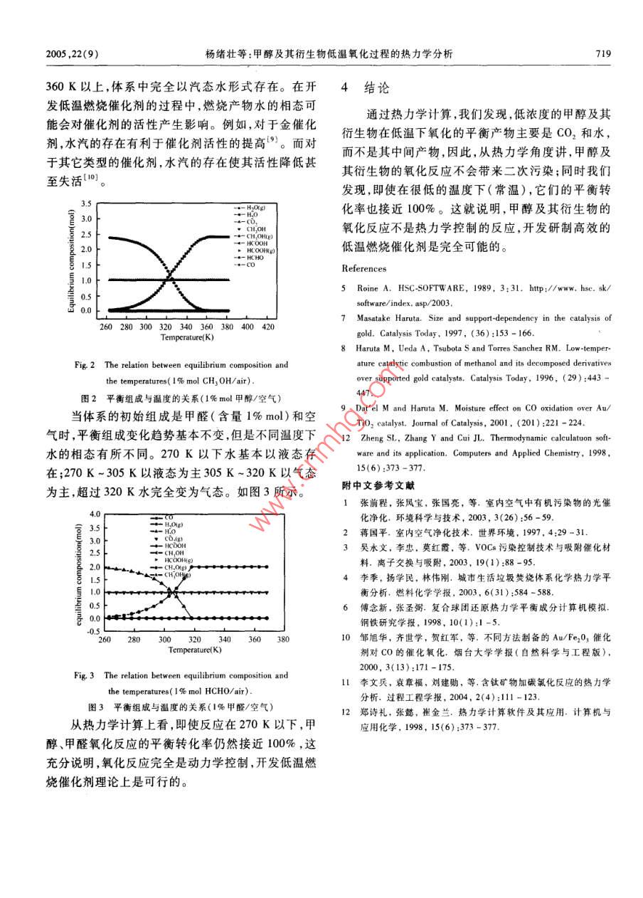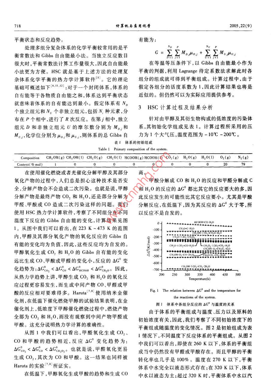 第22卷第9期針?biāo)銠C與座用化學(xué)2005年9月28日Computers and Applied ChemistrySeptember, 200甲醇及其衍生物低溫氧化過程的熱力學(xué)分析楊緒壯1,袁章福',沈岳年2(1.中國科學(xué)院過程工程研究所多相反應(yīng)開放實驗室,北京,100080;2,內(nèi)蒙古大學(xué)化學(xué)化工學(xué)院,內(nèi)蒙古,呼和浩特010020)摘要:利用HSC熱力學(xué)軟件對甲醇、甲醛、甲酸、O2、N2、CO3和H2O構(gòu)成的多元、多相體系進行了熱力學(xué)計算。從熱力學(xué)角度看,在較低的溫度下,甲醇、甲醛和甲酸更易被完全氧化成CO2和H2O而不是被部分氧化成其中間產(chǎn)物。同時,在270K溫度下,甲醇、甲醛的轉(zhuǎn)化率仍接近100%,因此,其氧化過程為動力學(xué)控制,使開發(fā)高效低溫催化燃燒催化劑成為可能。關(guān)鍵詞:甲醇;甲醛;熱力學(xué);平衡組分中圖分類號:TQ01.79文獻標(biāo)識碼:A文章編號:10014160(2005)09-717-719Thermodynamic analysis for the oxidation of methanol and its derivativesYANG XuZhuang", YUAN ZhangFu and SHEN YueNian(1. Key Laboratory of Multi-Phase Reaction, Institute of Process Engineering, CAS, Beijing, 1000802. Chemis-try and Chemical Engineering Institute, Inner Mongolia University, Huhehaote, 010020, Neimenggu, cIAbstract: Thermodynamic calculation for the multi-component, multi-phase system composed by methanol, formaldehyde, formicacid,O,, N,, CO, and H,0 is carried out using the HSC software. To the extent of thermodynamics, the oxidation reactions of methanol, formaldehyde and formic acid are all spontaneous. They can more easily be deep- oxidized to CO, and H, o than partially-oxidizedto their intermediates. The conversions of the methanol and formaldehyde are approached to 100% even under the temperature of270 K. Accordingly, the oxidation process is dynamically controlled. This makes it possible to develop a kind of high efficient low tem-Key words: methanol, formaldehyde, thermodynamies, equilibrium compositionYang XZ, Yuan ZF and Shen YN. Thermodynamic analysis for the oxidation of methanol and its derivatives. Com-puters and Applied Chemsitry, 2005, 22(9): 717-7191前言回收Vocs以外,通常采用燃燒銷毀的方法。由甲醇及其衍生物甲醛、甲酸是比較常見的揮發(fā)于催化燃燒或者光催化分解不需要或需要較少的外加能源,因而被廣泛采用。本文利用HSC計算軟件性有機物( volatile organic compounds,vOCs),這些對甲醇及其衍生物的氧化過程進行了熱力學(xué)計算,揮發(fā)性有機物可能產(chǎn)生于工業(yè)過程,也可能產(chǎn)生于得到了不同反應(yīng)溫度下的反應(yīng)趨勢以及平衡組成,家庭裝修過程。空氣中存在的ⅤOCs氣體給人類的對開發(fā)低溫燃燒催化劑消除空氣污染具有一定的指健康帶來危害。它們當(dāng)中有些是有毒的,有些能夠?qū)б饬x。誘發(fā)疾病、致癌或致畸。根據(jù)對我國部分建筑物室內(nèi)空氣污染水平的檢測數(shù)據(jù),新裝修后污染嚴(yán)重Gibbs自由能最小法的房間,室內(nèi)空氣中甲醛的峰值濃度能達到0.8~1對于多相、多組分體系的化學(xué)反應(yīng)過程,在一定gm2,超過國家標(biāo)準(zhǔn)限值10倍以上,個別甚至高的溫度、壓力和原始反應(yīng)物的條件下,將整個裝置看達5-10mg/m3。有文獻表明,室內(nèi)空氣的污染程作封閉的理想反應(yīng)體系,分析在此條件下體系達到度甚至是室外空氣的5-10倍2。惡劣的室內(nèi)空氣熱力學(xué)平衡狀態(tài)時各物質(zhì)的組成、濃度及聚集狀正在給人類的健康帶來嚴(yán)重危害。由于空氣中態(tài)。這種分析方法不考慮動力學(xué)的因素,也就是ⅤoCs的含量通常很低,除了采用吸附技術(shù)清除或不考慮反應(yīng)速率或反應(yīng)進行的時間,而只考慮最終收稿日期:20040906;修回日期:2004-1228基金資助:國家自然科學(xué)基金資助項目(20263001)718計算機與發(fā)用化學(xué)2005,22(9)平衡狀態(tài)和反應(yīng)趨勢。有能為處理多組分復(fù)雜體系的化學(xué)平衡較常用的是平衡常數(shù)法和 Gibbs自由能最小法。當(dāng)獨立反應(yīng)數(shù)目2M0,Ho+ 22MuHuJ很大時,平衡常數(shù)法計算工作量很大,因此自由能最在等溫等壓條件下,以 Gibbs自由能最小作為小法更為方便。HSC就是基于上述方法的處理復(fù)平衡的判據(jù),利用 Lagrange待定系數(shù)法求解此時各雜體系化學(xué)平衡的熱力學(xué)計算軟件。它的理論組分的組成就可得到平衡組成。計算過程中,由于基礎(chǔ)可概述如下6,112:對于一個封閉體系,體系的假定各組分的活度系數(shù)為1,因此計算結(jié)果也將是自有能等于各物質(zhì)自由能之和,體系達到平衡狀態(tài)近似的。但仍然可以為實際應(yīng)用提供參考。就意味著體系的自有能達到最小。假定體系有N個獨立組元和N個非獨立組元,包括N種元素,分3HSC計算過程及結(jié)果分析布在P個相中,進行了R次反應(yīng)。在第j相中,獨立針對由甲醇及其衍生物構(gòu)成的低濃度的污染體組元D和非獨立組元U的摩爾數(shù)分別為Mn和系,其初始化學(xué)組成見表1。計算過程所采用的壓M,化學(xué)位分別為H和,則體系的總Gibs自力為1個大氣壓,溫度范圍為-10℃-200℃。體系的初始組成Table 1 Primary composition of the systemComposition CH, OH( g)CH, OH(I)CH,O(g) CH, o(1)HCOOH( g)HCOOH(1)CO,(g)H,O(g)H,o(1) O2(g) N,(g)Content( mol在使用催化燃燒或者光催化分解甲醇及其部分高。氧化產(chǎn)物的過程中,人們總是擔(dān)心這種技術(shù)是否安甲酸分解成CO和H2O的反應(yīng)和甲醛分解成C全,分解產(ch