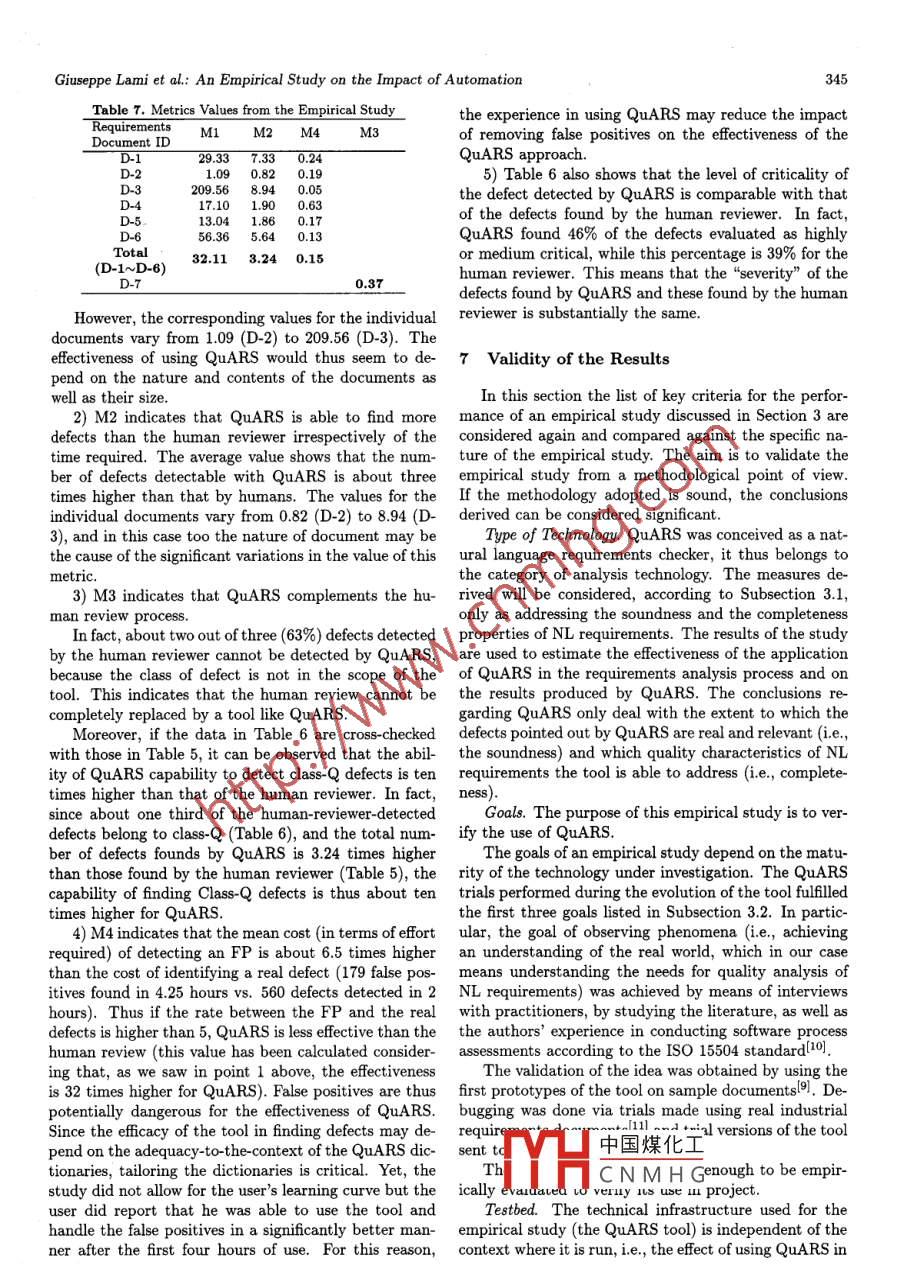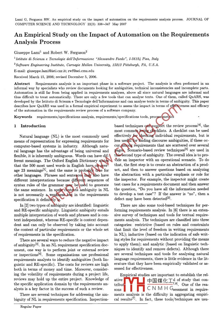 Lami G, Ferguson RW. An empirical study on the impact of automation on the requirements analysis process. JOURNAL OFCOMPUTER SCIENCE AND TECHNOLOGY 22(3): 338~347 May 2007An Empirical Study on the Impact of Automation on the RequirementsAnalysis ProcessGiuseppe Lamil and Robert W. Ferguson21 Istituto di Scienza e Tecnologie dllInformazione “Alessandro Faedo", 1-56124 Pisa, Italy2 Software Engineering Institute, Carnegie Mellon University, 15213 Pittsburgh, PA, U.S.A.E-mail: giuseppe.lami@isti.cnr.it; rwf@sei.cmu.eduReceived March 15, 2006; revised December 5, 2006.Abstract Requirements analysis is an important phase in a software project. The analysis is often performed in aninformal way by specialists who review documents looking for ambiguities, technical inconsistencies and incomplete parts.Automation is still far from being applied in requirements analyses, above all since natural languages are informal andthus dificult to treat automatically. There are only a few tools that can analyse texts. One of them, called QuARS, wasdeveloped by the Istituto di Scienza e Tecnologie dell'Informazione and can analyse texts in terms of ambiguity. This paperdescribes how QuARS was used in a formal empirical experiment to assess the impact in terms of effectiveness and eficacyof the automation in the requirements review process of a software company.Keywords requirements/specifcations analysis, requirements/specifcations tools, process metrics1 Introductionbased techniques can support the review process[4), themost common being checklists. A checklist can be usedNatural language (NL) is the most commonly used efectiveley for checking individual requirements, but ismeans of representation for expressing requirements for less useful for finding discourse ambiguities, if these 0C-computer-based systems in industry. Although natu- cur among requirements that are scattered over severalral language has the advantage of being universal andpages. Scenario-based review techniques5l are used inflexible, it is inherently ambiguous. Words can have dif- this second type of ambiguity. The overall idea is to pro-ferent meanings. The Oxford English Dictionary states vide an inspector with an operational scenario. To dothat the 500 most used words in English have on aver-that, the first step is to create an abstraction of a prod-age 23 meaningsl4l, and the same is probably true for uct, and then to answer questions based on analyzingother languages. Phrases and sentences may also have the abstraction with a particular emphasis or role fordifferent interpretations because different sequences ofthe inspector. For example, the inspectoir might createsyntax rules of the grammar may be used to generatetest cases for a requirements document and then answerthe same sentence. In some contexts ambiguity in NL the question,“Do you have all the infornation needed .is not necessarily a weakness but in the requirementsto develop a test case"? If the answer is“no”, then aspecification it definitely is.defect may have been detected|2].In [2] two types of ambiguity are identified: linguisticThere are also some tool-based techniques for per-and RE-specific ambiguity. Linguistic ambiguity entails forming requirements analysis. In [6] there is an exten-multiple interpretation of words and phrases and is con- sive survey of techniques and tools for textual require-text independent, whereas RE-specific is context depen- ments analysis. The techniques are classified into threedent and can only be observed by taking into account categories: restrictive (based on rules and constraintsthe context of particular requirements or the whole set that limit the level of freedom in writing requirementsof requirements in the specification.in NL); inductive (based on the indication of safe writ-There are several ways to reduce the negative impact ing styles for requirements without providing the meansof ambiguity3). In an NL requirement specification doc-to apply them); and analytic (based on linguistic tech-ument, one way is to perform joint or external reviewniques to identify and remove defects). Although thereor inspections因. Some organisations use professional are several techniques and tools for analysing naturalrequirements analysts to identify ambiguities (both lin- language requirements, there is ltte evidence in the lit-guistic and RE-specific). The costs for reviews are high erature that they have been empircally validated or as-both in terms of money and time. Moreover, consider- sessed for efectiveness.ing the volatility of requirements during a project life,Empirical studies are important to establish the rel-reviews may hold up the entire project. Knowledge of ative中國煤化工d of study that con-the specific application domain by the requirements an- tributOne of the rea-alysts is a key factor in the success of such a review.sonsYHC N M H Gessmnt in requireThere are several techniques for addressing the am- ments analysis is the dificulty in aggregating empri-biguity of NL in requirements specification. Inspection- cal resultsl7. In fact, these tools/ techniques are usu-Regular PaperGiuseppe Lami et al: An Empirical Study on the Impact of Automation339ally developed in a particular environment and the local●Quality indicators are specific descriptions of some-assumptions may preclude sound assessment or bench- thing that provide evidence either for or against themarking. Moreover, case studies with industrial part- existence of a specific quality characteristic or subners are important for showing that they are feasible, characteristic.as well as for confirming the value of case studies them-●Quality metrics provide numerical values by esti-selves.mating the quality of a work product or process by mea-In this paper we describe how an automatic linguisticsuring the degree to which it possesses a specific qualityanalysis tool, QuARS, has been used in a controlled and characteristic.rigorous empirical study. QuARS lexic
