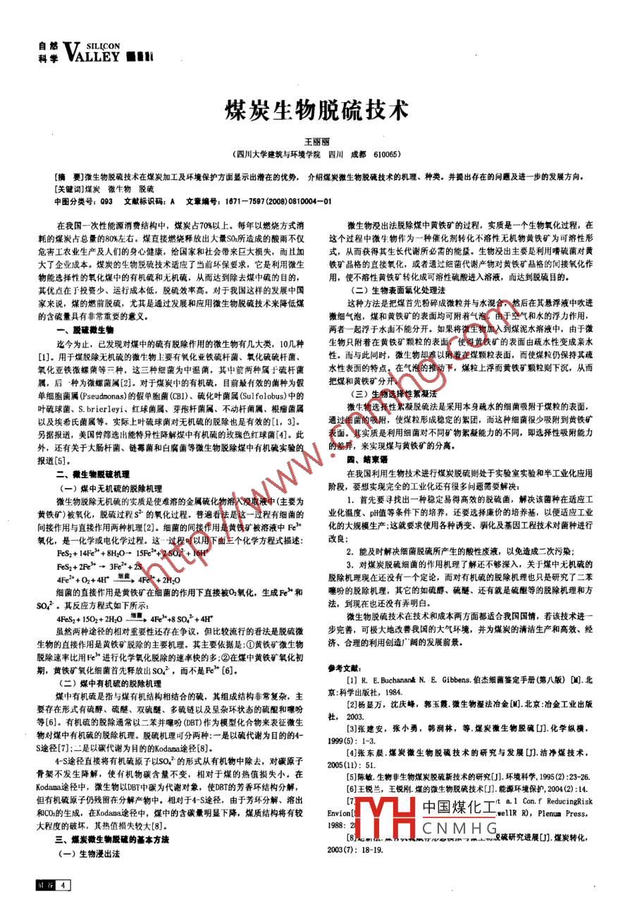 科學VAlley mm煤炭生物脫硫技術王麗麗(四川大學建筑與環(huán)境學院四川成都61006)[摘要]微生物脫硫技術在煤炭加工及環(huán)境保護方面顯示出潛在的優(yōu)勢,介紹煤炭微生 物脫硫技術的機理、種類.并提出存在的問題及進一步的發(fā)展方向。[關鍵詞]煤炭微牛物脫硫中圖分類號: 093文獻標識碼: A文章編號: 1071- -7597 (00)0810004-010在我國一次性能源消費結構中,煤炭占70%以上。每年以燃燒方式消微生物沒出法脫除煤中黃鐵礦的過程,實質是一一個生物氧化過程,在耗的煤炭占總量的80%左右。煤直接燃燒釋放出大量S0.所造成的酸雨不僅這個過程中微生物作為一種催化劑轉化不溶性無機物黃鐵礦為可溶性形危害工農業(yè)生產及人們的身心健康,給國家和社會帶來巨大損失,而且加式,從而獲得其生長代謝所必需的能量。生物浸出主要是利用晴硫菌對黃大了企業(yè)成本。煤炭的生物脫硫技術適應了當前環(huán)保要求,它是利用微生鐵礦晶格的直接氧化,或者通過細菌代謝產物對黃鐵礦晶格的間接氧化作物能選撣性的氧化煤中的有機硫和無機確,從而達到除去煤中硫的目的,用,使不落性黃鐵礦轉化成可溶性硫酸進入溶液,而達到脫硫目的。其優(yōu)點在于投資少、運行成本低,脫硫效率高。對于我國這樣的發(fā)展中國(=)生物表面氧化處理法家來說,煤的燃前脫硫,尤其是通過發(fā)展和應用微生物脫硫技術來降低煤這種方法是把煤首先粉碎成微粒并與水混合,然后在其懸浮液中吹進的含硫量具有非常重要的意義。微細氣泡,煤和黃鐵礦的表面均可附著氣泡。由于空氣和水的浮力作用,-脫硫擻生物兩者-起浮于水面不能分開。如果將微生物加入到煤泥水游液中,由于微迄今為止,已發(fā)現(xiàn)對煤中的硫有脫除作用的微生物有幾大類,10幾種生物只附著在黃鐵礦顆粒的表面,使得黃鐵礦的表面由疏水性變成親水[1].用于煤脫除無機硫的微生物上要有氧化亞鐵硫桿菌、氧化硫硫桿菌、性。而與此同時,微生物卻難以附著在煤顆粒表面,而使煤粒仍保持其疏氧化亞鐵微螺蘭等三種,這三種細菌為中溫蔭,其中前兩種屬f硫桿菌水性表面的特點。在氣泡的推動下,煤粒上浮而黃鐵礦顆粒則下沉,從而屬,后.種為微螺蘭屬[2].對于煤炭中的有機確,目前最有效的菌種為假把煤和黃鐵礦分開。單細胞菌屬(Pseudmonas)的假單胞菌(CBI).硫化葉菌屬(Sul folobus)中的(三)生物選擇性絮凝法葉硫球菌、s. brierleyi.紅球菌屬、芽孢桿蘭屬、不動桿菌屬、根瘤菌屬微生物選擇性絮凝脫碗法是采用本身疏水的細菌吸附于煤粒的表面,以及埃希氏菌屬等。實際上葉硫球蘭對無機硫的脫除也是有效的[1, 3]。通過細菌的吸附,使煤粒形成穩(wěn)定的繁團,而這種細菌很少吸附到黃鐵礦另據(jù)報道,美國曾篩選出能特異性降解煤中有機硫的玫瑰色紅球菌[4].此表面。其實質是利用細菌對不同礦物絮凝能力的不同,即選擇性吸附能力外,還有關于大腸桿菌、鏈霉菌和白腐菌等微生物脫除煤中有機硫實驗的的差異,來實現(xiàn)煤與黃鐵礦的分離。報道[5]。四、結柬語=、撒生物脫硫機理在我國利用生物技術進行煤炭脫硫則處于實驗室實驗和半工業(yè)化應用(一)煤中無機硫的脫除機理階段,要想實現(xiàn)完全的工業(yè)化還有很多問題需要解決:微生物脫除無機硫的實質是使難溶的金屬硫化物溶入沒取液中(主要為1.首先要尋找出一種穩(wěn)定易得高效的脫硫菌,解決該菌種在適應工黃鐵礦)被氧化,脫硫過程S4的氧化過程。普遍看法是這一 -過程有細 菌的業(yè)化溫度、pH值等條件下的培養(yǎng),還要選擇廉價的培養(yǎng)基,以便適應工業(yè)間接作用與直接作用兩種機理[2]。細菌的間接作用是黃鐵礦被溶液中Fet+化的大規(guī)模生產:這就要求使用各種誘變、駟化及基因工程技術對菌種進行氧化,是一化學或電化學過程。這-過程叮以用下面三個化學方程式描述:改良;Pes2+ 14Fe2+ 8H2O→15Pe*+2SO42 + 16H*2.能及時解決細菌脫硫所產生的酸性廢液,以免造成二次污染:FeS2+2FRe*- 3Ee*+2S3.對煤炭脫硫細菌的作用機理了解還不夠深入,關于煤中無機硫的4Fe* +O2+4H*細,4Fe* +2H2O脫除機理現(xiàn)在還沒有一個定 論,而對有機殖的脫除機理也只是研究了二苯細菌的直接作用是黃鐵礦在細菌的作用下直接被0氧化,生成Fe"* 和噻吩的脫除機理,其它的如硫脖、硫醚、還有就是硫能等的脫除機理和方so.* .其反應方程式如下所示:法,到現(xiàn)在也還沒有弄明白。4FeSs+ 1502+ 2H2O地惠, 4Fe*+8 so2+4H*微生物脫硫技術在技術和成本兩方面都適合我國國情,若該技術進一雖然兩種途徑的相對重要性還存在爭議,但比較流行的看法是脫硫微步完善,可極大地改善我國的大(環(huán)境, 井為煤炭的清潔生產和高效、經生物的直接作用是黃鐵礦脫除的主要機理。其主要依據(jù)是:①黃鐵礦微生物濟、合理的利用創(chuàng)造闊的發(fā)展前景。脫險速率比用Fe+*進行化學氧化脫除的速率快的多:②在煤中黃鐵礦氧化初期,黃鐵礦氧化細菌首先釋放山SO2 ,而不是Re' [6].參考文獻:(二)煤中有機硫的脫除機理[1] R. E. Buchanank N. E. Gibbens.伯杰細繭鑒定手冊(第八版) [I].北煤中有機硫是指與煤有機結構相結合的硫,其組成結構非常復雜,主京:科學出版社,[2]楊顯萬,沈慶峰,郭玉霞.微生物濕法冶金[0].北京:冶金工業(yè)出版要存在形式有硫醇、硫醚、雙硫醚、多硫鏈以及呈雜環(huán)