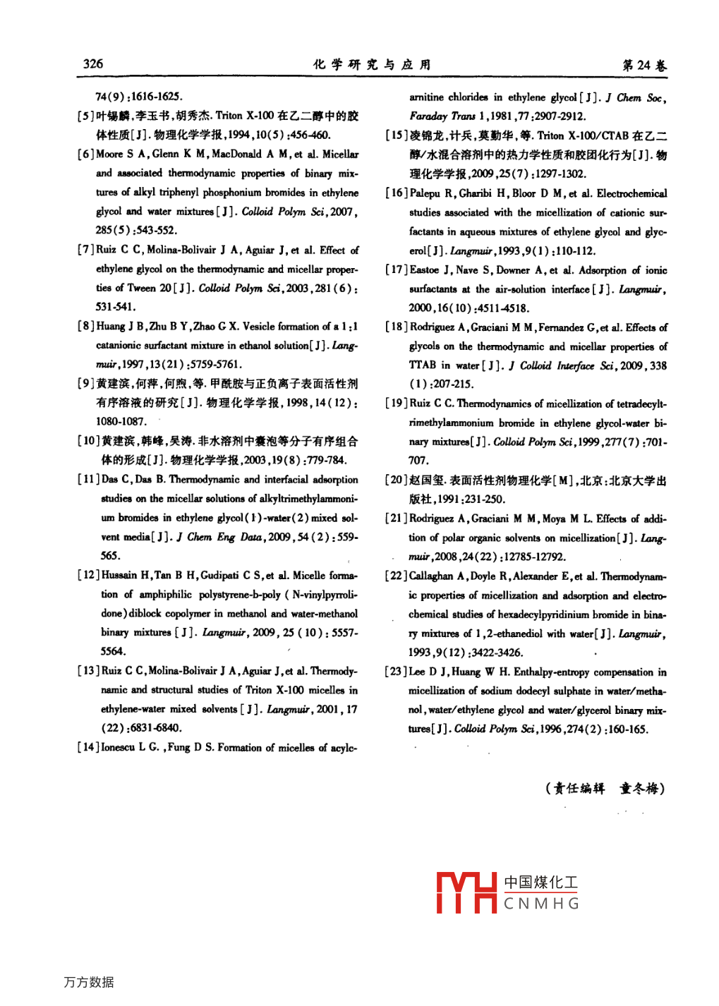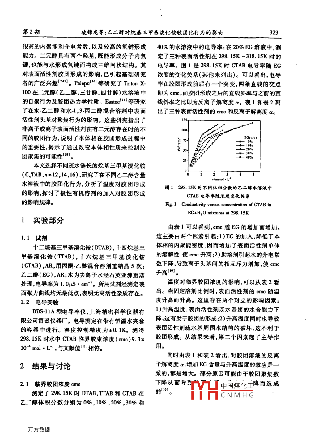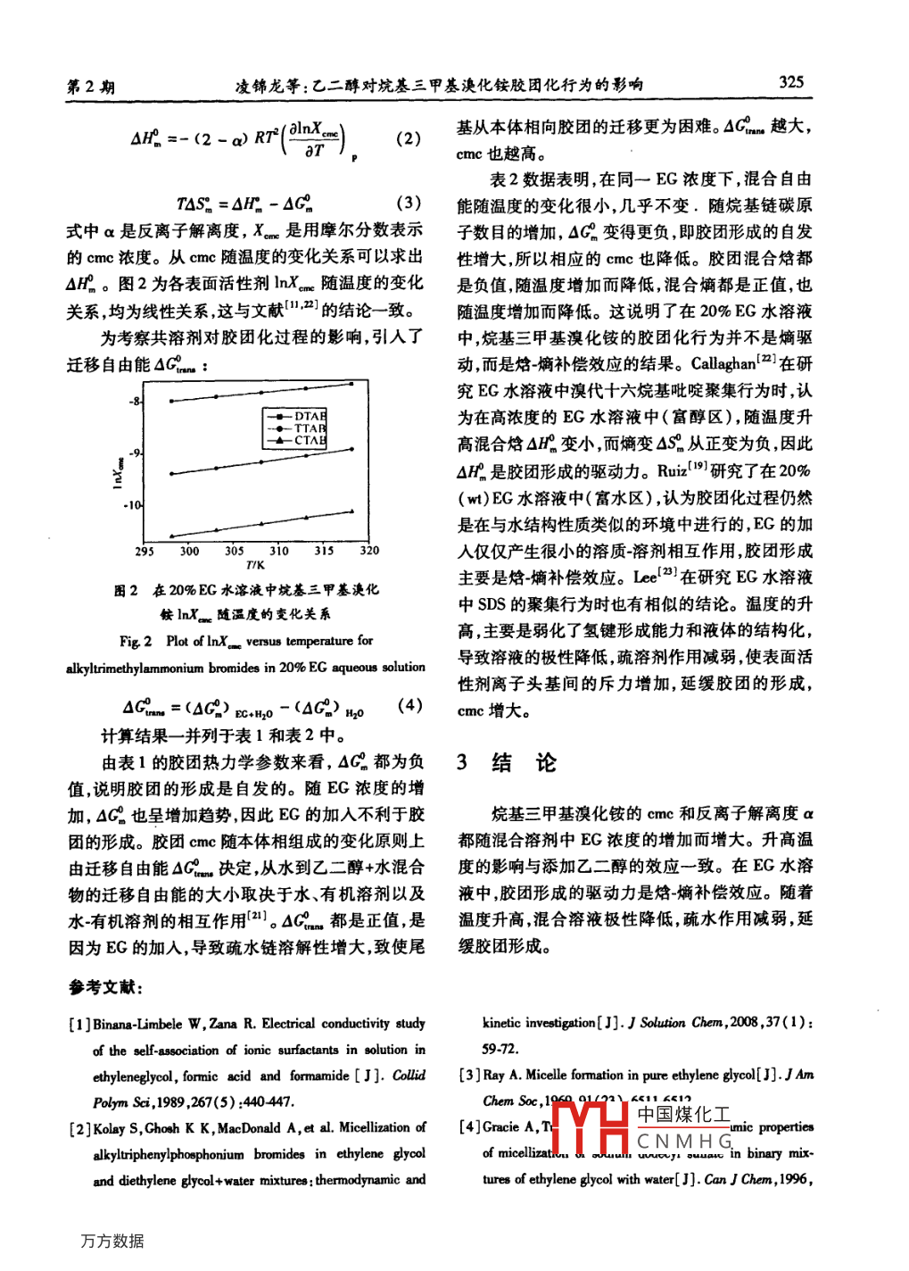第24卷第2期化學研究與應用Vol 24. No. 22012年2月Chemical reFeb.,2012文章編號:1004-1656(2012)02032205乙二醇對烷基三甲基溴化銨膠團化行為的影響凌錦龍,徐敏虹,洪迪,張艷(湖州師范學院生命科學學院浙江湖州313000摘要:利用電導法研究了烷基三甲基溴化銨表面活性劑(CTAB,n=12,14,16),即十二烷基三甲基溴化銨(DTAB),十四烷基三甲基溴化銨(TAB)和十六烷基三甲基溴化銨(CTAB)在混合極性溶劑乙二醇/水(體積分數(shù)0~40%)中的膠團化行為??疾炝藴囟葘δz團形成的影響,應用相分離模型估算了三個表面活性劑的膠團熱力學參數(shù)。結(jié)果表明臨界膠團濃度(cme)和反離子解離度(a)都隨乙二醇組分的增加而增大。在二醇/水混合溶劑中膠團形成的標準吉布斯自由能相差很小混合焓都是負值,而混合熵都為正值,說明熵補償效應在膠團形成中起主導作用。關(guān)鍵詞烷基三甲基溴化銨;乙二醇/水混合溶劑;臨界膠團濃度;膠團熱力學中圖分類號:06472文獻標識碼:AEffect of ethylene glycol on the micellization behavior ofalkyltrimethylammonium bromidesLING Jin-long, XU Min-hong, HONG Di, ZHANG Yan( Institute of Life Sciences, Huzhou Teachers College, Huzhou 313000, ChinaAbstract: The micellization behavior of alkyltrimethylammonium bromides, viz, dodecyl-, tetradecyl-and hexadecyltrimethylammonim bromide( DTAB, TTAB and CTAB, respectively )in ethylene glycol(EG ) and water mixtures with varying volume fraction of EG(o/o)has been investigated employing electrical conductivity. Temperature dependence of the critical micelle concentration( cmc)wEScellar thermodynamics of these systems. The phase separation model of micellar formation w.applied to obtain the thermodynamic parameters of micellization. It is showed that the cmc and the degree of counterion dissociation(a)increase with increasing content of EG in mixed solvent. There are small differences in the standard molar Gibbs free energies ofmicellization over the temperature range investigated. The enthalpy of micellization is negative in all cases, whereas the entropy is always positive. This behavior indicates that an enthalpy-entropy compensation effect is the goveming factor for micellization.Key words: alkyltrimethylammonium bromide; EG and water binary mixture; critical micelle concentration; micellar thermody在混合溶劑中研究表面活性劑的熱力學性途徑:1)與表面活性劑分子的相互作用,2)改變?nèi)苜|(zhì)有助于理解溶質(zhì)溶質(zhì)和溶質(zhì)溶劑的相互作劑的特性。改變?nèi)芤罕倔w相性質(zhì)最方便的辦法就表面活性劑膠束性質(zhì)主要由復雜的親水是添加有機溶劑。有機溶劑主要進入本體相而不和憎水間平衡所決定。而溶劑因素的影響有兩條參與膠團的形成這此右卻派加劑通常要求具有中國煤化工CNMHG收稿日期:20101128;修回日期:2011027聯(lián)系人簡介:凌錦龍(1964-)男副教授主要從事溶液熱力學和界面化學研究。 E-mail: lingiinlong@huc可第2期凌錦龍等:乙二醇對烷基三甲基決化銨膠團化行為的影響很高的內(nèi)聚能和介電常數(shù),以及較高的氫鍵形成40%的水溶液中的電導率;在20%EG溶液中測能力。二元醇具有兩個羥基,既能形成分子內(nèi)氫定了三種表面活性劑在29815K-31815K時的鍵,也能與水形成氫鍵而構(gòu)成三維網(wǎng)狀結(jié)構(gòu)。其電導率。圖1是298.15K時CTAB電導率隨EG對表面活性劑膠團形成的影響已引起基礎研究濃度的變化關(guān)系(其他未列出)??梢钥闯?電導者的廣泛興趣1。 Palepu1等研究了 Triton x.率在膠團形成前后有一個突變兩條直線的交點100在二元醇(乙二醇,三甘醇四甘醇)水溶液中即為cmc,而膠團形成之后的直線斜率與之前的直的自聚行為及膠團熱力學性質(zhì)。Easm等研究線斜率之比即為反離子解離度a。表1和表2列了在水乙二醇和水1,3-丙二醇混合溶劑中表面出了三種表面活性劑的cme和反離子解離度aa活性劑頭基對聚集行為的影響。這些研究指出了非離子或離子表面活性劑在有二元醇存在時的不同的膠團行為,說明了本體相在膠團形成過程中的重要性,揭示了通過改變本體相性質(zhì)來控制膠50團聚集的可能性1。本文選擇不同疏水鏈長的烷基三甲基溴化銨CTAB,n=12,14,16),研究了在不同乙二醇含量水溶液中的膠團化行為,分析了溫度對膠團形成圖1298.15K時不同體積分敷的乙二醇水溶液中的影響,探討了極性有機溶劑的加入對膠團形成CTAB電導率隨濃度變化關(guān)系的影響規(guī)律。Fig 1 Conductivity versus concentration of CTAB inEG+H,0 mixtures at 298 15K1實驗部分由表1可以看到,cm隨EG的增加而增加。1.1試劑這主要由兩個因素引起:1)EG的加入,降低了本十二烷基三甲基溴化銨(DTAB),十四烷基三體相的內(nèi)聚能密度因而增加了表面活性劑單體甲基溴化銨(TTAB),十六烷基三甲基溴化銨的溶解性,使cme升高2)助溶劑引起水的介電常(CTAB),AR,用丙酮乙醚混合溶劑重結(jié)晶5次;數(shù)下降導致離子頭基間的相互斥力增加,使cmc乙二醇(EG),AR;水為去離子水經(jīng)石英亞沸重蒸升高)。處理,電導率為10yS所用試劑經(jīng)測定表溫度對臨界膠團濃度的影響,可以從表2看面張力曲線均無最低點表明無高活性雜質(zhì)存在。出。當固定溶劑比例時表面活性劑的cmc隨溫1.2電導實驗度升高而升高。這里存在兩個對立的影響因素:D11A型電導率儀,上海精密科學儀器有)升高溫度,表面活性劑親水基團的水合能力下限公司雷磁儀器廠。電導測定在帶有恒溫水夾套降,這有助于膠團的形成:)升高溫度同時也導致的容器中進行。溫度控制精