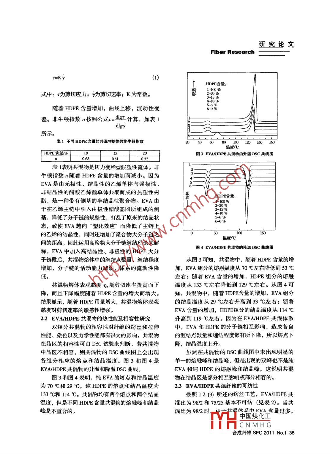 研究論文Fiber Research乙烯~-醋酸乙烯酯共聚物高密度聚乙烯的性能研究葉敏',王琳',文珍稀',王依民2(1.東華大學(xué)材料科學(xué)與工程學(xué)院,上海201620;2.纖維材料改性國家重點(diǎn)實(shí)驗(yàn)室,上海201620)摘要:討論了不同高密度聚乙烯(HDPE) 含量的乙烯-醋酸乙烯酯共聚物(EVA) /HDPE 共混物的流變性能、熱性能、相容性,以及共混纖維的可紡性、力學(xué)性能。實(shí)驗(yàn)結(jié)果表明:隨著HDPE含量的增加,共混物的流動(dòng)性變差;共混物的晶區(qū)是部分相容的。當(dāng)共混物中HDPE的百分含量為15 %時(shí),共混物的可紡性及共混纖維的力學(xué)性能最佳;隨著拉伸倍數(shù)的增加,共混纖維斷裂強(qiáng)度增大、斷裂伸長率降低。.關(guān)鍵詞:乙烯醋酸乙烯酯共聚物;高密度聚乙烯;流變性能;熱性能;相容性;可紡性;力學(xué)性能中圖分類號(hào): TQ342.61文獻(xiàn)標(biāo)識(shí)碼: A文章編號(hào): 1001-7054 (2011) 01-0033-05乙烯-醋酸乙烯酯共聚物(Ethylene -vinylac-俊榮等刃采用螺桿擠出熔融紡高密度聚乙烯,然etate copolymer,簡稱EVA)是由乙烯和醋酸乙烯后進(jìn)行高倍熱拉伸紡制中強(qiáng)聚乙烯纖維,隨著拉伸酯單體無規(guī)嵌段共聚而成,根據(jù)醋酸乙烯酯(VA)倍數(shù)的提高,纖維的斷裂強(qiáng)度提高,最高強(qiáng)度可達(dá)含量不同,聚合方法也不同。當(dāng)VA質(zhì)量含量低于8~10 cN/dtex,而纖維的斷裂伸長則隨拉伸倍數(shù)的40 %時(shí),采用高壓本體聚合;當(dāng)VA含量大于提高呈下降趨勢(shì)。40%小于80%時(shí),多采用中壓溶液聚合;當(dāng)VA本實(shí)驗(yàn)采用EVA/HDPE共混造粒及熔融紡絲,含量高于80 %時(shí),一般采用中壓乳液聚合(3。選擇HDPE主要是因?yàn)榭梢栽谔岣吖不炖w維的強(qiáng)度EVA具有優(yōu)良的柔韌性、彈性、透明性、黏著性、的同時(shí)兼顧到EVA的低熔點(diǎn)。EVA的熔點(diǎn)為70 C耐候性、耐化學(xué)藥品性、與填料和色母粒的相容左右,熔融紡絲溫度比- -般的高聚物要低得多,如性,可以通過注塑、擠塑、吹塑、涂覆、熱封等成果共混其它高聚物如PET、PP,則要求紡絲溫度遠(yuǎn)形加工,廣泛應(yīng)用于制鞋、農(nóng)膜、共混改性、汽車遠(yuǎn)高于EVA的紡絲溫度,這樣共混物的熔融紡絲工業(yè)和造紙等方面145。 但是EVA用于紡制纖維產(chǎn)的加工可行性低。品仍然很少,因?yàn)镋VA的纖維強(qiáng)度等指標(biāo)很低,本研究的目的是利用EVA低熔點(diǎn)及EVA對(duì)- -目前基本只有利用EVA聚合物制成的中空纖維膜些油性芳香物質(zhì)(如柏樹精油)基本可完全吸收,已廣泛用于醫(yī)療目的的各種分離膜,其在生物相容可進(jìn)一步研制其它智能溫控型、芳香型等功能纖性和化學(xué)穩(wěn)定性上極佳,并且洗脫物質(zhì)非常少,代維。如紡制智能溫控皮芯復(fù)合結(jié)構(gòu)纖維,其芯層為表性用途有血液透析過濾膜!@。低溫相變材料,由于低溫相變材料通常熔點(diǎn)和分解高密度聚乙烯(HDPE) 加工性能好,具有良點(diǎn)都較低,皮層材料的熔融紡絲溫度也要較低才能好的化學(xué)穩(wěn)定性,耐酸、堿、鹽等的腐蝕,質(zhì)量與之匹配,以防止在紡絲過程中芯層相變材料因溫輕,強(qiáng)度、模量高,已經(jīng)被應(yīng)用于紡織領(lǐng)域。于度過高而分解。有關(guān)研究將另作報(bào)道。收稿日期: 2010-10-121實(shí)驗(yàn)作者簡介:葉敏(1983-), 女,漢族,碩士研究生,研究方向?yàn)楹嘧儾牧系钠ば緩?fù)合結(jié)構(gòu)纖雛。中國煤化工MHCNMHG合成纖維SFC2011 No.1 33研究論文Fiber Research1.1 主要原材料乙烯-醋酸乙烯酯共聚樹脂(EVA 樹脂): VA2結(jié)果與討論含量28 %,熔融指數(shù)150 g/10 min,密度095 gcm',2.1不同HDPE含量對(duì)EVA/HDPE共混物流變性上?;ぱ芯吭?高密度聚乙烯(HDPE) 樹脂:能的影響密度0.941~0.960 g/cm',牌號(hào)2911FS,中國石油撫聚合物材料熔融態(tài)時(shí)的流變性能直接影響其順石化分公司;抗氧劑1010:工業(yè)級(jí),上海中山加工性能。高分子液體與小分子液體相比,最明顯化工市場(chǎng)。的區(qū)別是高分子具有黏彈性。高分子非牛頓黏彈性1.2共混物、共混纖維的制備產(chǎn)生于其分子鏈松弛動(dòng)力學(xué)滯后性。正是因?yàn)楦叻?1)真空干燥EVA, 30°C1h, 35C1h, 40C .子的本體黏彈性和本構(gòu)性質(zhì)直接支配聚合物的加工1h, 45°C1h, 52 C2.5h, 58C 11 h;真空干燥行為,所以高聚物加工的-個(gè)中心任務(wù)就是要對(duì)高HDPE,102.5C 16h。分子的流變行為取得根本的認(rèn)識(shí)和了解。(2)雙螺桿共混擠出機(jī)(TSE -18A,南京瑞亞高聚物的流變行為由黏度來表征。牛頓流體聚合物公司),I 區(qū)加熱溫度75 C,I區(qū)加熱溫度的黏度只與溫度有關(guān),高聚物大多數(shù)不是牛頓流100 C,I區(qū)加熱溫度130 C, IV 區(qū)加熱溫度150體,其黏度不僅與溫度有關(guān),還依賴于剪切速率。C,V區(qū)加熱溫度150 C,機(jī)頭加熱溫度135 C。圖1和圖2是不同HDPE含量的EVA/HDPE共混將按比例共混好的EVA、HDPE 和抗氧劑共混擠物熔體的應(yīng)力~剪切速率及表觀黏度~剪切速率流出,然后經(jīng)造粒機(jī)造粒。變曲線。(3)將(2)制備的共混粒料加入到雙螺桿熔融紡絲機(jī)(自制) 中進(jìn)行熔觸紡絲。HDPE含量:紡絲機(jī)各部位紡絲條件的設(shè)定:螺桿溫度I0 :巍薯區(qū)123C,I區(qū)145C,川區(qū)147C,IV區(qū)147品44C,V區(qū)145 C,計(jì)量泵溫度147 C,螺桿頻率42-