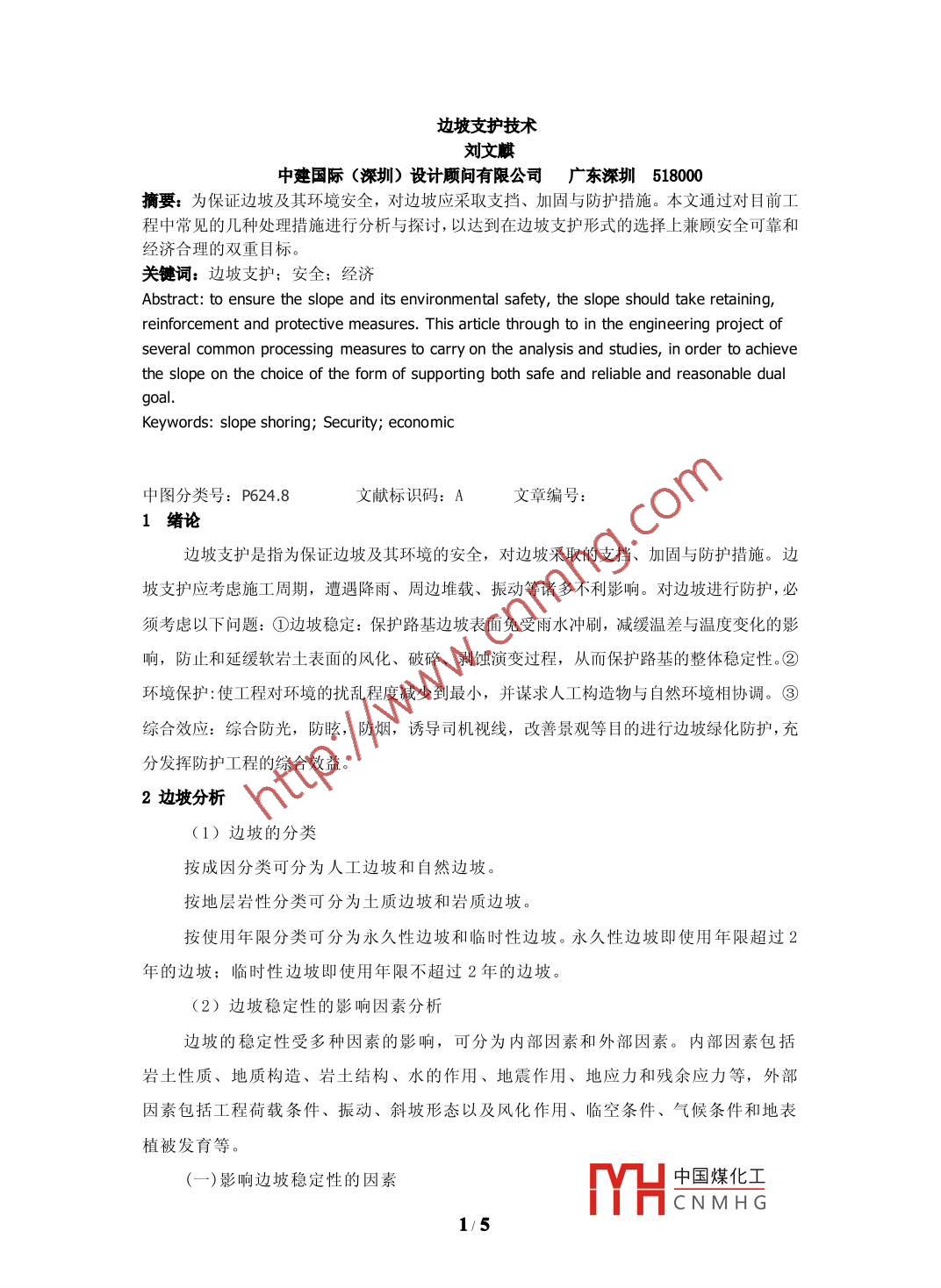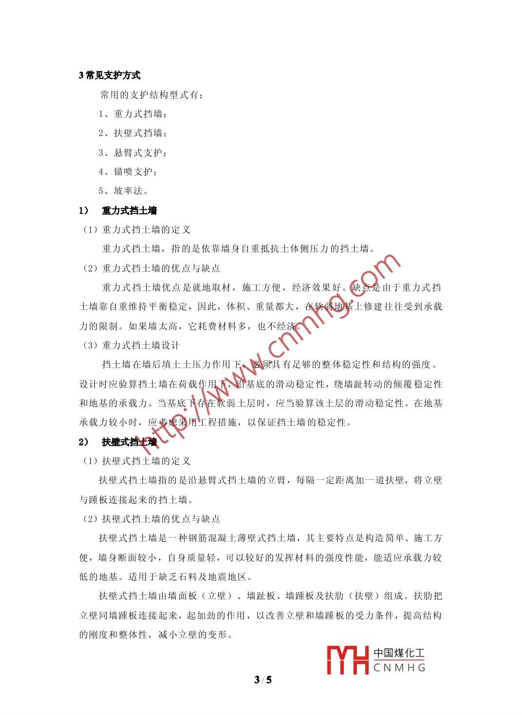 邊坡支護(hù)技術(shù)劉文麒中建國(guó)際(深圳)設(shè)計(jì)顧問(wèn)有限公司廣東深圳518000摘要:為保證邊坡及其環(huán)境安全,對(duì)邊坡應(yīng)采取支擋、加固與防護(hù)措施。本文通過(guò)對(duì)目前工程中常見的幾種處理措施進(jìn)行分析與探討,以達(dá)到在邊坡支護(hù)形式的選擇上兼顧安全可靠和經(jīng)濟(jì)合理的雙重目標(biāo)。關(guān)鍵詞:邊坡支護(hù);安全;經(jīng)濟(jì)Abstract: to ensure the slope and its environmental safety, the slope should take retaining, .reinforcement and protective measures. This article through to in the engineering project ofseveral common processing measures to carry on the analysis and studies, in order to achievethe slope on the choice of the form of supporting both safe and reliable and reasonable dualgoal.Keywords: slope shoring; Security; economic中圖分類號(hào): P624.8文獻(xiàn)標(biāo)識(shí)碼: A文章編號(hào):1緒論邊坡支護(hù)是指為保證邊坡及其環(huán)境的安全,對(duì)邊坡采取的支擋、加固與防護(hù)措施。邊坡支護(hù)應(yīng)考慮施工周期,遭遇降雨、周邊堆載、振動(dòng)等諸多不利影響。對(duì)邊坡進(jìn)行防護(hù),必須考慮以下問(wèn)題:①邊坡穩(wěn)定:保護(hù)路基邊坡表面免受雨水沖刷,減緩溫差與溫度變化的影響,防止和延緩軟巖土表面的風(fēng)化、破碎、剝蝕演變過(guò)程,從而保護(hù)路基的整體穩(wěn)定性。②環(huán)境保護(hù):使工程對(duì)環(huán)境的擾亂程度減少到最小,并謀求人工構(gòu)造物與自然環(huán)境相協(xié)調(diào)。③綜合效應(yīng):綜合防光,防眩,防煙,誘導(dǎo)司機(jī)視線,改善景觀等目的進(jìn)行邊坡綠化防護(hù),充分發(fā)揮防護(hù)工程的綜合效益。2邊坡分析(1)邊坡的分類.按成因分類可分為人工邊坡和自然邊坡。按地層巖性分類可分為土質(zhì)邊坡和巖質(zhì)邊坡。按使用年限分類可分為永久性邊坡和臨時(shí)性邊坡。永久性邊坡即使用年限超過(guò)2年的邊坡;臨時(shí)性邊坡即使用年限不超過(guò)2年的邊坡。(2)邊坡穩(wěn)定性的影響因素分析邊坡的穩(wěn)定性受多種因素的影響,可分為內(nèi)部因素和外部因素。內(nèi)部因素包括巖土性質(zhì)、地質(zhì)構(gòu)造、巖土結(jié)構(gòu)、水的作用、地震作用、地應(yīng)力和殘余應(yīng)力等,外部因素包括工程荷載條件、振動(dòng)、斜坡形態(tài)以及風(fēng)化作用、臨空條件、氣候條件和地表植被發(fā)育等。(一)影響邊坡穩(wěn)定性的因素中國(guó)煤化工MHCNMH G1/5a..巖土的性質(zhì):包括巖土的堅(jiān)硬(密實(shí))程度,抗風(fēng)化和抗軟化能力,抗剪強(qiáng)度,顆粒大小,形狀以及透水性能等。b.巖層結(jié)構(gòu)及構(gòu)造:包括節(jié)理,劈理、裂隙的發(fā)育程度及分度規(guī)律,結(jié)構(gòu)面膠結(jié)情況以及軟弱面,破碎帶的分布與斜坡的相互關(guān)系,下伏巖土面的形態(tài)和坡向、坡度等。c.水文地質(zhì)條件:地下水埋藏條件,流動(dòng)、潛蝕情況以及動(dòng)態(tài)變化等。.d.風(fēng)化作用:風(fēng)化作用對(duì)邊坡的影響為:風(fēng)化作用:使巖土的強(qiáng)度減弱,裂隙增加,影響邊坡形態(tài)和坡度,使地面水易于侵入,改變地下水的動(dòng)態(tài)等;沿裂隙風(fēng)化時(shí),可使巖土體脫落或沿邊坡崩塌、堆積、滑移等。e.氣候作用:巖土風(fēng)化速度、風(fēng)化層厚度以及巖石風(fēng)化后的機(jī)械變化和化學(xué)變化(礦物成分的改變),均與氣候有關(guān)。f.地震作用:地震作用除了巖土體受到地震加速度的作用而增加下滑力外,在地震作用下,巖土中的孔隙水壓力增加和巖土體強(qiáng)度降低都對(duì)邊坡的穩(wěn)定性不利。g.地貌因素:邊坡的高度、坡度和形態(tài)是影響斜坡穩(wěn)定性的重要因素。h.人為因素:邊坡不合理的設(shè)計(jì)、施工,大量外來(lái)水的滲入及爆破等都可能造成邊坡失穩(wěn)。(二)邊坡穩(wěn)定性因素的分析a.粘性土類邊坡:均一的粘性土類邊坡的穩(wěn)定性,主要決定于粘性土的性質(zhì)(狀態(tài)、濕化性、抗剪強(qiáng)度),地下水及地表水的活動(dòng)。當(dāng)為雙層或多層結(jié)構(gòu)時(shí),還決定于層面的性質(zhì)和軟弱夾層的分布情況。b.碎石類邊坡:其穩(wěn)定性取決于碎石粒徑大小和形狀,膠結(jié)情況和密實(shí)程度。c.黃土類邊坡:其穩(wěn)定性取決于土層的密實(shí)程度和地層年代、成因、不同時(shí)期黃土的接觸情況,地形地貌和水文地質(zhì)條件,黃土本身陷穴、裂隙發(fā)育程度。d.巖石類邊坡:其穩(wěn)定性主要取決于結(jié)構(gòu)面的性質(zhì)及其空間的組合,結(jié)構(gòu)體的性質(zhì)及其立體形式。(3)邊坡破壞的基本形式對(duì)于土質(zhì)邊坡,粘性土的破壞面基本.上為圓弧形,無(wú)粘性土的破壞面基本上為直線形。對(duì)于巖質(zhì)邊坡,多沿軟弱結(jié)構(gòu)面發(fā)生滑移,破壞面可分為直線形、折線形、楔形。對(duì)于較大規(guī)模的碎裂結(jié)構(gòu)巖質(zhì)邊坡,破壞面為圓弧形。如巖土界面與邊坡傾向一致時(shí),則可能發(fā)生沿界面的滑移。另外,還有巖土復(fù)合型滑動(dòng)、巖石崩落等。中國(guó)煤化工MHCNMH G2/53常見支護(hù)方式常用的支護(hù)結(jié)構(gòu)型式有:1、重力式擋墻;2、扶壁式擋墻;3、懸臂式支護(hù);4、錨噴支護(hù);5、坡率法。1)