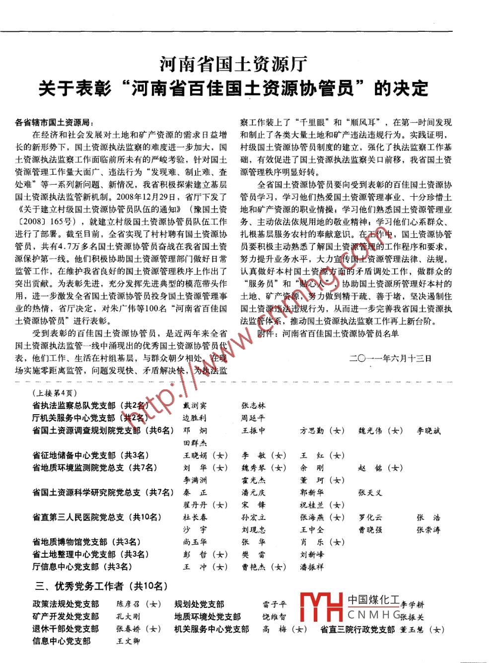 河南省國(guó)土資源廳關(guān)于表彰“河南省百佳國(guó)土資源協(xié)管員”的決定