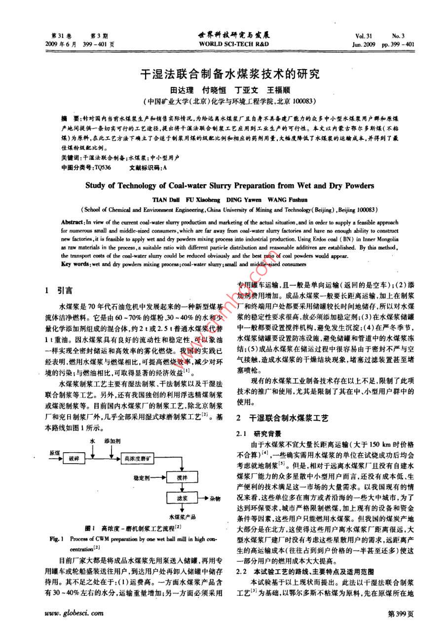 第31第3期世界科技研完與發(fā)展Vol, 31 No. 32000年6月399-401頁(yè)WORLD SCI-TECH R&DJumn.2009p.399401干濕法聯(lián)合制備水煤漿技術(shù)的研究田達(dá)理付曉恒丁亞文王福順(中國(guó)礦業(yè)大學(xué)(北京)化學(xué)與環(huán)境廠程學(xué)院,北京100083)摘要:針對(duì)國(guó)內(nèi)當(dāng)前水煤漿生產(chǎn)和銷(xiāo)售實(shí)際情況,為給遠(yuǎn)離水煤漿廠且自身不具備建廠能力的眾多中小型水煤漿用戶群和原煤產(chǎn)地間提供一條切實(shí)可行的工藝途徑,提出將干濕法聯(lián)合制漿工藝應(yīng)用到工業(yè)生產(chǎn)的可行性。本文以內(nèi)蒙古鄂爾多斯煤(不粘煤)為原料,在此工藝方法下確立了合適于制漿用煤的級(jí)配比例和相應(yīng)的藥劑用量,大幅度降低了水媒漿的遠(yuǎn)輸成本,并得到了最佳煤粉級(jí)配比例。關(guān)鍵詞:千濕法聯(lián)合制備;水煤漿;中小型用戶中圖分類(lèi)號(hào):TQ536文獻(xiàn)標(biāo)識(shí)碼:AStudy of Technology of Coal-water Slurry Preparation from Wet and Dry PowdersTIAN DaH FU Xiaoheng DING Yawen WANG Fushun( School of Chemical and Environment Engineering, China University of Mining and Technology Beijing), Beijing 100083)Abstract: In view of the current coal-water slurry production and marketing of the actual situation, and in order to supply a feasible approachfor numerous small and middie-gized consumers, which are far away from coal-water slurry factories and have no enough ability to constructnew factories, it is feasible to apply wet and dry powders mixing process into industrial production. Using Erdos coal( BN) in Inner Mongoliaas raw materials in the process, a suitable ratio with different particle distribution and reasonable additives are established. By this methodsport costs of the coal-water slurry could be reduced obviously and the best ratio of coal powders would appearKey words: wet and dry powders mixing process; coal-water slurry; small and middle-sized consumers引言專(zhuān)用罐車(chē)運(yùn)輸,且一般是單向運(yùn)輸(返回的是空車(chē));(2)添加劑費(fèi)用增加。成品水煤漿一般要長(zhǎng)距離運(yùn)輸,加上在制漿水煤漿是70年代石油危機(jī)中發(fā)展起來(lái)的一種新型煤基廠和終端用戶處都要采用儲(chǔ)罐較長(zhǎng)時(shí)間地儲(chǔ)存,所以對(duì)水煤流體潔凈燃料。它是由60-70%的煤粉、30~40%的水和少漿的穩(wěn)定性要求很高故必須添加穩(wěn)定劑;(3)在水煤漿儲(chǔ)罐量化學(xué)添加劑組成的混合體,約2t或2.5t普通水煤漿代替中一般都要設(shè)置攪拌機(jī)構(gòu)避免發(fā)生沉淀;(4)在嚴(yán)冬季節(jié),1t重油。因水煤漿具有良好的流動(dòng)性和穩(wěn)定性,可以象油水煤漿儲(chǔ)罐要設(shè)置防凍設(shè)施避免儲(chǔ)罐和管道中的水煤漿凍一樣實(shí)現(xiàn)全密封儲(chǔ)運(yùn)和高效率的霧化燃燒。我國(guó)的實(shí)踐已結(jié):(5)成品水煤漿在儲(chǔ)運(yùn)過(guò)程中很容易由于密封不嚴(yán)與空經(jīng)表明燃用水煤漿與燃煤相比,可提高燃燒效率,減少對(duì)環(huán)氣接觸,造成水煤漿的千燥結(jié)塊現(xiàn)象,堵塞過(guò)濾裝置甚至堵境的污染;與燃油相比,可取得顯著的經(jīng)濟(jì)效益1塞噴槍。水煤漿制漿工藝主要有濕法制漿、干法制漿以及干濕法現(xiàn)有的水煤漿工業(yè)制備技術(shù)存在以上不足,限制了此項(xiàng)聯(lián)合制漿等工藝。另外還有我國(guó)獨(dú)創(chuàng)的利用浮選精煤制漿技術(shù)的推廣和使用尤其是限制了其在中、小型用戶群中的或煤泥制漿等。目前國(guó)內(nèi)水煤漿廠的制漿工藝除北京制漿使用。廠和充日制漿廠外幾乎全部釆用濕式球磨制漿工藝?;?干濕聯(lián)合制水煤漿工藝本路線如圖1所示。2.1研究背景水添加劑由于水煤漿不宜大量長(zhǎng)距離運(yùn)輸(大于150km時(shí)價(jià)格高濃度磨礦不合算),一些確實(shí)需用水煤漿的單位在試燒成功后均會(huì)考慮就地制漿5。但是,相對(duì)于遠(yuǎn)離水煤漿廠且沒(méi)有自建水穩(wěn)定劑一煤漿廠能力的眾多星散中小型用戶而言,還沒(méi)有成本低、生產(chǎn)便利的技術(shù)滿足這一市場(chǎng)的大量需求。以我國(guó)現(xiàn)有的情濾漿→雜物況來(lái)看,這些單位多在南方或者沿海的一些大中城市為了達(dá)到環(huán)保要求城市嚴(yán)格限制燃煤,加上現(xiàn)有的設(shè)備和資金水煤漿產(chǎn)品條件等因素,這些用戶只能燃用水煤漿。但我國(guó)的煤炭產(chǎn)地圖1高濃度-磨機(jī)制漿工藝流程2大部分是在北方這使得這些用戶離水煤漿廠距離很遠(yuǎn),大Fig. 1 Process of CWM preparation by one wet ball mill in high con型水煤漿廠建廠時(shí)沒(méi)有考慮這些星散用戶的需求,遠(yuǎn)距離產(chǎn)centration (2生的高運(yùn)輸成本(往往占到到戶價(jià)格的一半甚至還多)使這目前廠家大都是將成品水煤漿先用泵送入儲(chǔ)罐再用專(zhuān)部分用戶的燃用成本大大提高。用罐車(chē)或輪船盛裝送往用戶,到達(dá)用戶處再卸入儲(chǔ)罐中儲(chǔ)存2.2本試驗(yàn)工藝的路線、主要特點(diǎn)及適用范圍待用。其不足之處在于:(1)運(yùn)費(fèi)高。一方面水煤漿產(chǎn)品含本試驗(yàn)基于以上現(xiàn)狀而提出。此法以干濕法聯(lián)合制漿有30~40%左右的水分,運(yùn)輸重量增加;另一方面必須采用工藝為基礎(chǔ)以鄂爾多斯不粘煤為原料,先在原煤所在地www.globesci第399頁(yè)化學(xué)化工世界科技研完與發(fā)