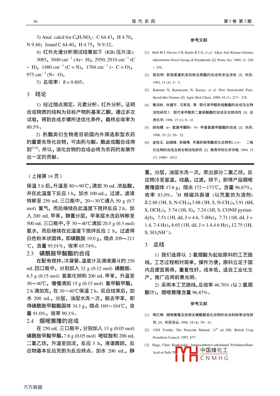 第5卷第3期現(xiàn)代農(nóng)藥Vol.5 No.32006年6月Modern AgrochemicalsJun 2006◆研究與開發(fā)◆煙嘧黃隆的合成李翔,王耀良,張海虹,朱新榮,朱長武(江蘇省農(nóng)藥研究所股份有限公司,南京210019)摘要:介紹了以2-氯煙酸為起始原料,經(jīng)過制備二甲基煙酰胺、磺酰胺以及酯化、縮合等7步反應(yīng)合成煙嘧黃隆的工藝路線,總收率46.70% (以2-氯煙酸計),原藥含量96%。關(guān)鍵詞:除草劑;煙嘧黃隆;合成中圖分類號: TQ 457.2+3文獻(xiàn)標(biāo)識碼: A文章編號: 1671-5284(2006)03-0013-02Synthesis of Fungicide NicosulfuronLI Xiang, WANG Yao-liang, ZHANG Hai-hong, ZHU Xin-rong, ZHU Chang-wu(Jiangsu Pesticide Research Institute Ltd Co., Nanjing 210019, China)Abstract: With the starting material of 2-chloropyridine-3-carboxylic acid, nicosulfuron was synthesized by seven steps .including amidization, esterification, condensation and so on. Its total yield was 46.70% (caculated as 2-chloropyridine-3-carboxylic acid) and the purity of product was 96%.Key words: herbicide; nicosulfuron; synthesis煙嘧黃隆是日本石原公司推出的-種新穎的2)煙嘧黃隆為芽后除草劑,施用時間靈活,可玉米田除草劑,通用名為nicosulfuron, 商品名在雜草生長較晚期施用。Accent。已在我國獲準(zhǔn)登記(PD 371-2001)。3)試驗(yàn)表明,煙嘧黃隆對玉米安全性很好,且化學(xué)名稱: 2-(4,6-二 甲氧基嘧啶2-基氨基甲酰對后茬作物無不利影響。氨基磺酰)-N,N-二甲基煙酰胺。4)使用后,玉米產(chǎn)量增長明顯。結(jié)構(gòu)式:5)推薦用量≤40 g ai/hm',大大低于現(xiàn)有的玉米田除草劑。,CON(CH3)2,OCH1合 成路線的選擇1-2]1.N~ SO,NHCONH-煙嘧黃隆的合成包括:OCH;a)中間體2- 氨基磺酰~N,N_二甲基煙酰胺(簡分子式: CisHs8N。O6S, 分子量: 410.41。稱磺酰胺)的合成;煙嘧黃隆主要用以防除玉米地雜草,有如下特b) 2- 氨基-4,6-二甲氧基嘧啶(簡稱嘧啶胺)和點(diǎn)-2:磺酰胺的縮合反應(yīng)。1)煙嘧黃隆是廣譜性除草劑,不僅對一年生禾1.1 中間體磺酰胺的合成本科雜草和闊葉雜草有極佳的防效,而且一次施此中間體合成路線主要有4條。這4條路線中,用,也能對多年生禾本科雜草如阿拉伯高粱和野麥從現(xiàn)有原料情況、合成工藝的難易、合成成本的高有防效。對玉米地的主要雜草,如馬唐、狗尾草、低及環(huán)保等幾方面考慮,路線D產(chǎn)率高,易于實(shí)現(xiàn)稗草、蒼耳、藜、莧龍葵等,防效可達(dá)90%~ 100%。工業(yè)化。收稿日期: 2005- 09- 16; 修回日期: 2005- 10- 31作者簡介:李翔(1967-), 男,江蘇鎮(zhèn)江人,高級工程師,多年從事農(nóng)藥合成工作。中國煤化工MHCNMH G.4現(xiàn)代農(nóng)藥第5卷第3期,CO2CH;,CO2CH,,CON(CH)2A.~cSO,NH+N^ SO,NH+,CO2H,CON(CH3)2~n~ ^cN SCH,CH,SO,NH,,CONHCH,C.clCICON(CH)2D.ClSxNaSO2Cl1.2磺酰胺和嘧啶胺的縮合C.氨基嘧啶在二氯乙烷中,三乙胺存在下,與此縮合反應(yīng)有3條路線:光氣反應(yīng),制成異氰酸酯,最后與磺酰胺反應(yīng)。A.通過嘧啶基氨基甲酸苯酯與磺酰胺進(jìn)行縮根據(jù)報導(dǎo),. 上述3種方法均有很高的收率,路合反應(yīng); .線B原料易得,對設(shè)備無特殊要求,易于工業(yè)化。B.磺酰胺制成氨基甲酸酯,再與氨基嘧啶反應(yīng);所以,選擇的總的合成路線為:,COCI+ SOCl,一- -so,cl +NH: H0→<-SO.NH2COCI2+ NH(CH3)2→→21; CON(CH3)2,CON(CH3)2 .6)-SO,NH, + ROCCI- SO,NHCOOR)l+ NaHS + NaOH~SH, OCH3+ HN-→煙嘧黃隆4)《> -SH+ H20+C2.-SO,CI\_ N SO,NHCOOR~OCH, .去蒸餾裝置,升溫至80~90°C,慢慢通入56g(1.252煙嘧黃隆的合 成}31mol)二甲胺氣體,通完后,繼續(xù)保溫30 min左右,2.1 2-氯-N,N-二甲基煙酰胺的合成冷至室溫,轉(zhuǎn)移至分液漏斗,水洗(100 mLX2)兩在配有攪拌、溫度計、回流冷凝管以及滴液漏次,脫溶,即得2-氯-N,N- =甲基煙酰胺固體178.8 g,斗的1 000 mL四口反應(yīng)瓶中,投入159 g(1 mol) 2-熔點(diǎn)70~72°C,含量98.01%,收率95.0%。氯煙酸以及500 mL甲苯溶劑和2g催化劑,升溫至2.2磺酰胺的合 成30"C左右,開始滴加150g (1.25 mol)氯化亞砜,一在100 mL三口瓶中,加入21 g (0.26 mol)硫氫般30 min左右滴完,然后30~50C保溫反應(yīng)2 h左化鈉、35 g (0.26 mol) 30%氫氧化鈉和23.3 g (0.12 mol)右,微負(fù)壓蒸去多余的氯化亞砜以及部分甲苯,撤2- 氯煙酰胺,中國煤化工轉(zhuǎn)第16頁)YHCNMHG.6現(xiàn)代農(nóng)藥第5卷第3期3) Anal. calcd for CsHNO2: C 64.43, H 4.70,參考文獻(xiàn)N 9.40; found C 64.40,H4.75, N 9.32。4)紅外光譜分析測試結(jié)果如下(KBr 壓片法):1] Bull M J, Davies J H, Searle R JG, etal. AlkyI Aryl Ketone Oximeo3085, 3040 cm- 1 (Ar- H), 2950, 2910 cm~ 1 (Cethers一- a Novel Group of Pyrethroids []. Pestic Sci, 1980, 11: 249- H),1480cm-' (C=N),1704 cm~'(- C=O),- 256.975 cm~ '(N- 0)。 .[2]程志明. 新型氨基肟類擬除蟲菊酯的合成和殺蟲活性[D]. 農(nóng)藥,5)總收率: δ=0.805。1992,31 (4):3- 5.[3] Katsurmi N, Katsuyama N, Kaciya, et al. New Insecticida Pyre-3結(jié)論throid-like Oximes [D]. Agric Biol Chem, 1980, 44 (1):217- 218.1)經(jīng)過熔點(diǎn)測定、元素分析、紅外分析,證明[4]黃潤秋, 孫建宇,馬軍安,等.取代苯甲醛肟羧酸酯的合成及生物合成物質(zhì)的結(jié)構(gòu)為目標(biāo)產(chǎn)物肟基苯乙酮,通過多次活性研究I.取代苯甲醛肟二氯菊酸酯的合成及生物活性[].應(yīng)試驗(yàn),得到合成步驟所述優(yōu)化條件,最終總收率為用化學(xué), 1998, 15(1):9- 12.80.5%。[5] 胡尚慧. a-氨基甲酮肟- N-甲基氨基甲酸酯的合成[]. 農(nóng)藥,2)肟酯類衍生物是目前國內(nèi)外篩選新型農(nóng)藥1996, 35 (2): 20- 22.的重要先導(dǎo)