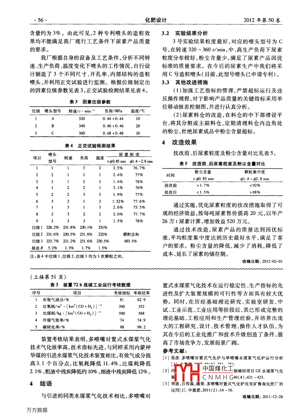 Apr.2012化肥設計第50卷第2期Chemical Fertilizer Design2012年4月多嘴對置式水煤漿氣化技術工業(yè)應用總結劉進波(山東兗礦國拓科技工程有限公司,山東滕州277527)中圖分類號:TQ545文獻標識碼:A文章編號:1004-8901(2012)02-0050-03多噴嘴對置式水煤漿氣化技術自從投入工業(yè)撞擊流股、回流區(qū)、折返流區(qū)和管流區(qū)組成。由于化應用以來,以其技術成熟可靠、碳轉化率高、消耗有撞擊流股的存在,增加了氣化爐內(nèi)物流混合交低、有效氣成分高、運行周期長、適于大型化等優(yōu)錯的機會,物料在氣化爐內(nèi)的運動軌跡曲折且迂勢,迅速成為煤氣化行業(yè)的主流技術之一,目前已回量比較大,氧、煤混合更加充分,有利于強化傳運行的裝置達到19套,在建或正在工程設計中的裝熱和傳質過程。物料在氣化爐內(nèi)停留時間比其置有53套。近期,其最大日處理煤量達到2000t他同類技術多2~3s,參與氣化反應時間更長,的氣化裝置,已通過國家權威部門2h連續(xù)工業(yè)運提高了碳的轉化率和單位氣化爐燃燒室容積的行考核。生產(chǎn)能力。撞擊區(qū)、撞擊流股、回流區(qū)、折返流區(qū)1工藝過程及特點的存在,更有利于促進煤焦、CH4等與H2O、CO2發(fā)生的氣化反應,生成CO和H2,提高有效氣成11工藝過程分的含量。多噴嘴對置式水煤漿氣化是氣流床氣化技術,12,2多噴嘴協(xié)同進料與撞擊霧化液態(tài)排渣,燃燒室平均溫度為1300~1400℃。多噴嘴的霧化性能是噴嘴最首要的性能指標噴嘴對置式水煤漿氣化技術工藝流程見圖1。由煤影響噴嘴霧化性能的主要因素是噴嘴的結構尺漿制備和輸送單元送來的合格煤漿,與空分來的氧寸,因為噴嘴的結構尺寸直接決定了氣液兩相的氣通過對置式布置的工藝噴嘴,進入爐內(nèi)進行混合接觸方式、接觸時間、接觸面積、出口液膜的厚度和反應,產(chǎn)生的髙溫煤氣和熔渣進入激冷室,進行射流速度。多噴嘴進料克服了單一噴嘴對進料量冷卻、除灰,送出氣化爐。煤氣初步凈化單元由混地限制,將物料均勻分配到4個燒嘴。噴嘴尺寸合器、旋風分離器、水洗塔組成,含渣水熱回收與除的大幅度減小,特別是中環(huán)煤漿通道尺寸的大幅渣單元采用蒸汽與返回灰水直接接觸工藝。度減小,有利于噴嘴的霧化操作,氧氣和煤漿的混一合成氣合效果更好。多噴嘴對置式的布局使物料進入燃煤漿冷凝液燒室后,通過對噴撞擊進一步混合,可促使反應更氧氣酸氣充分123噴淋床與鼓泡床結合灰水出氣化室的夾帶熔融態(tài)灰渣的高溫合成氣,在復合床結構的洗滌冷卻室內(nèi)完成合成氣的洗滌冷卻和熔渣的初步分離。洗滌冷卻室采用了噴淋床與鼓泡床相結合的技術,氣液兩相分布更加均勻圖1多噴嘴對置式水煤漿氣化技術工藝流程固體灰渣沉降效果更好,床層液面比較平穩(wěn),液位l—磨煤機;2一煤漿泵;3一氣化爐;4-鎖斗;5—混合器;6—旋風分容離器;7一水洗塔;8一蒸發(fā)熱水塔中國煤化宜大的氣液分離空間,氣仁1.2技術特點HCNMH改分離,不發(fā)生氣體的12.1獨有的氣化反應流場作者簡介:劉進波(1975年-),男,山東媵州人,1997年畢業(yè)于山東理工大學機械設計制造及自動化專業(yè),工程師,從事化工裝置生產(chǎn)對置式氣化爐的流場結構由射流區(qū)、撞擊區(qū)設備的技術管理等工作。第2期劉進波多噴嘴對置式水煤漿氣化技術工業(yè)應用總結帶水問題;氣液接觸更為充分,床層內(nèi)氣泡直徑在5對于產(chǎn)業(yè)鏈較長和生產(chǎn)裝置規(guī)模較大的工業(yè)裝置8mm,平均氣含率為0.3%~0.5%,保證了氣體尤為適用的冷卻與增濕,出口氣體中蒸汽完全能達到相截止目前,單爐連續(xù)運行時間最長為152天,平衡。部分裝置平均運行時間90天以上,其中江蘇靈谷124氣體分級凈化技術和江蘇索普分別采取以60天和75天定期倒爐的采用混合器、旋風分離器和水洗塔相結合的節(jié)操作模式,兗礦國泰兗礦魯化采取計劃停車更換能高效煤氣分級凈化系統(tǒng),對煤氣除塵效果更好。燒嘴,都沒有岀現(xiàn)因氣化系統(tǒng)故障影響系統(tǒng)運行同時,由于70%~80%的灰由旋風分離器除去,并的情況。氣化爐耐火磚的使用壽命長于其他水煤被直接送往黑水處理系統(tǒng),水洗塔內(nèi)的黑水含固量漿氣化技術,其中拱頂磚使用壽命已超過14000h,降低,不易堵塞管道和激冷環(huán),保證運行期間的洗渣口耐火磚使用壽命最長18200h,平均使用壽命滌冷卻水量不會降低。在7000h以上,其他位置耐火磚使用壽命平均為125渣水處理系統(tǒng)的改進25000h以上,最長為30000h。渣水熱回收與除灰單元核心設備是蒸發(fā)熱水3.2工藝指標塔,采用蒸汽與返回灰水直接接觸工藝,具有灰水對已運行的不同規(guī)模的裝置生產(chǎn)指標進行分溫度髙、蒸汽利用充分、耐堵渣、節(jié)能、運行周期長析,并與引進的技術進行對比,多噴嘴對置式水煤等特點,與采用閃蒸器和換熱器結合的工藝流程相漿氣化技術在碳轉化率、有效氣成分、渣中殘?zhí)亢?運行周期更長,檢修更方便。量、比氧耗、比煤耗等方面均有較大優(yōu)勢。運行情況對比見表22應用現(xiàn)狀表2運行情況對比多噴嘴對置式水煤漿氣化技術作為擁有我國碳轉化率比氧耗m3·比煤耗/kg·有效氣粗渣完全自主知識產(chǎn)權的第1套大型煤氣化技術,自技術2005年投入工業(yè)化運行以來,很快得到市場認可,多玻嘴水華魯恒升9.881m(0+