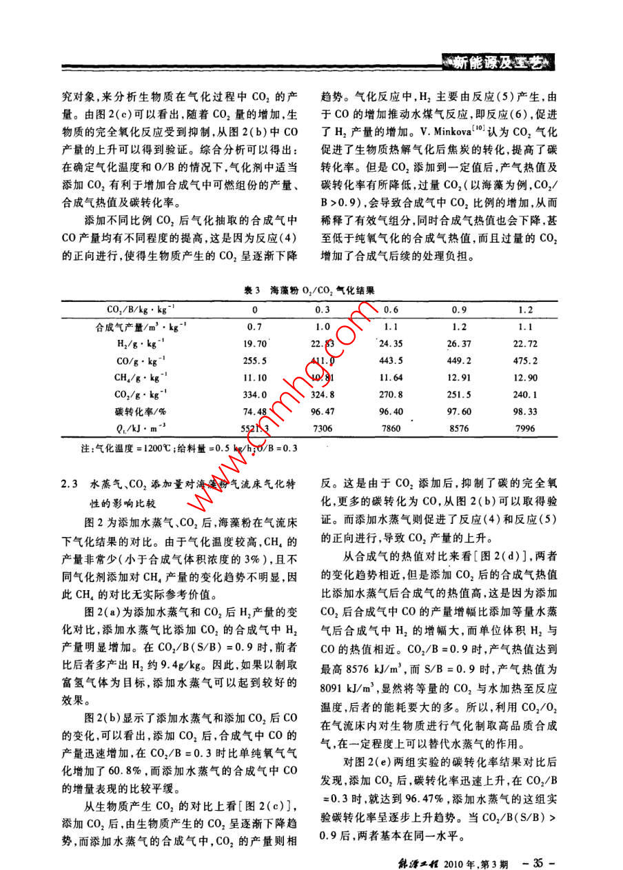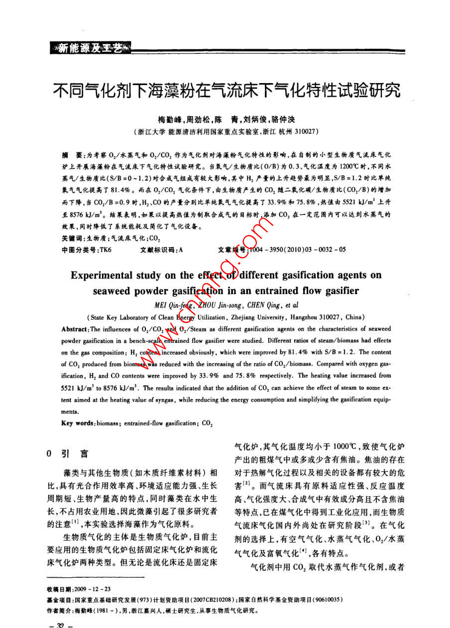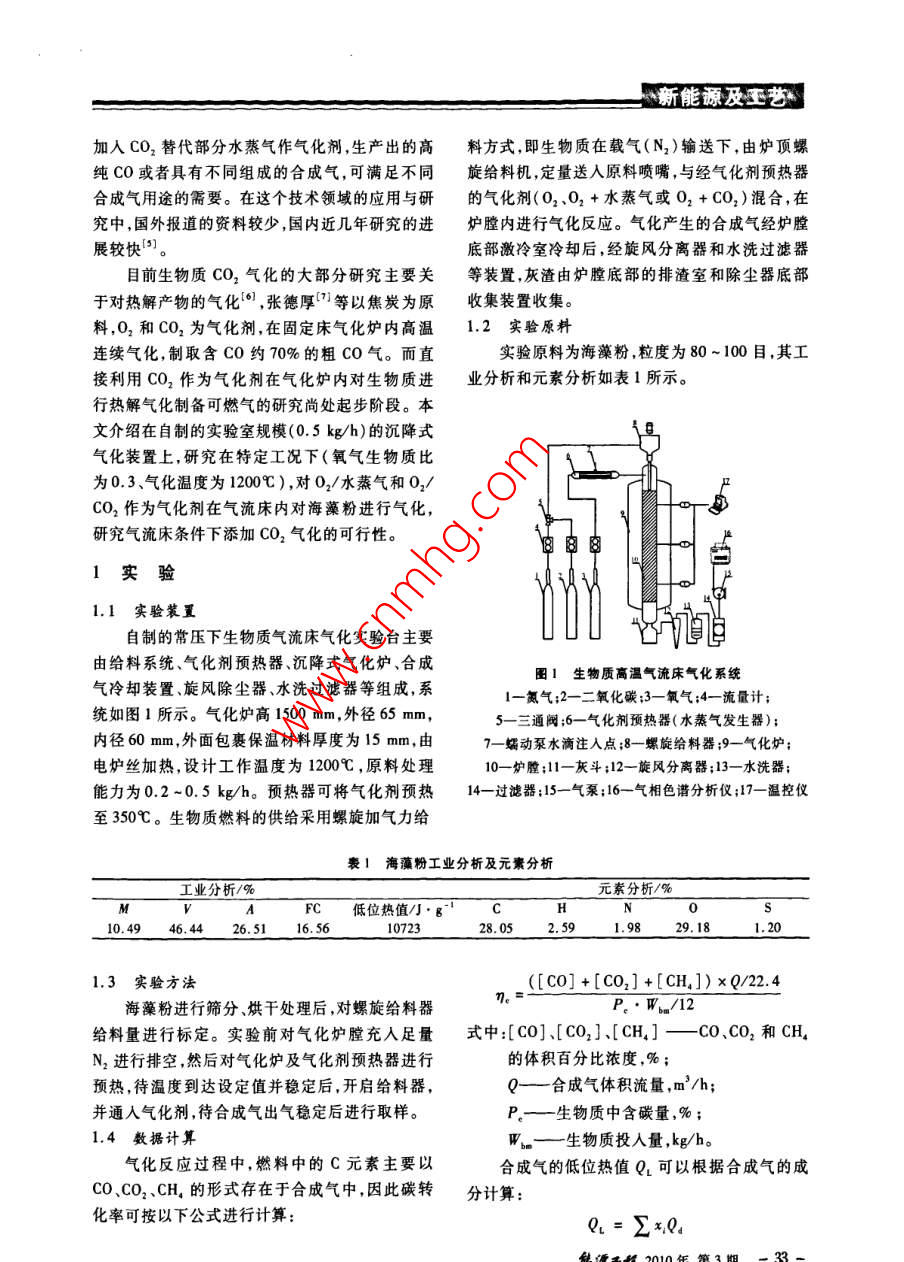 新能源及王藝不同氣化劑下海藻粉在氣流床下氣氣化特性試驗(yàn)研究梅勤峰,周勁松,陳青,劉炳俊 ,駱仲泱(浙江大學(xué)能源清潔利用國(guó)家重點(diǎn)實(shí)驗(yàn)室,浙江杭州310027)摘要:為考察02/水蒸氣和02/CO2作為氣化劑對(duì)海藻粉氣化特性的影響,在自制的小型生物質(zhì)氣流床氣化爐上開(kāi)展海藻粉在氣流床下氣化特性試驗(yàn)研究。當(dāng)氧氣/生物質(zhì)比(0/B)為 0.3、氣化溫度為1200C時(shí)。不同水蒸氣/生物質(zhì)比(S/B=0~1.2)對(duì)合成氣組成有較大影響,其中H,產(chǎn)量的上升趨勢(shì)最為明顯,S/B=1.2時(shí)比單純氧氣氣化提高了81.4%。而在0,/C0,氣化條件下,由生物質(zhì)產(chǎn)生的CO,隨二氧化碳/生物質(zhì)比(CO2/B)的增加而下降,當(dāng)CO/B=0.9時(shí),H2、CO的產(chǎn)量分別比單純氧氣氣化提高了33.9%和75.8% ,熱值由5521 kJ/m'上升至8576 kUJ/m’。結(jié)果表明,如果以提高熱值為制取合成氣的目標(biāo)時(shí),添加CO,在一定范圍內(nèi)可以達(dá)到水蒸氣的效果,同時(shí)降低了系統(tǒng)能耗及簡(jiǎn)化了氣化設(shè)備。關(guān)鍵詞:生物質(zhì);氣流床氣化;CO2中圖分類號(hào):TK6文獻(xiàn)標(biāo)識(shí)碼:A .文章編號(hào):1004 - 3950( 2010)03 - 0032 -05Experimental study on the effect of different gasification agents onseaweed powder gasification in an entrained flow gasifierMEI Qin-feng, ZHOU Jin-ong, CHEN Qing, et al(State Key Laboratory of Clean Energy Utilization , Zhejiang University, Hangzhou 310027,China)Abstract: The influences of 02/CO2 and 02/Steam as diferent gasification agents on the characteristics of seaweedpowder gaifcation in a bench-scale entrained flow gasifier were studied. Different ratios of steam/ biomass had eeeteson the gas composition: H, content increased obviously, which were improved by 81.4% with S/B= 1.2. The contentof CO2 produced from biomass was reduced with the increasing of the ratio of co2/biomass. Compared with oxygen gas-ification, H, and CO contents were improved by 33. 9% and 75. 8% respectively. The heating value inereased from5521 kJ/m' to 8576 kJ/m' . The resultse indieated that the addition of CO2 can achieve the efeet of steam to some ex-tent aimed at the heating value of syngas, while reducing the energy consumption and Bimplifying the gasification equip-ments.Key words: biomass; entrained-flow gasification; CO2氣化爐,其氣化溫度均小于1000C,致使氣化爐0引言產(chǎn)出的粗煤氣中或多或少含有焦油。焦油的存在藻類與其他生物質(zhì)(如木質(zhì)纖維素材料)相對(duì)于熱解氣化過(guò)程以及相關(guān)的設(shè)備都有較大的危比,具有光合作用效率高、環(huán)境適應(yīng)能力強(qiáng)、生長(zhǎng)害]。而氣流床具有原料適應(yīng)性強(qiáng)、反應(yīng)溫度周期短、生物產(chǎn)量高的特點(diǎn),同時(shí)藻類在水中生高、氣化強(qiáng)度大、合成氣中有效成分高且不含焦油長(zhǎng),不占用農(nóng)業(yè)用地,因此微藻引起了很多研究者等特點(diǎn),已在煤氣化中得到工業(yè)化應(yīng)用,而生物質(zhì)的注意",本實(shí)驗(yàn)選擇海藻作為氣化原料。氣流床氣化國(guó)內(nèi)外尚處在研究階段鬥。在氣化生物質(zhì)氣化的主體是生物質(zhì)氣化爐,目前主劑的選擇上,有空氣氣化、水蒸氣氣化、O2/水蒸要應(yīng)用的生物質(zhì)氣化爐包括固定床氣化爐和流化氣氣化及富氧氣化”,各有特點(diǎn)。床氣化爐兩種類型。但無(wú)論是流化床還是固定床氣化劑中用CO2取代水蒸氣作氣化劑,或者收稿日期:2009-12-23基金項(xiàng)目:國(guó)家重點(diǎn)基礎(chǔ)研究發(fā)展(973)計(jì)劃資助項(xiàng)目(2007CB210208);國(guó)家自然科學(xué)基金資助項(xiàng)目(90610035)作者簡(jiǎn)介:梅勤峰(1981-).男,浙江嘉興人,碩士研究生.從事生物質(zhì)氣化研究。新能源及玉藝加入CO,替代部分水蒸氣作氣化劑,生產(chǎn)出的高料方式,即生物質(zhì)在載氣(N2)輸送下,由爐頂螺純Co或者具有不同組成的合成氣,可滿足不同旋給料機(jī),定量送人原料噴嘴,與經(jīng)氣化劑預(yù)熱器合成氣用途的需要。在這個(gè)技術(shù)領(lǐng)域的應(yīng)用與研的氣化劑(02、02 +水蒸氣或O2 +CO2)混合,在究中,國(guó)外報(bào)道的資料較少,國(guó)內(nèi)近幾年研究的進(jìn)爐膛內(nèi)進(jìn)行氣化反應(yīng)。氣化產(chǎn)生的合成氣經(jīng)爐膛展較快']。底部激冷室冷卻后,經(jīng)旋風(fēng)分離器和水洗過(guò)濾器目前生物質(zhì)CO2氣化的大部分研究主要關(guān)等裝置,灰渣由爐膛底部的排渣室和除塵器底部于對(duì)熱解產(chǎn)物的氣化6] ,張德厚”等以焦炭為原收集裝置收集。料,02和CO2為氣化劑,在固定床氣化爐內(nèi)高溫1.2 實(shí)驗(yàn)原料連續(xù)氣化,制取含CO約70%的粗CO氣。而直實(shí)驗(yàn)原料為海藻粉,粒度為80~100目,其工接利用CO2作為氣化劑在氣化爐內(nèi)對(duì)生物質(zhì)進(jìn)業(yè)分析和元素分析如表1所示。行熱解氣化制備可燃?xì)獾难芯可刑幤鸩诫A段。本文介紹在自制的實(shí)驗(yàn)室規(guī)模(0.5 kg/h)的沉降式氣化裝置上,研究在特定工況下(氧氣生物質(zhì)比為0.3、氣化溫度為1200C),對(duì)O2/水蒸氣和02/CO2作為氣化劑在氣流床內(nèi)對(duì)海藻粉進(jìn)行氣化,研究氣流床條件下添加CO2氣化的可行性。1實(shí)驗(yàn)1.1 實(shí)驗(yàn)裝置自制的常壓下生物質(zhì)氣流床氣化實(shí)驗(yàn)臺(tái)主要由給料系統(tǒng)、氣化劑預(yù)熱器、沉降式氣化爐,