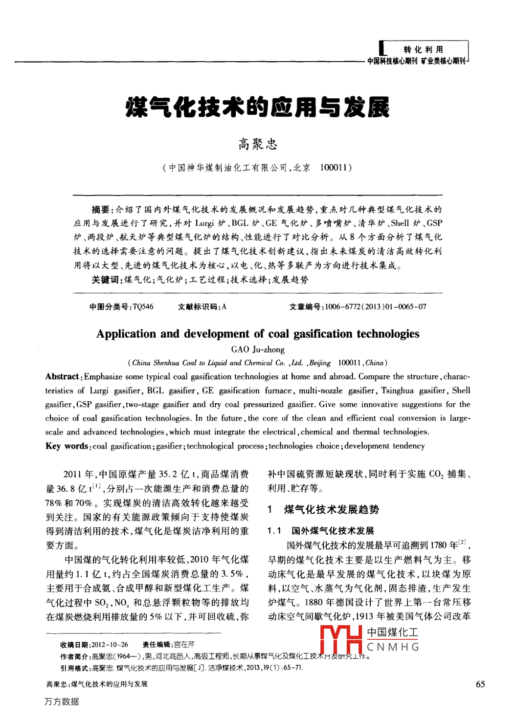轉(zhuǎn)化利用中國(guó)科技核心期刊礦業(yè)類核心期刊煤氣化技術(shù)的應(yīng)用與發(fā)服高聚忠(中國(guó)神華煤制油化工有限公司,北京100011)摘要:介紹了國(guó)內(nèi)外煤氣化技術(shù)的發(fā)展概況和發(fā)展趨勢(shì),重點(diǎn)對(duì)幾種典型煤氣化技術(shù)的應(yīng)用與發(fā)展進(jìn)行了研究,并對(duì)Iugi爐、BCL爐、GE氣化爐、多噴嘴爐、清華爐、Shel爐、GSP爐、兩段爐、航天爐等典型煤氣化爐的結(jié)構(gòu)、性能進(jìn)行了對(duì)比分析。從8個(gè)方面分析了煤氣化技術(shù)的選擇需要注意的問題。提岀了煤氣化技術(shù)創(chuàng)新建議,指岀未來煤炭的淸潔高效轉(zhuǎn)化利用將以大型、先進(jìn)的煤氣化技術(shù)為核心,以電、化、熱等多聯(lián)產(chǎn)為方向進(jìn)行技術(shù)集成。關(guān)鍵詞:煤氣化;氣化爐;工藝過程;技術(shù)選擇;發(fā)展趨勢(shì)中圖分類號(hào):TQ546文獻(xiàn)標(biāo)識(shí)碼:A文章編號(hào):1006-6772(2013)01-0065-07Application and development of coal gasification technologiesGAO Ju-zhongChina Shenhua Coal to Liquid and Chemical Co., Lad., Beijing 100011, China)Abstract: Emphasize some typical coal gasification technologies at home and abroad. Compare the structure, characteristics of Lurgi gasifier, BGL gasifier, GE gasification fumace, multi-nozzle gasifier, Tsinghua gasifier, Shellgasifier, GSP gasifier, two-stage gasifier and dry coal pressurized gasifier. Give some innovative suggestions for thechoice of coal gasification technologies. In the future, the core of the clean and efficient coal conversion is largescale and advanced technologies, which must integrate the electrical, chemical and thermal technologiesKey words: coal gasification; gasifier; technological process; technologies choice; development tendency2011年,中國(guó)原煤產(chǎn)量35.2億t,商品煤消費(fèi)補(bǔ)中國(guó)硫資源短缺現(xiàn)狀,同時(shí)利于實(shí)施CO2捕集量36.8億t,分別占一次能源生產(chǎn)和消費(fèi)總量的利用、貯存等78%和70%。實(shí)現(xiàn)煤炭的清潔高效轉(zhuǎn)化越來越受到關(guān)注。國(guó)家的有關(guān)能源政策傾向于支持使煤炭1煤氣化技術(shù)發(fā)展趨勢(shì)得到清潔利用的技術(shù),煤氣化是煤炭潔凈利用的重1.1國(guó)外煤氣化技術(shù)發(fā)展要方面。國(guó)外煤氣化技術(shù)的發(fā)展最早可追溯到1780年2中國(guó)煤的氣化轉(zhuǎn)化利用率較低,2010年氣化煤早期的煤氣化技術(shù)主要是以生產(chǎn)燃料氣為主。移用量約1.1億t,約占全國(guó)煤炭消費(fèi)總量的3.5%,動(dòng)床氣化是最早發(fā)展的煤氣化技術(shù),以塊煤為原主要用于合成氨、合成甲醇和新型煤化工生產(chǎn)。煤料,以空氣、水蒸氣為氣化劑,固態(tài)排渣,生產(chǎn)發(fā)生氣化過程中SO2,NO,和總懸浮顆粒物等的排放均爐煤氣。1880年德國(guó)設(shè)計(jì)了世界上第一臺(tái)常壓移在煤炭燃燒利用排放量的5%以下,并可回收硫,彌動(dòng)床空氣間歇?dú)饣癄t,1913年被美國(guó)氣體公司改革中國(guó)煤化工收稿日期:2012-10-26責(zé)任編輯:宮在芹CNMHG作者簡(jiǎn)介高聚忠(1964-)男河北高邑人高級(jí)工程師長(zhǎng)期從事煤氣化及煤化工技術(shù)廾友時(shí)⊥作。引用格式:高聚忠煤氣化技術(shù)的應(yīng)用與發(fā)展[刀潔凈煤技術(shù),2013,19(1):65-71高聚忠:煤氣化技術(shù)的應(yīng)用與發(fā)展成UGI爐。UGI爐是以焦炭為原料,用間歇?dú)饣普苟鄧娮焖簼{加壓氣化和二段式干煤粉加壓技水煤氣或半水煤氣。第一次世界大戰(zhàn)后,隨著甲術(shù)攻關(guān),目前,這幾項(xiàng)氣化技術(shù)均已進(jìn)入工業(yè)化應(yīng)醇、合成氨、F-T合成等為代表的合成化學(xué)工業(yè)的發(fā)用階段展,為了滿足合成原料氣的需要,1926年第一代流目前,移動(dòng)床常壓氣化UGI氣化爐在中國(guó)仍是化床 Winkler氣化爐實(shí)現(xiàn)工業(yè)化應(yīng)用。隨著工業(yè)制主力爐型,用于生產(chǎn)合成氣或燃料氣。移動(dòng)床加壓氧技術(shù)的成功,又發(fā)展了新的用氧氣氣化的技術(shù)。氣化 Lurgi爐在劣質(zhì)煤氣化方面占有一定市場(chǎng)。隨1939年移動(dòng)床加壓氣化Lugi爐實(shí)現(xiàn)工業(yè)化應(yīng)用。著中國(guó)現(xiàn)代煤化工的發(fā)展,水煤漿加壓氣化(CE1952年第一代氣流床氣化K-T爐實(shí)現(xiàn)工業(yè)化應(yīng)用。爐、多噴嘴爐)和干煤粉加壓氣化(Shel!爐、GSP、二20世紀(jì)30—50年代,國(guó)外煤氣化技術(shù)取得了很大段爐、航天爐)已成為主要選擇。的成就。20世紀(jì)50年代以后,隨著石油和天然氣1.3現(xiàn)代煤氣化技術(shù)發(fā)展方向工業(yè)的發(fā)展,常壓固定床氣化爐在國(guó)外逐漸被淘1)加壓氣化:提高壓力有利于提高氣化爐的生汰,其它煤氣化技術(shù)的發(fā)展也基本處于停滯產(chǎn)能力,同時(shí)大大減少氣體凈化的投資,并降低壓狀態(tài)??s耗能。現(xiàn)代煤氣化技術(shù)的發(fā)展得益于石油危機(jī)。第2)高溫氣化:使煤中的揮發(fā)分和可燃組分充分次石油危機(jī)時(shí),發(fā)達(dá)國(guó)家出于對(duì)石油、天然氣供轉(zhuǎn)化,其它組分也在高溫下得到鈍化,得到的產(chǎn)品應(yīng)前景的預(yù)測(cè),把發(fā)展煤氣化技術(shù)作為替代石油天煤氣較純凈,三廢問題少。然氣的重要手段,加快了現(xiàn)代煤氣化的開發(fā)。20世3)粉煤氣化:通過增大煤的比表面積提高氣