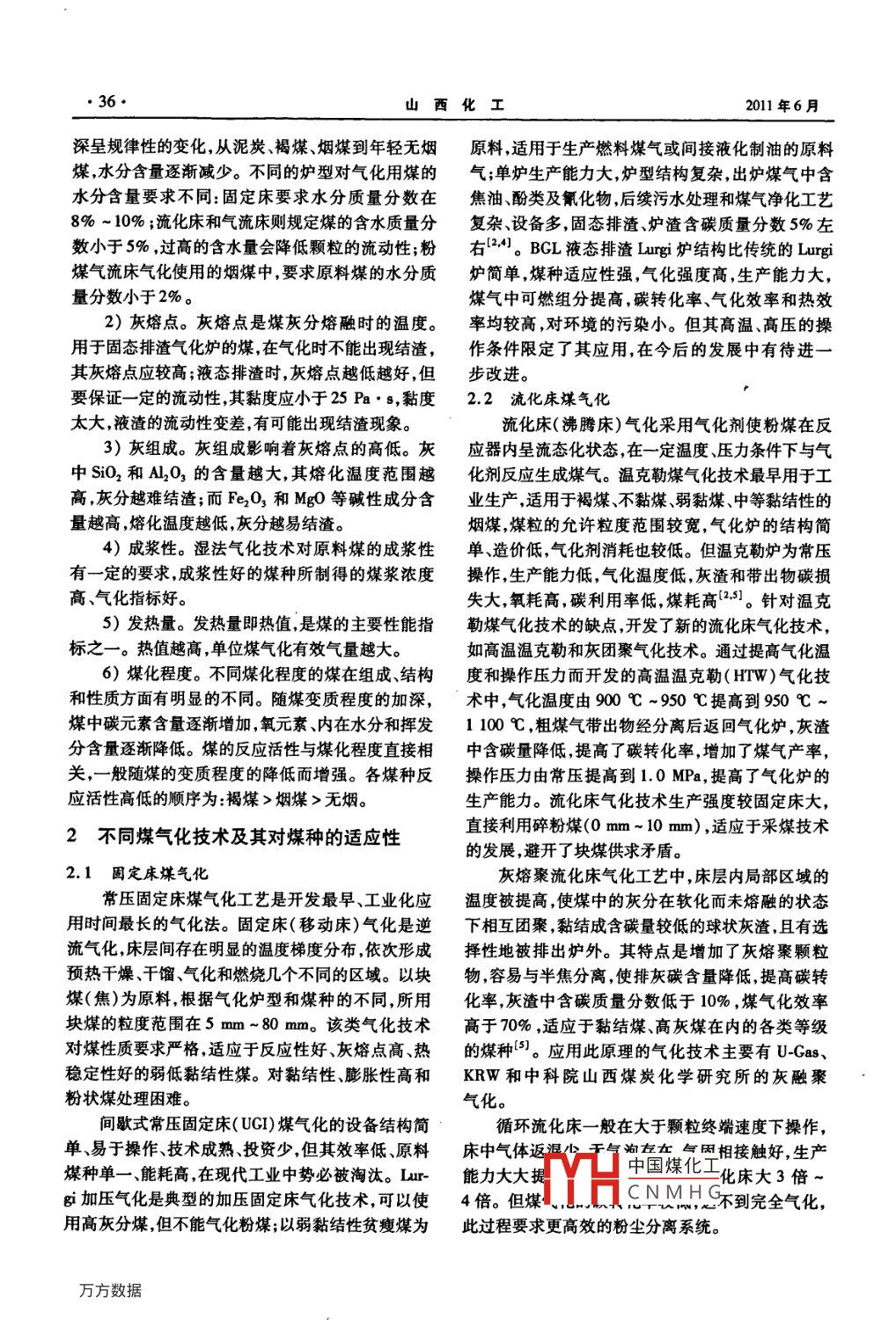 第31卷第3期山西化工Vol.31 No.32011年6月SHANXI CHEMICAL INDUSTRYJun.2011。專題討論.現(xiàn)代煤氣化技術(shù)及其煤種的適應(yīng)性分析原小靜(山煤國際能源集團(tuán)華遠(yuǎn)有限公司,山西太原030001)摘要:結(jié)合國內(nèi)外煤氣化技術(shù)發(fā)展現(xiàn)狀與趨勢,討論了煤質(zhì)特性對氣化過程的影響及其在不同氣化爐型中的適應(yīng)性。分析表明,煤種的多樣性及氣化工藝的選擇促進(jìn)了煤氣化技術(shù)的快速發(fā)展,氣流床和流化床代替固定床是煤氣化技術(shù)發(fā)展的必然所趨。在充分認(rèn)識各類煤氣化技術(shù)優(yōu)缺點(diǎn)的基礎(chǔ)上,應(yīng)發(fā)揮優(yōu)勢,針對煤種選用爐型,開發(fā)具有單爐生產(chǎn)能力高、煤種適應(yīng)性強(qiáng)、氣體成分可調(diào)等優(yōu)勢的加壓氣化技術(shù)以及可有效利用煤氣高溫顯熱的兩段或多段式氣化技術(shù)。關(guān)鍵詞:煤;氣化;固定床;流化床;氣流床中圖分類號:TQ54文獻(xiàn)標(biāo)識碼:A文章編號:1004-7050(2011 )03-0035-04包括:1)固定床煤氣化:間歇式常壓(UCI)氣化、魯引言奇(Lurgi)加壓氣化、液態(tài)排渣Lurgi( BCL)氣化等;煤氣化是以煤(塊煤、焦炭或粉煤)為原料,空2)流化床煤氣化:溫克勒(Winkler)及高溫溫克勒氣、氧氣、二氧化碳或水蒸氣為氣化劑,在- -定的溫(HTW)氣化、灰團(tuán)聚流化床( U-Gas, KRW, ICC)氣度、壓力等條件下發(fā)生反應(yīng)而轉(zhuǎn)化為煤氣的工藝過化、Lurgi循環(huán)流化床(CFB)氣化等;3)氣流床煤氣程。在氣化爐內(nèi)高溫環(huán)境下進(jìn)行的熱化學(xué)反應(yīng)主要化:常壓粉煤(K-T)氣化、德士古( Texaco)和包括氣、固兩相的非均相反應(yīng)與氣體反應(yīng)物間的均(Destec)水煤漿加壓氣化、殼牌( Shell)、Prenflo和相反應(yīng)。反應(yīng)進(jìn)行的程度取決于氣化爐的操作條GSP粉煤加壓氣化等。本文對典型的氣化技術(shù)及其件,即溫度、壓力、煤的化學(xué)反應(yīng)活性及氣化劑與煤對煤質(zhì)的要求進(jìn)行歸納總結(jié),以期為我國煤氣化技的接觸時(shí)間等。煤氣化技術(shù)是煤化工的先導(dǎo)技術(shù),術(shù)的發(fā)展 提供- -定的參考。氣化技術(shù)的選擇,需要充分考慮原料煤的特性、煤氣1 煤質(zhì)特性及其對氣化性能的影響的用途和規(guī)模、氣化技術(shù)的成熟度與可靠性、粗煤氣構(gòu)成及經(jīng)濟(jì)性等[。我國煤炭資源豐富,包含了褐煤到無煙煤的不目前,按煤在氣化爐內(nèi)運(yùn)動(dòng)方式的不同,煤氣化同變質(zhì)程度的各類煤種。但各煤種的儲量不均衡、技術(shù)可分為固定床(移動(dòng)床)、流化床(沸騰床)和氣區(qū)域分布差別較大,不同煤種的組成和性質(zhì)相差也流床等形式;按氣化操作壓力的不同,可分為常壓煤非常大。并且,即使是同- -變質(zhì)程度的煤種,因其成氣化和加壓煤氣化;按進(jìn)料方式的不同,可分為固體煤環(huán)境不同,性質(zhì)差異也較大。氣化反應(yīng)過程與煤進(jìn)料和漿液進(jìn)料;按排渣方式的不同,可分為固體排的性質(zhì)密切相關(guān),直接影響著煤氣化的產(chǎn)物組成與渣和熔融排渣等。煤氣化技術(shù)及其代表性爐型主要?dú)饣に嚨呐渲?。不同的氣化工藝對原料煤的性質(zhì)要求不同,在選擇煤氣化工藝時(shí),考慮氣化用煤的特性及其影響極為重要。影響煤氣化工藝煤質(zhì)特性收稿日期:201103-22作者簡介:甌小靜,女,1965年出生,1988年畢業(yè)于太原理工大學(xué)化的因素主要中國煤化工工系煤化工專業(yè),工程師,主要從事煤炭貿(mào)易工作。1)水分MHCNMH G變質(zhì)程度的加●36.山西化工2011年6月深呈規(guī)律性的變化,從泥炭褐煤、煙煤到年輕無煙原料,適用于生產(chǎn)燃料煤氣或間接液化制油的原料煤,水分含量逐漸減少。不同的爐型對氣化用煤的氣;單爐生產(chǎn)能力大,爐型結(jié)構(gòu)復(fù)雜,出爐煤氣中含水分含量要求不同:固定床要求水分質(zhì)量分?jǐn)?shù)在焦油、酚類及氰化物,后續(xù)污水處理和煤氣凈化工藝8% ~ 10% ;流化床和氣流床則規(guī)定煤的含水質(zhì)量分復(fù)雜 、設(shè)備多,固態(tài)排渣、爐渣含碳質(zhì)量分?jǐn)?shù)5%左數(shù)小于5% ,過高的含水量會降低顆粒的流動(dòng)性;粉右.4。BGL液態(tài)排渣Lurgi爐結(jié)構(gòu)比傳統(tǒng)的Lurgi煤氣流床氣化使用的煙煤中,要求原料煤的水分質(zhì)爐簡單,煤種適應(yīng)性強(qiáng),氣化強(qiáng)度高,生產(chǎn)能力大,量分?jǐn)?shù)小于2%。煤氣中可燃組分提高,碳轉(zhuǎn)化率、氣化效率和熱效2)灰熔點(diǎn)?;胰埸c(diǎn)是煤灰分熔融時(shí)的溫度。率均較高,對環(huán)境的污染小。但其高溫、高壓的操用于固態(tài)排渣氣化爐的煤,在氣化時(shí)不能出現(xiàn)結(jié)渣,作條件限定了其應(yīng)用,在今后的發(fā)展中有待進(jìn)- -其灰熔點(diǎn)應(yīng)較高;液態(tài)排渣時(shí),灰熔點(diǎn)越低越好,但步改進(jìn)。要保證- -定的流動(dòng)性,其黏度應(yīng)小于25 Pa.s,黏度2.2流化床煤氣化 ,太大,液渣的流動(dòng)性變差,有可能出現(xiàn)結(jié)渣現(xiàn)象。流化床(沸騰床)氣化采用氣化劑使粉煤在反3)灰組成。灰組成影響著灰熔點(diǎn)的高低?;覒?yīng)器內(nèi)呈流態(tài)化狀態(tài),在- -定溫度、壓力條件下與氣中SiO2和AI203的含量越大,其熔化溫度范圍越化劑反應(yīng)生成煤氣。溫