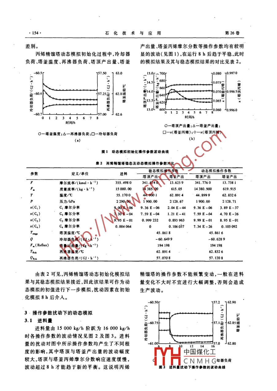 第26卷第2期石化技術(shù)與應(yīng)用2008年3月Petrochemical Technology& Application工業(yè)技術(shù)(153~157)丙烯精餾塔動(dòng)態(tài)模擬孫衛(wèi)國(guó),伏妍,李潔,高陽(yáng)光,蘭其盈(中國(guó)石油蘭州化工研究中心,甘肅蘭州730060)摘要:利用 Aspen Dynamics軟件對(duì)丙烯精餾塔的操作進(jìn)行了動(dòng)態(tài)模擬。結(jié)果表明,無(wú)論是進(jìn)料量進(jìn)料組成還是回流量擾動(dòng)均對(duì)操作產(chǎn)生較大影響,主要體現(xiàn)在塔釜溫度、冷卻器負(fù)荷、再沸器負(fù)荷、塔頂及塔釜丙烯摩爾分?jǐn)?shù)和產(chǎn)出量的波動(dòng)上,尤其是塔頂及塔釜產(chǎn)出量不僅波動(dòng)大,而且響應(yīng)迅速,塔頂及塔釜丙烯摩爾分?jǐn)?shù)的響應(yīng)速度緩慢,波動(dòng)持續(xù)時(shí)間超過(guò)8h;儀表調(diào)節(jié)規(guī)律對(duì)動(dòng)態(tài)特性具有重要的影響。關(guān)鍵詞:丙烯精餾塔; Aspen Dynamics軟件;動(dòng)態(tài)模擬;進(jìn)料量;塔釜溫度;回流量;積分調(diào)節(jié)中圖分類號(hào):TQ221.212;TQ01.81文獻(xiàn)標(biāo)識(shí)碼:B文章編號(hào):00-0045(2006)02-0153-05中國(guó)石油蘭州石化分公司烯烴裝置所用裂擬的基礎(chǔ)上直接轉(zhuǎn)換,不需要專門為動(dòng)態(tài)流程模解原料有十幾種之多,不同原料間切換頻繁,造擬進(jìn)行大量的設(shè)置。動(dòng)態(tài)模擬以原料進(jìn)料量為成丙烯裝置進(jìn)料組成波動(dòng)較大,另外裂解爐的15000kg/h,其所含丙烷摩爾分?jǐn)?shù)為3.4456%清焦處理也造成丙烯進(jìn)料量的波動(dòng),這些波動(dòng)時(shí)的丙烯精餾塔穩(wěn)態(tài)模擬結(jié)果為基礎(chǔ)進(jìn)行轉(zhuǎn)換,均增大了丙烯精餾裝置的操作難度。為保證丙建立動(dòng)態(tài)模擬流程。動(dòng)態(tài)模擬中儀表的調(diào)節(jié)均烯精餾塔塔頂產(chǎn)品質(zhì)量合格,塔釜丙烯經(jīng)常出采用比例調(diào)節(jié),比例度設(shè)為100%。丙烯精餾塔現(xiàn)損失過(guò)大的情況。另外,丙烯精餾塔循環(huán)水回流罐及再沸器尺寸見(jiàn)表l?!阌昧空枷N裝置循環(huán)水總用量的60%(質(zhì)量分豪1回流及再沸番尺寸參數(shù)數(shù)),能耗較高。筆者利用 Aspen Dynamics模擬項(xiàng)目回流罐再沸器1再沸器2再沸器3軟件對(duì)丙烯精餾塔進(jìn)行了動(dòng)態(tài)模擬,研究了該直徑/m2.0001.836L.800塔進(jìn)料量、進(jìn)料組成、回流量等操作因素?cái)_動(dòng)下長(zhǎng)度/m4.90010.1597.5007.240的動(dòng)態(tài)特性,用于指導(dǎo)裝置的運(yùn)行,節(jié)約了能源,并為裝置今后的改造和實(shí)現(xiàn)先進(jìn)控制提供了基礎(chǔ)數(shù)據(jù)。2動(dòng)態(tài)模擬初始化目前,國(guó)內(nèi)對(duì)于精餾過(guò)程動(dòng)態(tài)模擬的應(yīng)用報(bào)在 Aspen Plus穩(wěn)態(tài)模擬中,對(duì)物料特性、塔道"較少,有專家曾利用HSYS模擬軟件對(duì)的氣液平衡,換熱器管程及殼程溫度分布均采用丙烯分離過(guò)程進(jìn)行了動(dòng)態(tài)模擬研究,取得了較好嚴(yán)格模型計(jì)算。但在 Aspen Dynamics動(dòng)態(tài)模擬中若使用嚴(yán)格模型計(jì)算,則模擬計(jì)算量過(guò)大,難的效果,但尚未見(jiàn)到利用 Aspen Dynamics模擬軟以實(shí)現(xiàn)動(dòng)態(tài)模擬要求。因此,動(dòng)態(tài)模擬中在求取件對(duì)丙烯精餾塔進(jìn)行動(dòng)態(tài)模擬研究的相關(guān)報(bào)道。上述重要參數(shù)時(shí),均要對(duì)穩(wěn)態(tài)模擬結(jié)果進(jìn)行分段線性化處理,并使用線性化處理后的參數(shù)對(duì)穩(wěn)態(tài)1動(dòng)態(tài)模擬流程丙烯精餾塔流程見(jiàn)文獻(xiàn)[9]。筆者曾利用結(jié)果進(jìn)行初始化,從而得到動(dòng)態(tài)模擬的初值,故Aspen Plus軟件對(duì)丙烯精餾塔進(jìn)行穩(wěn)態(tài)模擬,所而動(dòng)態(tài)模擬的初值與穩(wěn)態(tài)模擬結(jié)果有細(xì)微的得結(jié)果與實(shí)際操作數(shù)據(jù)吻合較好,解決了部分操中國(guó)煤化工作參數(shù)的優(yōu)化問(wèn)題。利用 Aspen Dynamics軟CNMHG-09-20上國(guó)(y/-),男,百氏勳人,工程碩士,工程件實(shí)現(xiàn)動(dòng)態(tài)過(guò)程模擬比較方便,可在穩(wěn)態(tài)流程模。從事化學(xué)工程研究工作。已發(fā)表論文5篇。154石化技術(shù)與應(yīng)用第26卷差別。產(chǎn)出量、塔釜丙烯摩爾分?jǐn)?shù)等操作參數(shù)均有較明丙烯精餾塔動(dòng)態(tài)模擬初始化過(guò)程中,冷卻器顯的波動(dòng)(見(jiàn)圖1),在運(yùn)行8h后趨于平穩(wěn),此時(shí)負(fù)荷、塔釜溫度、再沸器負(fù)荷、塔頂產(chǎn)出量、塔釜的模擬結(jié)果及其與穩(wěn)態(tài)模擬結(jié)果的對(duì)比見(jiàn)表2008010.99700.0758000090570062.6時(shí)間/h時(shí)間h一塔頂產(chǎn)出量;△一塔釜產(chǎn)出量一塔釜溫度;Δ一再沸器負(fù)荷;口一冷卻器負(fù)荷口-x(塔釜丙烯);◇一x(塔頂丙烯)圖1動(dòng)態(tài)模擬初始化操作參數(shù)波動(dòng)曲線褒2丙烯精餾塔穩(wěn)態(tài)及動(dòng)態(tài)模擬操作參數(shù)對(duì)比定義/單位穩(wěn)態(tài)模擬操作參數(shù)動(dòng)態(tài)模擬操作參數(shù)塔頂產(chǎn)出塔釜產(chǎn)出塔頂產(chǎn)出塔釜產(chǎn)出摩爾流率/(kmol·h1)355.498013.7381質(zhì)量流率/(kg·h1)15000.0014385.00615.05619.915溫度℃55.170044.900162.89144.899962.8326壓力/kPa2290.001900.002128,67900.002128.71x(C1)C1摩爾分率900E-069