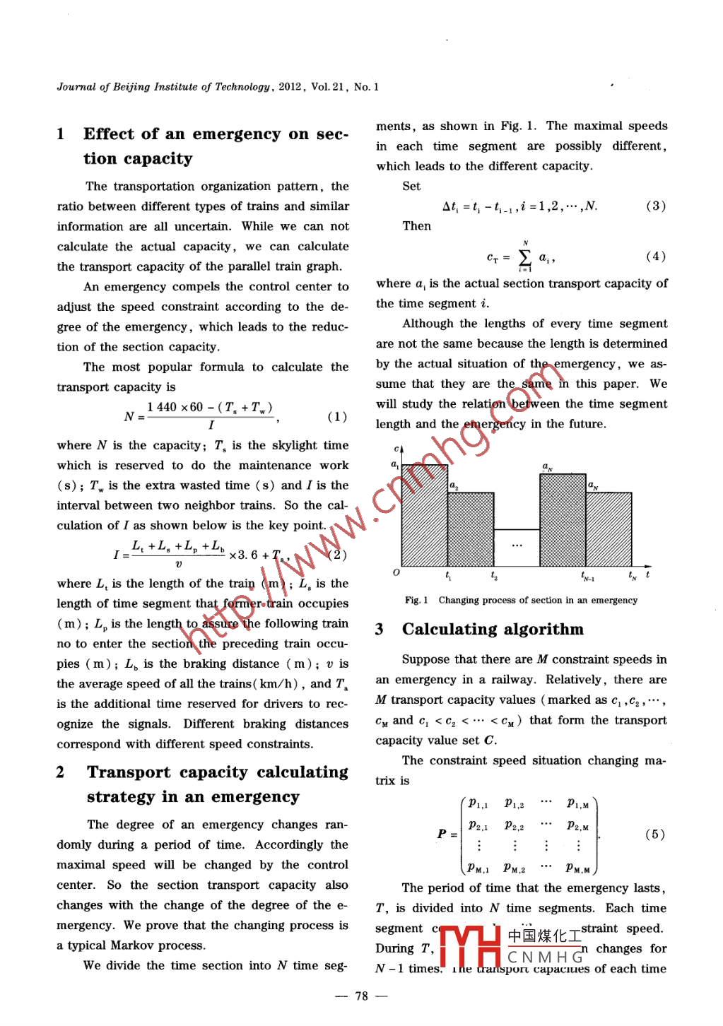 Journal of Beijing Institute of Technology, 2012, Vol.21, No. 1Calculation of railway transport capacity in anemergency based on Markov processMENG Xue-lei( 孟學(xué)雷)'2,日,JIA li-min(賈利民)”,QIN Yong(秦勇)”,XU Jie(徐杰)”,WANG Li(王莉)2(1. School of Traffic and Transportation, Lanzhou Jiaotong University, Lanzhou 730070, China; 2. State KeyLaboratory of Rail Trafe Control and Safety, Beijing Jiaotong University, Bejing 10044, China)Abstract: A method is proposed to calculate the railway transport capacity in an emergency to sup-port the dispatching work of control centers. The effect of an emergency on section transport capaci-ty is analyzed and the basic method to calculate the transport capacity is presented. The results showthat the situation-changing process in emergency is actually a Markov process. The calculation rule ispresented based on division of the time segment during which the emergency lasts. The algorithm isdesigned to calculate the transport capacity of each time segment. The pessimistic strategy and thefuzzy strategy are proposed to determine the computing value of the transport capacity of each timesegment, to satisfy the calculating requirements in different occasions. Our study shows that themethod is reasonable and practical and the method can be embedded in the train dispatching systemto support the operation work in an emergency.CLC number: U 292. 5Document code: A Article ID : 1004-0579(2012)01-0077-04The section capability of a railway is thetions, the minimal intervals between trains andmaximal number of trains that can go through thethe maximal speed that the section can support.section in a period of time (a day or an hour),The most important factor that affects the trans-with certain kinds of locomotives and cars, andport capacity is the maximal speed in the section.with a certain kind of organization rule. From theThere are three major methods to calculatedefinition, the section capability is related to thethe section capacity. An analytical method is de-equipments, such as locomotives and cars and thesigned to model the railway environment byorganization plan. In reality, the locomotives andmeans of mathematical formulae or algebraic ex-cars are relatively stable. So the section capabilitypressions'”-3. A simulation method simulates theis mainly determined by the organization rule andtrains’dynamic behavior of a system by moving itplan. The organization rules cover a series of or-from state to state in accordance with well-de-ganization constraints and leading principles ,fined rules to get the capacity'4-5]. An optimiza-such as the minimal running time through the sec-tion method is more strategic for solving the rail-vay transport capacity problem and providesReceived 2011-07-01Supported by the State Key Laboratory of Rail Traffic Controlmuch better solutions than purely analytical for-and Safety ( RCS2011K004 ); Beijing Jiaotong University ,mulae'6 71. In this paper, an analytical method isFundamental Research Funds of Gansu Province ( 620030 ) ;he National Natural Science Foundation of Chinaproposed, which is different from the methods in(61074151); Project of Research and Development on TrainControl Center Operation Expressing System of TubeRailRefs.[1 -3中國煤化工the' Markov( 306086 )匈Author for correspondence,associate professorprocess toMYHCNMHGlanges of seg-E-mail: foxred@ 163. comment capacity.-77-Jourmal of Beijing Institute of Technology, 2012, Vol.21, No. 11 Effect of an emergency on sec-ments, as shown in Fig. 1. The maximal speedsin each time segment are possibly different,tion capacitywhich leads to the different capacity.The transportation organization pattern, theSetratio between different types of trains and similarOt=t-t-,i=1 ,2,. ,N.(3)information are all uncertain. While we can notThencalculate the actual capacity, we can calculateCr= 2 a,(4)the transport capacity of the parallel train graph.An emergency compels the control center towhere a, is the actual section transport capacity ofadjust the speed constraint according to the de-the time segment i.gree of the emergency, which leads to the reduc-Although the lengths of every time segmenttion of the section capacity.are not the same because the length is determinedThe most popular formula to calculate theby the actual situation of the emergency, we as-transport capacity issume that they are the same in this paper. WeN:1 440 x60-(T。+T.)(1)will study the relation between the time segmentlength and the emergency in the future.where N is the capacity; T, is the skylight timeCwhich is reserved to do the maintenance workn(s); TW is the extra wasted time (s) and I is theinterval between two neighbor trains. So the cal-culation of I as shown below is the key point._L:+L.+L。 +Lpx3.6 +Tg,(2)where L, is the length of the train (m); L。is thelength of time segment that former train occupiesFig.1 Changing process of section in an emergency(m); L。is the length to assure the following train3 Calculating algorithmno to enter the section the preceding train occu-pies (m); L。is the braking distance (m); 0 isSuppose that there are M constraint speeds inthe average speed of all the trains( km/h), and T.an emergency in a railway. Relatively, there areis the additional time reserved for drivers to rec-M transport capacity values ( marked as C,2,"",ognize the signals. Different braking distancesCM and Cq