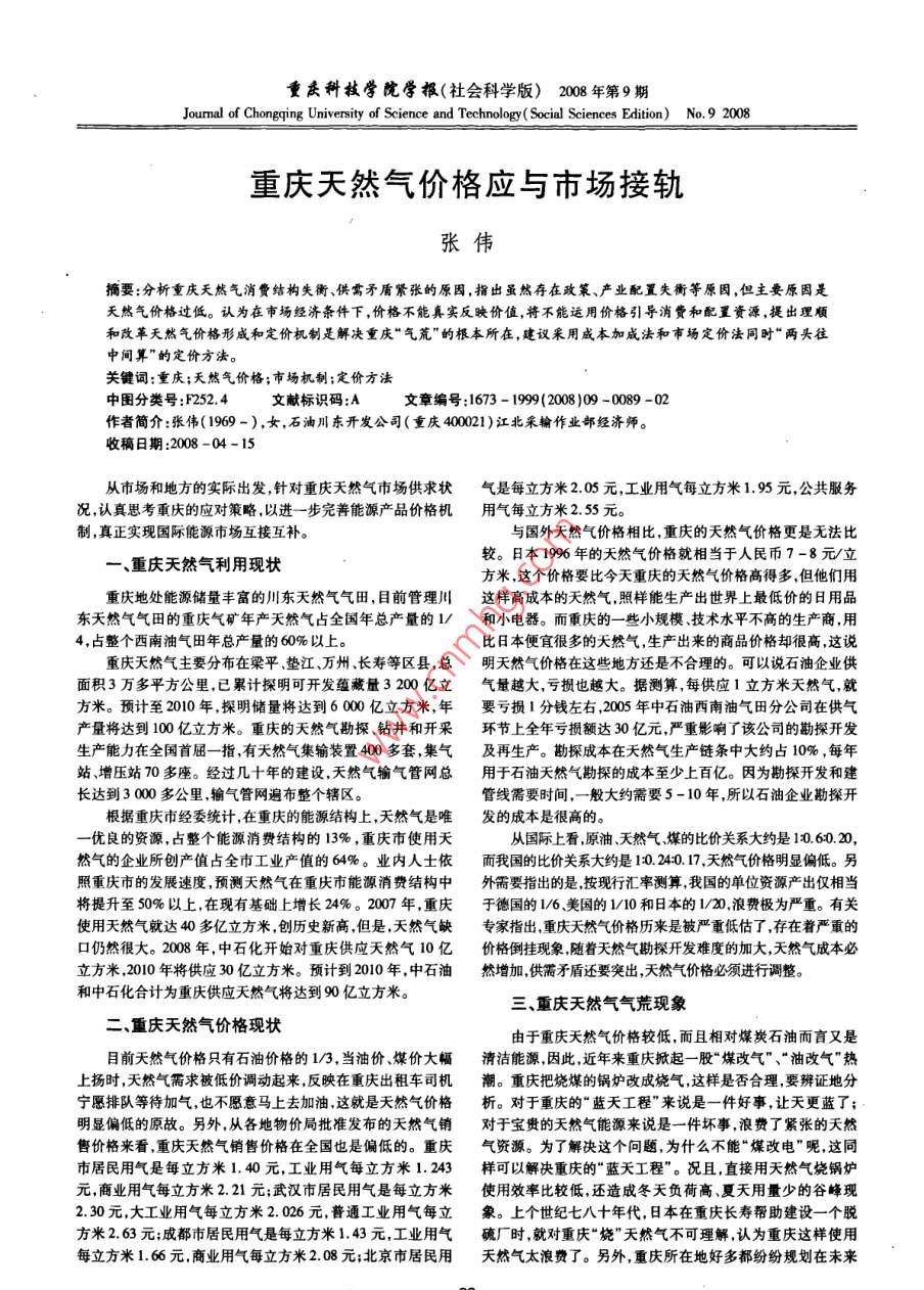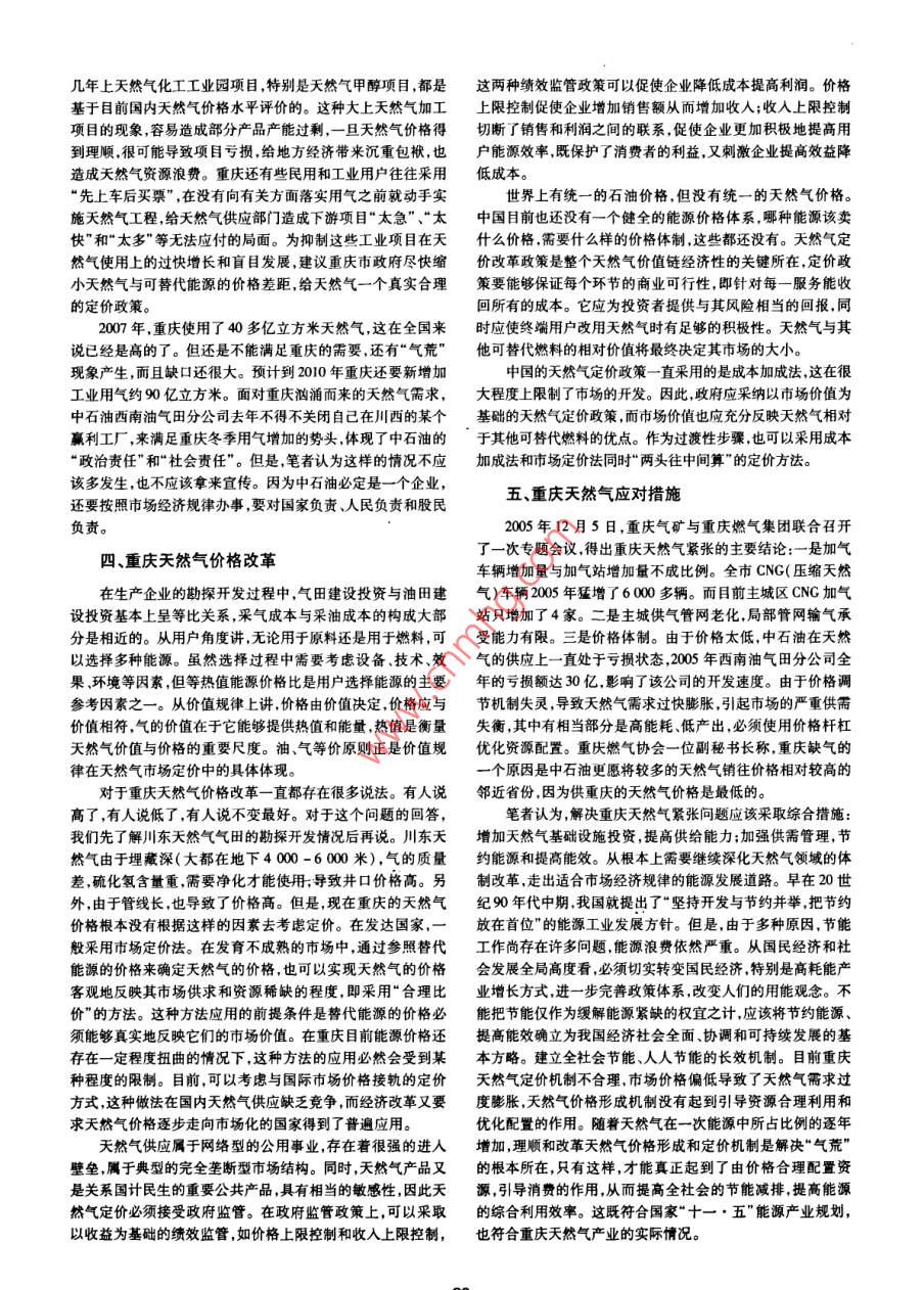 重慶科技學(xué)院學(xué)報(bào)(社會(huì)科學(xué)版)2008年第9期Journal of Chongqing University of Science and Technology( Social Sciences Edition) No 9 2008重慶天然氣價(jià)格應(yīng)與市場(chǎng)接軌張偉摘要:分析重慶天然氣消費(fèi)結(jié)構(gòu)失衡、供需矛盾緊張的原因,指出雖然存在政策、產(chǎn)業(yè)配置失衡等原因,但主要原因是天然氣價(jià)格過(guò)低。認(rèn)為在市場(chǎng)經(jīng)濟(jì)條件下,價(jià)格不能真實(shí)反映價(jià)值,將不能運(yùn)用價(jià)格引導(dǎo)消費(fèi)和配置資源,提出理順和改革天然氣價(jià)格形成和定價(jià)機(jī)制是解決重慶“氣荒”的根本所在,建議采用成本加成法和市場(chǎng)定價(jià)法同時(shí)“兩頭往中間算”的定價(jià)方法。關(guān)鍵詞:重慶;天然氣價(jià)格;市場(chǎng)機(jī)制;定價(jià)方法中圖分類號(hào):F2524文獻(xiàn)標(biāo)識(shí)碼:A文章編號(hào):1673-1999(20081)09-0089-02作者簡(jiǎn)介:張偉(1969-),女,石油川東開發(fā)公司(重慶400021)江北采輸作業(yè)部經(jīng)濟(jì)師收稿日期:2008-04-15從市場(chǎng)和地方的實(shí)際出發(fā)針對(duì)重慶天然氣市場(chǎng)供求狀氣是每立方米205元,工業(yè)用氣每立方米1.95元,公共服務(wù)況,認(rèn)真思考重慶的應(yīng)對(duì)策略以進(jìn)一步完善能源產(chǎn)品價(jià)格機(jī)用氣每立方米2.55元制,真正實(shí)現(xiàn)國(guó)際能源市場(chǎng)互接互補(bǔ)。與國(guó)外天然氣價(jià)格相比,重慶的天然氣價(jià)格更是無(wú)法比重慶天然氣利用現(xiàn)狀較。日本1996年的天然氣價(jià)格就相當(dāng)于人民幣7-8元/立方米,這個(gè)價(jià)格要比今天重慶的天然氣價(jià)格高得多,但他們用重慶地處能源儲(chǔ)量豐富的川東天然氣氣田,目前管理川這樣高成本的天然氣照樣能生產(chǎn)出世界上最低價(jià)的日用品東天然氣氣田的重慶氣礦年產(chǎn)天然氣占全國(guó)年總產(chǎn)量的l/和小電器。而重慶的一些小規(guī)模、技術(shù)水平不高的生產(chǎn)商,用4,占整個(gè)西南油氣田年總產(chǎn)量的60%以上比日本便宜很多的天然氣,生產(chǎn)出來(lái)的商品價(jià)格卻很高這說(shuō)重慶天然氣主要分布在梁平墊江、萬(wàn)州長(zhǎng)壽等區(qū)縣,總明天然氣價(jià)格在這些地方還是不合理的??梢哉f(shuō)石油企業(yè)面積3萬(wàn)多平方公里,已累計(jì)探明可開發(fā)蘊(yùn)藏量3200億立氣量越大,虧損也越大。據(jù)測(cè)算,每供應(yīng)1立方米天然氣,就方米。預(yù)計(jì)至2010年探明儲(chǔ)量將達(dá)到6000億立方米,年要虧損1分錢左右,2005年中石油西南油氣田分公司在供氣產(chǎn)量將達(dá)到100億立方米。重慶的天然氣勘探鉆井和開采環(huán)節(jié)上全年虧損額達(dá)30億元,嚴(yán)重影響了該公司的勘探開發(fā)生產(chǎn)能力在全國(guó)首屈一指,有天然氣集輸裝置400多套,集氣及再生產(chǎn)??碧匠杀驹谔烊粴馍a(chǎn)鏈條中大約占10%,每年站、增壓站70多座。經(jīng)過(guò)幾十年的建設(shè),天然氣輸氣管網(wǎng)總用于石油天然氣勘探的成本至少上百億。因?yàn)榭碧介_發(fā)和建長(zhǎng)達(dá)到3000多公里輸氣管網(wǎng)遍布整個(gè)轄區(qū)管線需要時(shí)間,一般大約需要5-10年,所以石油企業(yè)勘探開根據(jù)重慶市經(jīng)委統(tǒng)計(jì),在重慶的能源結(jié)構(gòu)上,天然氣是唯發(fā)的成本是很高的。一優(yōu)良的資源,占整個(gè)能源消費(fèi)結(jié)構(gòu)的13%,重慶市使用天從國(guó)際上看,原油天然氣煤的比價(jià)關(guān)系大約是1060.20,然氣的企業(yè)所創(chuàng)產(chǎn)值占全市工業(yè)產(chǎn)值的64%。業(yè)內(nèi)人士依而我國(guó)的比價(jià)關(guān)系大約是10.240.17,天然氣價(jià)格明顯偏低。另照重慶市的發(fā)展速度,預(yù)測(cè)天然氣在重慶市能源消費(fèi)結(jié)構(gòu)中外需要指出的是按現(xiàn)行匯率測(cè)算我國(guó)的單位資源產(chǎn)出僅相當(dāng)將提升至50%以上,在現(xiàn)有基礎(chǔ)上增長(zhǎng)24%。2007年,重慶于德國(guó)的1/6美國(guó)的1/10和日本的120,浪費(fèi)極為嚴(yán)重。有關(guān)使用天然氣就達(dá)40多億立方米,創(chuàng)歷史新高,但是,天然氣缺專家指出重慶天然氣價(jià)格歷來(lái)是被嚴(yán)重低估了,存在著嚴(yán)重的口仍然很大。2008年,中石化開始對(duì)重慶供應(yīng)天然氣10億價(jià)格倒掛現(xiàn)象隨著天然氣勘探開發(fā)難度的加大,天然氣成本必立方米,2010年將供應(yīng)30億立方米。預(yù)計(jì)到2010年,中石油然增加供需矛盾還要突出天然氣價(jià)格必須進(jìn)行調(diào)整。和中石化合計(jì)為重慶供應(yīng)天然氣將達(dá)到9億立方米。三、重慶天然氣氣荒現(xiàn)象二、重慶天然氣價(jià)格現(xiàn)狀由于重慶天然氣價(jià)格較低,而且相對(duì)煤炭石油而言又是目前天然氣價(jià)格只有石油價(jià)格的1/3,當(dāng)油價(jià)、煤價(jià)大幅清潔能源因此,近年來(lái)重慶掀起一股“煤改氣”、“油改氣”熱上揚(yáng)時(shí),天然氣需求被低價(jià)調(diào)動(dòng)起來(lái)反映在重慶出租車司機(jī)潮。重慶把燒煤的鍋爐改成燒氣,這樣是否合理,要辨證地分寧愿排隊(duì)等待加氣,也不愿意馬上去加油這就是天然氣價(jià)格析。對(duì)于重慶的“藍(lán)天工程”來(lái)說(shuō)是一件好事,讓天更藍(