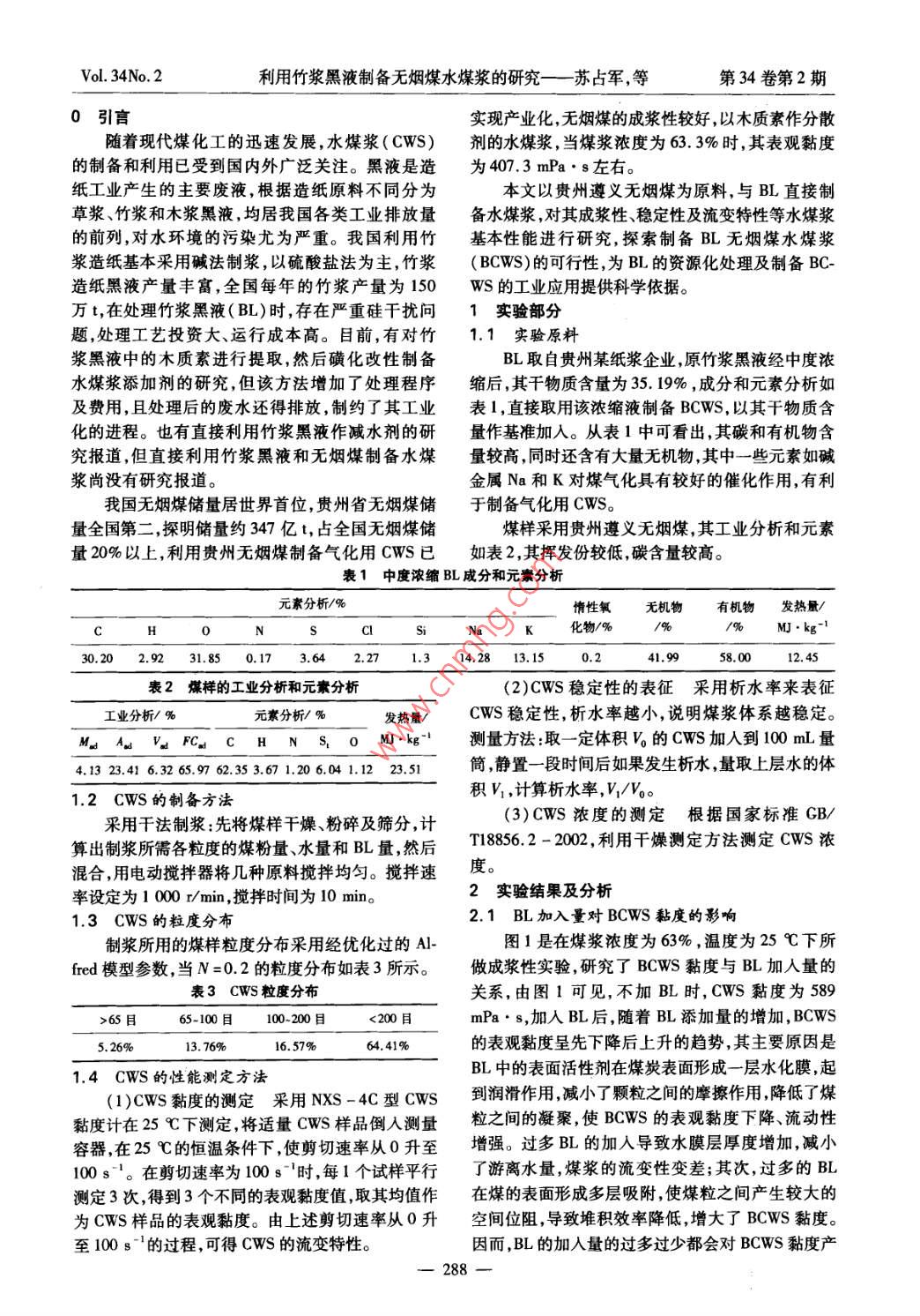 第34卷第2期煤炭技術(shù)Vol. 34No 22015年2月Coal TechnologyFeb.2015doi:10.13301/ j. cnki.c2015.02.110利用竹漿黑掖制備無煙堞水蝶漿的研究蘇占軍,萬勇陳前林,謝燕,張德成,李科褡,數(shù)先權(quán)(1.貴州大學(xué)化學(xué)與化工學(xué)院貴陽550025;2.貴州赤天化集團(tuán)有限責(zé)任公司,貴陽550001)摘要:利用竹漿黑液(BL)和無煙煤制備水煤漿(CWS),研究了竹漿黑液水煤漿(BCWS)表觀黏度、穩(wěn)定性及流變特性變化規(guī)律。結(jié)果表明:當(dāng)BL干物質(zhì)添加量為0.5%時(shí),漿體表觀黏度最低,煤漿濃度為70%時(shí),黏度<1000mPa·s;BCWS的流變特性屬于賓漢塑性流體,隨著剪切速率的增大,呈剪切變稀的現(xiàn)象,其析水率較低,穩(wěn)定性較好。關(guān)鍵詞:竹漿黑液;無煙煤;水煤漿;成漿性能中圖分類號(hào):TQ536文獻(xiàn)標(biāo)志碼:A文章編號(hào):1008-8725(2015)02-0287-04Study on Properties of Anthracite Coal Water Slurry Using BambooPulp black liquorSU Zhan-jun, WAN Yong, CHEN Qian-lin', XTE Yan, ZHANG De-cheng, LI Ke-da, AO Xian-qus(1. School of Chemistry and Chemical Engineering, Guizhou University, Guiyang 550025, China; 2. GuizhouChitianhua( Group) Co, Ltd, Guiyang 550001, China)Abstract: The apparent viscosity, stability and rheological properties of anthracite coal water( cWS)were studied by dry slurry making processes using bamboo pulp black liquor(BL). It isthe solid concentration of BCWS is about 70% when the apparent viscosity is at affixed value of 1 000mPas with 0. 5% BL, in which case the lowest apparent viscosity could be found. In addition, the rheo-logical property of CWS are classified as bingham plastic fluid, its viscosity have property of shearthinning. And the BCWS have advantage with low water abeorption rate and well stabilityKey words: bamboo pulp black liquor; anthracite; coal water slurry; slurry properties添加量下,制漿濃度高3%。(2)制漿濃度為59%時(shí),GT添加劑制得的漿體比NF添加劑制得的漿體表觀形貌更為平整、鋪展面積高達(dá)1300mm2/g、流動(dòng)性更好、60℃時(shí)漿體自由水脫除后失水速率更低。(3)CT添加劑良好的潤(rùn)濕分散性和吸附性使④-正電e·負(fù)電荷制得的漿體流動(dòng)性好、失水速率低,是CT添加劑制圖6添加劑分散機(jī)理漿濃度高的主要作用因素。1.添加劑主鏈2.雙電子層3.煤粒4.溶劑化層參考文獻(xiàn)GT添加劑良好的潤(rùn)濕分散性使?jié){體中煤粒得0趙錦波,王玉慶煤氣化技術(shù)的現(xiàn)狀及發(fā)展趨勢(shì)[]石油化工到充分的包裹,從而使?jié){體的表觀形貌更為平整、流2014,43(2):125-131.[2]段清兵,我國水煤漿技術(shù)發(fā)展現(xiàn)狀與趨勢(shì)[J].新材料產(chǎn)業(yè)動(dòng)性更好鋪展面積更大;添加劑中含正電荷的極性2012,15(11):14-18.官能團(tuán)與煤粒表面的負(fù)電荷以離子鍵結(jié)合,使添加[3]蔣斌斌新型水煤漿制備工藝的探討與研究[J]煤炭工程,劑與煤粒間產(chǎn)生吸附作用,形成的緊密的雙電子層2013,45(8):67-68,71從而阻擋水煤漿中水分子的進(jìn)入,負(fù)電荷官能團(tuán)則4偉,張光華朱軍峰磺化茶酚甲醛/禁系復(fù)合水媒漿分散劑的伸向溶液形成溶劑化層使水煤漿具有一定的空間5]江紅艷楊東杰周明松三聚碘酸鈉對(duì)水煤漿分散劑性能的影位阻效應(yīng);在60℃下,漿體在自由水脫除后,GT添響[J].煤炭轉(zhuǎn)化,2011,34(4):29加劑由于其良好的吸附性能大量地吸附于煤粒表[6]蘇毅朱書全烷基酚聚氧乙烯醚水煤漿分散劑的成漿性能[丁面,并逐漸堵塞煤粒的孔隙,從而使煤粒比表面積降煤炭學(xué)報(bào),2011,36(8):139-1400低,失水速率更低。[7]程維,趙輝,孟沁瑋,等水煤漿氣流霧化的初次破裂特性[J]化3結(jié)語工學(xué)報(bào),2011,62(1):25-31.(1)CT添加劑比NF添加劑制漿性能更好,在作者簡(jiǎn)介:劉銘(1989-),安徽合肥人,碩士研究生,研究方煤濃度62%,添加劑用量03%時(shí),漿體表觀黏向:潔凈媒技術(shù)電子信箱 ywalkliu@ 163cm度達(dá)843mPa·s,穩(wěn)定性良好,比NF添加劑在同等資任編輯:趙勤收稿日期:2014-09-20287Vol. 34No 2利用竹漿黑液制備無煙煤水煤漿的研究——蘇占軍,等第34卷第2期0引言實(shí)現(xiàn)產(chǎn)業(yè)化,無煙煤的成漿性較好,以木質(zhì)素作分散隨著現(xiàn)代煤化工的迅速發(fā)展,水煤漿(CWs)劑的水煤漿,當(dāng)煤漿濃度為63.3%時(shí),其表觀黏度的制備和利用已受到國內(nèi)外廣泛關(guān)注。黑液是造為407.3mPa·s左右。紙工業(yè)產(chǎn)生的主要廢液,根據(jù)造紙?jiān)喜煌譃楸疚囊再F州遵義無煙煤為原料,與BL直接制草漿、竹漿和木漿黑液,均居我國各類工業(yè)排放量備水煤漿,對(duì)其成漿性穩(wěn)定性及流變特性等水煤漿的前列,對(duì)水環(huán)境的污染尤為嚴(yán)重。我國利用竹基本性能進(jìn)行研究,探索制備BL無煙煤水煤漿漿造紙基本采用堿法制漿,以硫酸鹽法為主,竹漿(BCWS)的可行性,為BL的資源化處理及制備BC造紙黑液產(chǎn)量豐富,全國每年的竹漿產(chǎn)量為150WS的工業(yè)應(yīng)用提供科學(xué)依據(jù)萬t在處理竹漿黑液(BL)時(shí),存在嚴(yán)重硅干擾問實(shí)驗(yàn)部分題,處理工藝投資大、運(yùn)行成本高。目前,有對(duì)竹1.1實(shí)驗(yàn)原料漿黑液中的木質(zhì)素進(jìn)行提取,然后磺化改性制備BL取自貴州某紙漿企業(yè),原竹漿黑液經(jīng)中度濃水煤漿添加劑的研究,但該方法增加了處理程序縮后,其干物質(zhì)含量為35.19%,成分和元素分析如及費(fèi)用,且處理后的廢水還得排放,