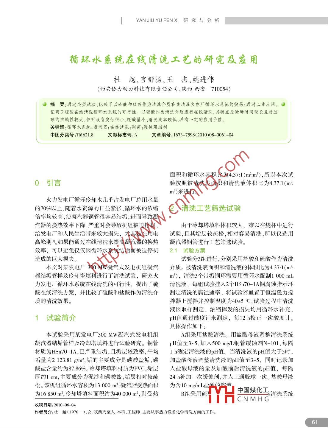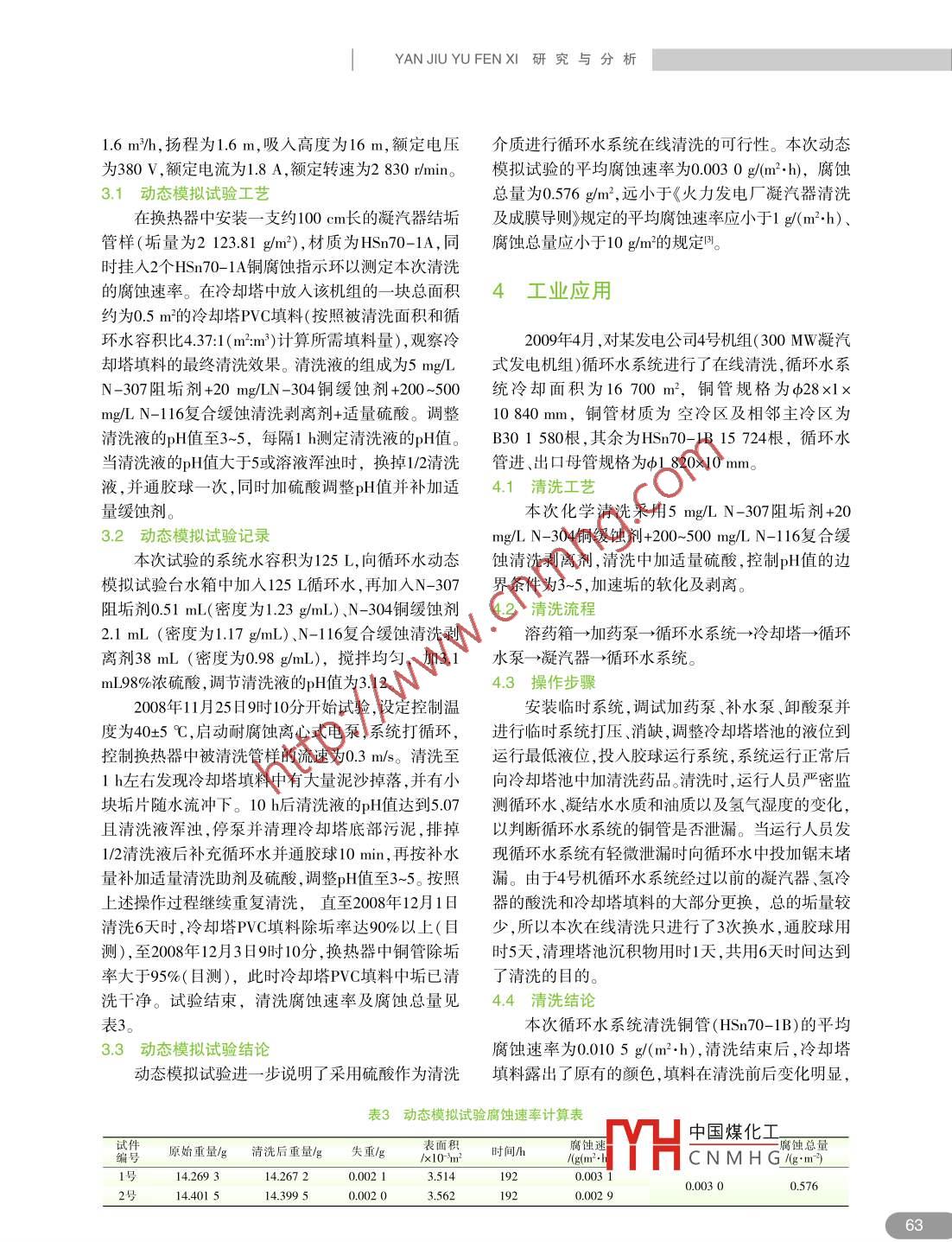 |YANJIUYUFENXI 研究與分析循環(huán)水系統(tǒng)在線清洗工藝的研究及應(yīng)用杜越,宮舒揚(yáng),王杰,姚進(jìn)偉(西安協(xié)力動(dòng)力科技有限責(zé)任公司,陜西西安710054))摘要:通過(guò)小型試驗(yàn),比較了以硫酸和鹽酸作為清洗介質(zhì)在線清洗火電廠循環(huán)水系統(tǒng)的效果;通過(guò)工業(yè)應(yīng)用,。證明了硫酸在線清洗循環(huán)水系統(tǒng)的可行性。以碗酸作為清洗介質(zhì)進(jìn)行在線清洗,其特點(diǎn)是除垢時(shí)間較長(zhǎng)且對(duì)膠球的依賴性較大,但對(duì)設(shè)備腐蝕很小耗酸量小、清洗成本較低,具有一定的應(yīng)用價(jià)值。關(guān)鍵詞:循環(huán)水系統(tǒng);凝汽器;在線清洗;剝離;緩蝕阻垢劑中圖分類號(hào):TM621.8文獻(xiàn)標(biāo)志碼:A文章編號(hào): 1673-7598(2010)08 -0061-04面積和循環(huán)水容積比為4.37:1 (m:m),所以本次試) 引言驗(yàn)按照被清洗表面積和清洗液體積比為4.37:1(m2:m2)來(lái)進(jìn)行?;鹆Πl(fā)電廠循環(huán)冷卻水幾乎占發(fā)電廠總用水量的70%以上,隨著水資源的日益緊張,循環(huán)水的濃縮2清洗工藝篩選試驗(yàn)倍率均較高,使凝汽器銅管很容易結(jié)垢,進(jìn)而導(dǎo)致凝汽器的換熱效率下降,嚴(yán)重時(shí)會(huì)導(dǎo)致機(jī)組被迫停機(jī),由于冷卻塔填料體積較大,難以在燒杯中進(jìn)行給發(fā)電廠和人民生活帶來(lái)較大損失,尤其是在用電試驗(yàn),且其垢層較疏松,相對(duì)容易清洗,所以僅選用高峰期"。如果能通過(guò)在線清洗來(lái)提高凝汽器的換熱凝汽器銅管進(jìn)行工藝篩選試驗(yàn)。效率,可以避免僅僅因循環(huán)水系統(tǒng)結(jié)垢而被迫停機(jī)2.1 試驗(yàn)方案造成的巨大損失。試驗(yàn)分3組進(jìn)行,分別采用鹽酸和硫酸作為清洗本文對(duì)某發(fā)電廠300 MW凝汽式發(fā)電機(jī)組凝汽介質(zhì)。被清洗表面積和清洗液的體積比為4.37:1(m2:器結(jié)垢管樣及冷卻塔填料進(jìn)行了清洗試驗(yàn),研究火m2),清洗3個(gè)帶垢銅環(huán)需要用循環(huán)水配制1 000 mL力發(fā)電廠循環(huán)水系統(tǒng)在線清洗的可行性,提出了硫清洗液,每組試驗(yàn)掛人2個(gè)HSn70- 1A銅腐蝕指示環(huán)酸在線清洗方案,并比較了硫酸和鹽酸作為清洗介測(cè)定清洗的腐蝕速率。將試驗(yàn)器皿置于恒溫磁力攪質(zhì)的清洗效果。拌器上攪拌并控制溫度為40+5 C,試驗(yàn)過(guò)程中清洗液因取樣測(cè)定、濃縮揮發(fā)的損失均用循環(huán)水補(bǔ)充,1試驗(yàn)簡(jiǎn)介pH值通過(guò)酸度計(jì)來(lái)測(cè)定,每12 h校正- -次酸度計(jì)。具體操作如下:本試驗(yàn)采用某發(fā)電廠300 MW凝汽式發(fā)電機(jī)組A組采用鹽酸清洗。用鹽酸母液調(diào)整清洗系統(tǒng)凝汽器結(jié)垢管樣及冷卻塔填料進(jìn)行試驗(yàn)研究。銅管pH值至3~5,加入500 mg/L銅管緩蝕劑N-101 ,每隔材質(zhì)為HSn70-1A,已嚴(yán)重結(jié)垢,且垢層較致密,平均1 h測(cè)定清洗液的pH值。當(dāng)清洗液的pH值大于5時(shí),垢量為2 123.81 g/m2, 垢的主要成分是碳酸鹽垢,碳加鹽酸母液調(diào)整清洗液的pH值至3~5,同時(shí)記錄加酸鹽含量約為87.86%。冷卻塔填料材質(zhì)為PVC,垢層人鹽酸母液的量及加酸前后清洗液的pH值,每隔厚約1cm,主要成分為泥沙和碳酸鹽,垢層相對(duì)較疏24h補(bǔ)加一-次緩蝕劑,并人工通膠球一次。鹽酸母液松。該機(jī)組循環(huán)水容積為13 000 m3 ,凝汽器受熱面積為含10 m/mL鹽為16 850 m2,冷卻塔填料面積約為40000 m2,則受熱B組采用硫中國(guó)煤化工清洗系統(tǒng)HCNMHG收稿日期:2010-06- -04作者簡(jiǎn)介:杜越( 1976- ),女 ,陜西周至人,本科,工程師,主要從事熱力設(shè)備化學(xué)清洗方面的工作。61研究與分析YANJIUYU FENXIpH值至3~5,加入5 mg/L N-307緩蝕阻垢劑、20 mg/LC組采用硫酸清洗。操作控制同B組,不同點(diǎn)是N-304銅緩蝕劑及200~500 mg/L N- 116復(fù)合緩蝕清不加N-1 16復(fù)合緩蝕清洗剝離劑。洗剝離劑,每隔1 h測(cè)定清洗液的pH值,當(dāng)清洗液的2.2 試驗(yàn)結(jié)果pH值大于5或溶液渾濁時(shí),換掉1/2清洗液,并人工通采用鹽酸和硫酸清洗均能達(dá)到除垢的目的,各膠球一次,同時(shí)加硫酸調(diào)整pH值,,補(bǔ)加適量緩蝕劑組清洗的腐蝕速率、腐蝕總量除垢率見(jiàn)表1,清洗結(jié)并記錄每次的加藥量及加酸前后清洗液的pH值。硫果對(duì)比見(jiàn)表2。酸母液為含5 mg/mL硫酸的溶液。表1各組清洗的腐 蝕速率腐蝕總量及除垢率4分組試件編號(hào) 原始重量/g 清洗后 重量/g失 重/g表面移除垢時(shí)間/h腐蝕速率平均腐蝕速 腐 蝕總量除垢率/%/x10-/(g(m2+h)-) 率(g(m2.h) /(g.m2)114.484 614.467 50.017 13.56974.50.0640.0674.99299.732號(hào)14.750 614.732 00.018 63.5900.0703號(hào)14.771 414.769 80.001 63.6297.50.000.0060.58599.714號(hào)15.060615.05840.002 23.6475號(hào)14.852 614.555 90.296 73.580.8480.84582.38851.72614.789 6,14.491 20.298 43.6300.843表2清洗工藝篩選試驗(yàn)結(jié) 果項(xiàng)目A組組C組)7.551.7腐蝕速率(g(m2 :h)-)0.0050.84腐蝕總量/(g.m)0.522 .82.427用酸量/g21(30%工業(yè)鹽酸)1.7 (98%.工業(yè)硫酸)2.4 (98%工業(yè)硫酸)清洗助劑用量/g1.01.4).4用酸量/,273(30%工業(yè)鹽酸)22.1(98%工業(yè)硫酸)31.2(98%工業(yè)硫酸)*300 MW單機(jī)清洗助劑用量/t13.018.2(水容積13000 m)總費(fèi)用萬(wàn)元35.8828.639.67備注:*項(xiàng)中的藥劑用量是根據(jù)小型試驗(yàn)藥劑用