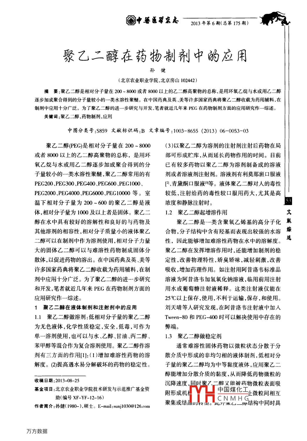 國十暮k一如期2著A敷乙二醇在藥揚(yáng)制劑中的應(yīng)用孫健(北京農(nóng)業(yè)職業(yè)學(xué)院,北京房山102442)摘要:聚乙二醇是相對分子量在200~8000或者8000以上的乙二醇高聚物的總稱,是用環(huán)氧乙烷與水或用乙二醇逐步加成聚合得到的分子量較小的一類水溶性聚醚。在中國藥典及英美等許多國家藥典將聚乙二醇收載為藥用輔料在制劑中應(yīng)用十分廣泛。為了聚乙二醇的進(jìn)一步研究與開發(fā),筆者就近幾年來PEG在藥物制劑方面的應(yīng)用研究作一綜述關(guān)鍵詞:聚乙二醇,藥物制劑,應(yīng)用中圖分類號:S859文獻(xiàn)標(biāo)識碼:B文章編號:1003-8655(2013)06-0053-03聚乙二醇(PEG是相對分子量在200~8000(3)以聚乙二醇為溶劑的注射劑注射后藥物在局或者8000以上的乙二醇高聚物的總稱,是用環(huán)部可形成貯庫,從而延長藥物作用的時間。目前氧乙烷與水或用乙二醇逐步加成聚合得到的分已有較多藥物以聚乙二醇為溶劑制備成的溶液子量較小的一類水溶性聚醚,聚乙二醇常用的有劑或者溶液劑注射劑。溶液劑有利莫那班口服液PEG200、PEG300、PEC400、PEG600、PEG1000、、青黛酮口服液等。液體聚乙二醇對人的毒性PEG2000PEG4000、PEC6000、PEG10000等。室較低,注射給藥的毒性較口服用藥大,尤其是高溫下相對分子量為200~600的聚乙二醇是液濃度和靜脈注射時。體,相對分子量為1000及以上者是固體。聚乙二1.2聚乙二醇起增溶作用文醇在水中具有較好的溶解性和良好的與藥物及聚乙二醇是一類含聚氧乙烯基的高分子化獻(xiàn)其他溶劑的相容性,相對分子質(zhì)量小的液體聚乙合物,分子結(jié)構(gòu)中含有羥基而表現(xiàn)出較強(qiáng)的水溶綜二醇可以在制劑中作為溶劑使用,相對分子力量性,因此能夠增加難溶性藥物在水中的溶解度。大的固體乙二醇可以與難溶性藥物制成固體分聚乙二醇在發(fā)揮增溶作用時,還能增加制劑的穩(wěn)散體,以促進(jìn)藥物的溶出。在中國藥典及英、美等定性,改善物理特性,矯臭矯味,減輕刺激,改善許多國家藥典將聚乙二醇收載為藥用輔料,在制吸收,增加藥理作用。如注射用阿昔洛韋標(biāo)準(zhǔn)品劑中應(yīng)用十分廣泛。為了聚乙二醇的進(jìn)一步研究溶液為阿昔洛韋加氫氧化鈉溶液,臨用前用注射和開發(fā),筆者就近幾年來PEG在藥物制劑方面的用水或葡萄糖注射液稀釋。這類注射液僅能在應(yīng)用研究作一綜述。25℃以上保存,使用,不利于運(yùn)輸,保存,和使用。1聚乙二醇在液體制劑和注射劑中的應(yīng)用劉天晴等人研究發(fā)現(xiàn),在阿昔洛韋注射液中加人11聚乙二醇做溶劑:低相對分子量的聚乙二醇Twen-80和PEG-400時可以解決使用中存在的為無色液體,化學(xué)性質(zhì)穩(wěn)定,安全,低毒,可作為弊端。單一溶劑使用,也可以與水、乙醇、甘油、丙二醇1.3聚乙二醇做穩(wěn)定劑苯甲醇等混合作為復(fù)合溶劑使用。聚乙二醇作溶通常難溶性固體藥物以微粒狀態(tài)分散于分劑有三方面的作用[1]:(1)增加難溶性藥物的溶散介質(zhì)中形成的非均勻相的液體制劑,低相對分解度。(2)提高遇水易分解破壞的藥物的穩(wěn)定性。子量的聚乙二醇均為中等黏度液體,應(yīng)用聚乙二醇能增加分散介質(zhì)的黏度,從而降低藥物微粒的收稿日期:2013-08-25沉降速度,回時聚7二醇又能被藥物微粒表面吸基金項(xiàng)目:北京農(nóng)業(yè)職業(yè)學(xué)院技術(shù)研發(fā)與示范推廣基金資附形成機(jī)中國煤化助(編號XF-YF-12-16)止微粒間相互CNMH作者簡介:孫健(1980-),碩士。E-mal:sunj1030@126com聚集或結(jié)晶mx4。此丌來乙二結(jié)構(gòu)中同時具2013年第6期(總第175期)國中暮畫霉宗起有親水、親油基團(tuán),可以包圍在經(jīng)分散的油相周倍增長。此外,聚乙二醇還是一類表面活性劑,廣圍,防止油相的重新集結(jié)。如利莫那班口服液,泛用于增溶、助溶、乳化、混懸等,是藥物制劑中脈絡(luò)寧注射液均采用聚乙二醇做為穩(wěn)定劑廣泛應(yīng)用的賦形劑和輔料之2在軟膏劑中的應(yīng)用5用作藥物修飾劑聚乙二醇在軟膏劑中廣泛用于親水性基質(zhì),5.1修飾蛋白藥物般常用PEG-300和PEG-400的等量熔合物、蛋白質(zhì)藥物由于具有作用專一、高效等特PEG-30和PEG-1500的等量熔合物,通過調(diào)節(jié)點(diǎn),在人類健康中發(fā)揮著日益重要的作用,但如用量和種類,可得到不同硬度的基質(zhì)。聚乙二醇果將非人體來源的藥物蛋白通過靜脈注射到人作為軟膏劑的水溶性基質(zhì)具有以下幾個方面的體后,使機(jī)體常產(chǎn)生特異免疫應(yīng)答,從而使藥物優(yōu)點(diǎn),(1)聚乙二醇無毒,無刺激性,不易引起皮蛋白的療效降低,有時甚至?xí)a(chǎn)生過敏反應(yīng),而膚過敏,(2)化學(xué)性質(zhì)穩(wěn)定,可長期貯存不變質(zhì)化學(xué)修飾能部分或全部解決蛋白質(zhì)藥物的這個(3)具有良好的水溶性,用聚乙二醇做藥膏,很容缺陷?;瘜W(xué)修飾劑有醋酸酐、葡聚糖、羧甲基纖維易從皮膚、頭發(fā)和衣物上除去。如克霉唑乳膏等素、聚乙烯吡咯烷酮、聚乙二醇和環(huán)糊精等,其中軟膏制劑中均采用了聚乙二醇。以PEG類修飾劑應(yīng)用最多。3在片劑中的應(yīng)用經(jīng)過PEG修飾的蛋白藥物可以延長藥物的近年來聚乙二醇在片劑中的使用越來越廣半衰期,降低免疫原性,同時最大限度保留期生泛,它們不但可用作崩解
