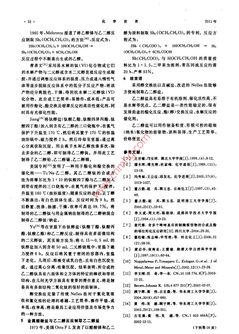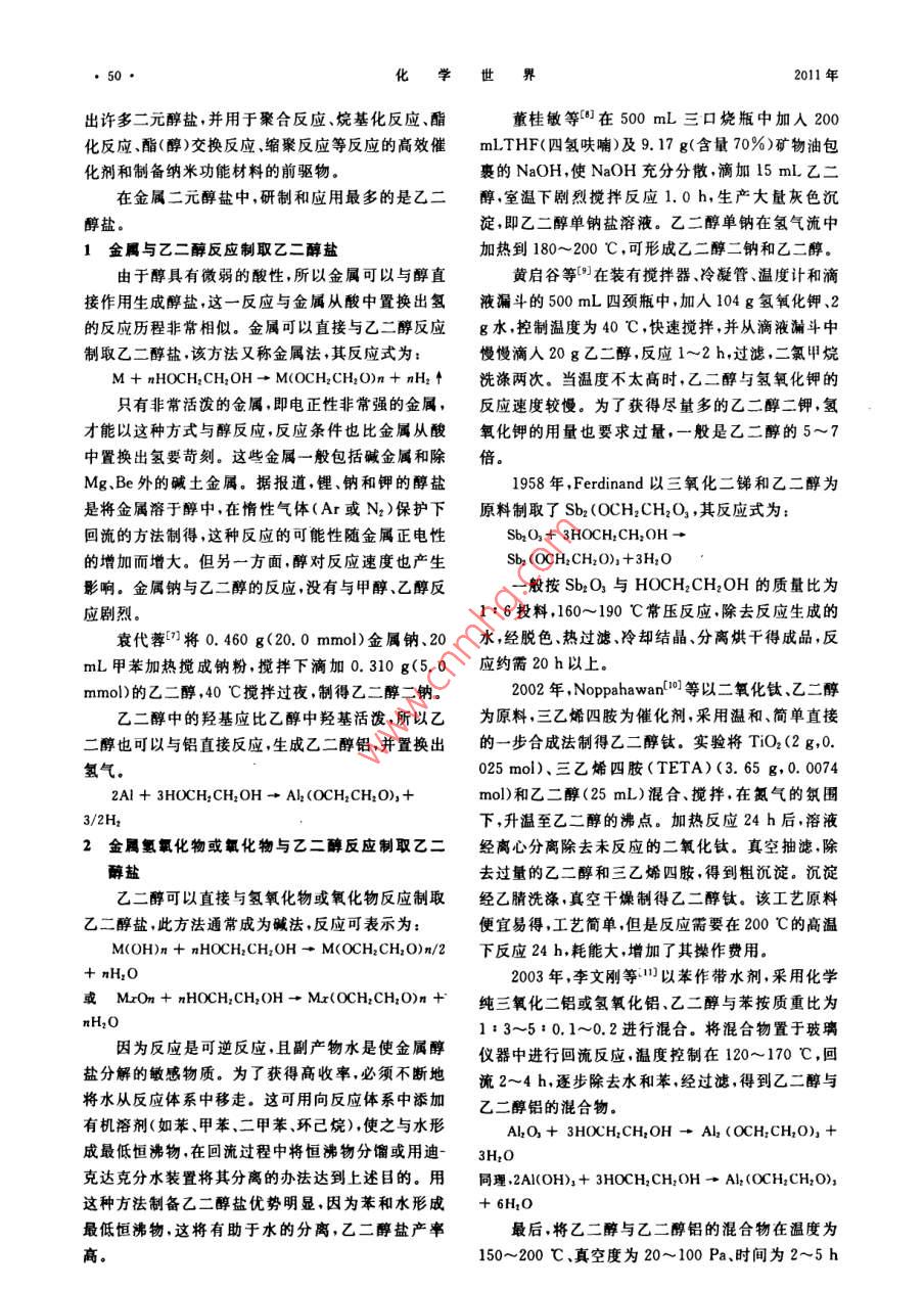 化學(xué)世界金屬乙二醇鹽合成工藝的研究沈國(guó)良2,張曉辰,李銀蘋,劉紅字,寧桂玲2(1沈陽(yáng)工業(yè)大學(xué)石油化工學(xué)院遼寧遼陽(yáng)1110032.大連理工大學(xué)化工學(xué)院,遼寧大連116012摘要:介紹了乙二醇鹽催化劑的合成研究進(jìn)展,詳細(xì)介紹和評(píng)述了金屬法、堿法、Nels法、醇交換法等制取乙二醇鈉、乙二醇鉀、乙二醇銻、乙二醇鈦、乙二醇鋁等二元醇鹽催化劑的工藝技術(shù),乙二醇鹽有著廣的應(yīng)用前景。關(guān)鍵詞:二元醇鹽;乙二醇鹽;金屬醇鹽;合成中圖分類號(hào):TQ223.16文獻(xiàn)標(biāo)志碼:A文章編號(hào):0367-6358(2011)01-0049-04Study on Synthesis Technology of Ethylene Glycol AlkoxidesSHEN Guo-liang, ZHANG Xiaochen, LI Yin-ping, LIU Hong-yu, NING Gui-ling2(School of Petrochemical Engineering, Shenyang Universty of Technology, Liaoning Liaoyang 111003, ChSchool of Chemical Engineering, Dalian University of Technology, Liaoning Dalian 116012, ChinaAbstract: The development on study of ethylene glycol alkoxides catalyst was reviewed. the synthesistechnology of ethylene glycol sodium, ethylene glycol potassium, ethylene glycol antimony, ethyleneglycol titanium and ethylene glycol aluminum catalysts by metal method alkaline method, Nelles methodand alcohol exchange method was introduced. The ethylene glycol alkoxides will find broad application inKey words: dihydroxyalcohol alkoxides; ethylene glycol alkoxides; metal alkoxides; synthesis金屬醇鹽是介于無(wú)機(jī)化合物和有機(jī)化合物之間備超細(xì)(納米)粉體時(shí)還需加入大量整合劑以減緩水的廣義金屬有機(jī)化合物的一部分。隨著醇鹽溶解程度,以便于控制粒度和形貌嚴(yán)重影響著金屬膠凝膠法( Sol-Gel)的迅猛發(fā)展極大地促進(jìn)了金屬鈦醇鹽的應(yīng)用醇鹽化學(xué)的研究(,并為開發(fā)醇鹽新用途和制備新在研究金屬一元醇鹽水解性能時(shí),為控制金屬材料奠定了基礎(chǔ))。目前,開展醇鹽合成性能應(yīng)一元醇鹽水解速率,一種有效而普遍使用的方法是用的研究已成為研究的熱點(diǎn)之一,既有較大的理論使用螯合劑,整合劑能與高活性的金屬醇鹽反應(yīng)形意義,又有重要的實(shí)用價(jià)值成螯合物,能夠降低水解速率。可用作鰲合劑的物但到目前,所合成的金屬醇鹽大都為單金屬、多質(zhì)有二元醇有機(jī)酸B二酮等其中采用二元醇作金屬的一元醇鹽。金屬的一元醇鹽是酯化反應(yīng)、鱉合劑時(shí),反應(yīng)通式如下酯(醇)交換反應(yīng)、縮聚反應(yīng)等重要反應(yīng)的高效催化M(OR)n +rHO-G-OH -(RO)2xM(OGO)r+劑,也可用作有機(jī)合成試劑、干燥劑,是近年來(lái)制備2xROH超細(xì)(納米)氧化物的主要原料。但是,金屬的一元金屬二元醇化合物能產(chǎn)生高的分子締合,通常醇鹽非常容易水解,就連采用溶膠一凝膠法水解制比原醇鹽難水解(。根據(jù)這一原理后來(lái)人們制備收稿日期:201008-16薔金項(xiàng)目:遼寧省教育廳科技計(jì)劃項(xiàng)目[2005303]作者簡(jiǎn)介:沈國(guó)良(1960~),男,遼寧大連人,教授從辜化學(xué)工藝學(xué)科研究工作,Emil"gl6666126.com化學(xué)世界11年出許多二元醇鹽,并用于聚合反應(yīng)、烷基化反應(yīng)、酯董桂敏等在500mL三口燒瓶中加入200化反應(yīng)酯(醇)交換反應(yīng)縮聚反應(yīng)等反應(yīng)的高效催 mLTHF(四氫呋喃)及9.17g(含量70%)礦物油包化劑和制備納米功能材料的前驅(qū)物裹的NaOH,使NaOH充分分散,滴加15mL乙二在金屬二元醇鹽中,研制和應(yīng)用最多的是乙二醇室溫下劇烈攪拌反應(yīng)1.0h,生產(chǎn)大量灰色沉醇鹽。淀,即乙二醇單鈉鹽溶液。乙二醇單鈉在氫氣流中1金屬與乙二醇反應(yīng)制取乙二醇加熱到180~200℃,可形成乙二醇二鈉和乙二醇。由于醇具有微弱的酸性,所以金屬可以與醇直黃啟谷等在裝有攪拌器冷凝管、溫度計(jì)和滴接作用生成醇鹽,這一反應(yīng)與金屬?gòu)乃嶂兄脫Q出氫液漏斗的500mL四頸瓶中,加人104g氫氧化鉀、2的反應(yīng)歷程非常相似。金屬可以直接與乙二醇反應(yīng)g水,控制溫度為40℃,快速攪拌,并從滴液漏斗中制取乙二醇鹽,該方法又稱金屬法,其反應(yīng)式為:慢慢滴入20g乙二醇,反應(yīng)1~2h,過濾,二氯甲烷M+ nHOCH2CH2OH→M(OCH2CH2O)n+nhH2↑洗滌兩次。當(dāng)溫度不太高時(shí),乙二醇與氫氧化鉀的只有非?;顫姷慕饘?即電正性非常強(qiáng)的金屬,反應(yīng)速度較慢。為了獲得盡量多的乙二醇二鉀氫才能以這種方式與醇反應(yīng),反應(yīng)條件也比金屬?gòu)乃嵫趸浀挠昧恳惨筮^量,一般是乙二醇的5~中置換出氫要苛刻。這些金屬一般包括堿金屬和除倍Mg、Be外的堿土金屬。據(jù)報(bào)道,鋰、鈉和鉀的醇鹽1958年, Ferdinand以三氧化二銻和乙二醇為是將金屬溶于醇中,在情性氣體(Ar或N2)保護(hù)下原料制取了Sb2(OCH2CH2O3,其反應(yīng)式為:回流的方法制得,這種反應(yīng)的可能性隨金屬正電性Sb2O3+3HOCH2CH2OH→的增加而增大。但另一方面,醇對(duì)反應(yīng)速度也產(chǎn)生Sbz(OCH; CH2O)+3H,O影響。金屬鈉與乙二醇的反應(yīng),沒有與甲醇、乙醇反般按Sb2O3與HOCH2CH2OH的質(zhì)量比為應(yīng)劇烈1:6投料,160~190℃常壓反應(yīng),除去反應(yīng)生成的袁代蓉口將0.46g(20.0mmol)金屬鈉、20水,經(jīng)脫色、熱過濾冷卻結(jié)晶、分離烘干得成品,反mL甲苯加熱攪成鈉粉,攪拌下滴加0.310g(5.0應(yīng)約需20h以上mo)的乙二醇40℃攪拌過夜,制得乙二醇二鈉2002年, Noppahawan