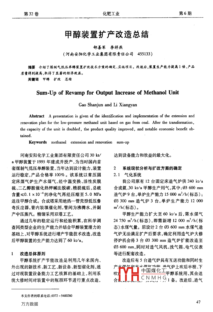 甲醇裝置擴(kuò)產(chǎn)改造總結(jié)