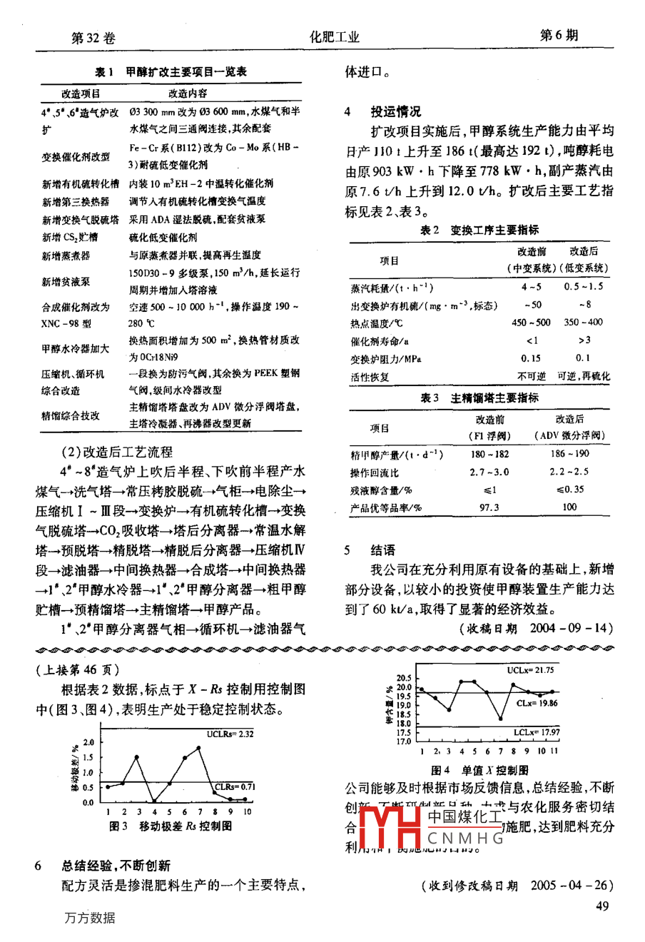 第32卷化肥工業(yè)第6期甲醇裝置擴(kuò)產(chǎn)改造總結(jié)郜善軍李祥燕(河南安陽化學(xué)工業(yè)集團(tuán)有限責(zé)任公司455133摘要介紹了煤制氣低壓單酵裝置擴(kuò)改技術(shù)方案的確定、實(shí)施項(xiàng)目。改后,裝置生產(chǎn)能力提高1倍,產(chǎn)品質(zhì)量得到提高,取得了顯著的經(jīng)濟(jì)效益。關(guān)鍵詞甲醇擴(kuò)改總結(jié)Sum-Up of Revamp for Output Increase of Methanol UnitGao Shanjun and Li XiangyanAbstract A presentation is given of the identification and implementation of the extension andrenovation plan for the low-pressure methanol unit based on gas from coal. After the transformationthe capacity of the unit is doubled, the product quality improved, and notable economic benefit obinedKeywords methanol extension and renovation sum-up河南安陽化學(xué)工業(yè)集團(tuán)有限責(zé)任公司30kt達(dá)到設(shè)備能力和效益的最大化。a甲醇裝置于1995年建成并投產(chǎn),為當(dāng)時(shí)國內(nèi)首套煤制氣低壓單醇裝置,當(dāng)年達(dá)到設(shè)計(jì)能力,裝置2系統(tǒng)現(xiàn)狀分析與擴(kuò)改方案的確定運(yùn)行穩(wěn)定,產(chǎn)品合格率100%。該系統(tǒng)以常壓固2.1氣化系統(tǒng)定床煤氣爐生產(chǎn)水煤氣,經(jīng)中溫變換、活性炭脫我公司原有12臺固定床造氣爐供240kt/a硫、二乙醇胺催化熱鉀堿法脫碳精脫硫后,總硫合成氨、30kt/a甲醇生產(chǎn)用氣,其中:03600m含量≤0.1×106的凈化氣再經(jīng)壓縮至50MPa造氣爐9臺,單爐生產(chǎn)能力15000m2/h(標(biāo)態(tài))送往甲醇合成。合成塔釆用絕熱一管殼型低壓魯93300mm造氣爐3臺,單爐生產(chǎn)能力12000奇反應(yīng)器,管內(nèi)裝填催化劑,管間為沸騰水,并副3/h(標(biāo)態(tài))。產(chǎn)中壓蒸汽。精餾采用雙塔工藝。甲醇生產(chǎn)能力擴(kuò)大至60kt/a后,需水煤氣通過幾年的穩(wěn)定運(yùn)行和經(jīng)驗(yàn)積累,在科學(xué)調(diào)4750m3/h(標(biāo)態(tài)),即需新增12000m2/h(標(biāo)查同類型企業(yè)的生產(chǎn)能力并結(jié)合甲醇裝置潛力的態(tài))水煤氣量。原設(shè)計(jì)2臺奶3600m水煤氣造基礎(chǔ)上,對甲醇系統(tǒng)進(jìn)行增產(chǎn)節(jié)能技術(shù)改造,改造氣爐無法滿足擴(kuò)產(chǎn)后要求,確定利用造氣爐大修后甲醇裝置的生產(chǎn)能力達(dá)到了60kta停爐機(jī)會將3臺03300mm造氣爐擴(kuò)能改造至03600mm,同時(shí)對造氣風(fēng)機(jī)、洗氣箱、電氣儀表1改造總體原則等進(jìn)行配套改造。甲醇系統(tǒng)擴(kuò)產(chǎn)節(jié)能改造是利用幾年來國內(nèi)改造后有5臺造氣爐具有互送功能和同時(shí)生外出現(xiàn)的新技術(shù)新工藝新設(shè)備、新型催化劑,通過對現(xiàn)裝置設(shè)備能力工藝核算的基礎(chǔ)上,利用系統(tǒng)大修時(shí)間對裝置中的瓶頸環(huán)節(jié)進(jìn)行重點(diǎn)改造,產(chǎn)吹合和當(dāng)與功能造氣爐上吹后半程、下中國煤化工甲醇系統(tǒng)用,其余送CNMHG1備。改造后,造氣本文作者的聯(lián)系電話:0372-5400280第32卷化肥工業(yè)第6期系統(tǒng)12臺爐完全可以滿足醇氨生產(chǎn)用氣。脫硫塔作為備用;為適應(yīng)髙硫煤造氣,把原常溫水2凈化系統(tǒng)解前預(yù)塔放到精脫塔前作為主脫硫塔,原精脫塔(1)常壓脫硫系統(tǒng)作為把關(guān)用。常壓脫硫采用栲膠法,經(jīng)核算,通過調(diào)整脫硫2.3壓縮機(jī)液組分和流量,現(xiàn)卯2800mm脫硫塔可以滿足工現(xiàn)有M-155/55型壓縮機(jī)3臺,三機(jī)全開打藝需要。氣量27000m3/h,理論上完全可以滿足擴(kuò)產(chǎn)要(2)CO0部分變換系統(tǒng)求;D-2949-53循環(huán)氣壓縮機(jī)2臺,理論上也原CO部分變換為中溫變換工藝,裝填B112可滿足擴(kuò)產(chǎn)要求。但由于水煤氣前系統(tǒng)粉塵和煤型催化劑,使用中存在蒸汽消耗高、變換率低及催焦油的影響,壓縮機(jī)氣閥更換頻繁,一、二水冷器化劑使用壽命短(3-4個(gè)月)、升溫還原耗時(shí)長、堵塞嚴(yán)重嚴(yán)重影響了壓縮機(jī)的打氣量,因此需對易出現(xiàn)結(jié)疤和粉化現(xiàn)象而引起系統(tǒng)阻力增加等缺氣閥和水冷器進(jìn)行重點(diǎn)改造:一入氣閥采用新型點(diǎn)。氣量增加1倍后,原01800mm變換爐仍采防污氣閥,其它各段采用密封性能好的PEEK(聚用中溫變換不能滿足工藝要求。為了滿足增產(chǎn)節(jié)芳醚酮)閥片;水冷器由臥式改為立式,下段增加能要求,并結(jié)合甲醇CO部分變換的特點(diǎn),確定采氣液分離裝置,同時(shí)增加循環(huán)水反洗。用最新的低溫耐硫變換工藝對原工藝進(jìn)行改造。2.4甲醇系統(tǒng)釆用鈷鉬系(HB-3型)耐硫低變催化劑有如下原02200mm甲醇合成塔更換催化劑后即優(yōu)點(diǎn):具有較好的低溫活性,活性溫度范圍較寬可滿足擴(kuò)產(chǎn)需要。原甲醇分離器為01200mm(180~500℃);汽氣比僅0.25~0.40,蒸汽耗量擴(kuò)產(chǎn)后氣量增加近1倍,需串1臺分離器以滿足僅1.0th左右;變換率高,在同樣變換工藝指標(biāo)甲醇分離要求。粗甲醇精餾采用雙塔流程,預(yù)精下所需催化劑量為中變的一半,比較適合擴(kuò)產(chǎn)改餾塔(⑩1200mm)內(nèi)設(shè)48塊浮閥塔盤,主精餾塔造;強(qiáng)度高,遇水不粉化使用壽命一般為5年;催(1600mm)內(nèi)設(shè)85塊浮閥塔盤。經(jīng)核算,主塔化劑失活后可通過再硫化使活性大部分恢復(fù);需可以滿足60kt/a的生產(chǎn)能力,但為了保證改造后增加CS2貯槽