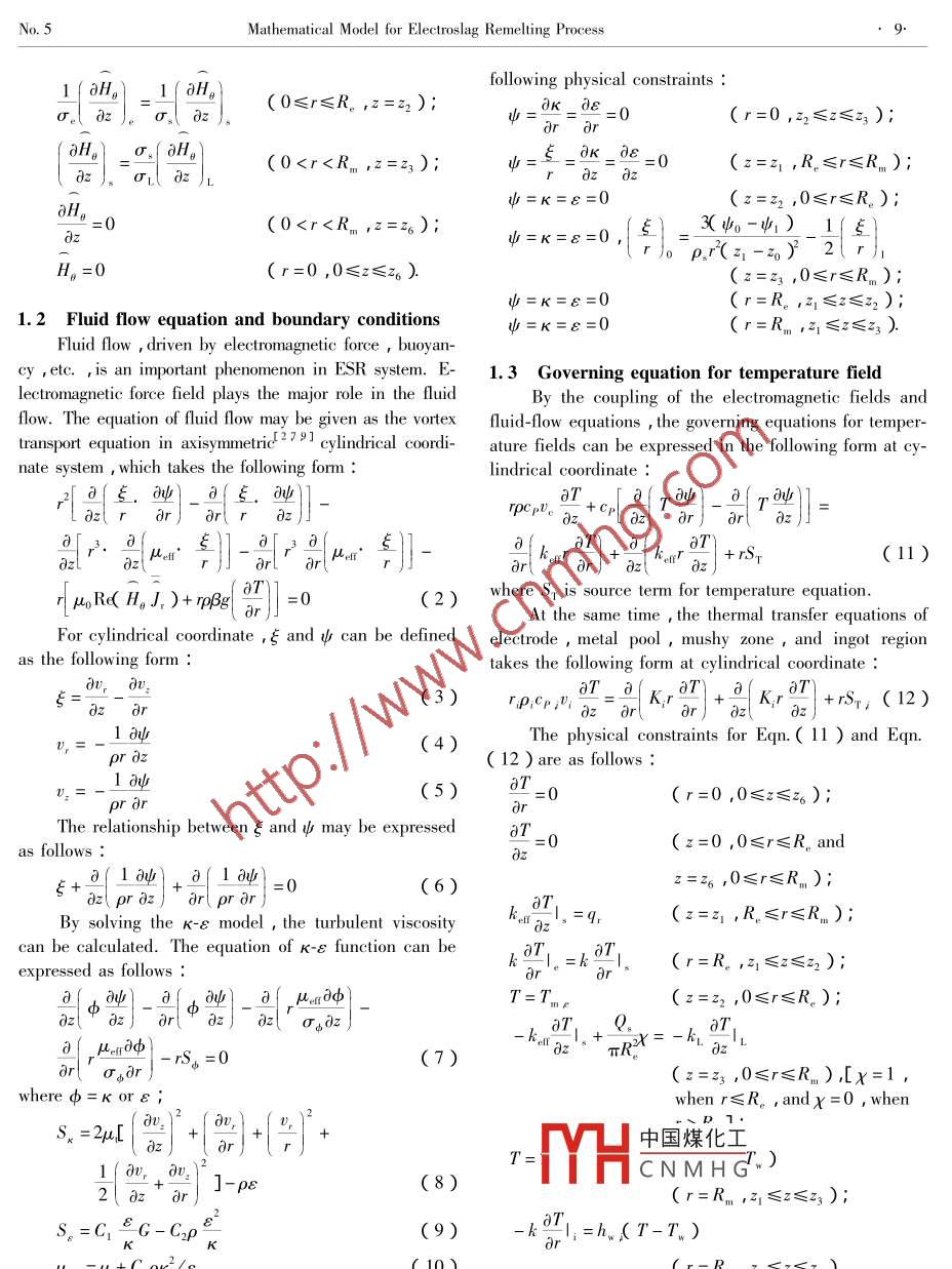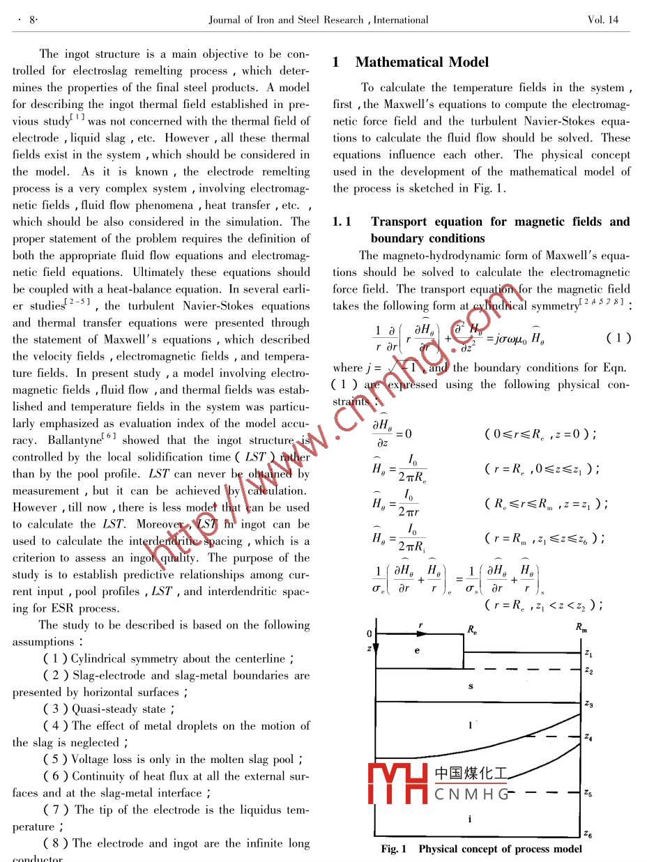 Available online at www.sciencedirect.comScienceDirectJOURNAL OF IRON AND STEEL RESEARCH ,INTERNATIONAL 2007 ,14(5):07-12 ,30Mathematical Model for Electroslag Remelting ProcessDONG Yan-wuJIANG Zhou-hua',LI Zheng-bang2( 1. School of Materials and Metallurgy , Northeasterm University , Shenyang 110004 , Liaoning , China ;2. Institute for Metallurgical Technology , Central Iron and Steel Research Institute , Beijing 100081 , China )Abstract :A mathematical model , including electromagnetic field equation , fluid flow equation , and temperature field equa-tion , was established for the simulation of the electroslag remelting process. The distribution of temperature field was ob-tained by solving this model. The relationship between the local solidification time and the interdendritic spacing during theingot solidification process was established , which has been regarded as a criterion for the evaluation of the quality of crystal-lization. For a crucible of 950 mm in diameter , the local solidification time is more than 1 h at the center of the ingot with thelongest interdendritic spacing , whereas it is the shortest at the edge of the ingot according to the calculated results. Themodel can be used to understand the ESR process and to predict the ingot quality.Key words : electroslag ; remelting ; mathematical model ; interdendritic spacing ; local solidification timeSymbol ListC ,C2一-Constants in K-ε model ;T一-Temperature ;Cj一-Dissipation rate constant ;-Time ,s ;cp一Speific heat ;v。一-Solidification rate of ingot ,( m' h-' );d一-Interdendritie spacing ,m ;v,,v:一-Velocity of r and z direction ,( m' h-' );G--Generation term for turbulence kinetic energy ;-Axial coordinate ,m ;g一-Cravitational acceleration ,( m' s-2 );zs ,吃一-Position of solidus and liquidus ,m ;-Magnetie field intensity ,( A. m-' );β→- -Coffcient of thermal expansion of slag ;H-- Complex amplitude of H ;-Vorticity ;- Stream function ;H, ,H。,H:一-Magnetic field intensity inr ,0 ,and z direc-K一-Kinetic energy of turbulence ;tion ,respectively ;-Dissipation rate of turbulence energy ;hsw一-Overall heat transfer coeffcient between slag and-Density ,(kg" m^ 3 );cooling water,( W. m-2. K-' );σ一Elctrical conductivity ,( 0+. m~' );hw ; 一-Heat transfer cofficient of other position ,( W. m-2-Angular frequency of current ,( rad. s-' );-Viscosity of slag ,( Pa. s~ ' );1- - Reference value of current ,A ;-Magnetic permeability ,( H m-' );J一-Current intensity ,( A. m-' );μeu一-Efctive viscosity ,( Pa s-' );J一-Complex amplitude of J ;Turbulent viscosity ;SubscriptJ,- -Complex conjugation ofJ ;-Electrode ;h ,的一-Cofficient , depending on steel grade ;k.e一Fffective thermal conductivity ,( W. m-'. K~');中國(guó)煤化工Q,--Rate of heat extraction from slag by metal droplets ;nYHCNMHG.-Radiant heat loss ,J ;-Liquld slagR-- -Radius ,m;r-- - -Radial coordinate ,m ;Foundation Item :ltem Sponsored by Weaponry Pre-Research Fund ( 514120203040QT0901 )Biography :兩亦數(shù)據(jù)vu( 1978- ) , Male , Doctor Candidate ; E-mail : yanwu_ dong@ 163. com ; Revised Date : November 29 ,2006.8Jourmal of Iron and Steel Research , InternationalVol. 14The ingot structure is a main objective to be con-1 Mathematical Modeltrolled for electroslag remelting process ,which deter-mines the properties of the final steel products. A modelTo calculate the temperature fields in the system ,for describing the ingot thermal field established in pre-first , the Maxwell's equations to compute the electromag-vious study 1 was not concerned with the thermal field ofnetic force field and the turbulent Navier-Stokes equa-electrode , liquid slag , etc. However , all these thermaltions to calculate the fluid flow should be solved. Thesefields exist in the system , which should be considered inequations influence each other. The physical conceptthe model. As it is known , the electrode remeltingused in the development of the mathematical model ofprocess is a very complex system , involving electromag-the process is sketched in Fig. 1.netic fields , fluid flow phenomena , heat transfer , etc.which should be also considered in the simulation. The1.1Transport equation for magnetic fields andproper staterment of the problem requires the definition ofboundary conditionsboth the appropriate fluid flow equations and electromag-The magneto-hydrodynamic form of Maxwell's equa-netic field equations. Ultimately these equations shouldtions should be solved to calculate the electromagneticbe coupled with a heat-balance equation. In several earli-force field. The transport equation for the magnetic fielder studies--sI ,the turbulent Navier- Stokes equationstakes the fllowing form at cylindrical symmetry-245781 :and thermal transfer equations were presented through1 o( dHo). 22 H。the statement of Maxwell' s equations , which described=joauo H,( 1)r ar)r ))z2the velocity fields , electromagnetic fields , and tempera-ture fields. In present study ,a model involving electro-wherej= / -1 , and the boundary conditions for Eqn.magnetic fields , fluid flow , and thermal fields was estab-( 1 ) are expressed using the following physical con-lished and temperature fields in the system was particu-straints :larly emphasized as evaluation index of the model accu-aH=0(0≤r≤R。,z=0);racy. Ballantyne' 61 showed that the ingot structure is)zcontrolled by the local solidification time( LST ) ratherthan by the pool profile. LST can never be obtained byH=2πR.(r=R。,0≤z≤z );measurement , but it can be achieved by calculation.1However ,till now ,there is less model that can be used( R.≤r≤R ,z=Z );2πrto calculate the LST. Moreover , LST in ingot can beused to calculate the interdendritic spacing , which is a0= 2πR,(r=Rm ,么≤z≤z);criterion to assess an ingot quality. The purpose of thestudy is to establish predictive relationships among cur-1(aH。Ho)_1(0H。H。rent input , pool profiles , LST , and interdendritic spac-σ。dring for ESR proc